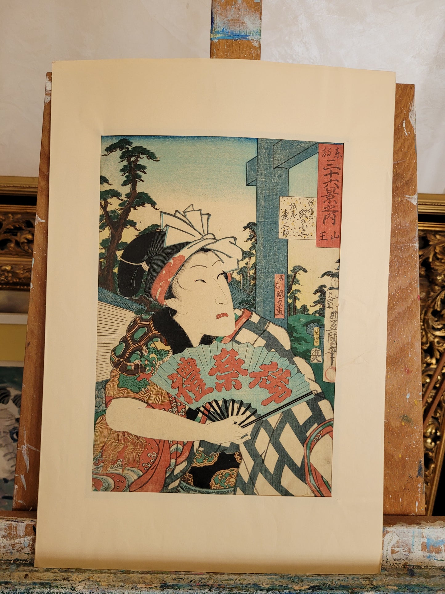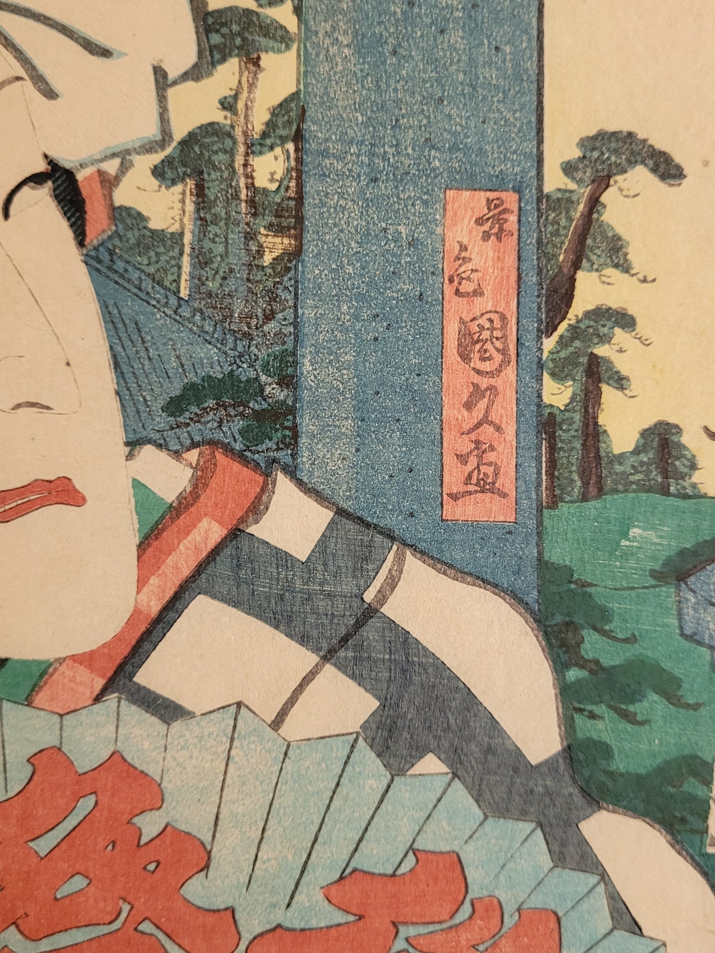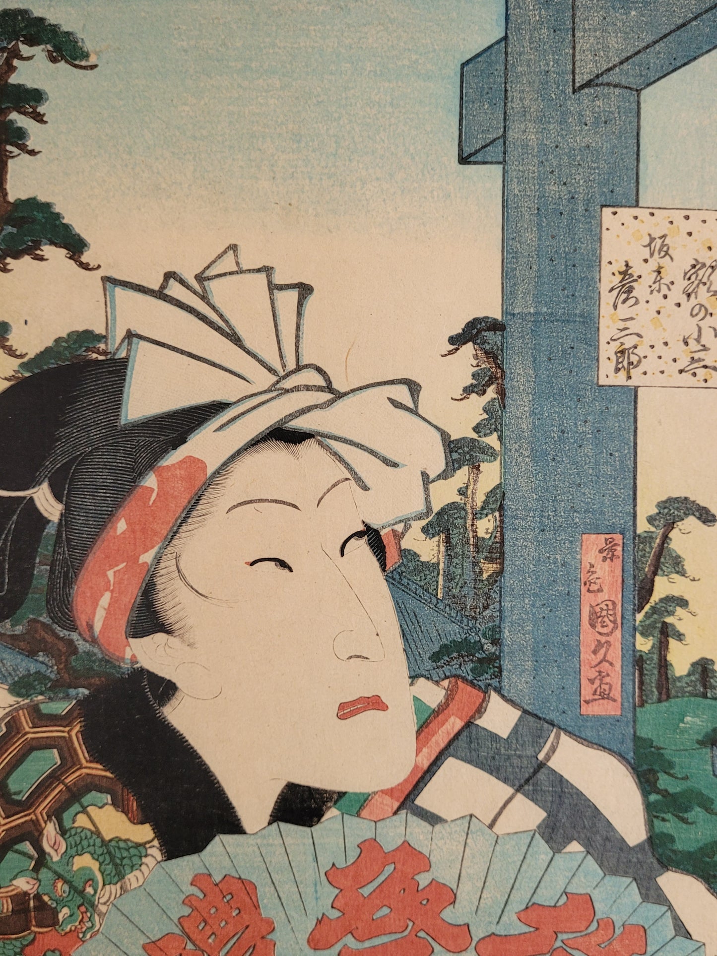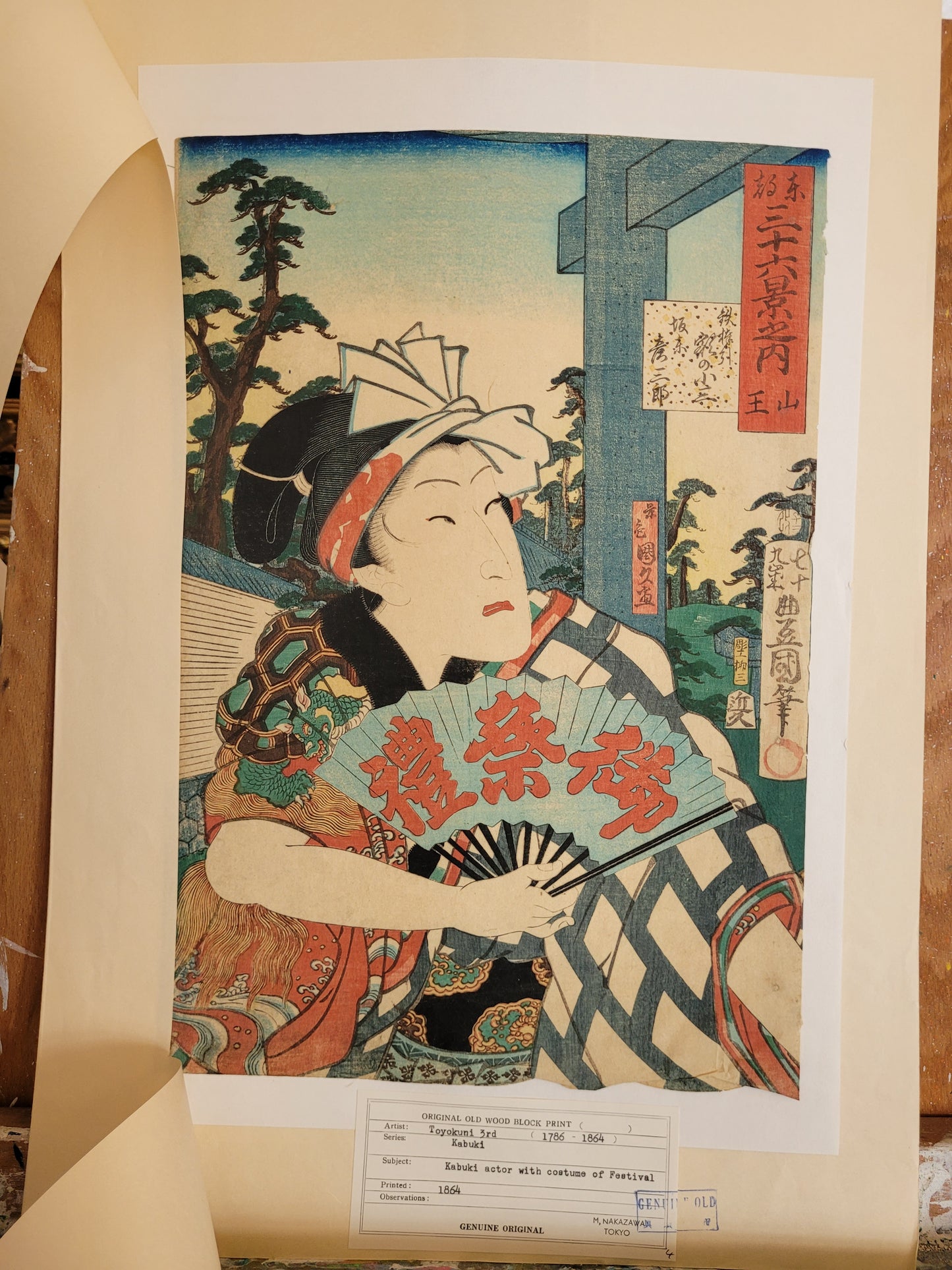 Beschreibung: Willkommen in unserer exklusiven Kollektion von Holzschnitten, geschaffen von Utagawa Toyokuni (1769-1825), einem renommierten Meister des japanischen Holzschnitts, aus der Tabuki Serie von 1864. Diese kunstvollen Werke fangen die traditionelle japanische Kabuki-Theaterkunst in ihrer ganzen Pracht ein und präsentieren einen Schauspieler in einem prächtigen Festivalkostüm.