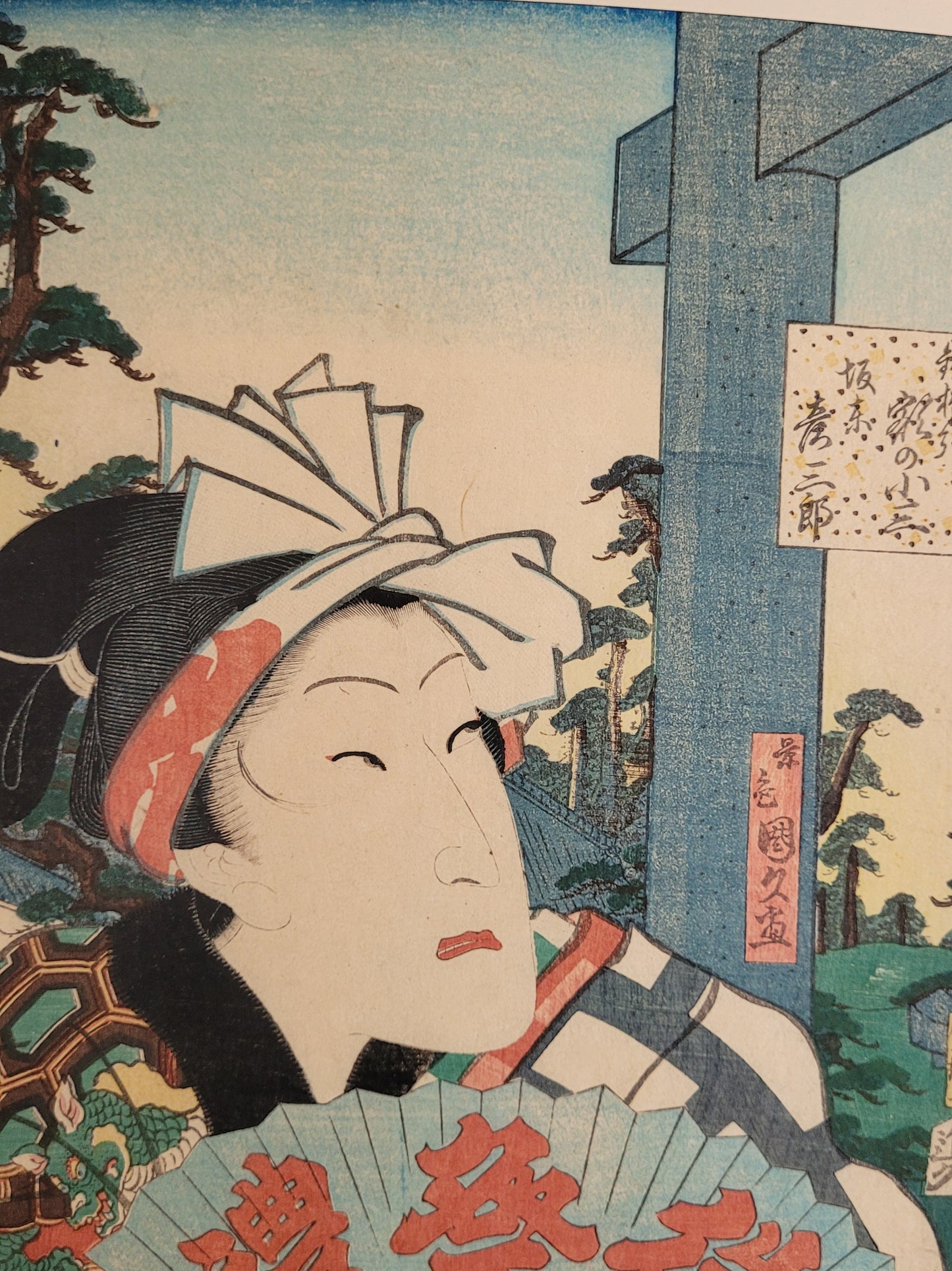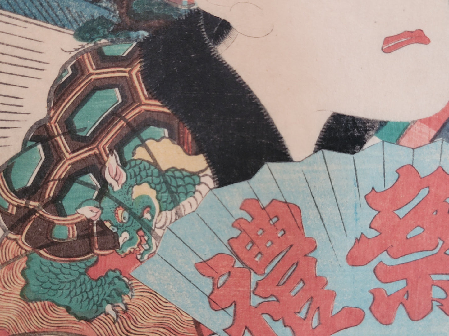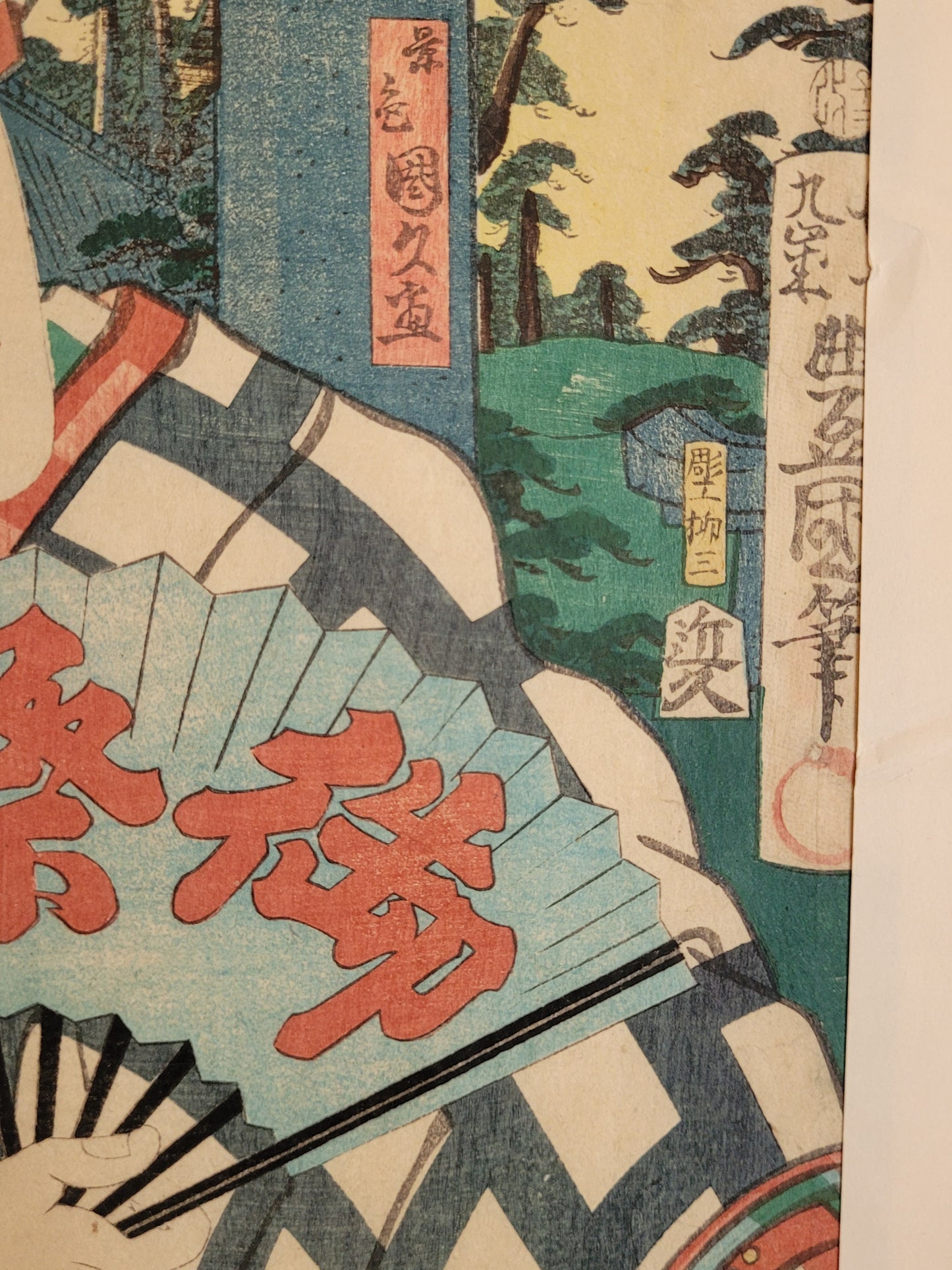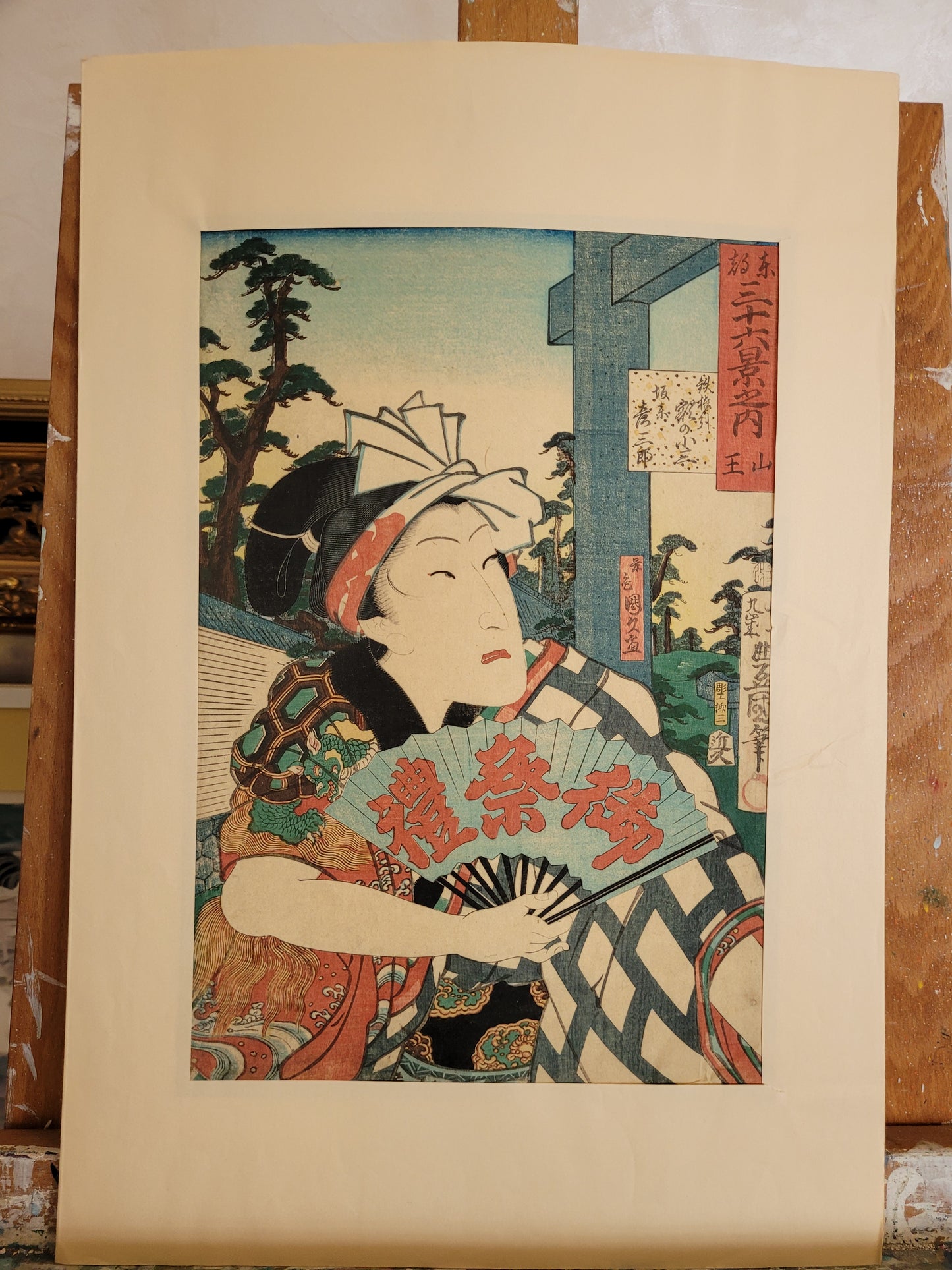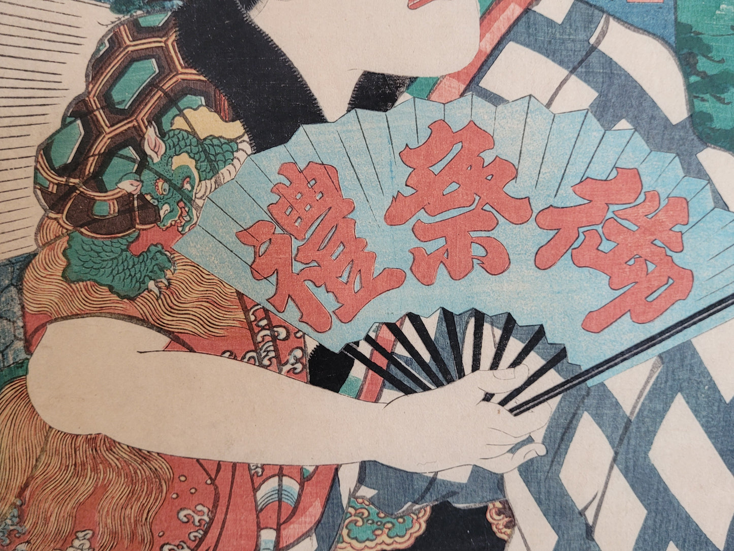 Beschreibung: Willkommen in unserer exklusiven Kollektion von Holzschnitten, geschaffen von Utagawa Toyokuni (1769-1825), einem renommierten Meister des japanischen Holzschnitts, aus der Tabuki Serie von 1864. Diese kunstvollen Werke fangen die traditionelle japanische Kabuki-Theaterkunst in ihrer ganzen Pracht ein und präsentieren einen Schauspieler in einem prächtigen Festivalkostüm.