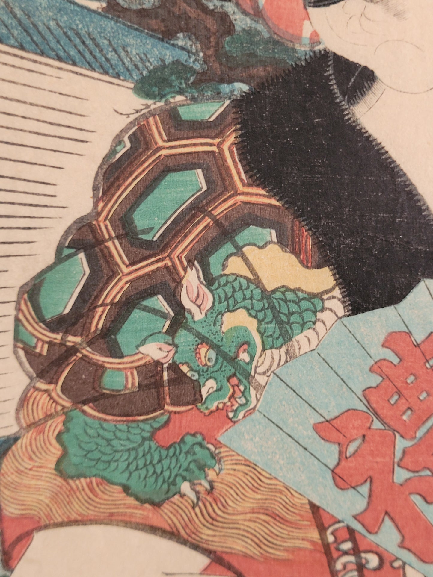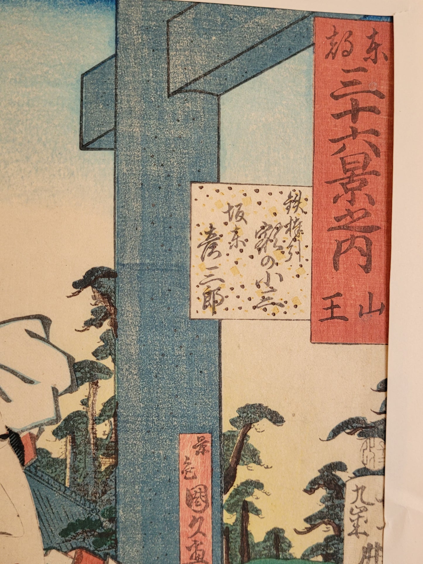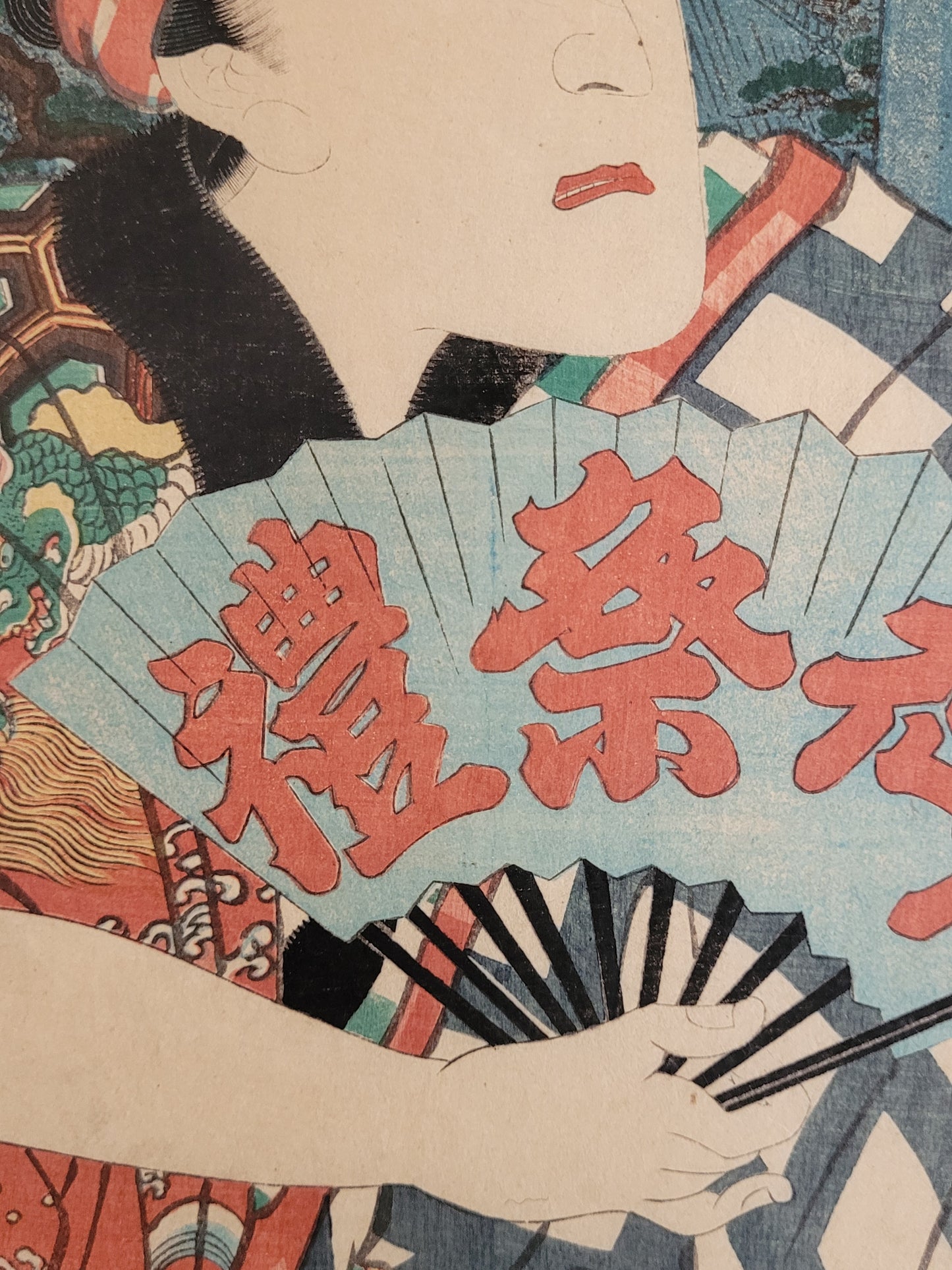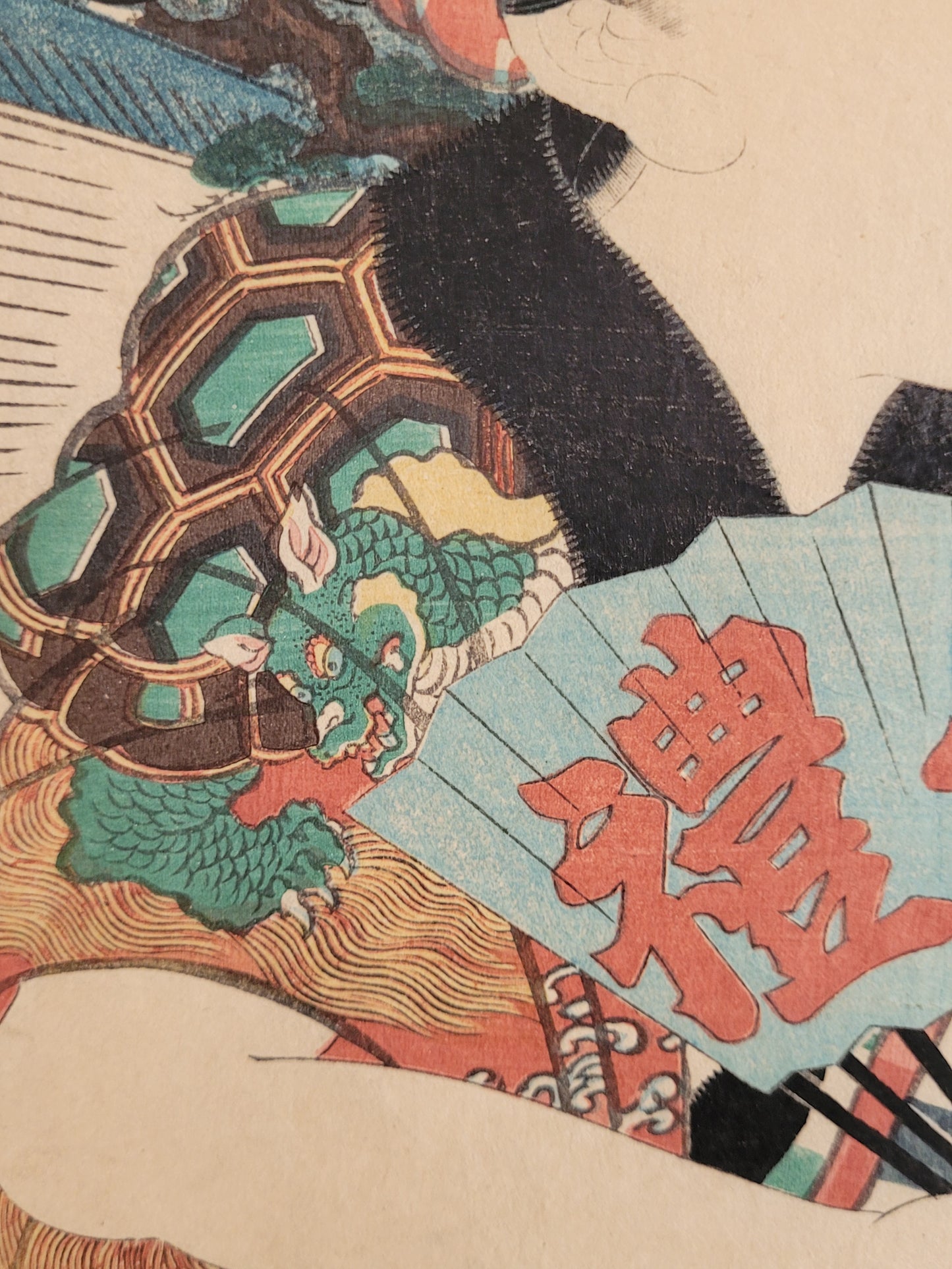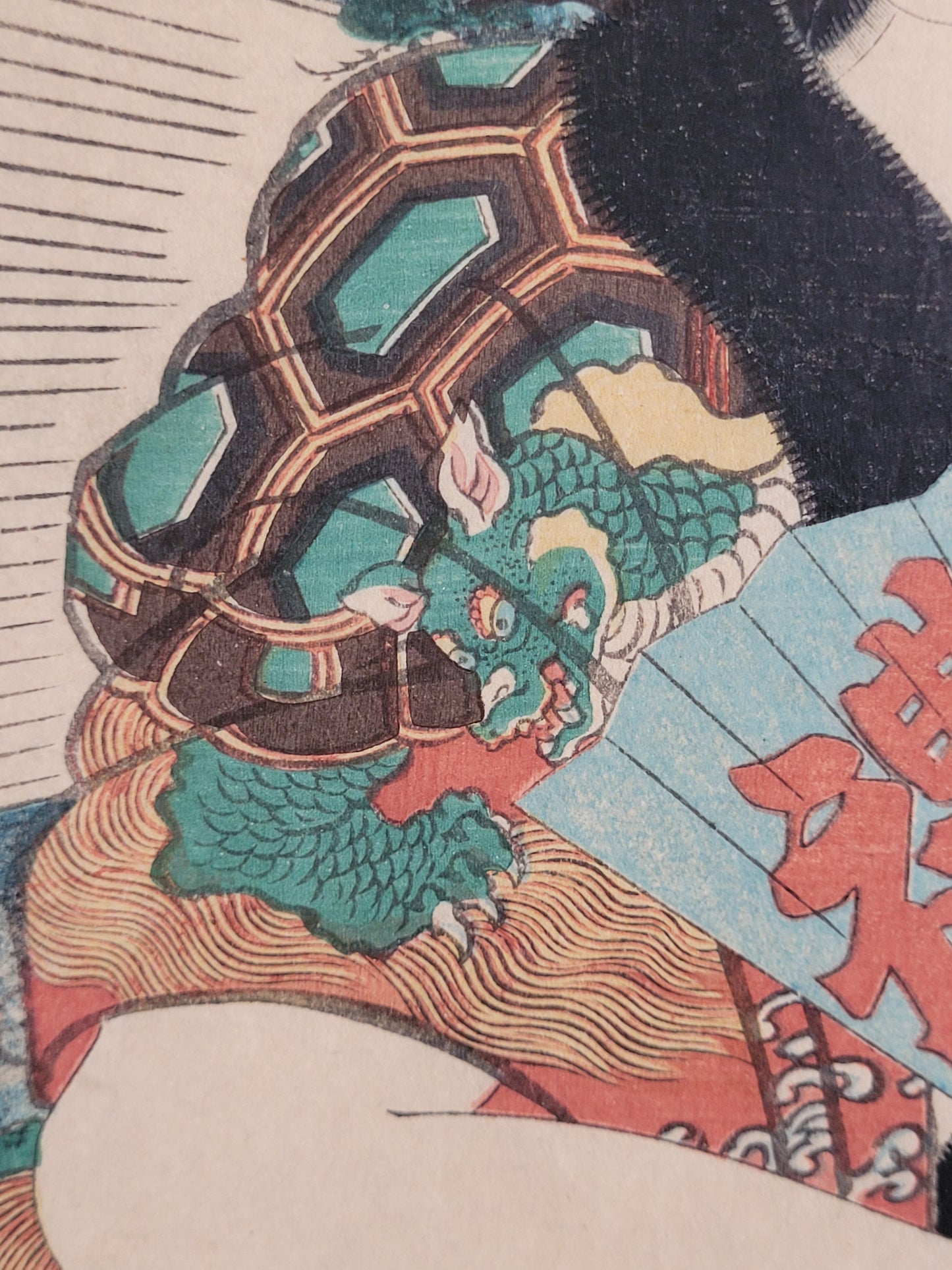 Beschreibung: Willkommen in unserer exklusiven Kollektion von Holzschnitten, geschaffen von Utagawa Toyokuni (1769-1825), einem renommierten Meister des japanischen Holzschnitts, aus der Tabuki Serie von 1864. Diese kunstvollen Werke fangen die traditionelle japanische Kabuki-Theaterkunst in ihrer ganzen Pracht ein und präsentieren einen Schauspieler in einem prächtigen Festivalkostüm.