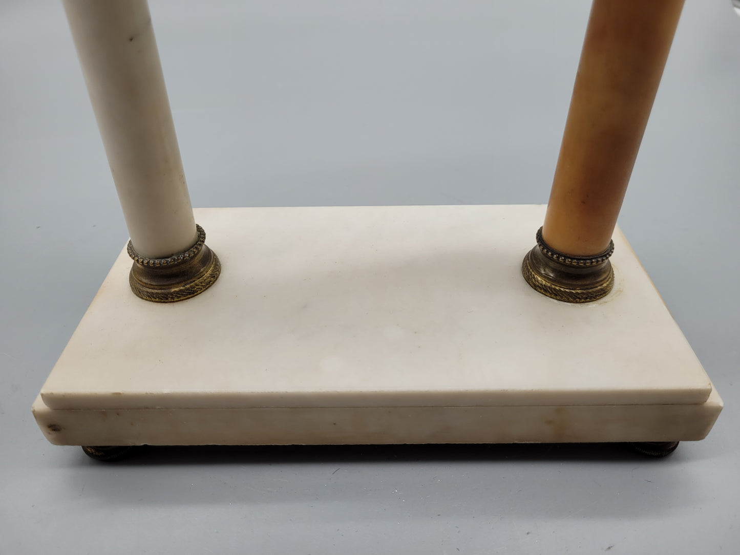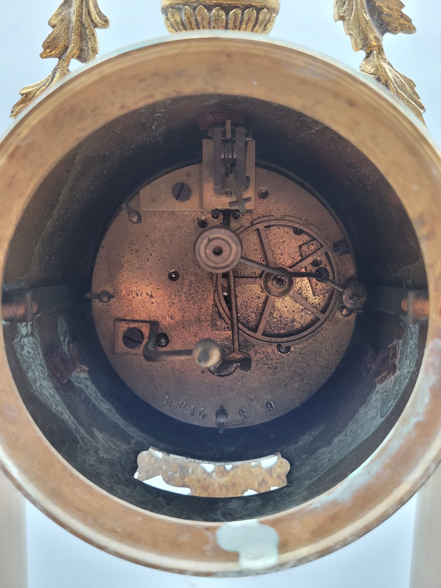 Diese prächtige Kaminuhr im Stil des Großen Französischen Louis XVI "Portique" ist ein Kunstwerk aus Bronze, Marmor und vergoldeter Bronze aus der zweiten Hälfte des 19. Jahrhunderts. Mit ihren kunstvollen Details und dem präzisen mechanisch Antrieb ist sie nicht nur ein beeindruckender Blickfang, sondern auch ein wertvolles historisches Sammlerstück. Der Zustand der Uhr ist sehr gut, wie auf den beigefügten Fotos ersichtlich ist.