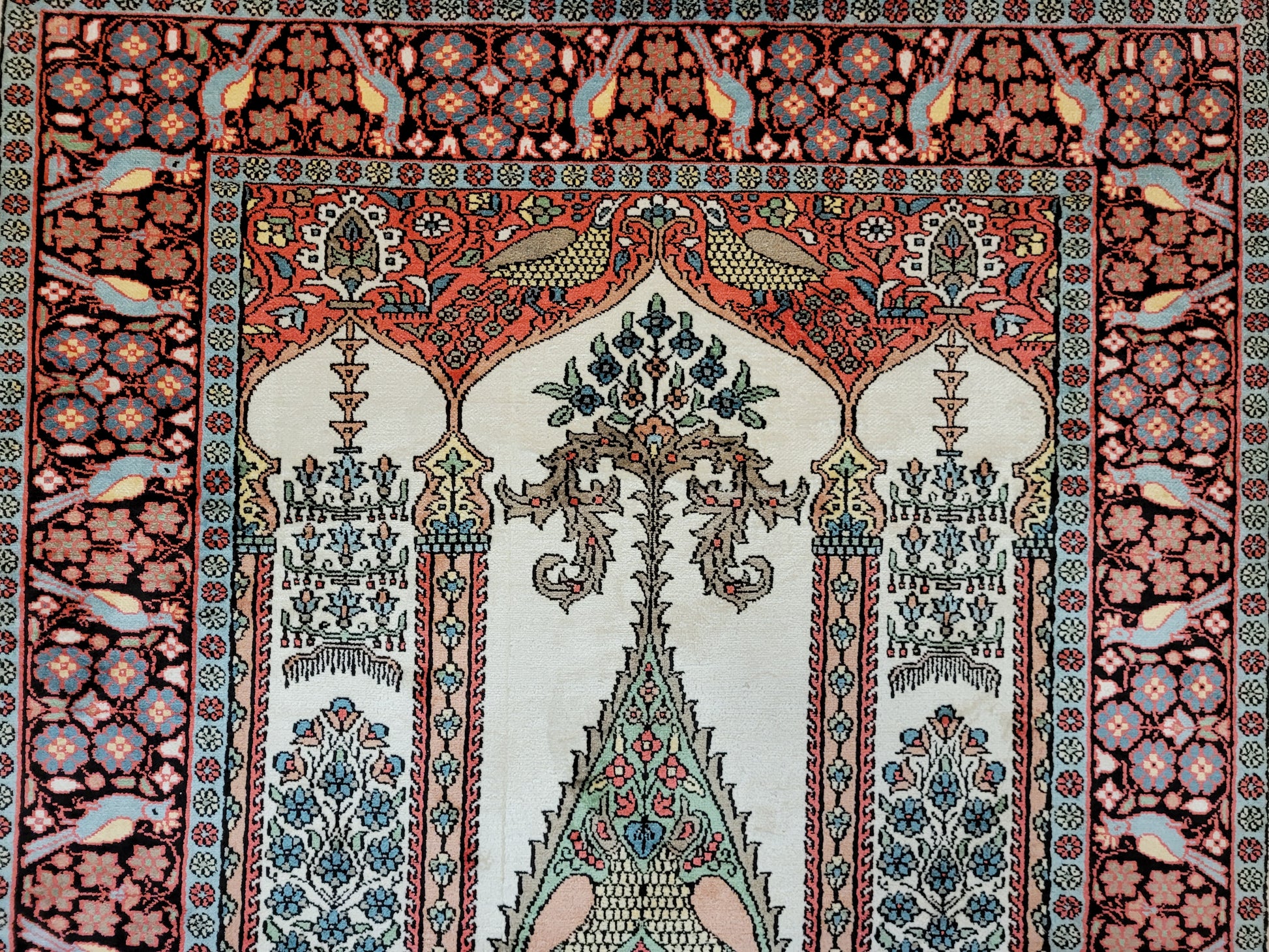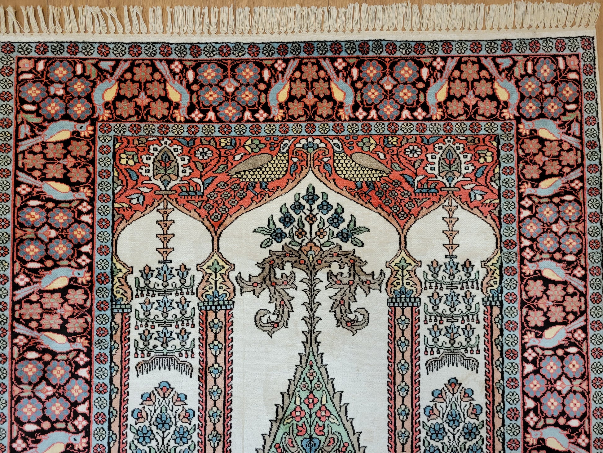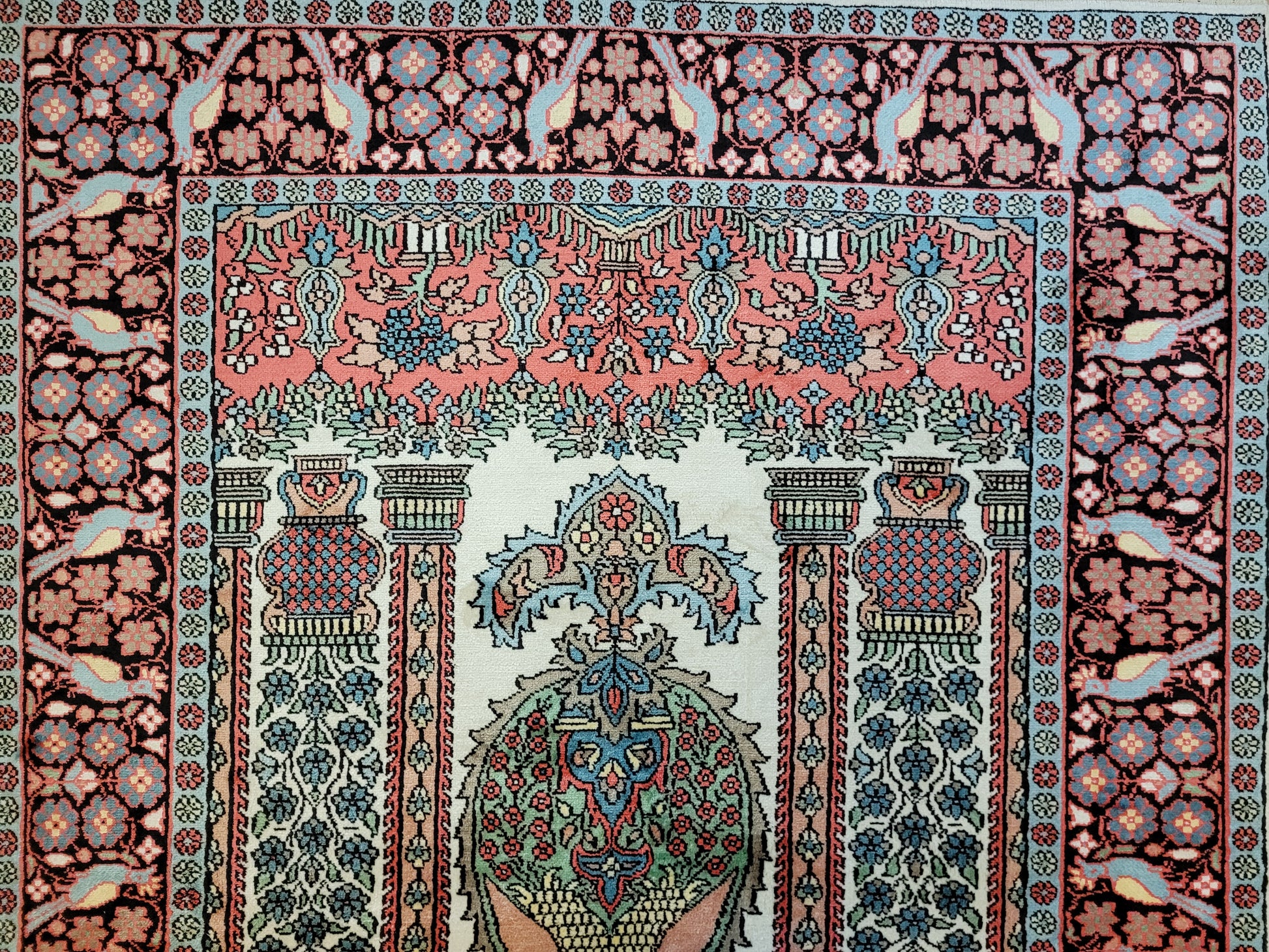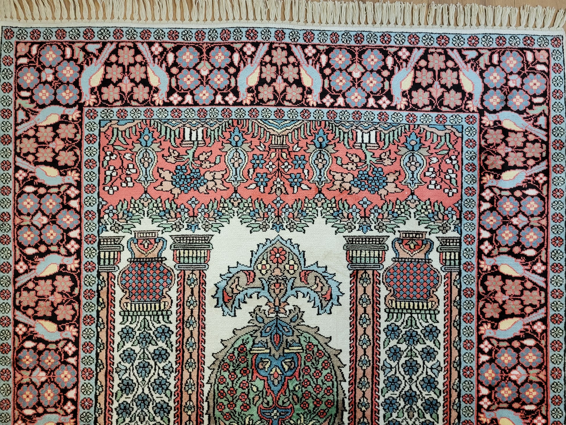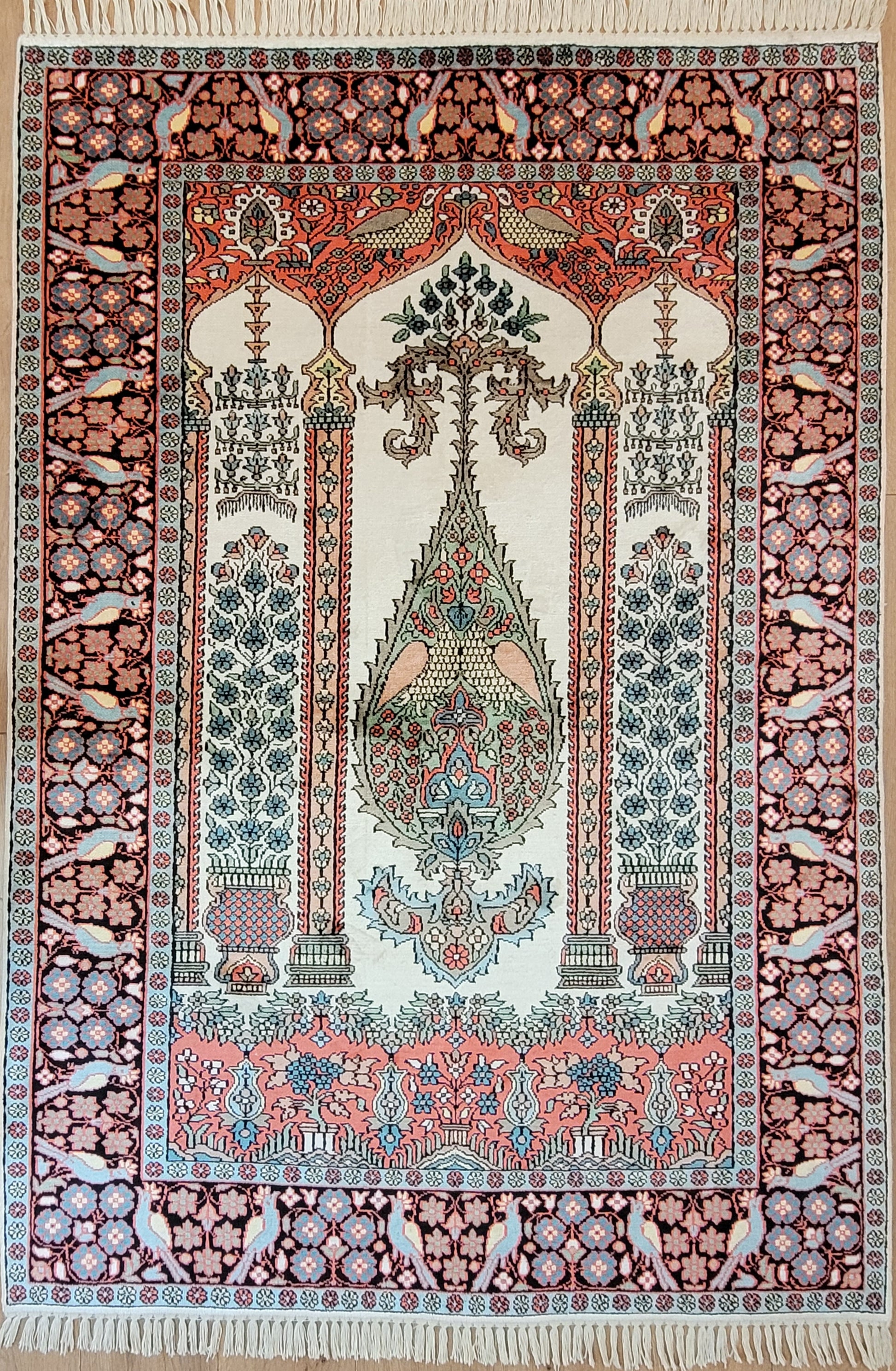 angeboten wird ein exquisiter Kaschmir Seidenteppich in feiner Handknüpfung. Dieser edle Teppich besticht durch sein klassisches Gebetsteppich-Design mit einer zentralen stilisierten Mihrab-Nische, flankiert von floralen Vasenmotiven und dekorativen Ornamenten. Das Hauptfeld ist mit detailreichen Ranken, Blüten und Vögeln geschmückt, die in harmonischer Farbgebung eine besonders elegante Wirkung entfalten.
