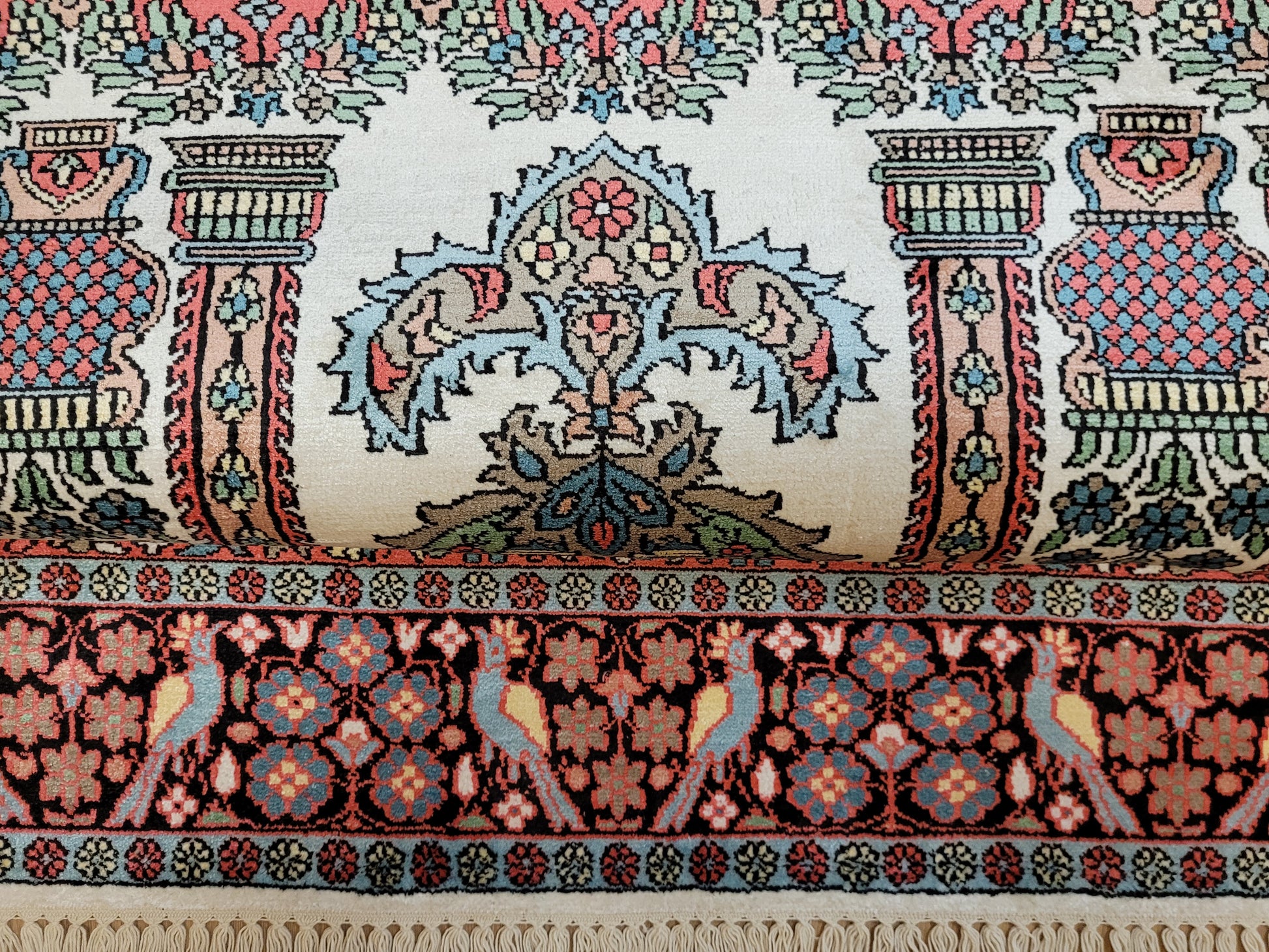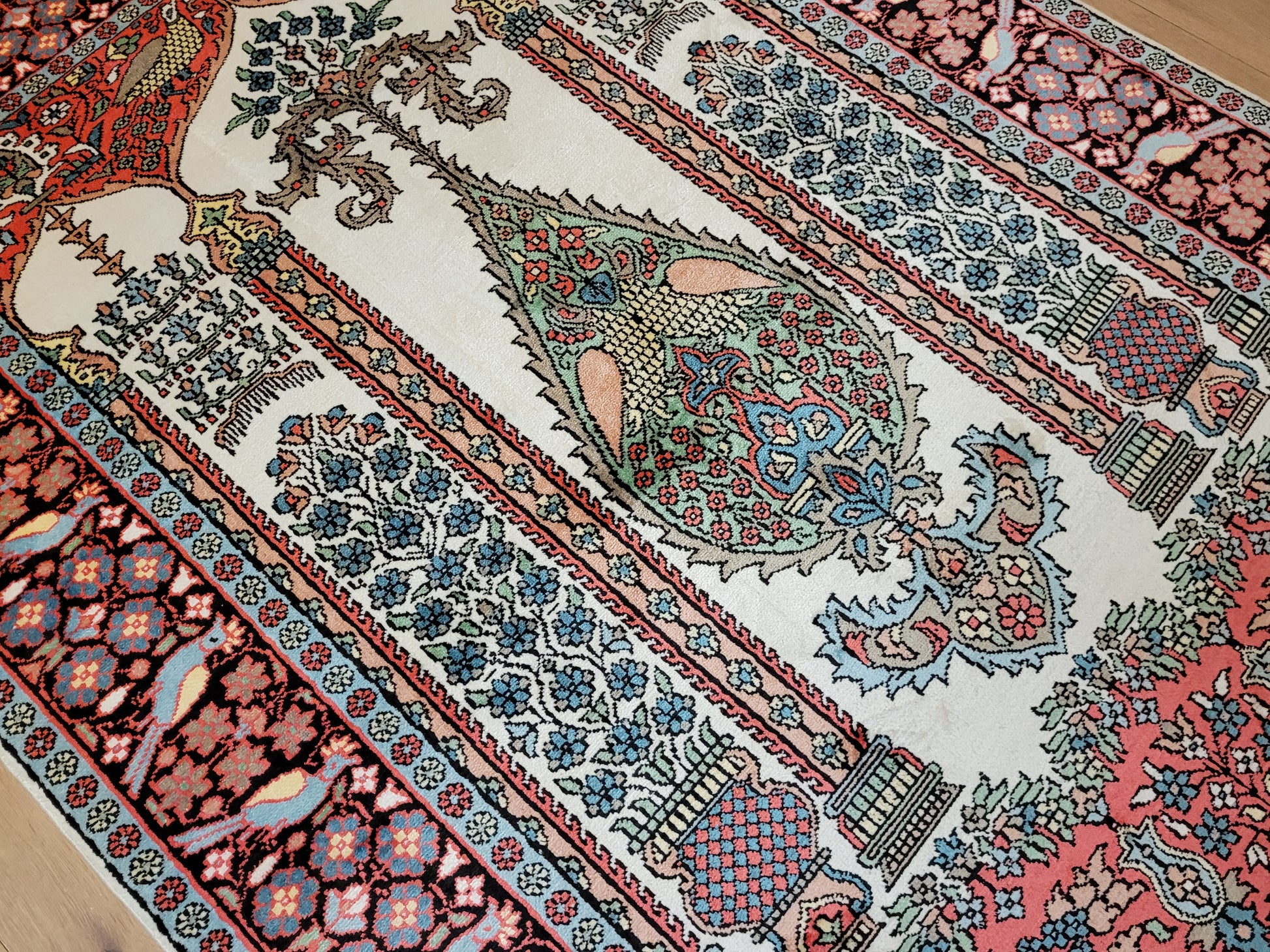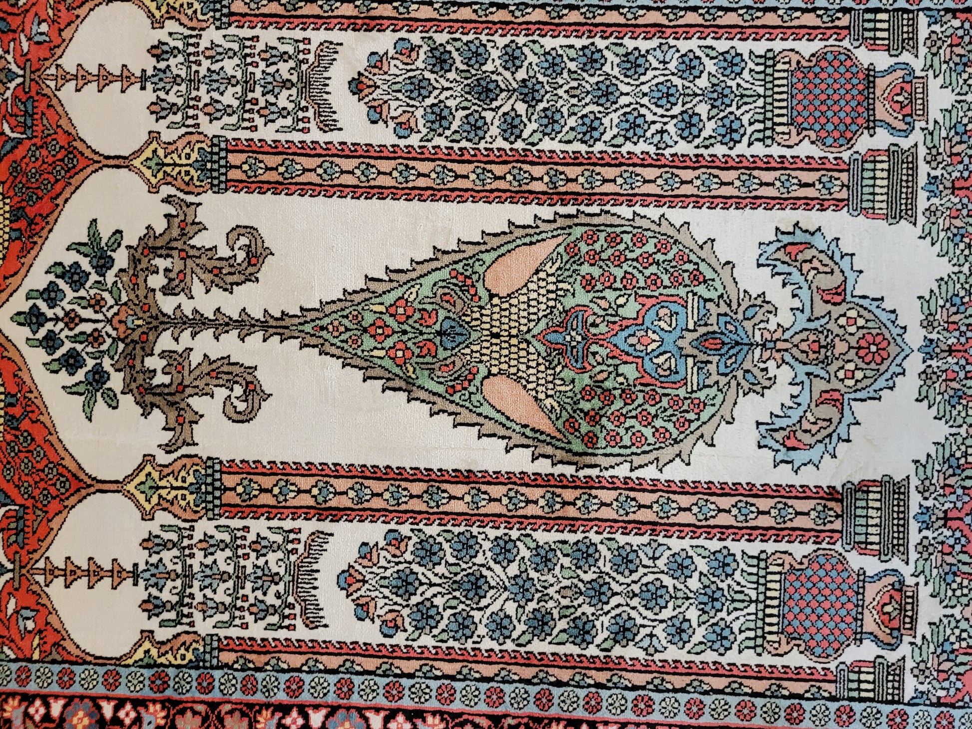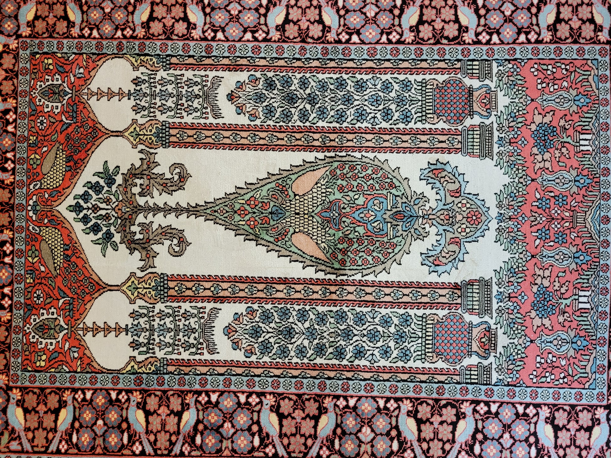 angeboten wird ein exquisiter Kaschmir Seidenteppich in feiner Handknüpfung. Dieser edle Teppich besticht durch sein klassisches Gebetsteppich-Design mit einer zentralen stilisierten Mihrab-Nische, flankiert von floralen Vasenmotiven und dekorativen Ornamenten. Das Hauptfeld ist mit detailreichen Ranken, Blüten und Vögeln geschmückt, die in harmonischer Farbgebung eine besonders elegante Wirkung entfalten.