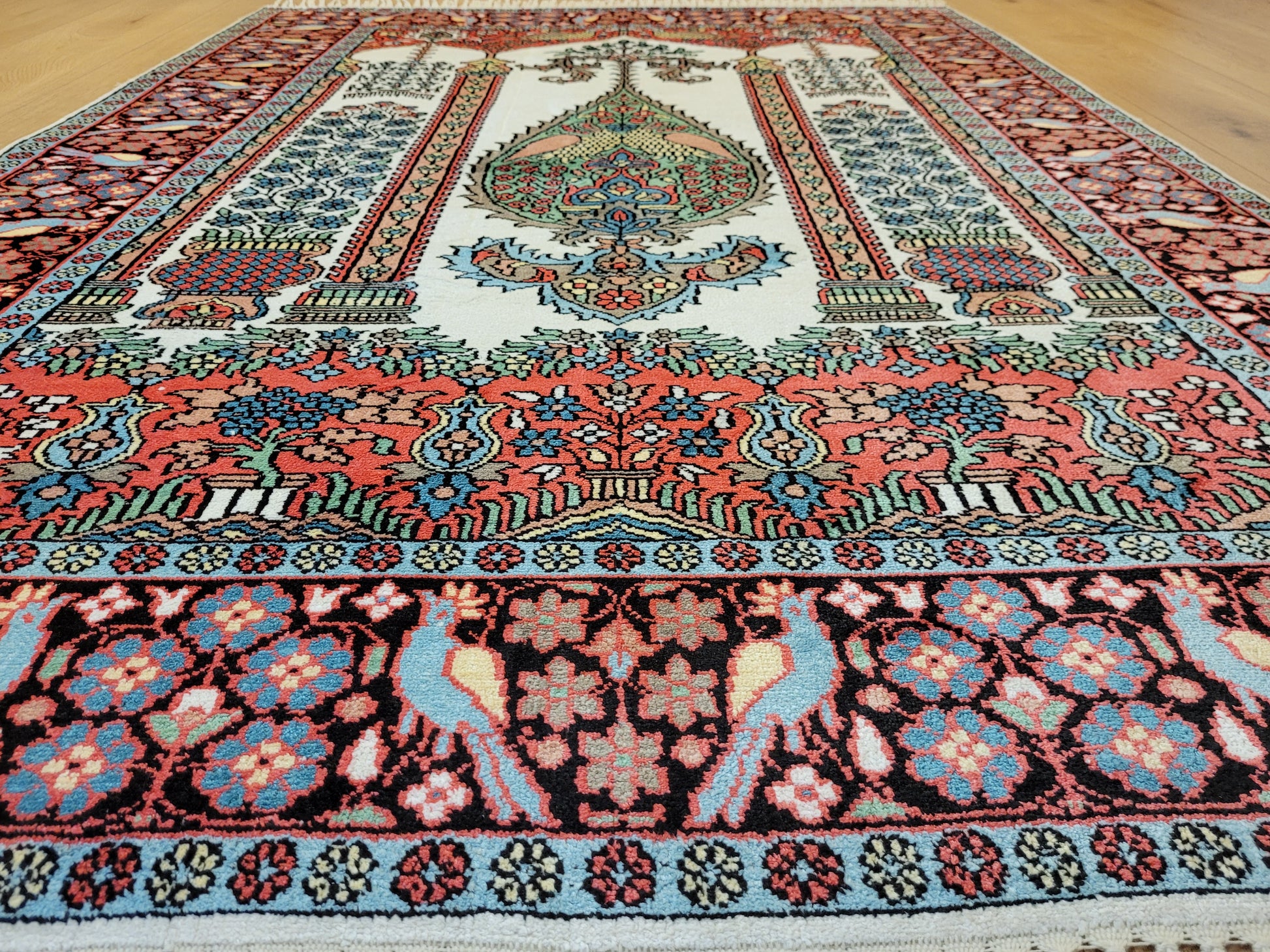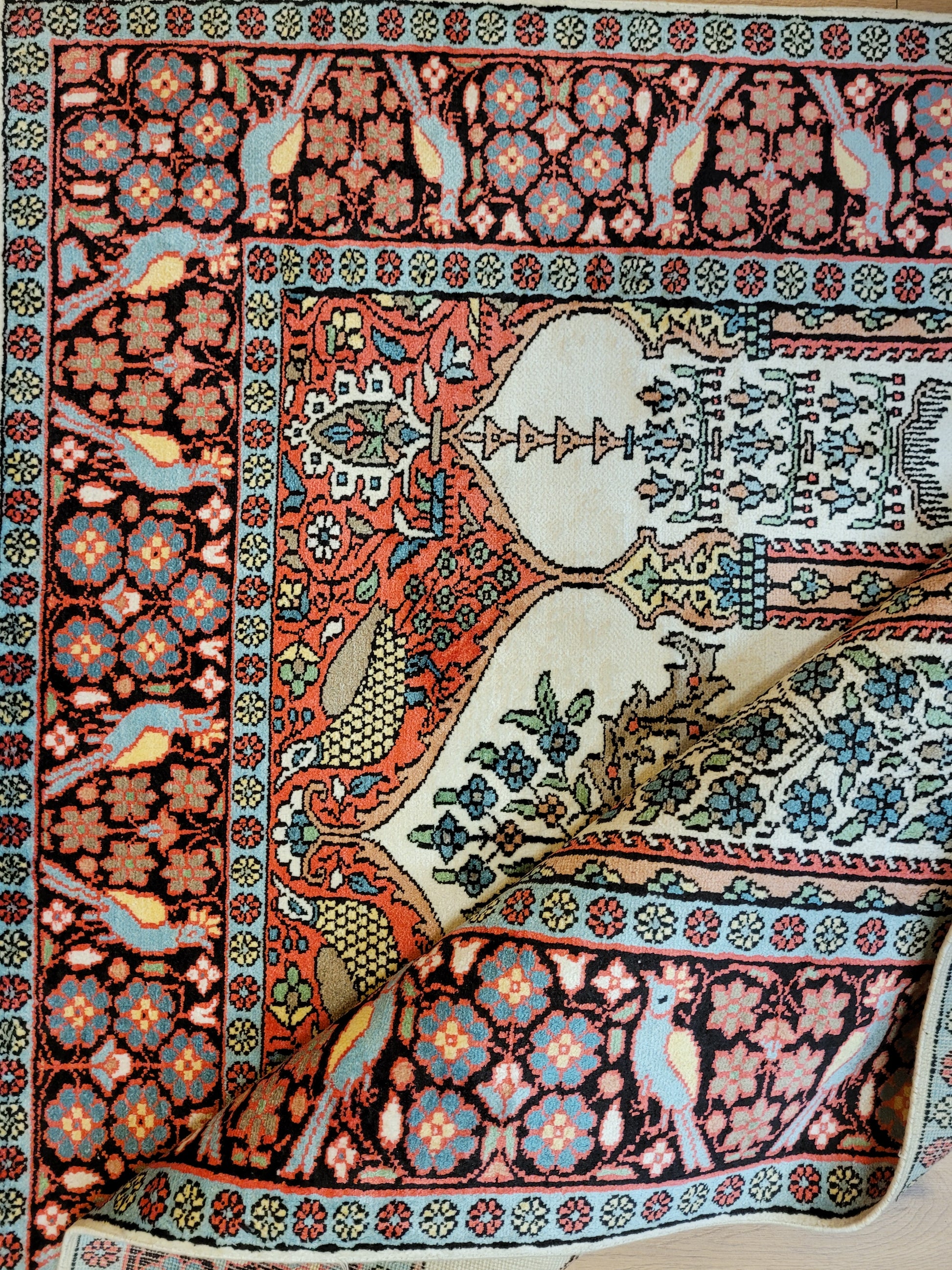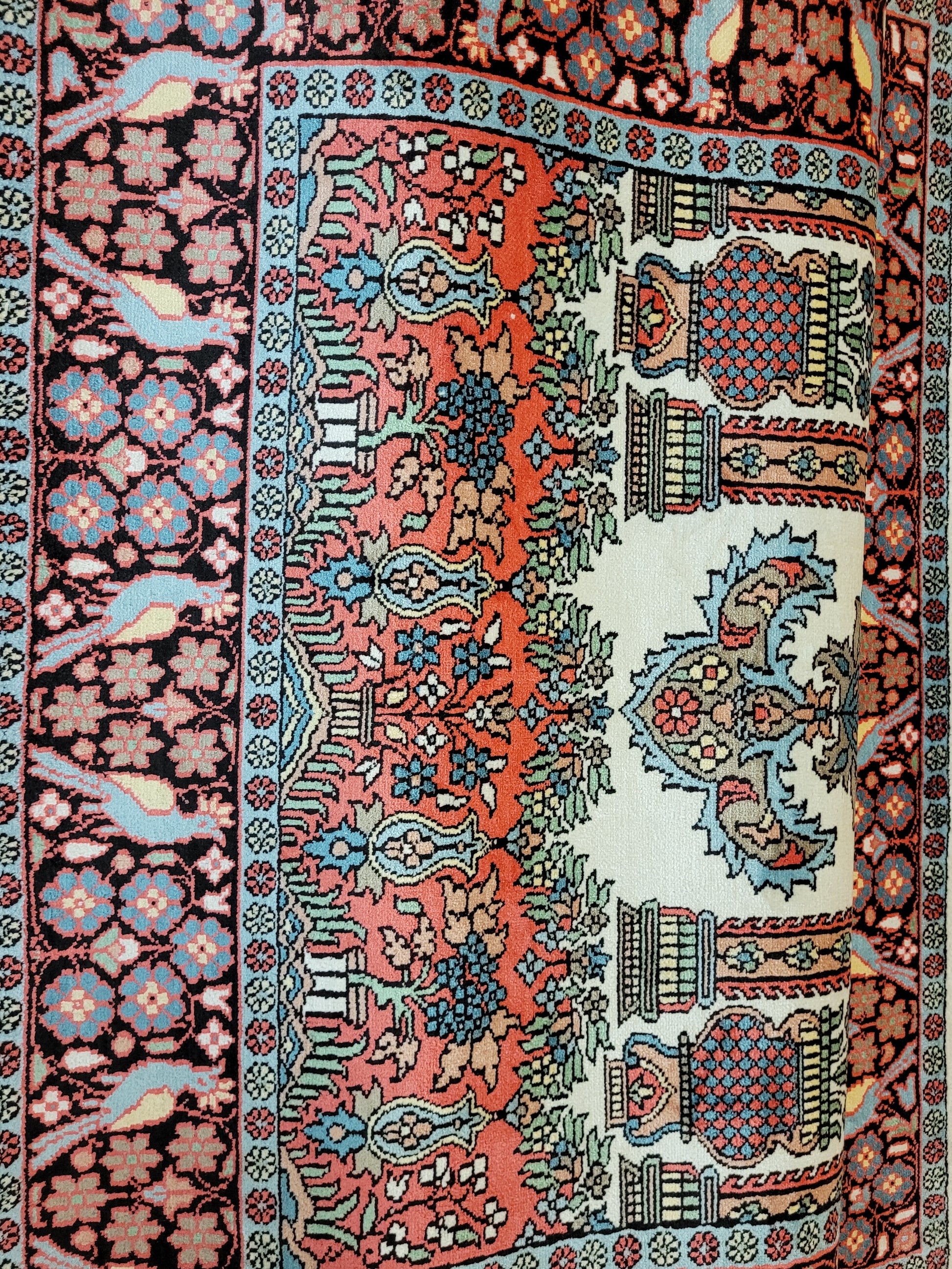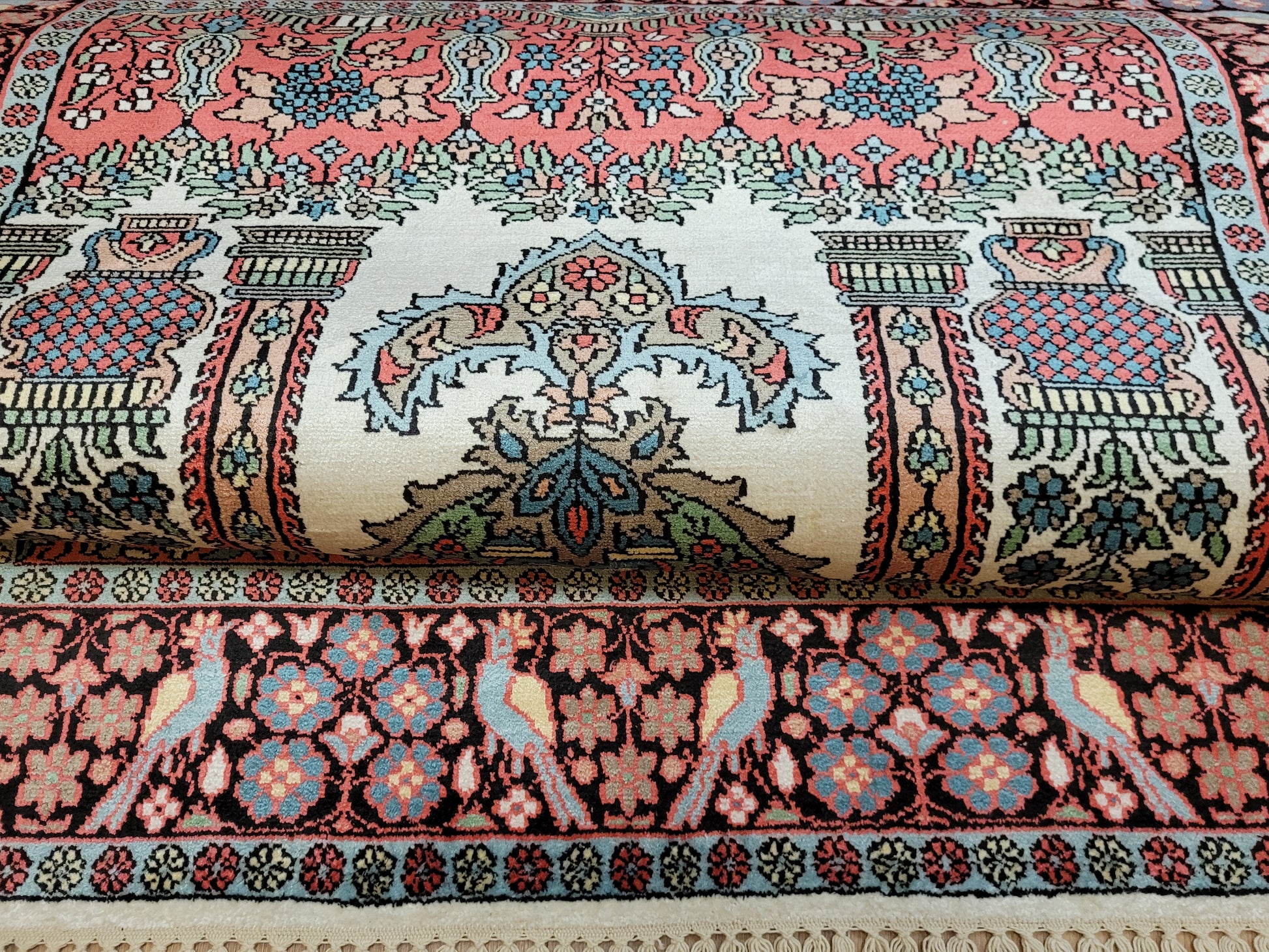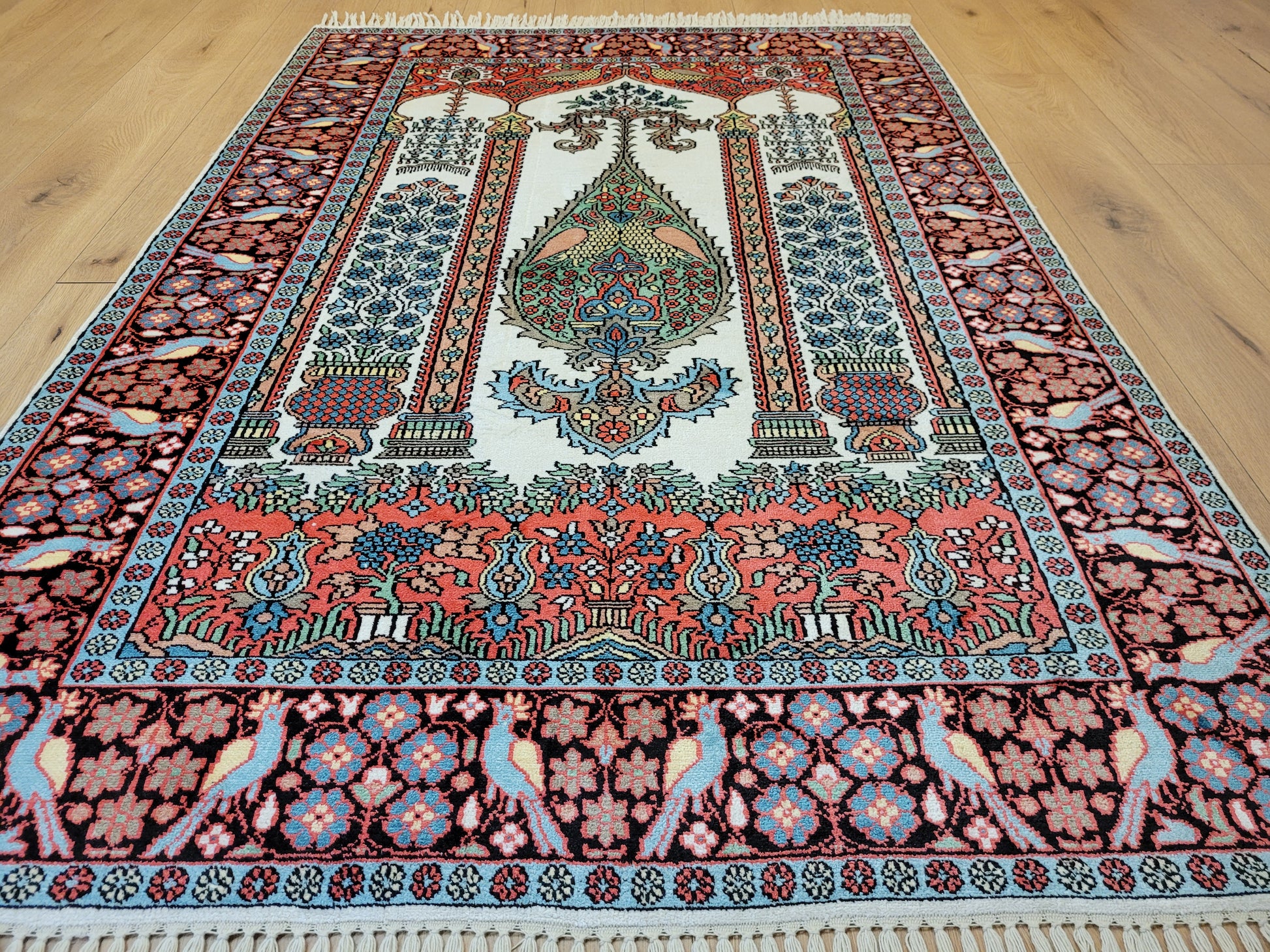angeboten wird ein exquisiter Kaschmir Seidenteppich in feiner Handknüpfung. Dieser edle Teppich besticht durch sein klassisches Gebetsteppich-Design mit einer zentralen stilisierten Mihrab-Nische, flankiert von floralen Vasenmotiven und dekorativen Ornamenten. Das Hauptfeld ist mit detailreichen Ranken, Blüten und Vögeln geschmückt, die in harmonischer Farbgebung eine besonders elegante Wirkung entfalten.