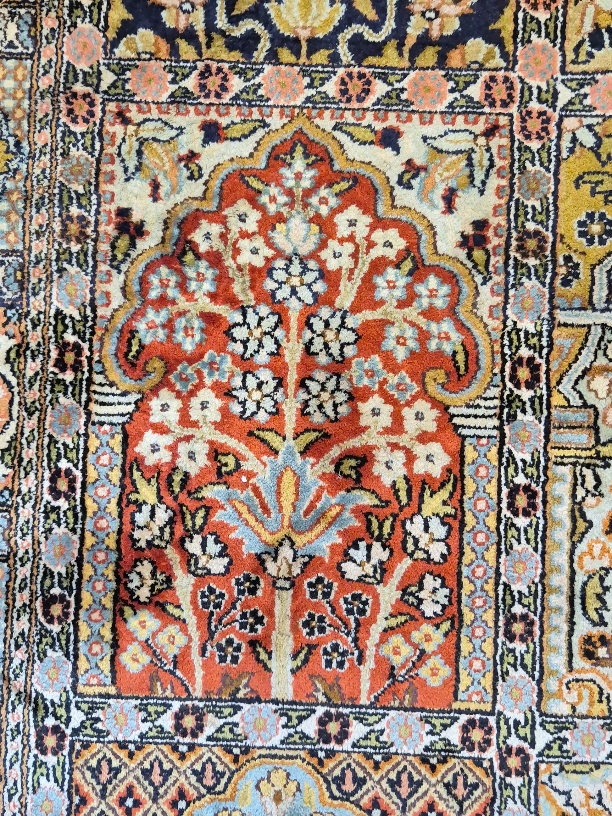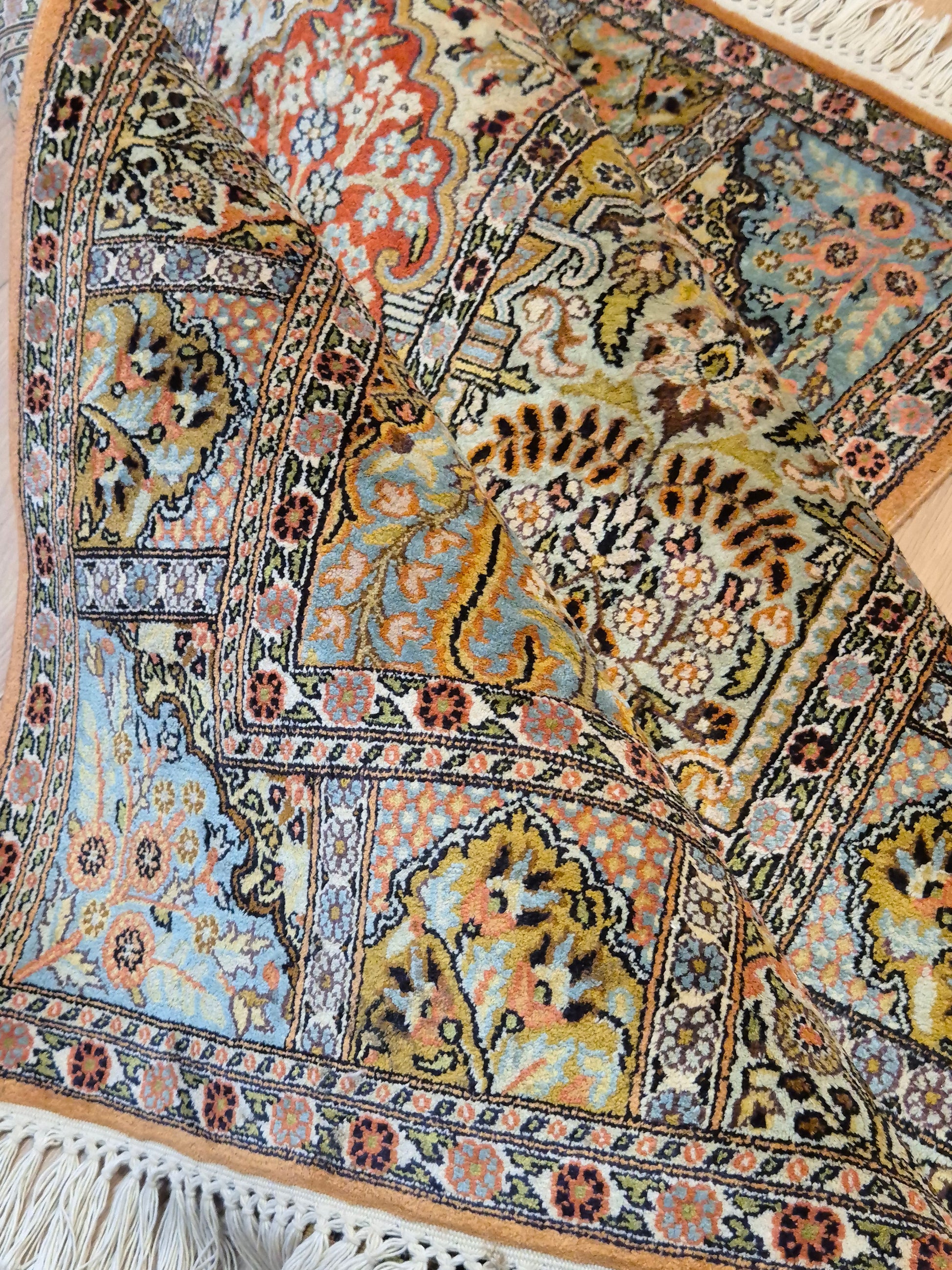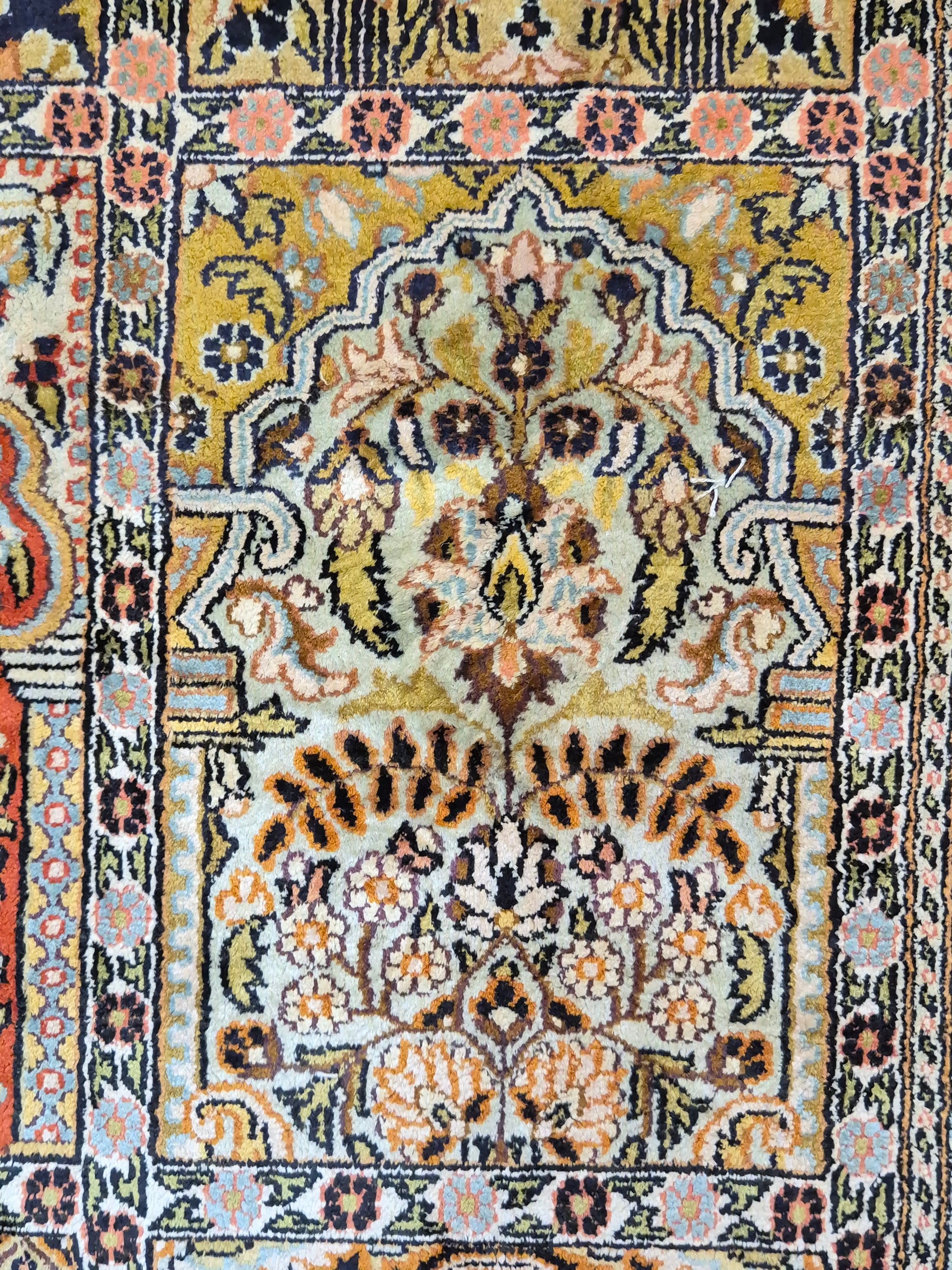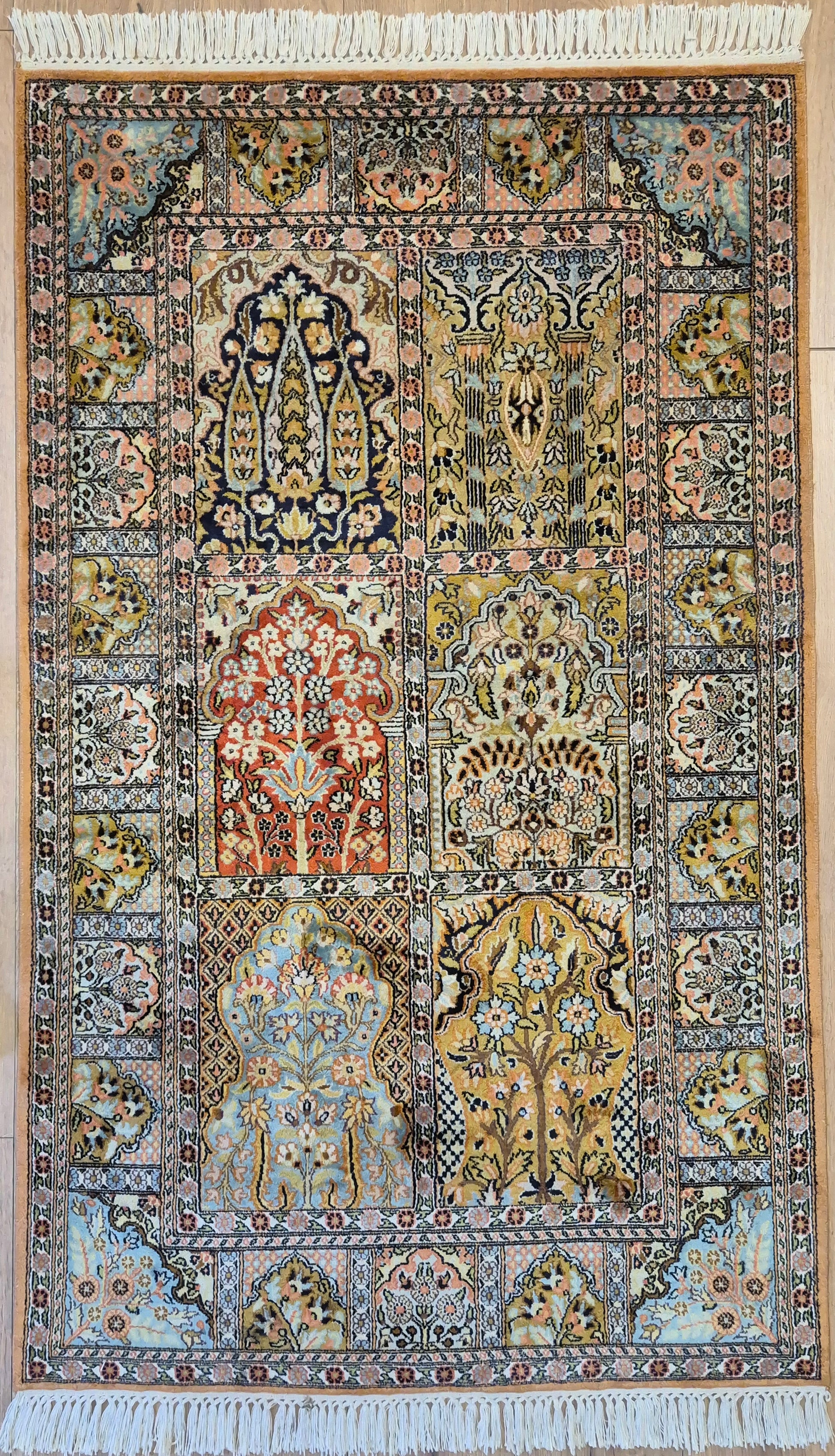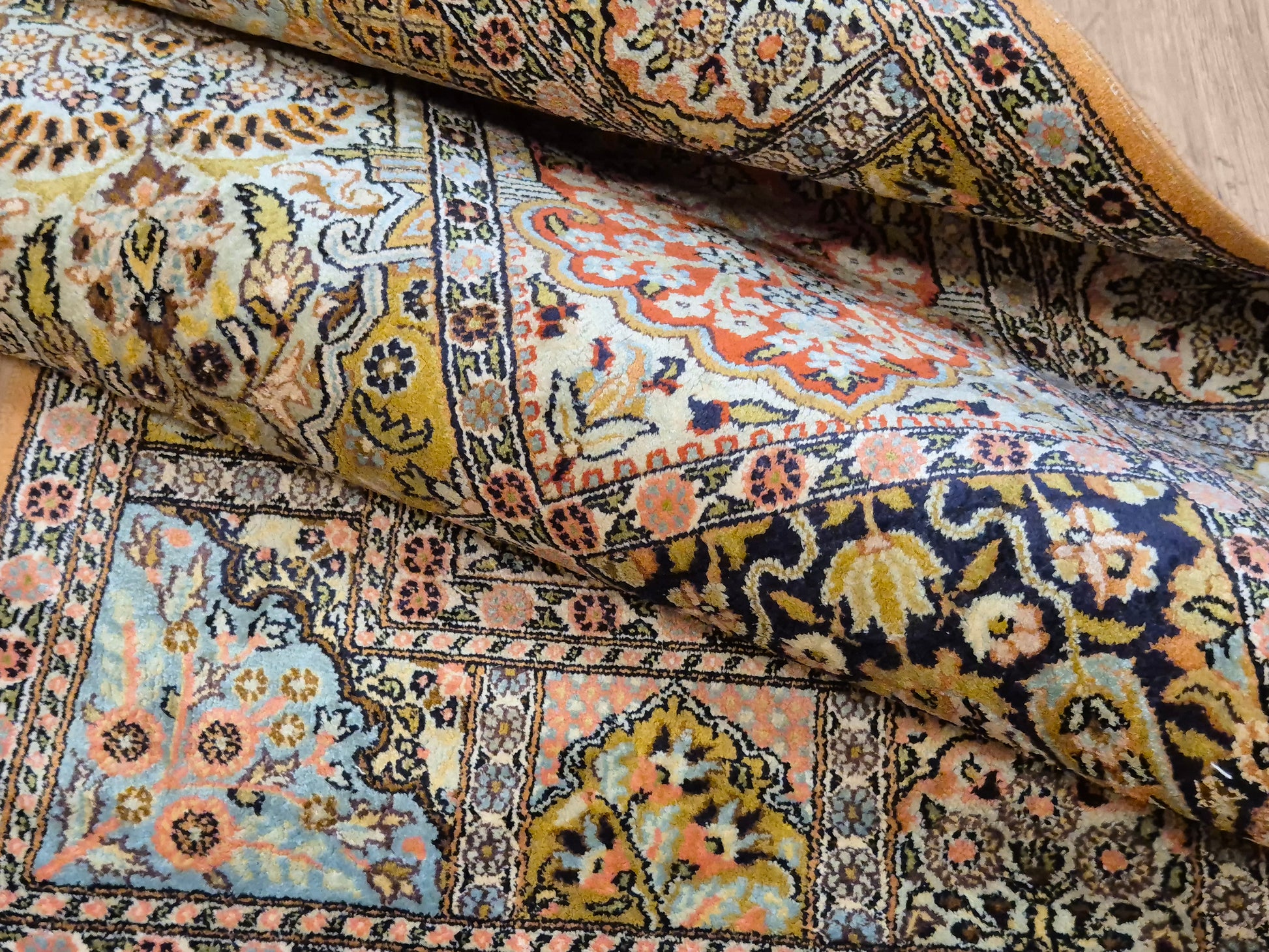 angeboten wird ein edler Kaschmir Teppich aus reiner Naturseide, handgeknüpft in feiner Ausführung. Das außergewöhnliche Design ist im Stil eines Gebetsteppichs gearbeitet und zeigt eine Komposition aus mehreren Mihrab-Feldern mit kunstvollen floralen Mustern. Durch den seidigen Glanz und die feine Knüpfung erhält dieser Teppich eine elegante Ausstrahlung und beeindruckt mit seinem detailreichen Bildaufbau.
