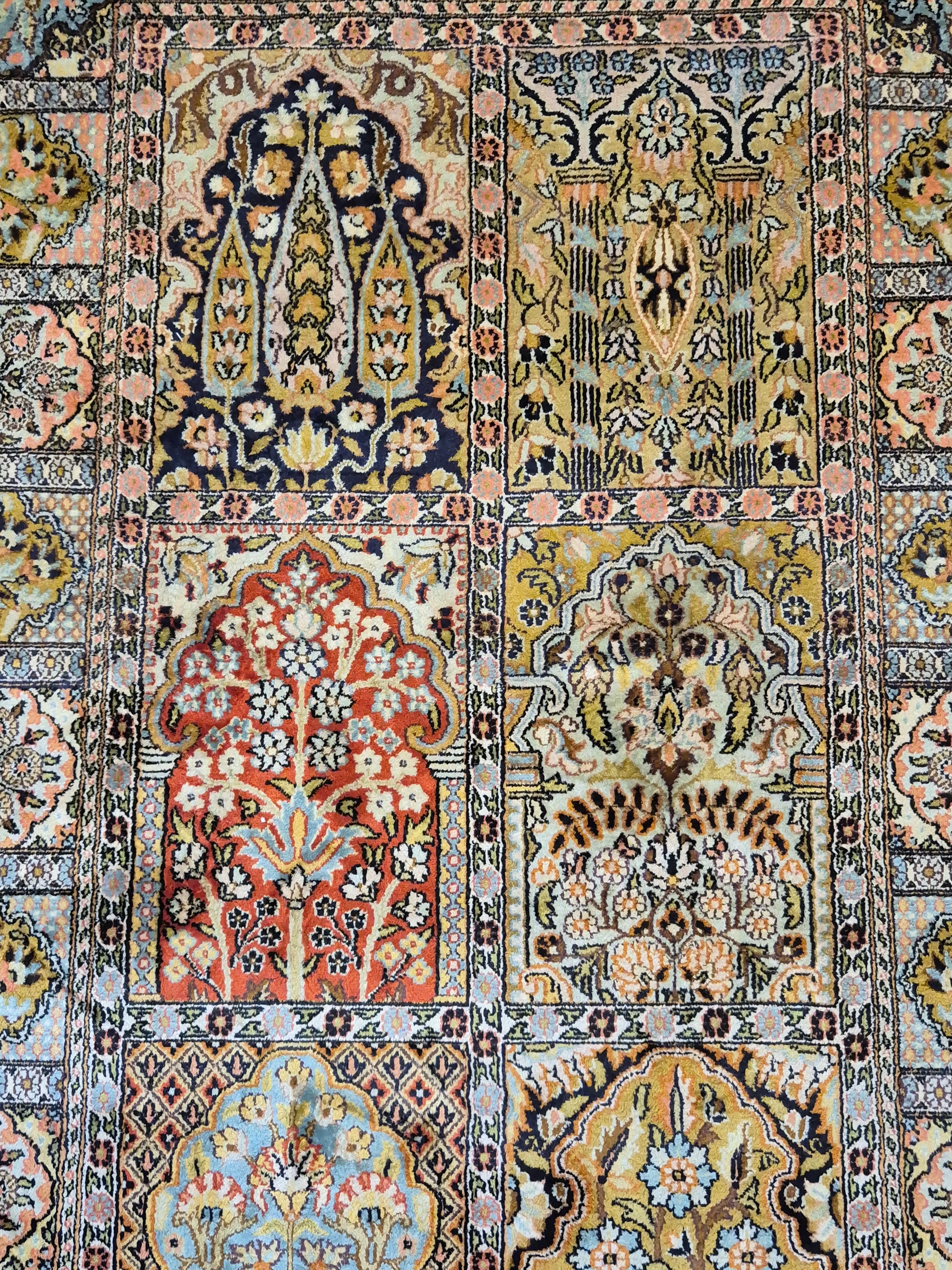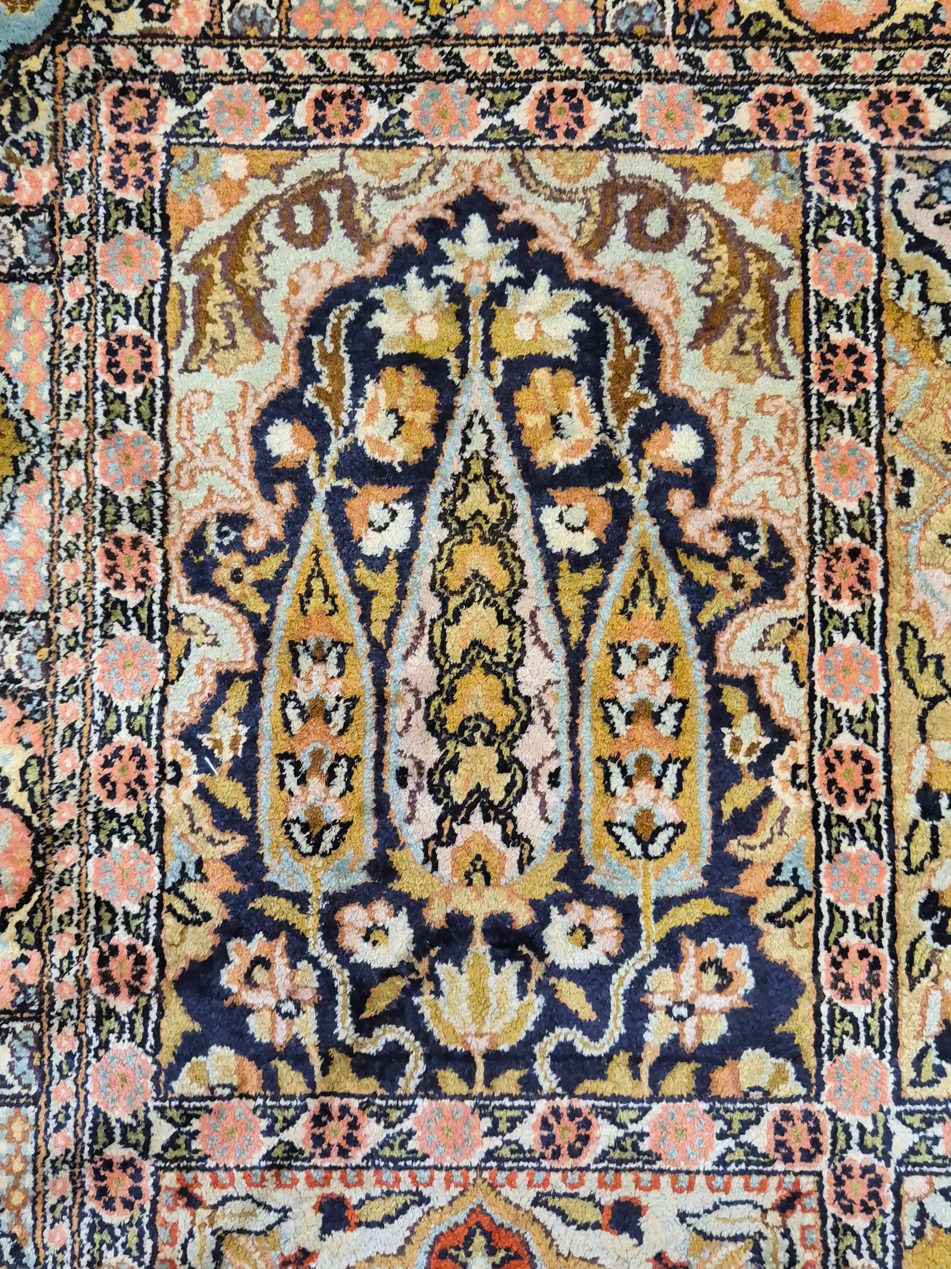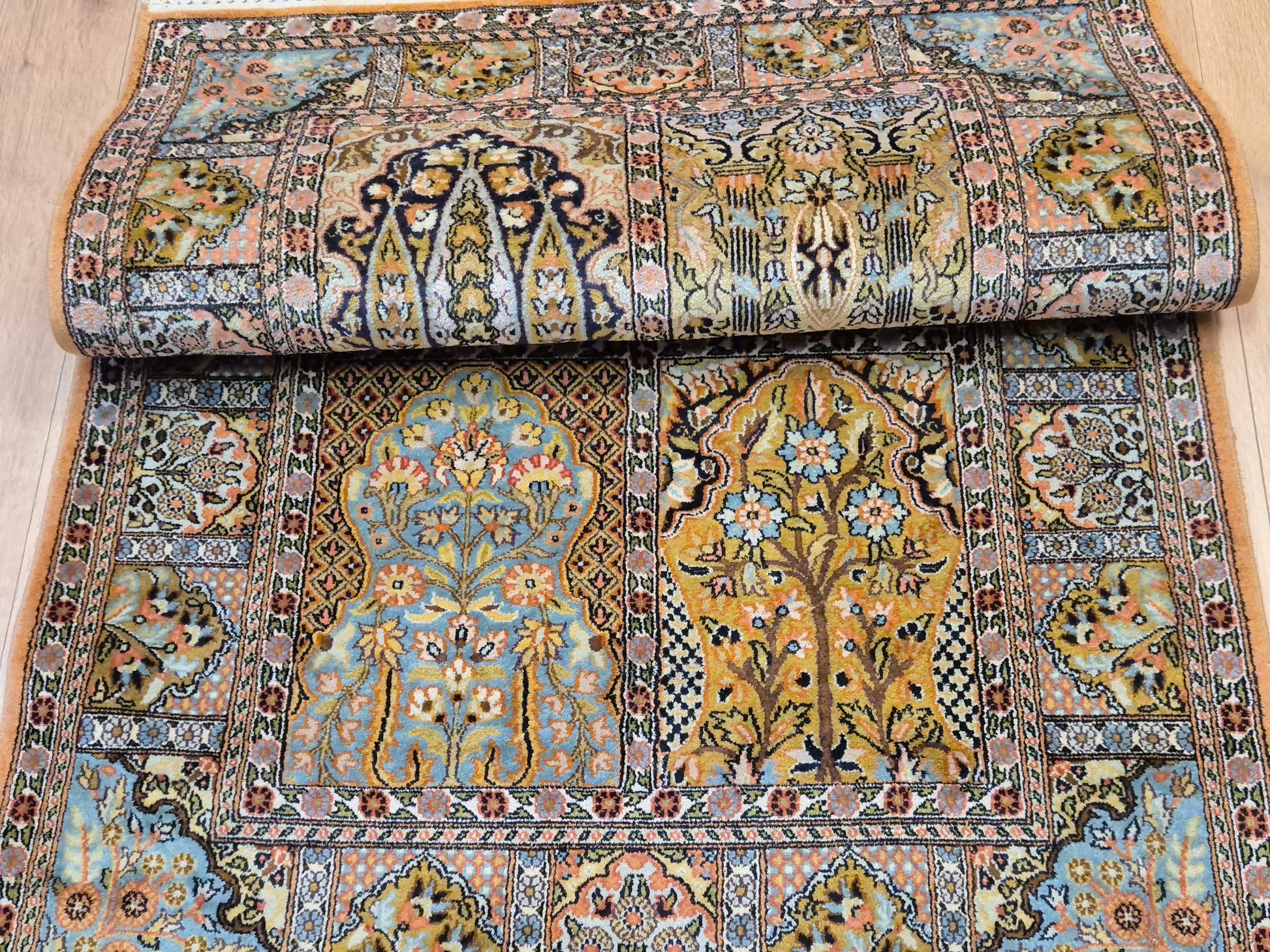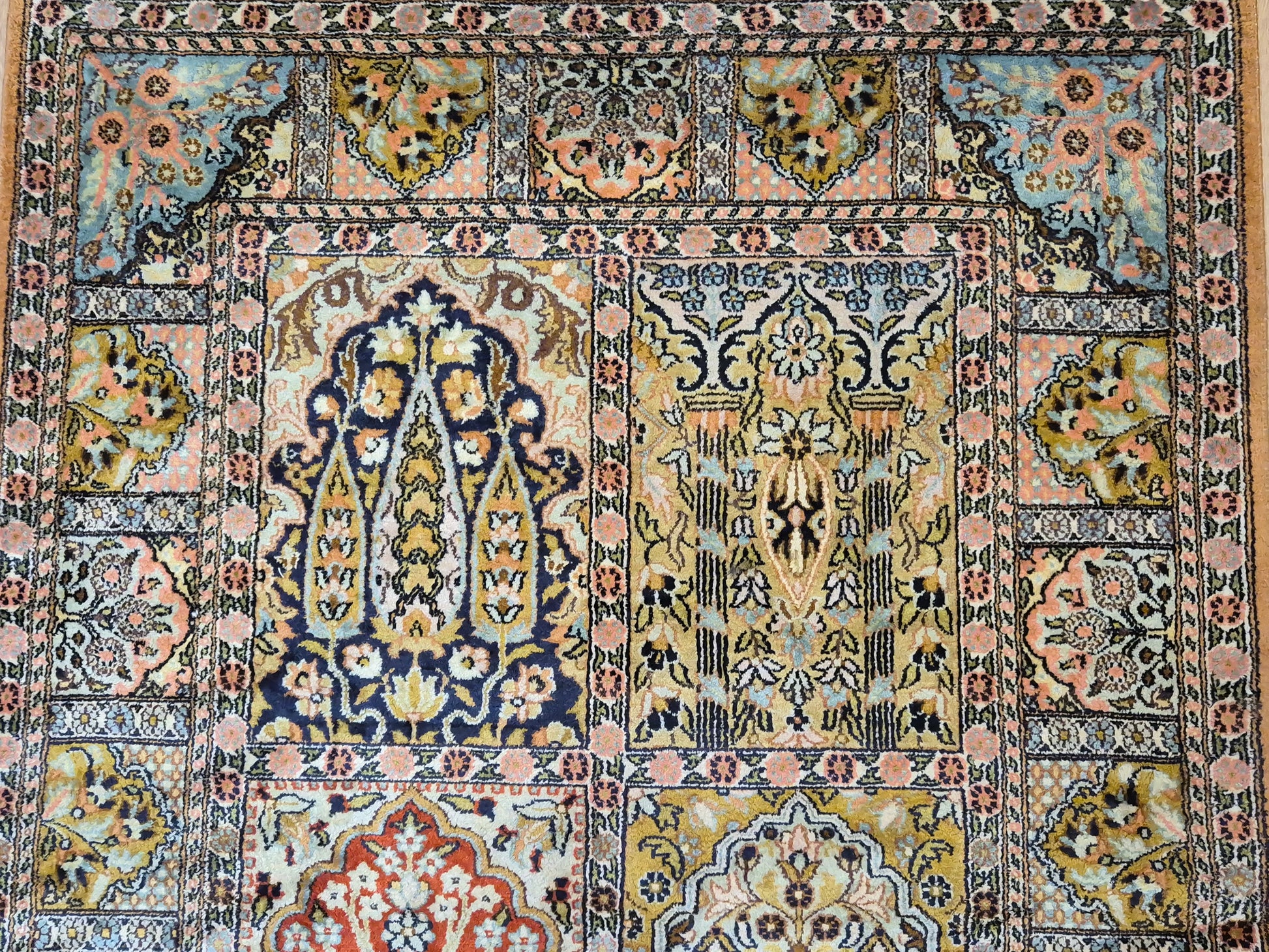 angeboten wird ein edler Kaschmir Teppich aus reiner Naturseide, handgeknüpft in feiner Ausführung. Das außergewöhnliche Design ist im Stil eines Gebetsteppichs gearbeitet und zeigt eine Komposition aus mehreren Mihrab-Feldern mit kunstvollen floralen Mustern. Durch den seidigen Glanz und die feine Knüpfung erhält dieser Teppich eine elegante Ausstrahlung und beeindruckt mit seinem detailreichen Bildaufbau.