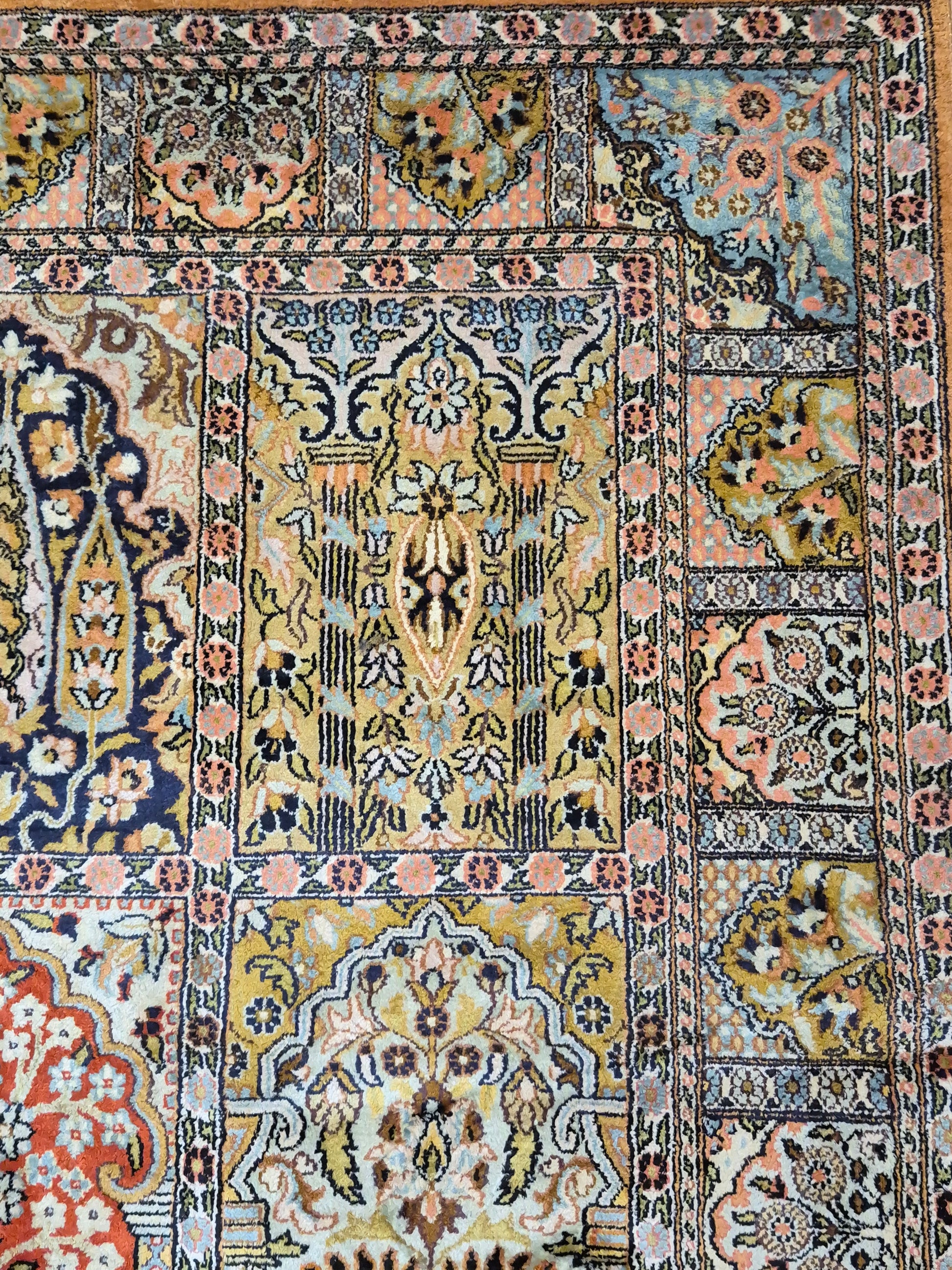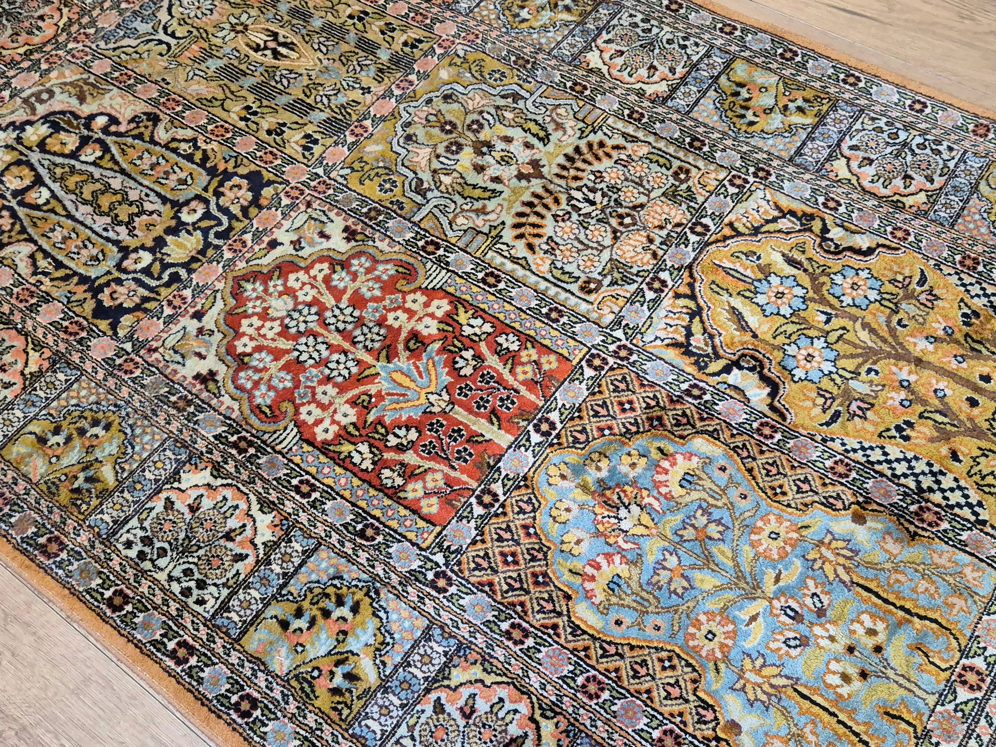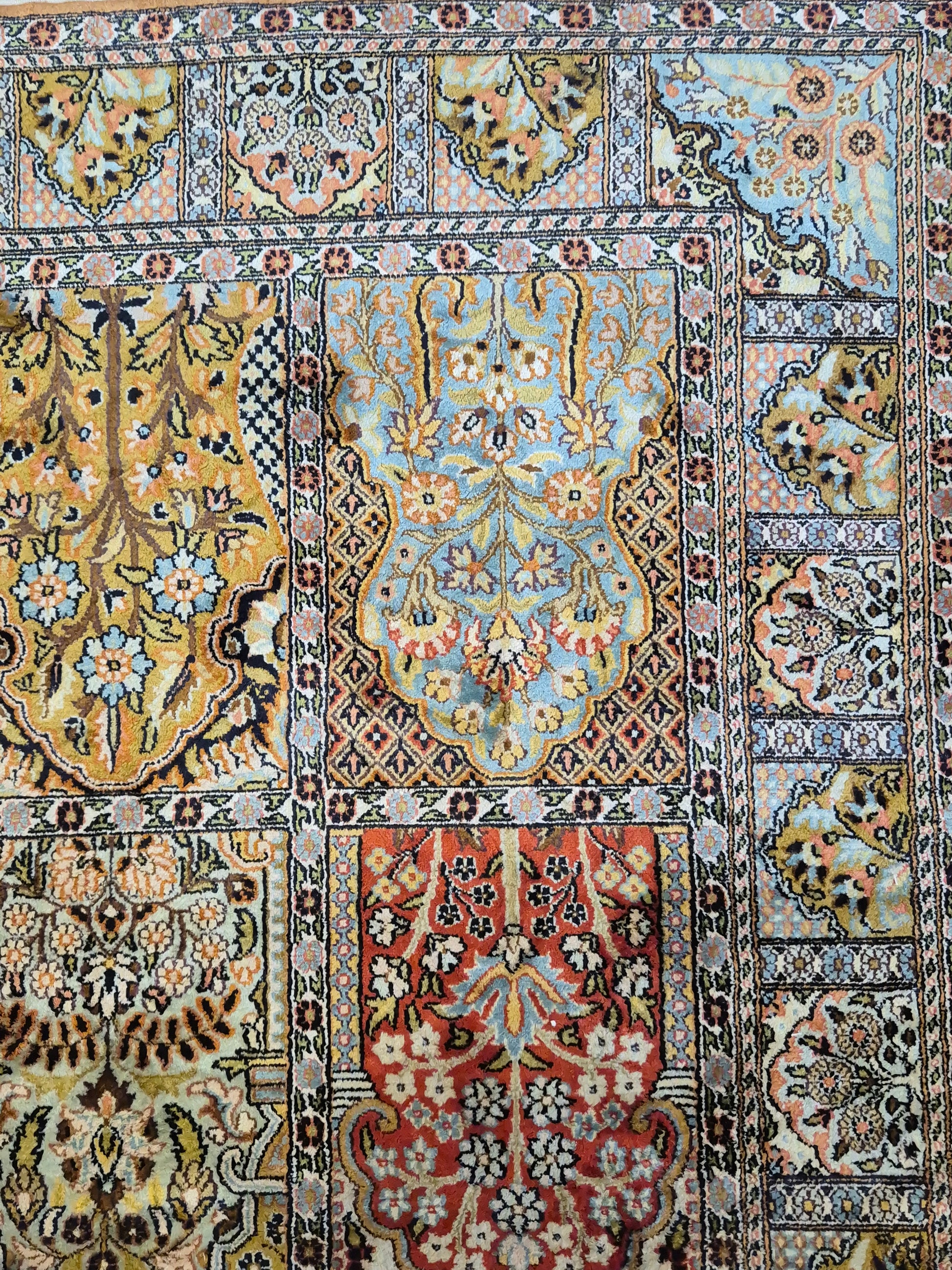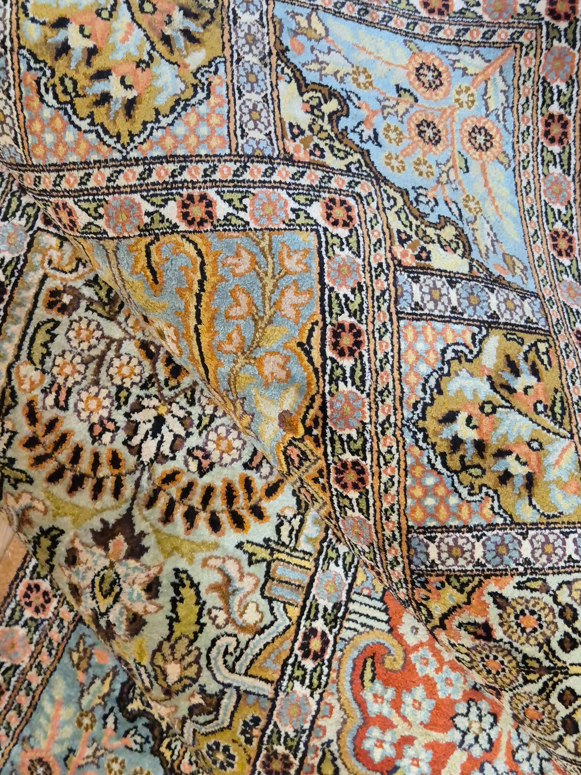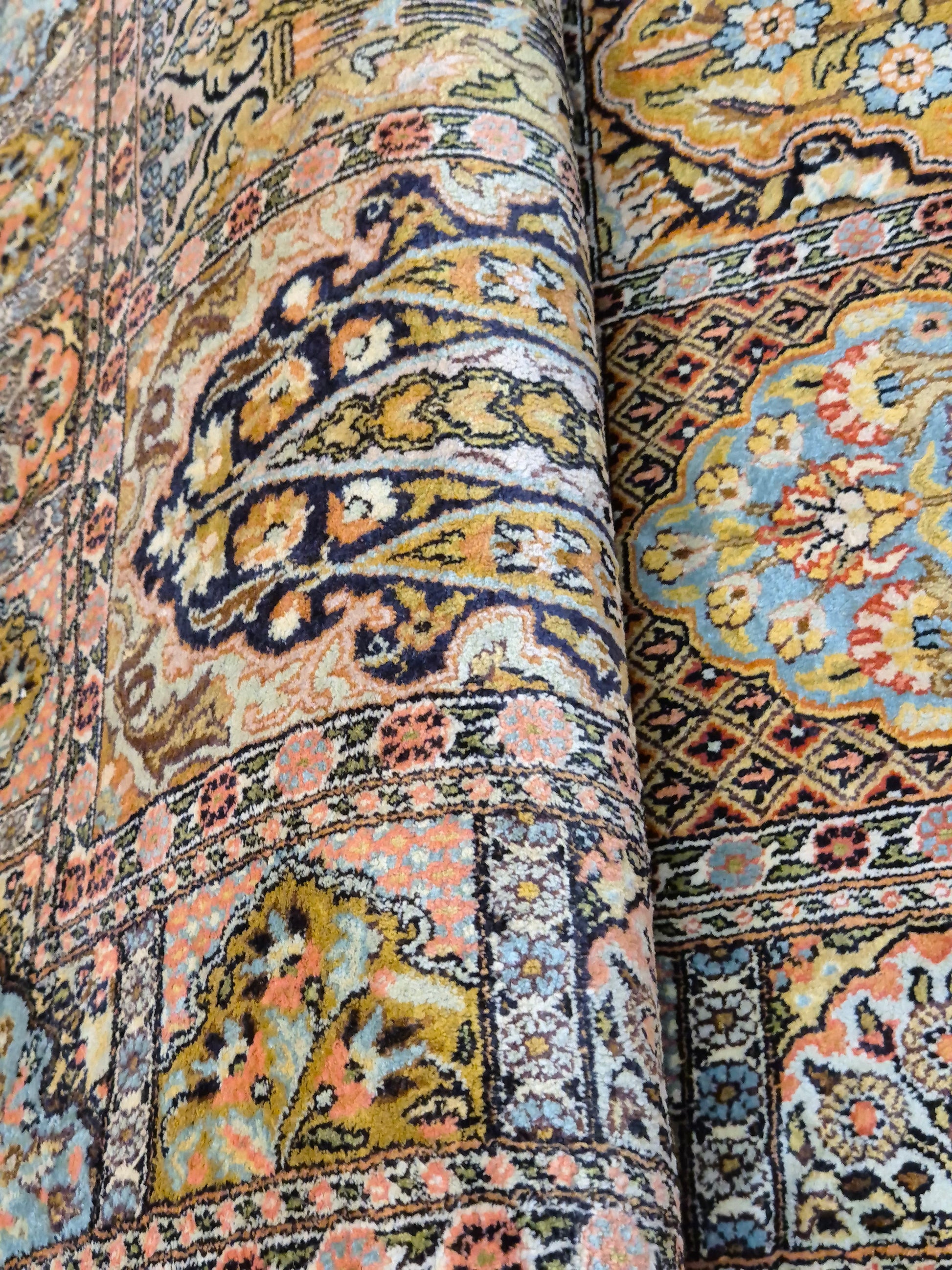 angeboten wird ein edler Kaschmir Teppich aus reiner Naturseide, handgeknüpft in feiner Ausführung. Das außergewöhnliche Design ist im Stil eines Gebetsteppichs gearbeitet und zeigt eine Komposition aus mehreren Mihrab-Feldern mit kunstvollen floralen Mustern. Durch den seidigen Glanz und die feine Knüpfung erhält dieser Teppich eine elegante Ausstrahlung und beeindruckt mit seinem detailreichen Bildaufbau.