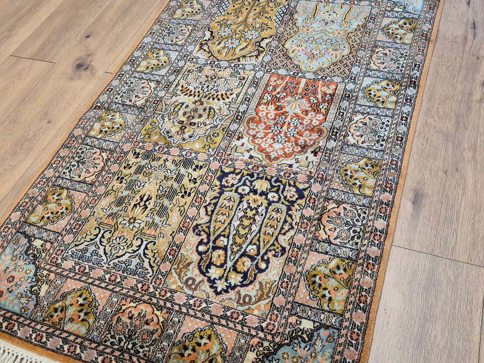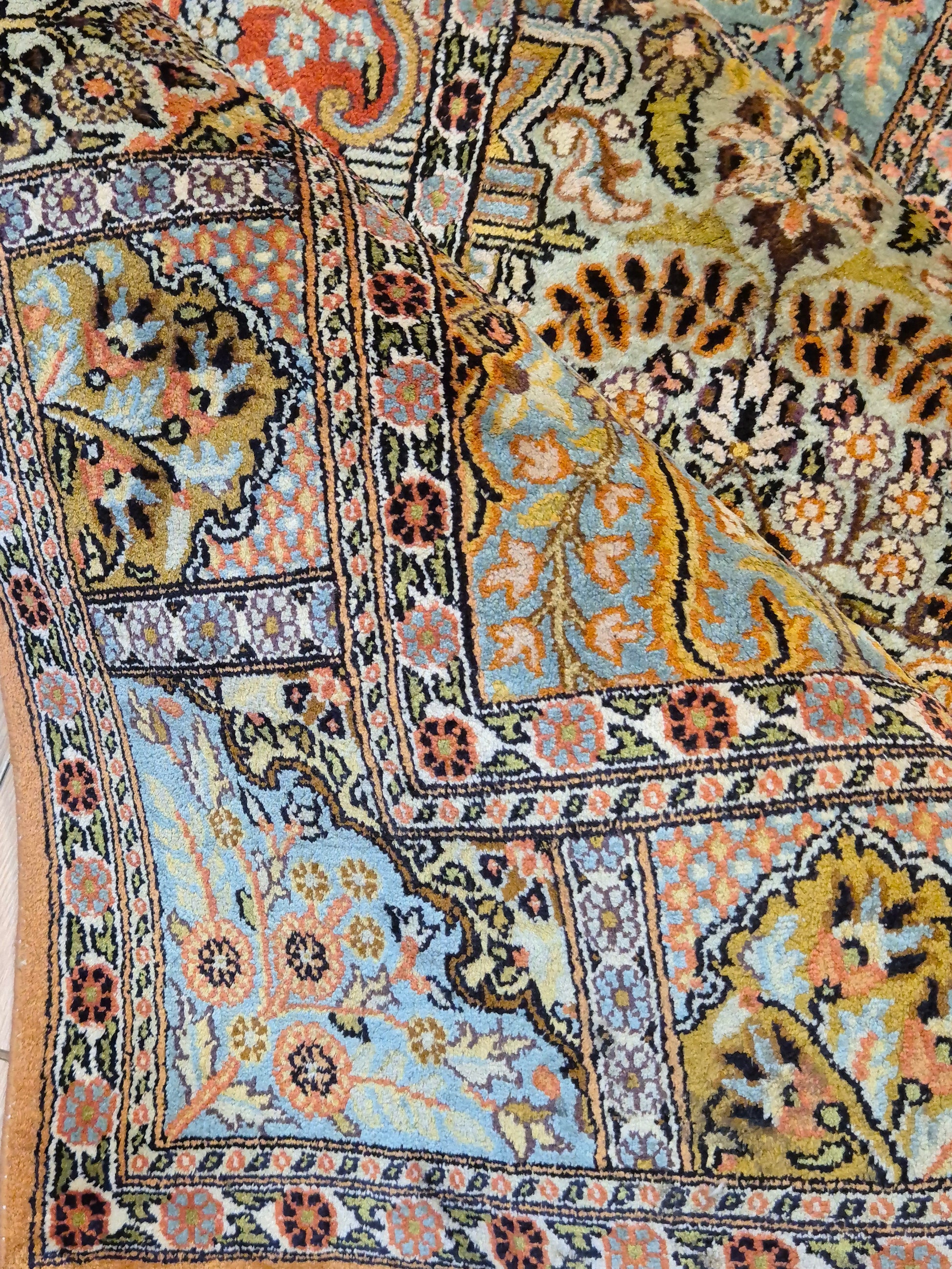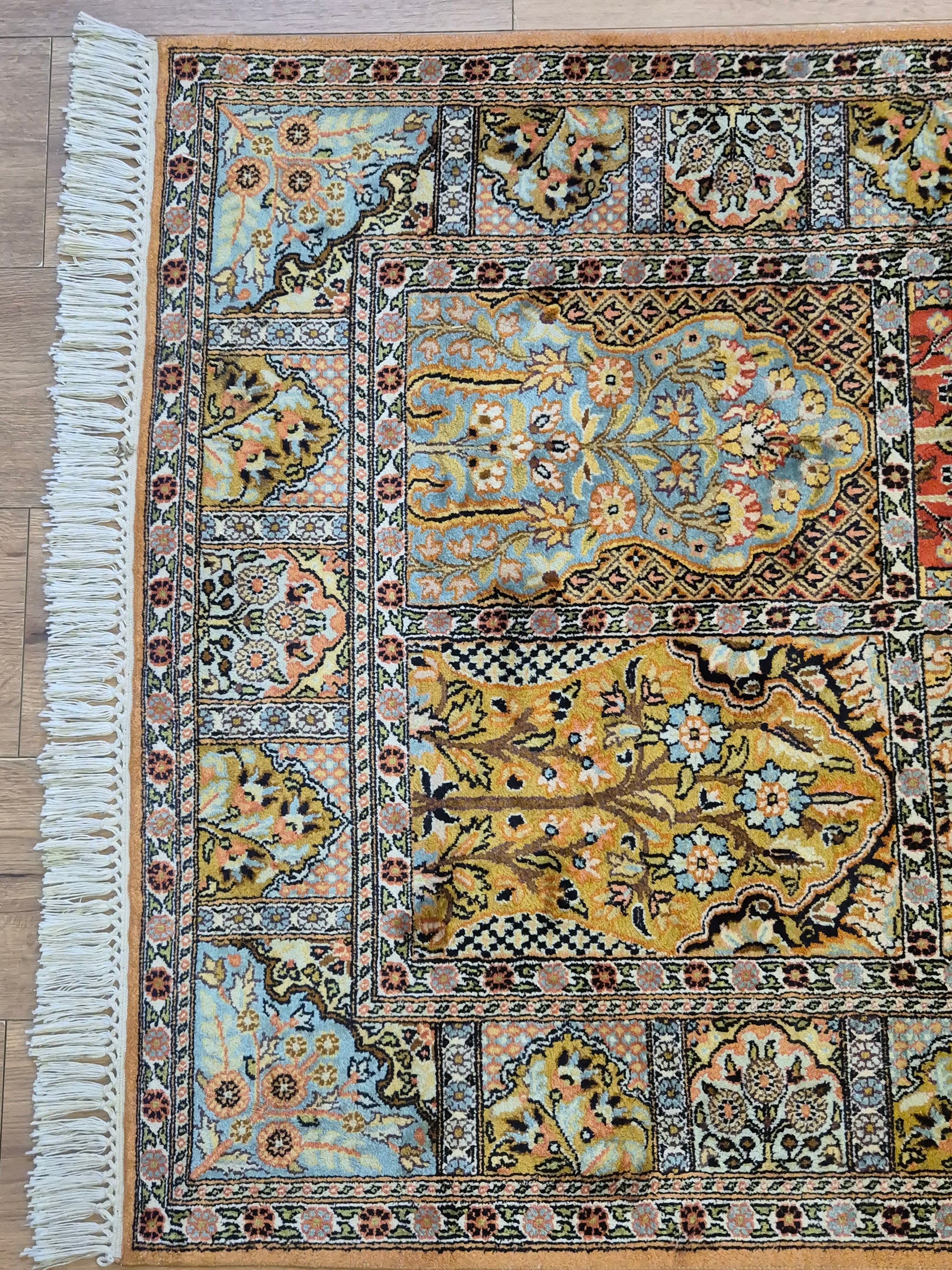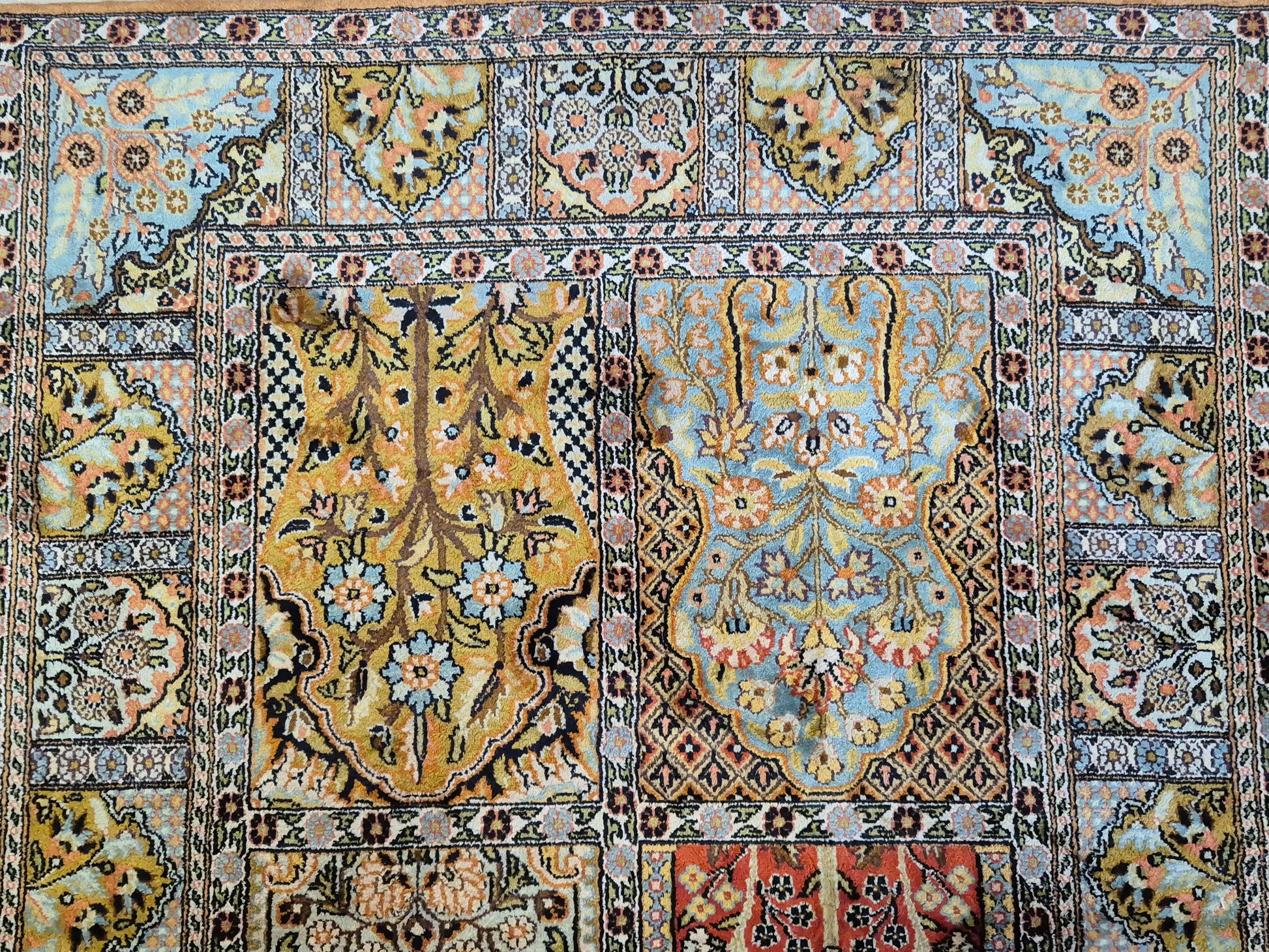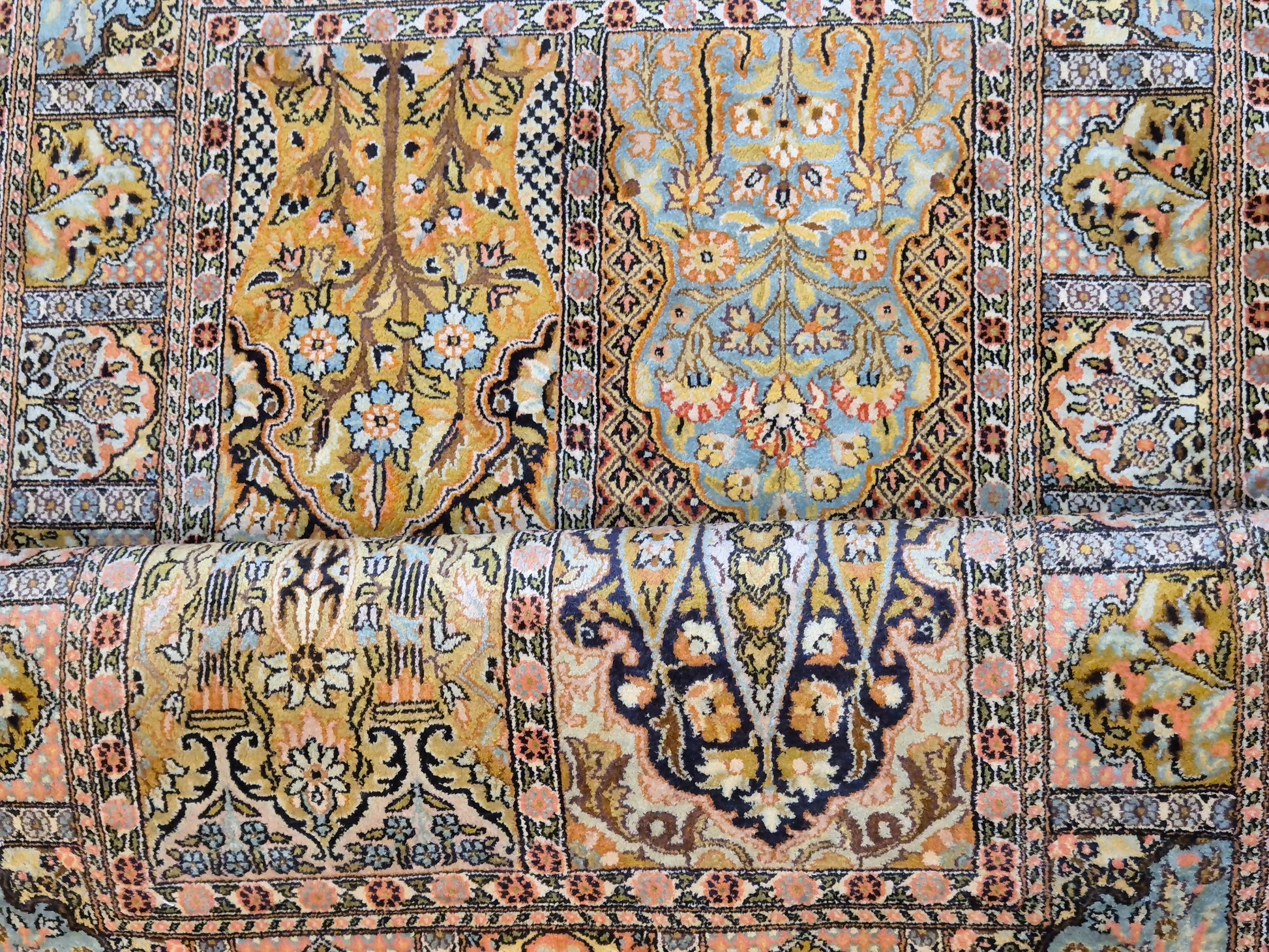 angeboten wird ein edler Kaschmir Teppich aus reiner Naturseide, handgeknüpft in feiner Ausführung. Das außergewöhnliche Design ist im Stil eines Gebetsteppichs gearbeitet und zeigt eine Komposition aus mehreren Mihrab-Feldern mit kunstvollen floralen Mustern. Durch den seidigen Glanz und die feine Knüpfung erhält dieser Teppich eine elegante Ausstrahlung und beeindruckt mit seinem detailreichen Bildaufbau.