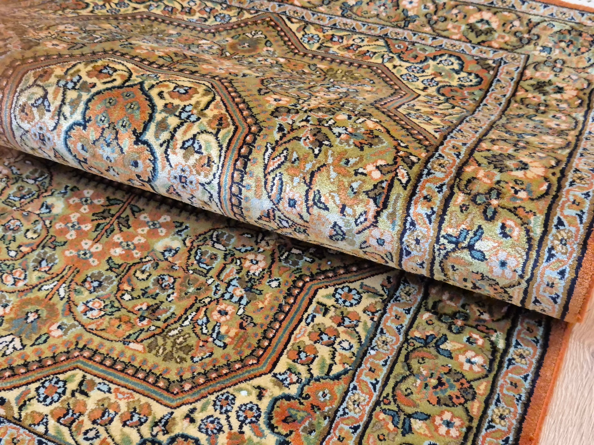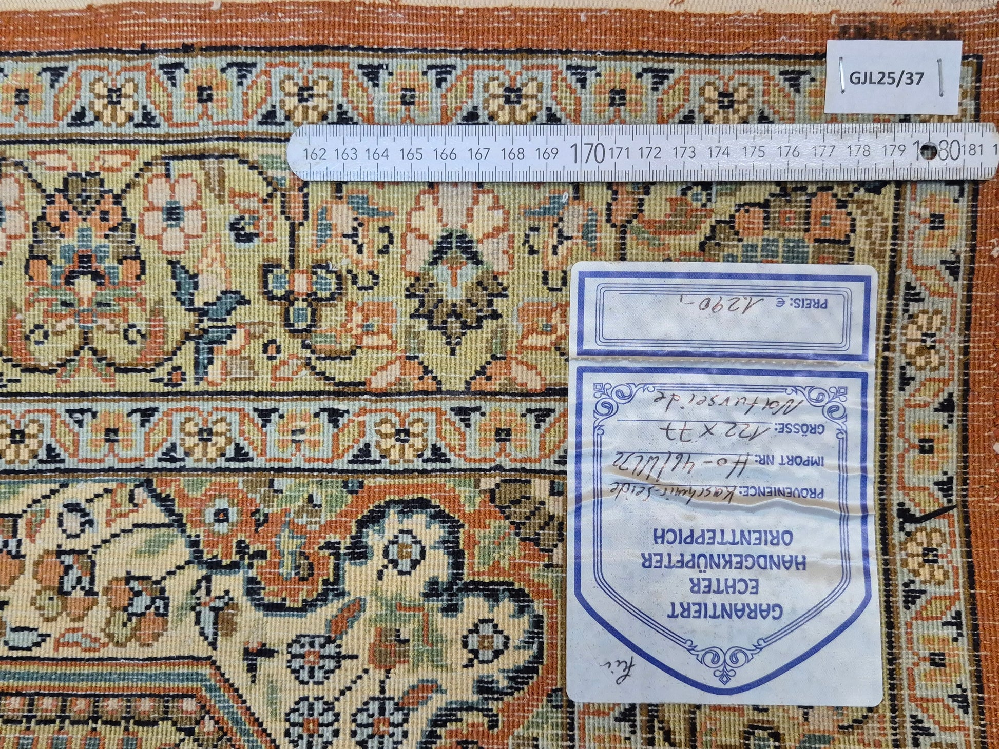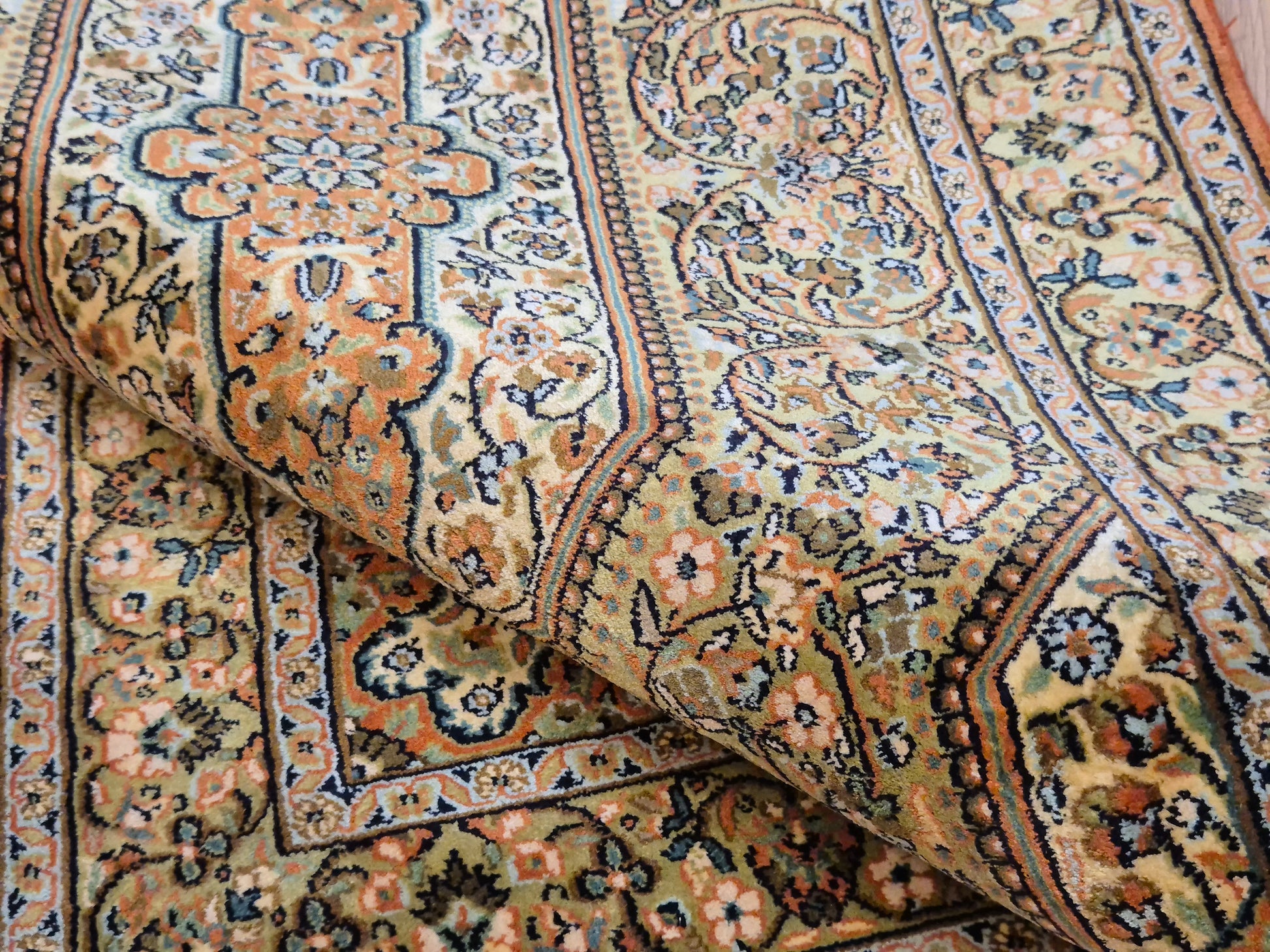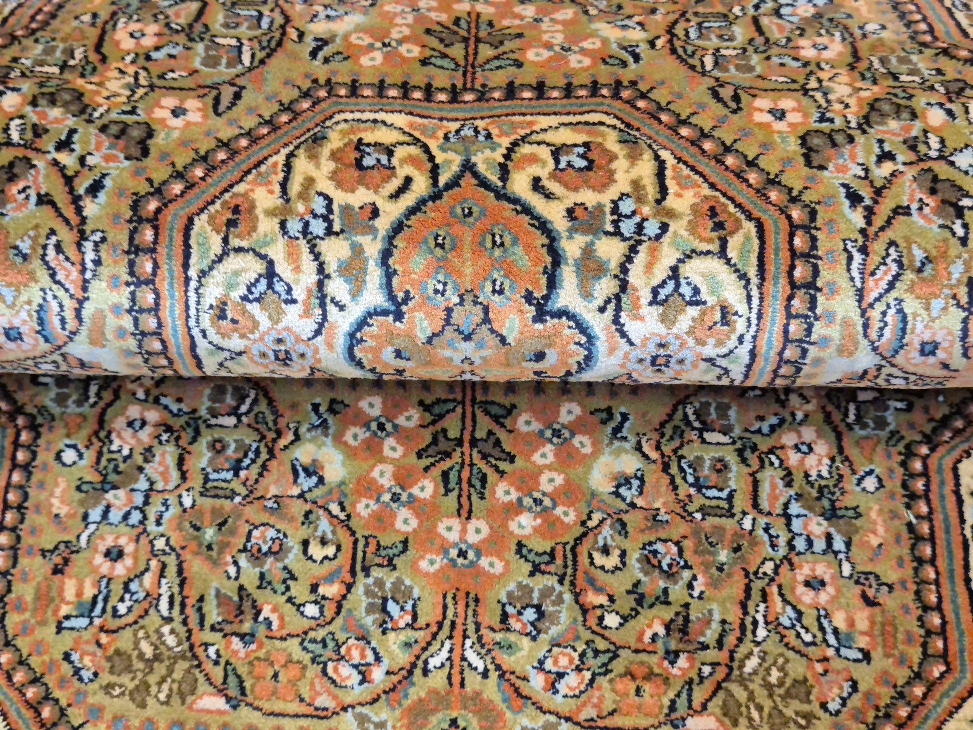 angeboten wird ein edler Kaschmir Teppich aus reiner Naturseide, handgeknüpft in feiner Knüpfung. Das kunstvolle Design zeigt ein stilisiertes Zentralmedaillon, umgeben von reich verzierten floralen Mustern und Arabesken. Die glänzende Naturseide verleiht diesem Teppich eine elegante Strahlkraft und betont die feine Detailarbeit.