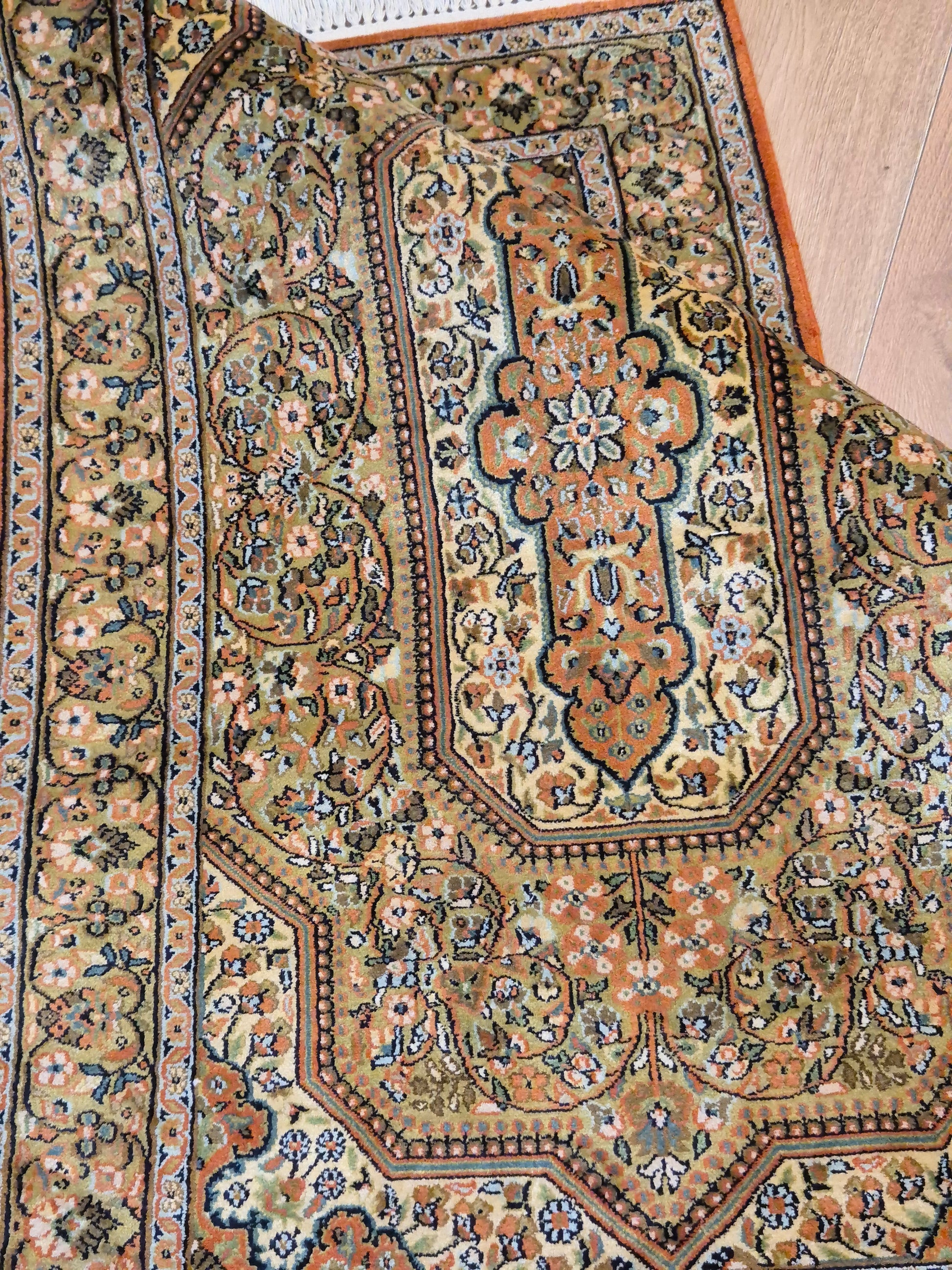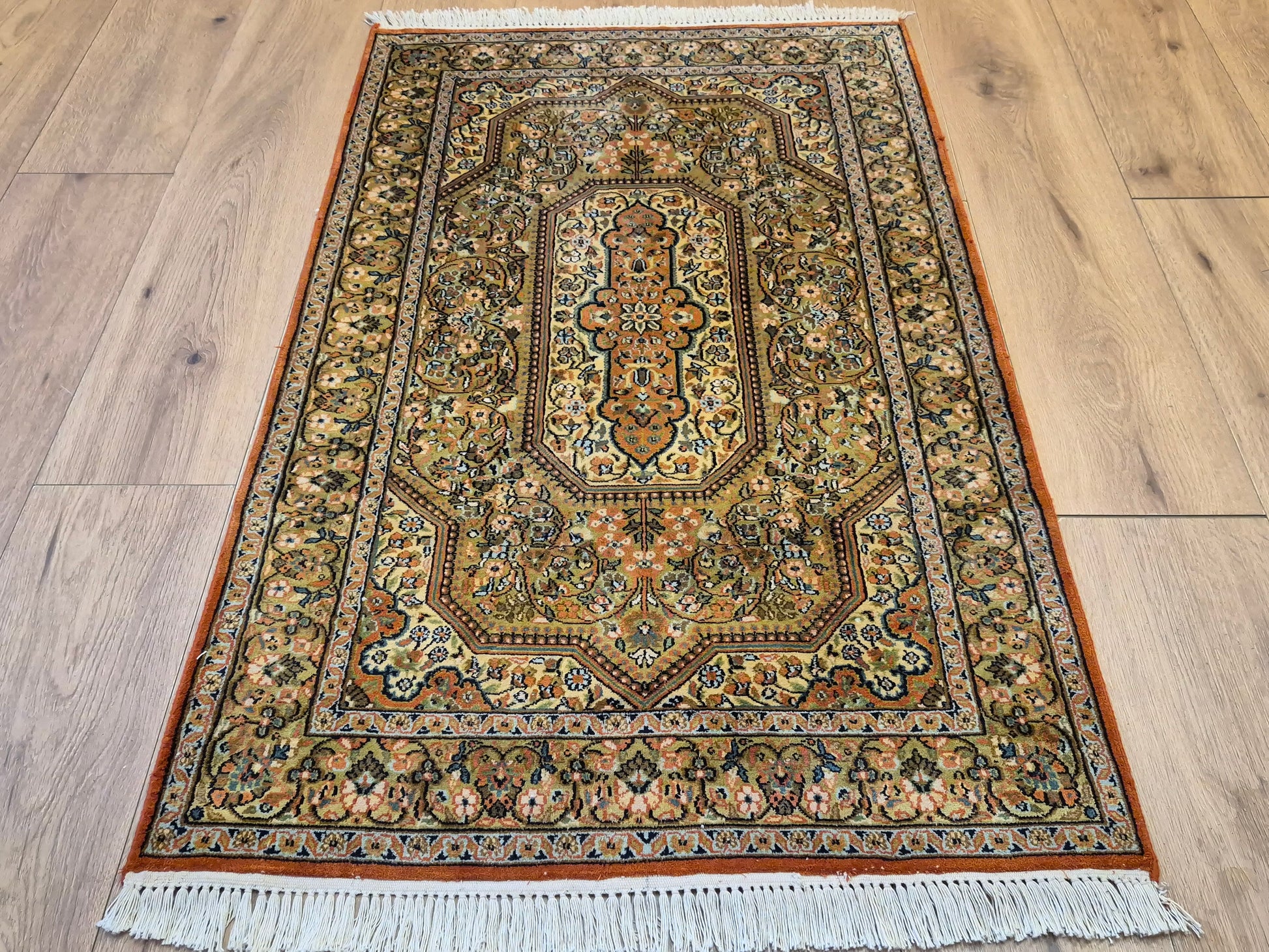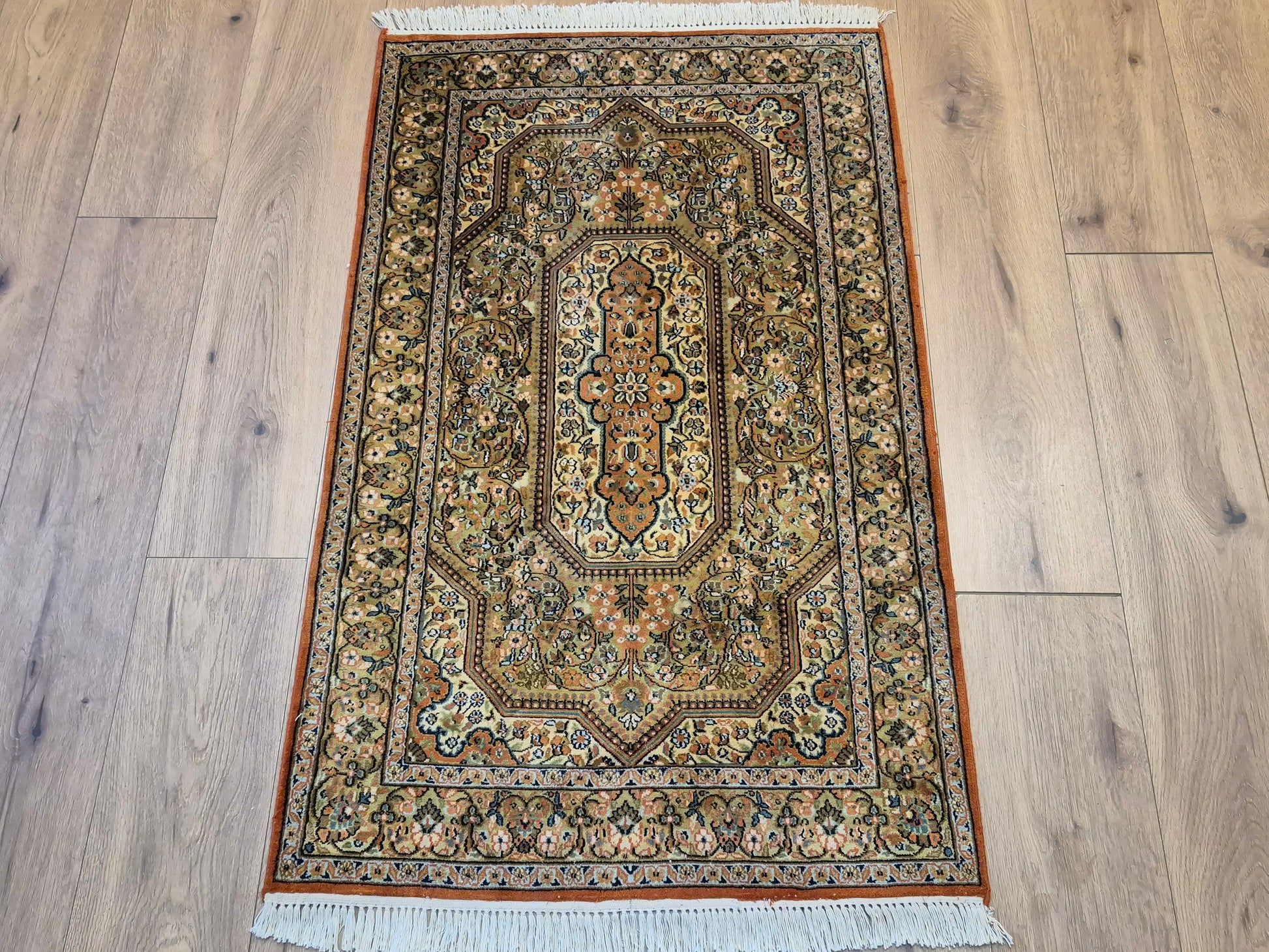 angeboten wird ein edler Kaschmir Teppich aus reiner Naturseide, handgeknüpft in feiner Knüpfung. Das kunstvolle Design zeigt ein stilisiertes Zentralmedaillon, umgeben von reich verzierten floralen Mustern und Arabesken. Die glänzende Naturseide verleiht diesem Teppich eine elegante Strahlkraft und betont die feine Detailarbeit.