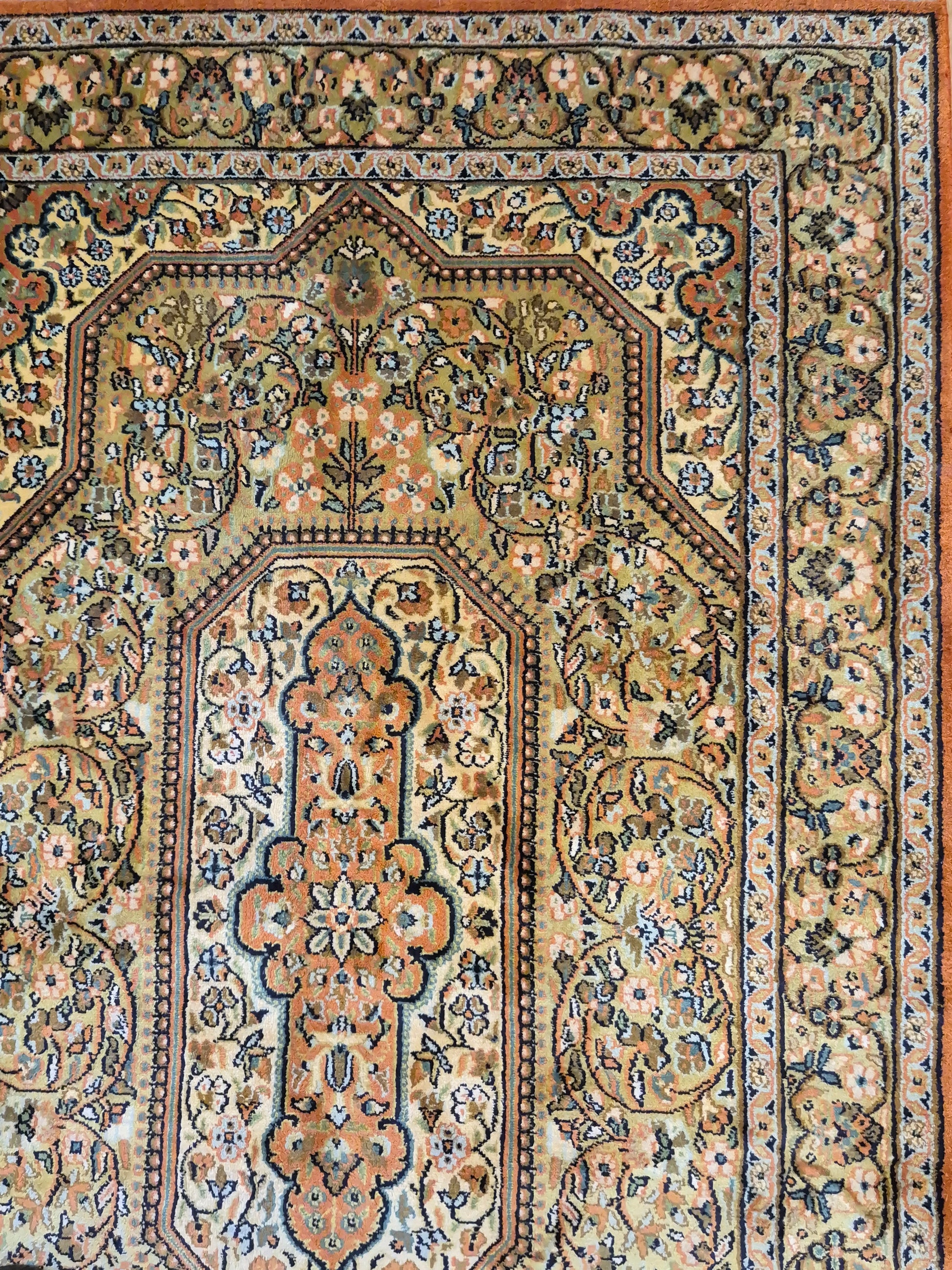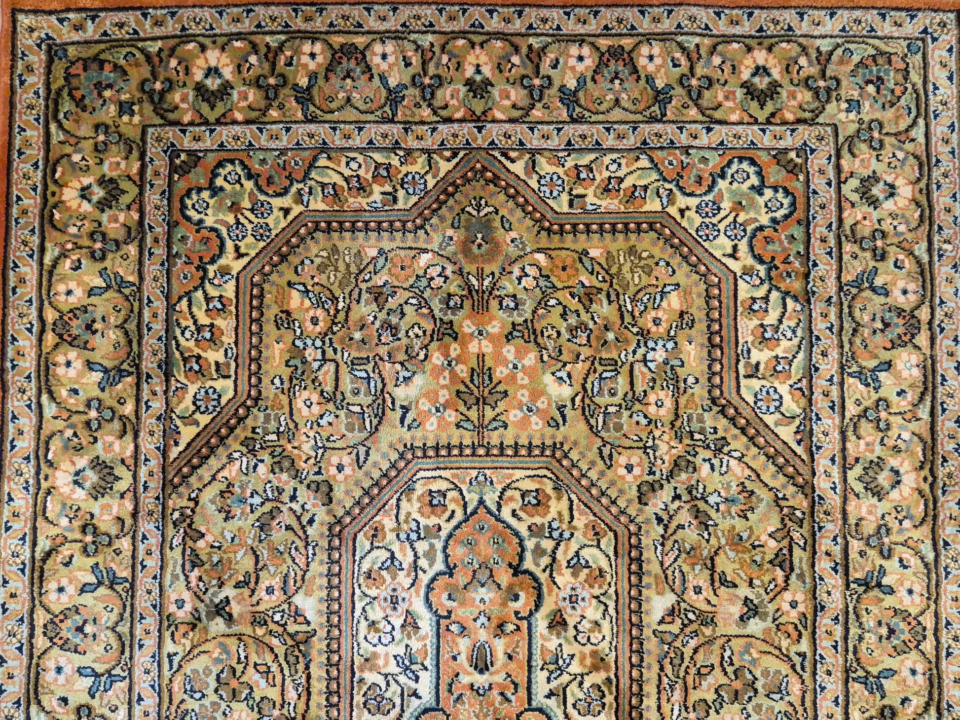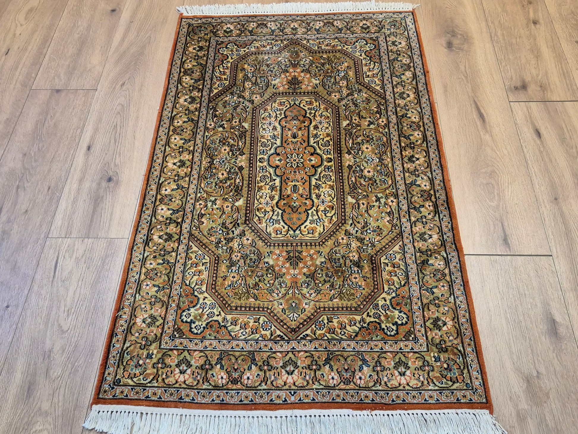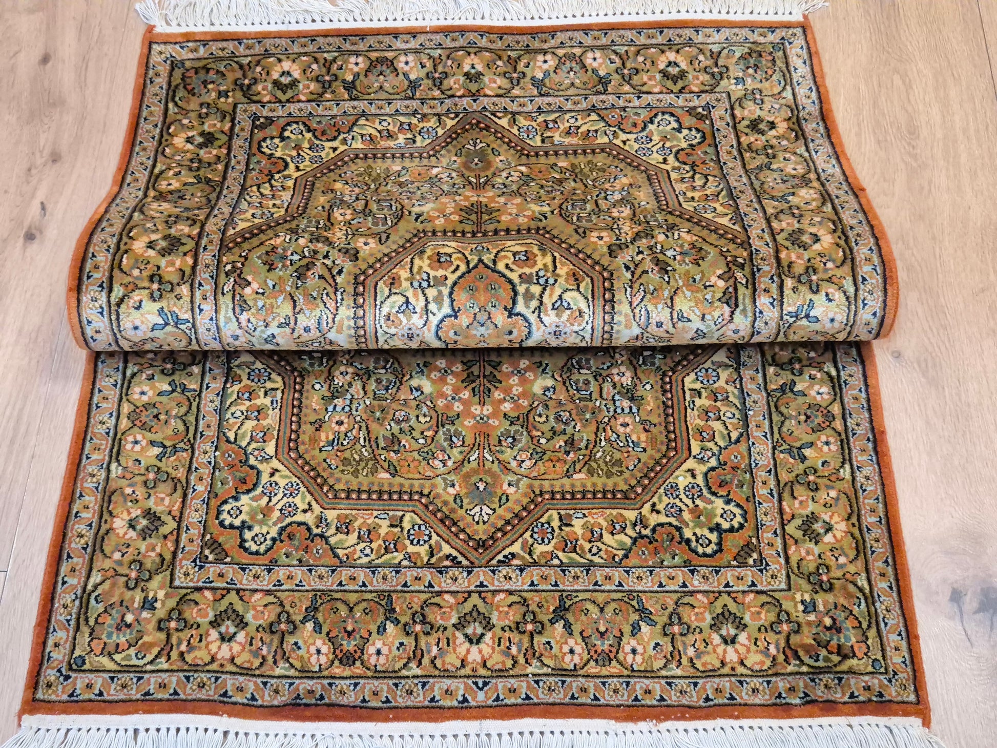 angeboten wird ein edler Kaschmir Teppich aus reiner Naturseide, handgeknüpft in feiner Knüpfung. Das kunstvolle Design zeigt ein stilisiertes Zentralmedaillon, umgeben von reich verzierten floralen Mustern und Arabesken. Die glänzende Naturseide verleiht diesem Teppich eine elegante Strahlkraft und betont die feine Detailarbeit.