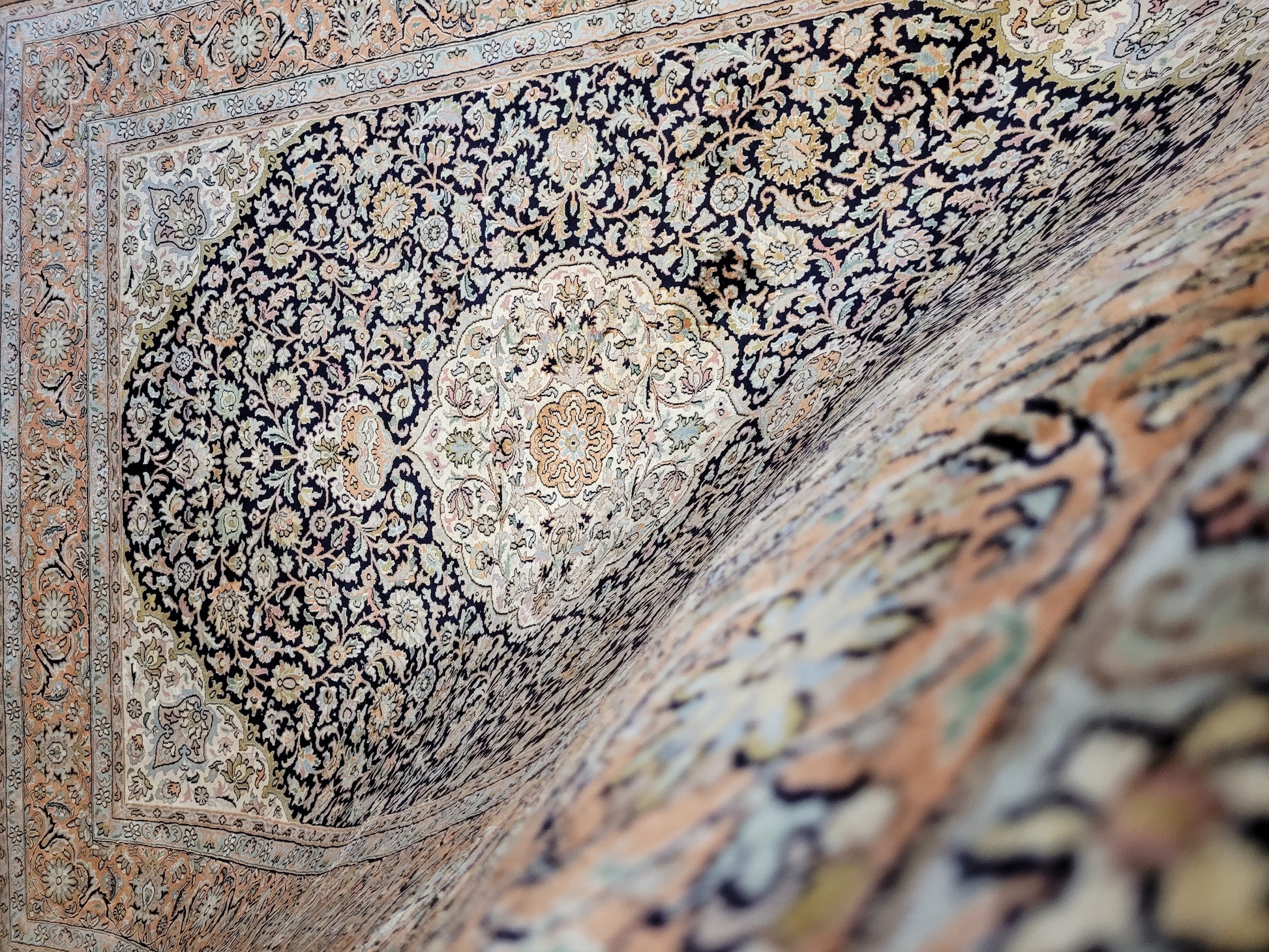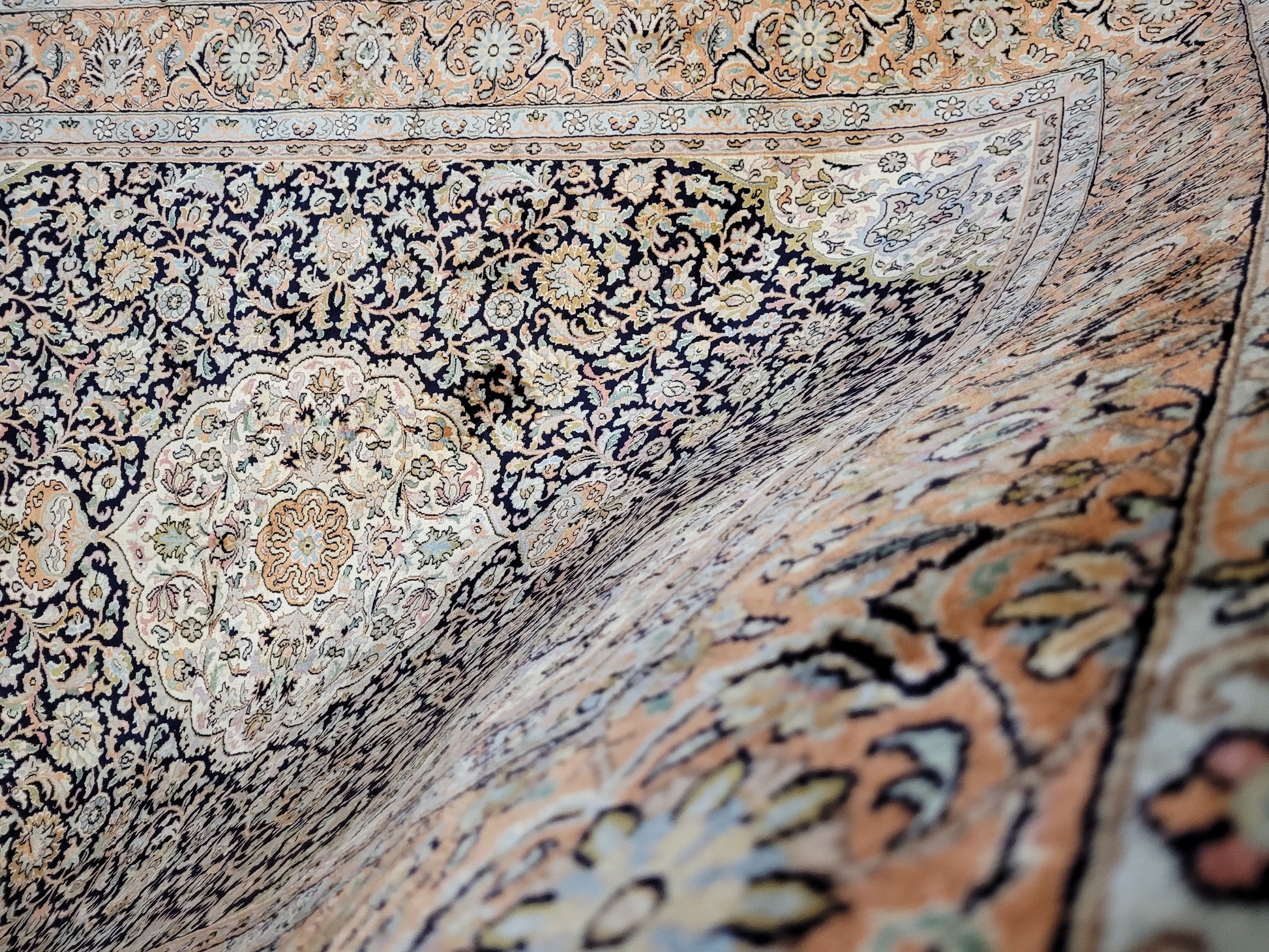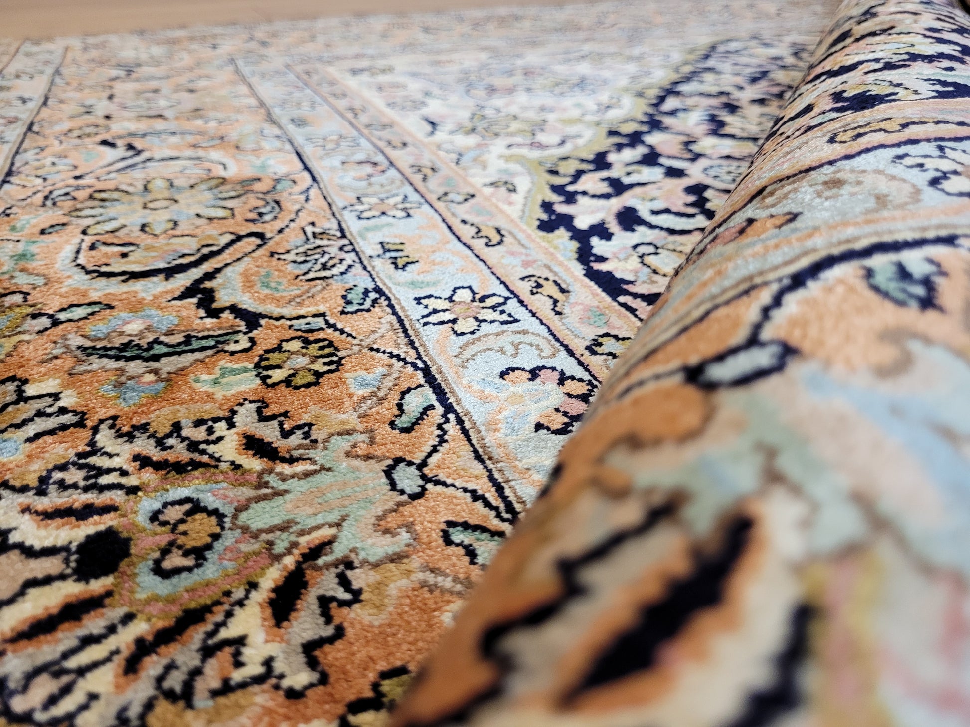 angeboten wird ein edler Kaschmir Teppich, handgeknüpft aus Seide. Die feine Knüpfung verleiht diesem Stück eine außergewöhnliche Brillanz und schimmernde Eleganz. Das klassische Medaillon-Design ist umgeben von reicher floraler Ornamentik und fein ausgearbeiteten Arabesken, eingerahmt von einer detailreichen Bordüre.