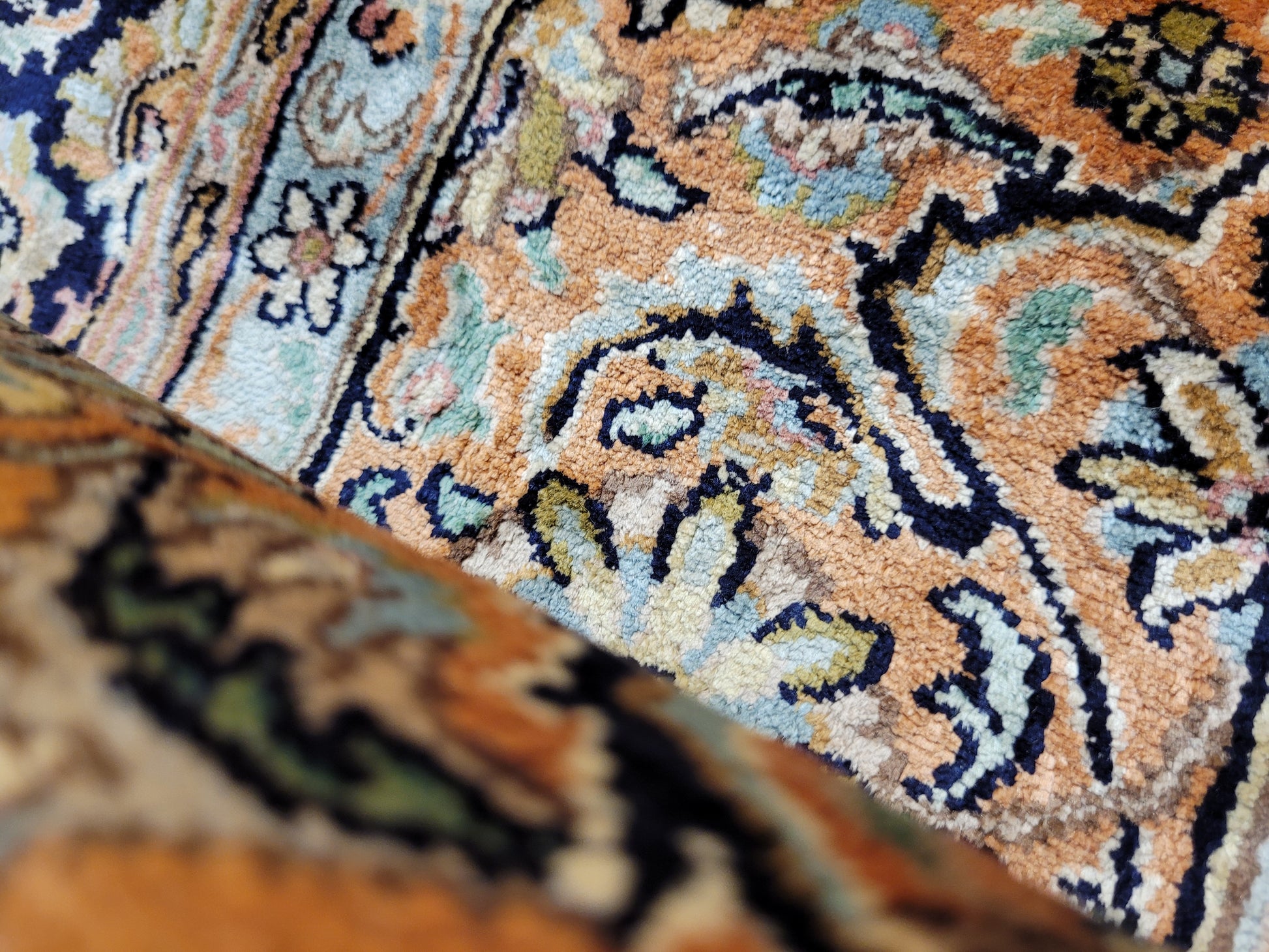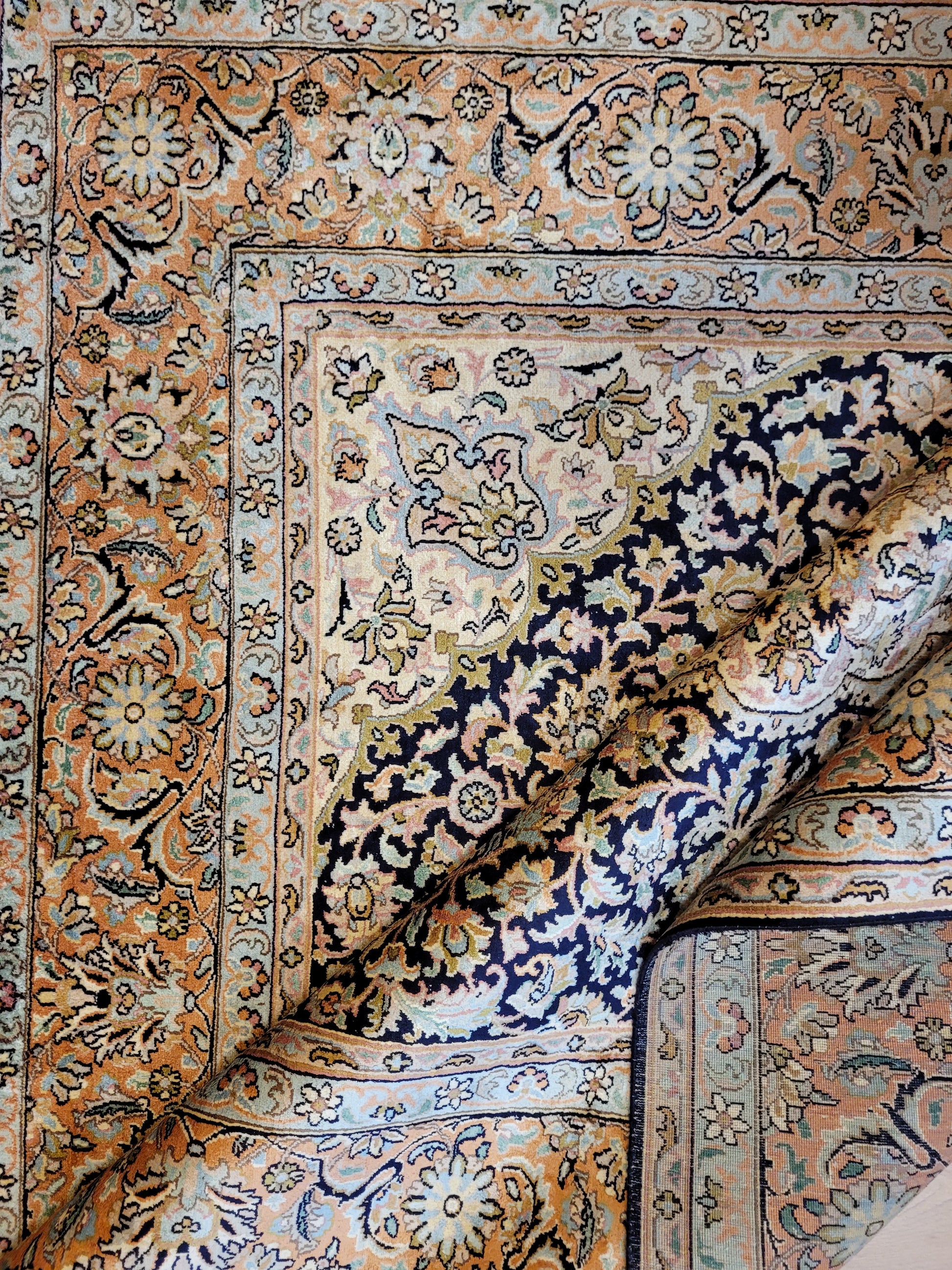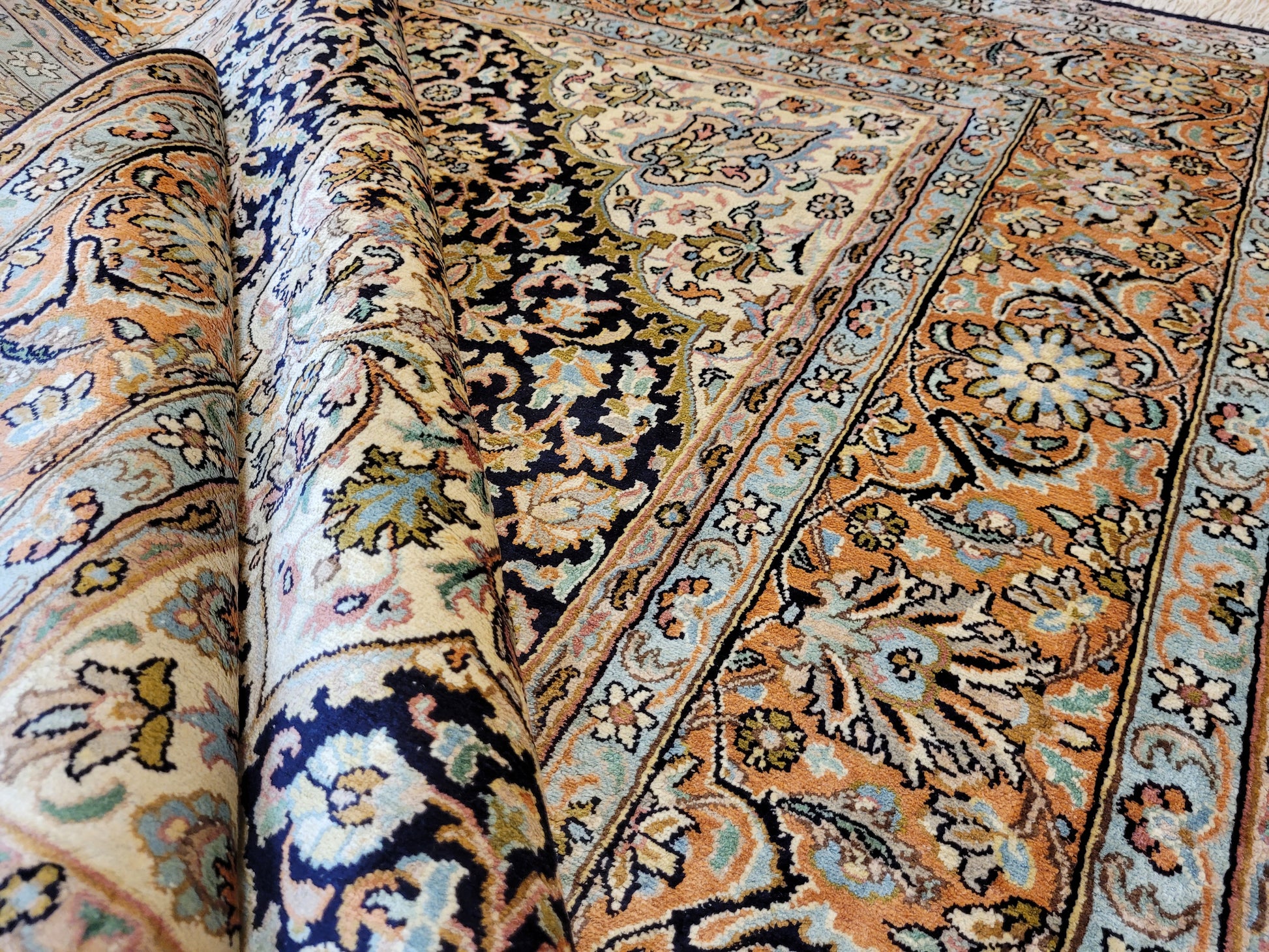 Handgeknüpft in meisterlicher Feinarbeit, detailreich, mit brillanter Seidenwirkung.