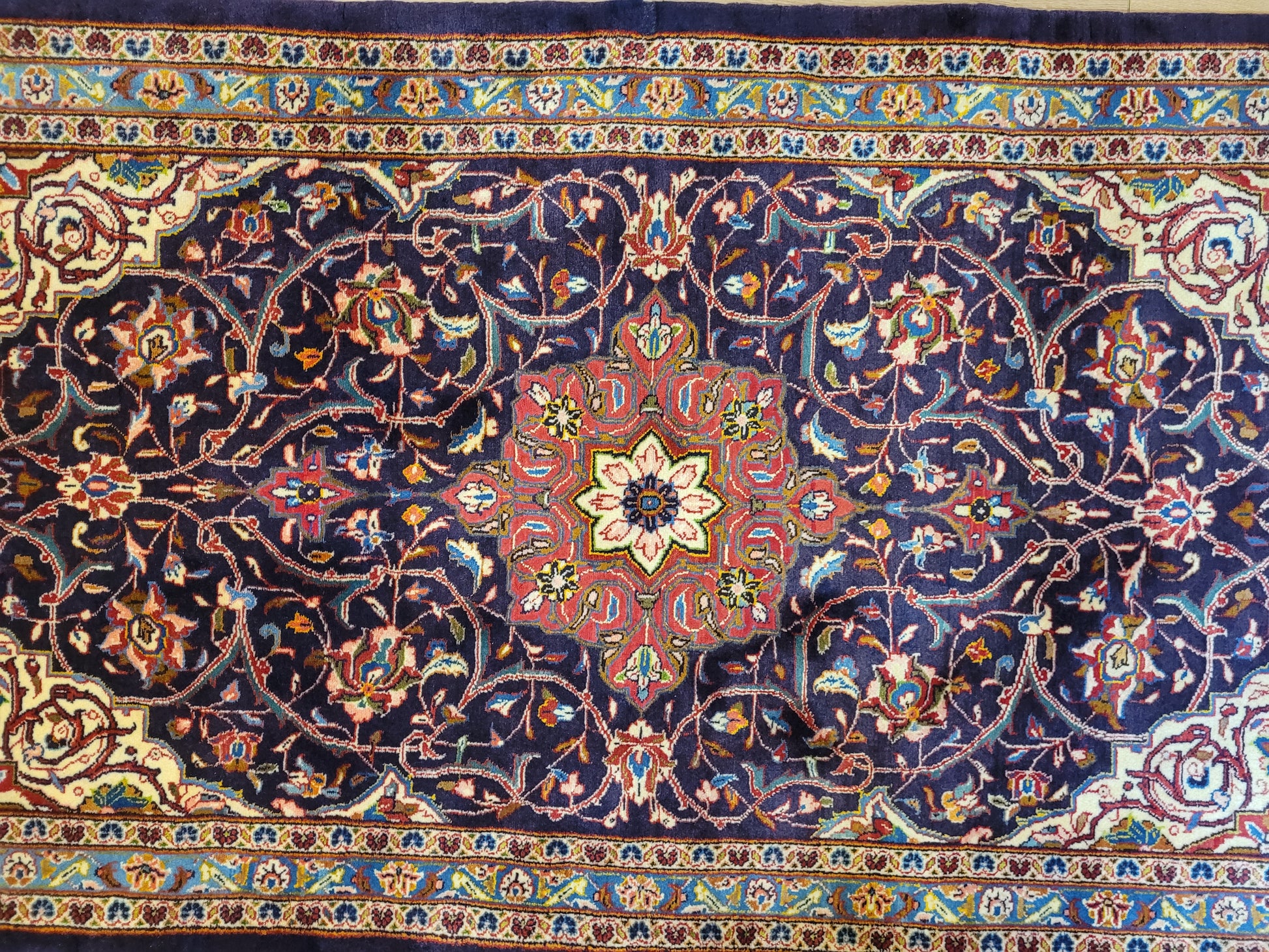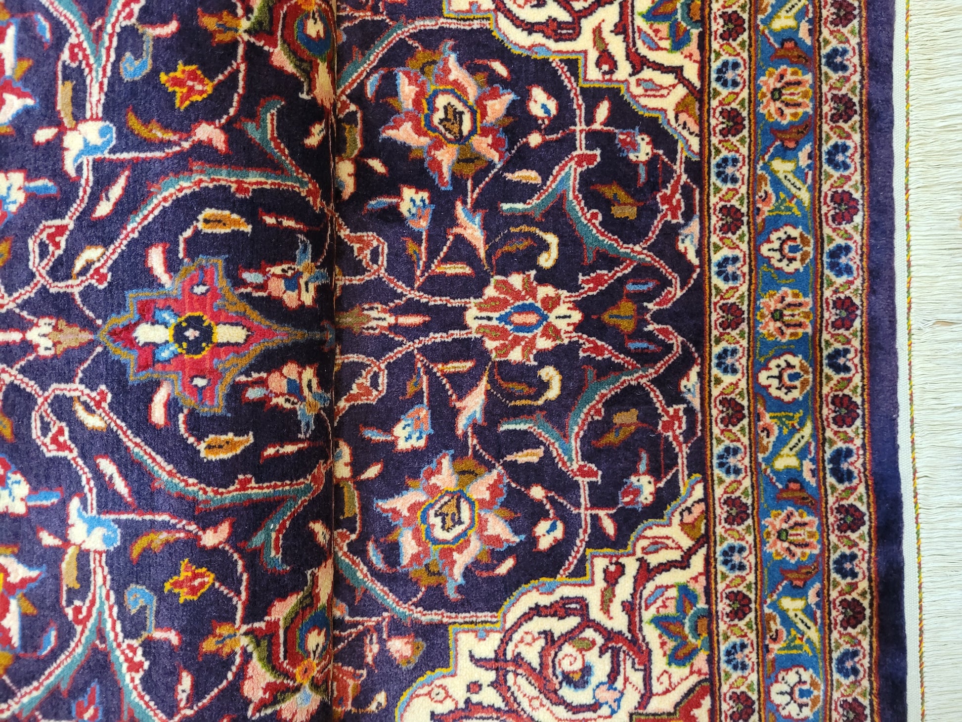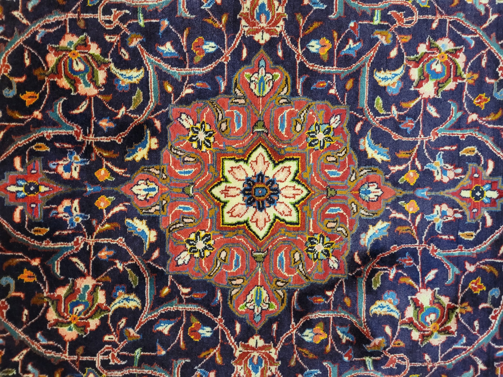 angeboten wird ein klassischer Kashan Teppich aus feiner Korkwolle, handgeknüpft in detailreicher Ausführung. Das Design wird von einem zentralen Medaillon auf tiefblauem Fond geprägt, das von reich geschwungenen Rankenmustern und filigranen Blüten umgeben ist. Die helle Bordüre mit floralen Ornamenten in Blau und Beige bildet einen harmonischen Rahmen und betont die klare Struktur dieses zeitlosen Stücks.
