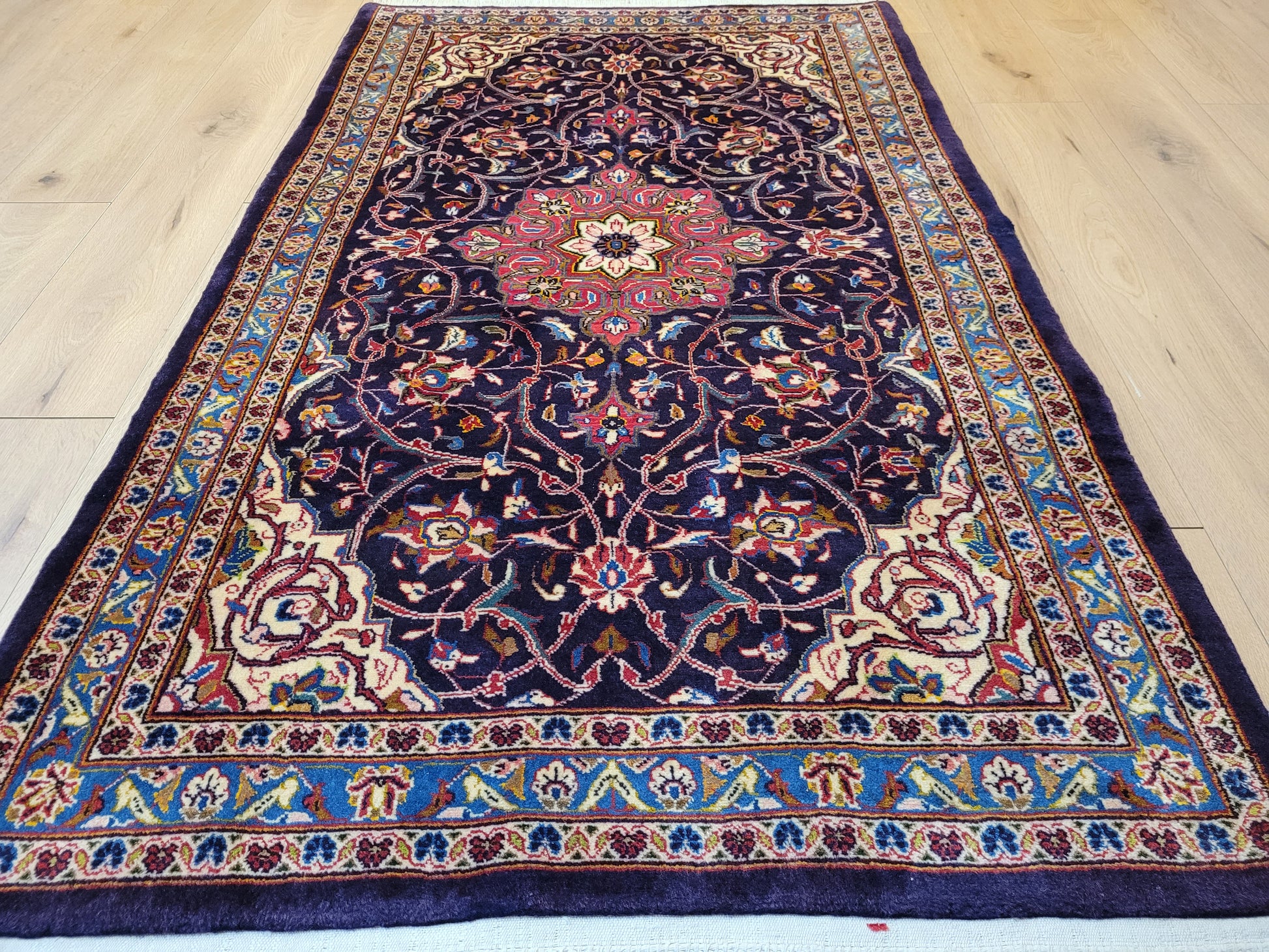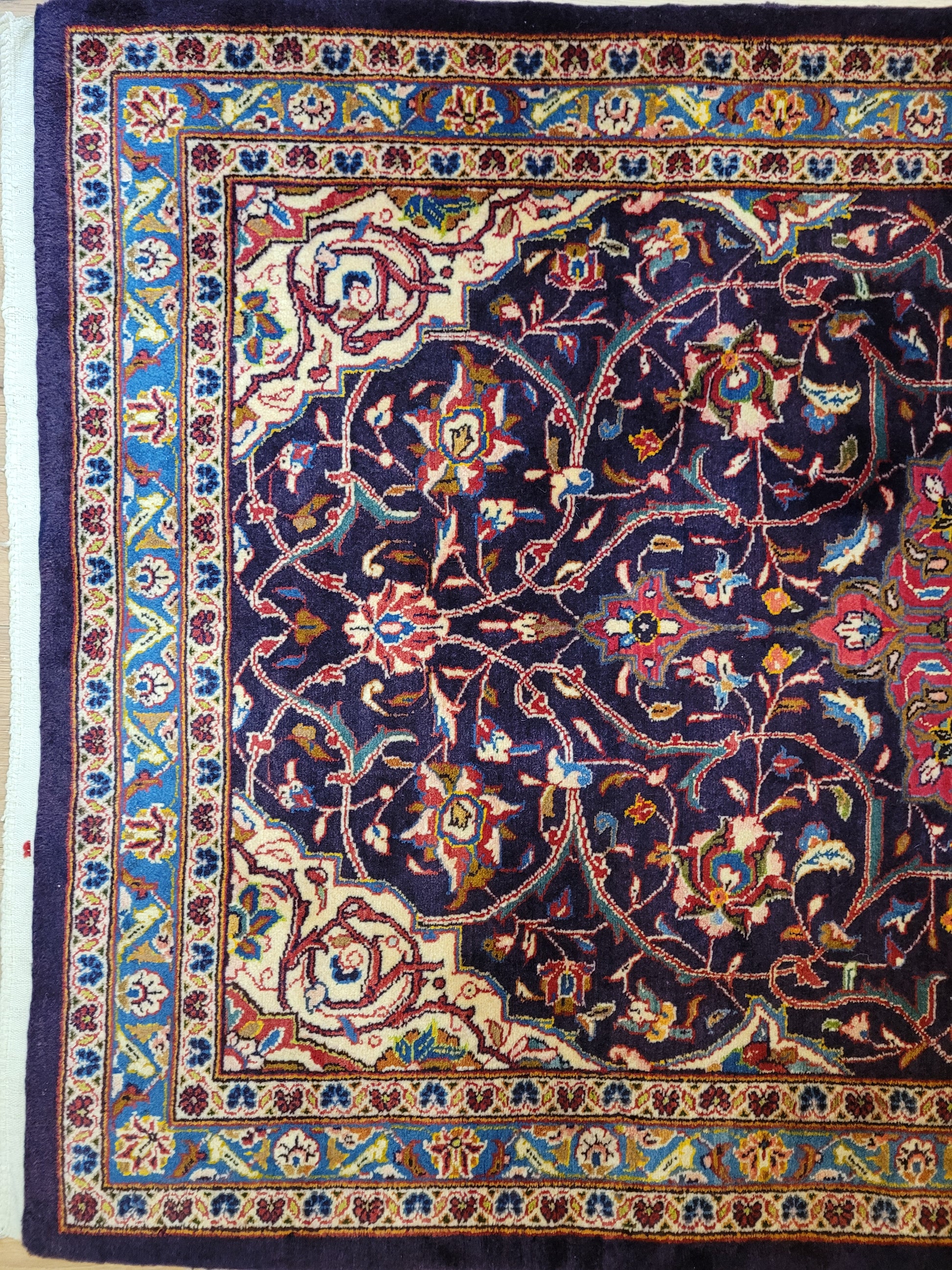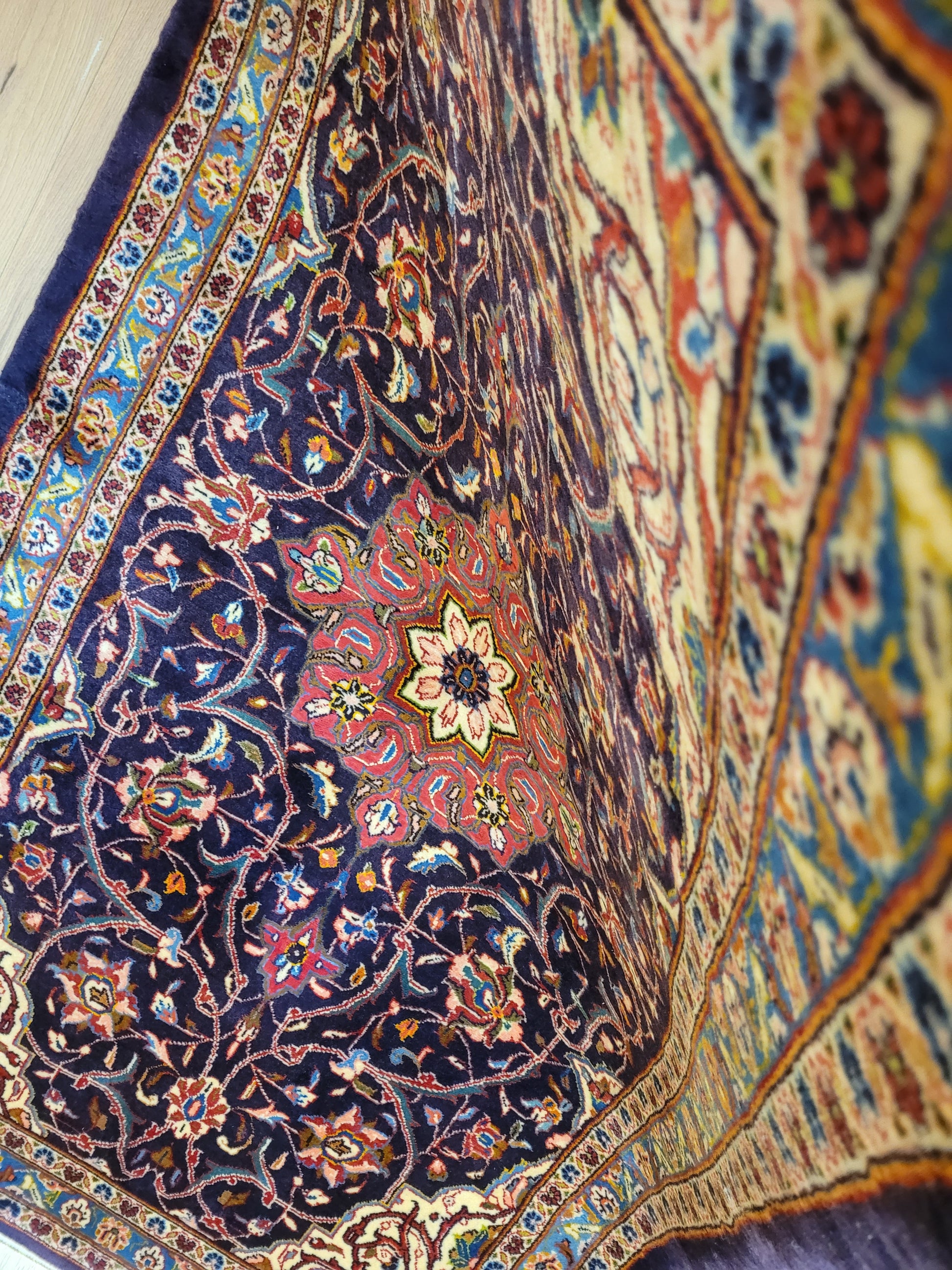 angeboten wird ein klassischer Kashan Teppich aus feiner Korkwolle, handgeknüpft in detailreicher Ausführung. Das Design wird von einem zentralen Medaillon auf tiefblauem Fond geprägt, das von reich geschwungenen Rankenmustern und filigranen Blüten umgeben ist. Die helle Bordüre mit floralen Ornamenten in Blau und Beige bildet einen harmonischen Rahmen und betont die klare Struktur dieses zeitlosen Stücks.