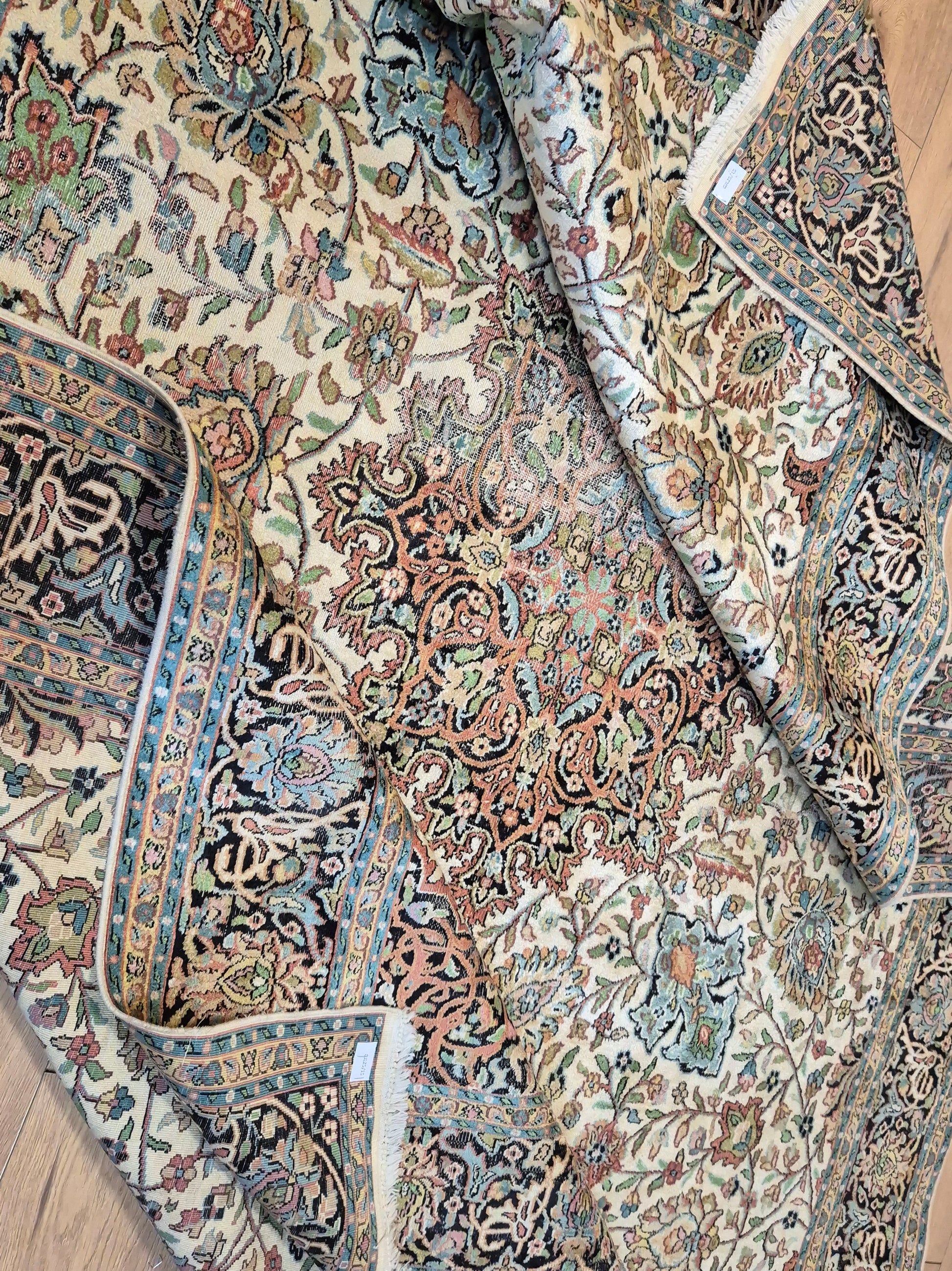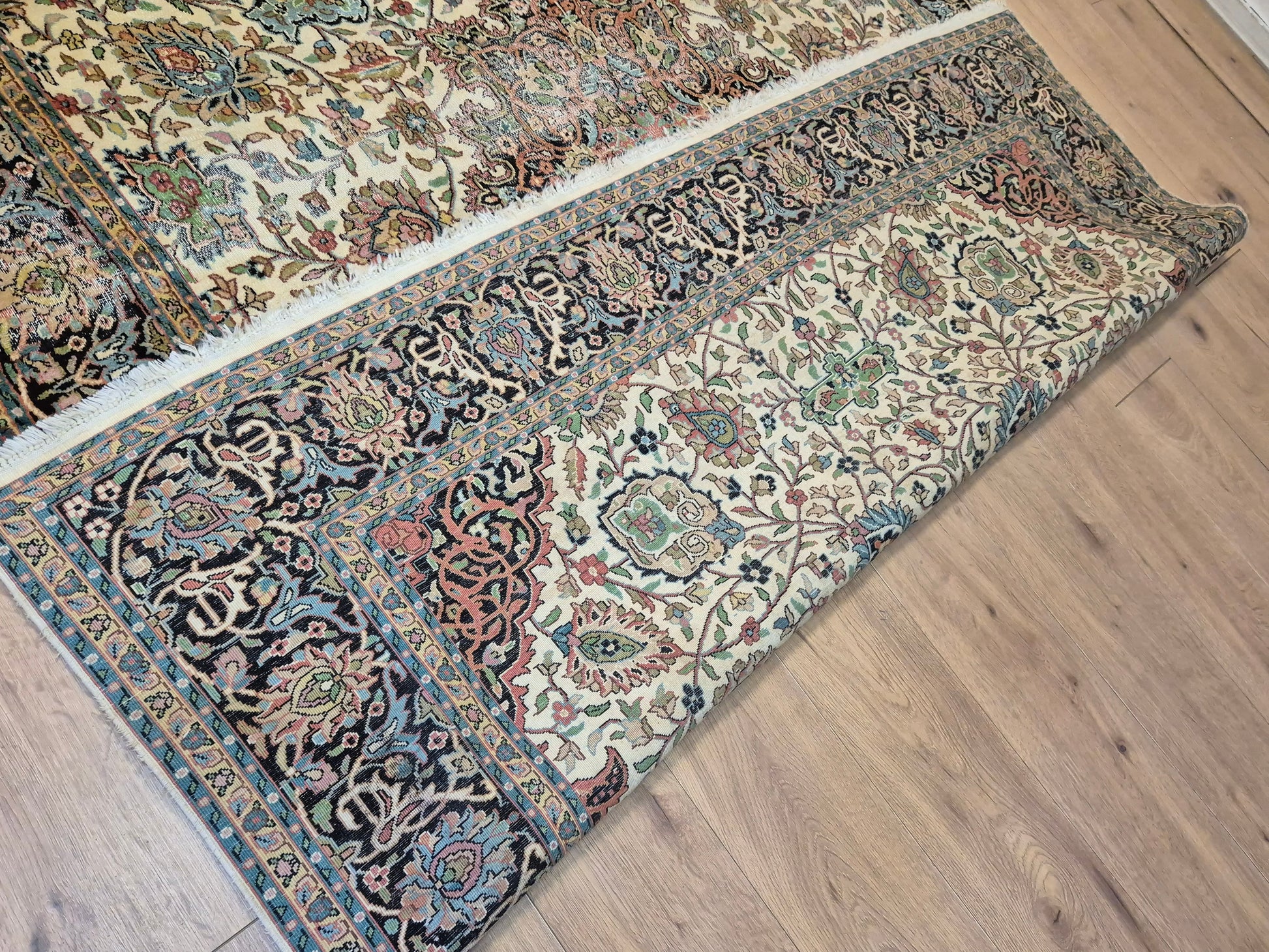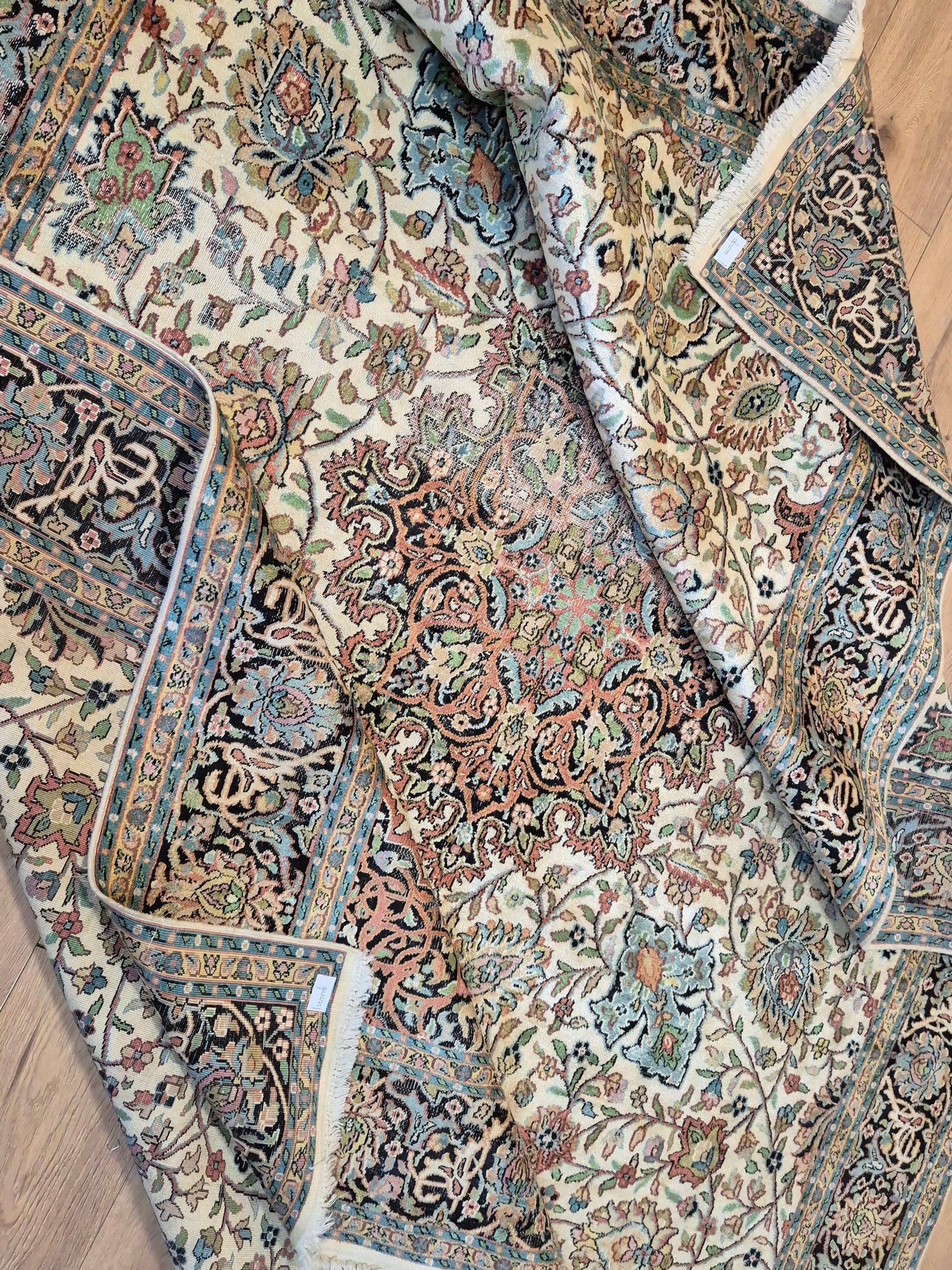 angeboten wird ein edler Kashmir Teppich aus reiner Seide, handgeknüpft in meisterlicher Ausführung. Das feine florale Allover-Design wird von einem kunstvollen Zentralmedaillon dominiert, umrahmt von detailreichen Blütenranken und Palmetten. Die helle Grundfarbe hebt die filigrane Zeichnung hervor, während die Bordüre in dunklen Tönen mit geschwungenen Ornamenten kontrastreich ausgearbeitet ist.