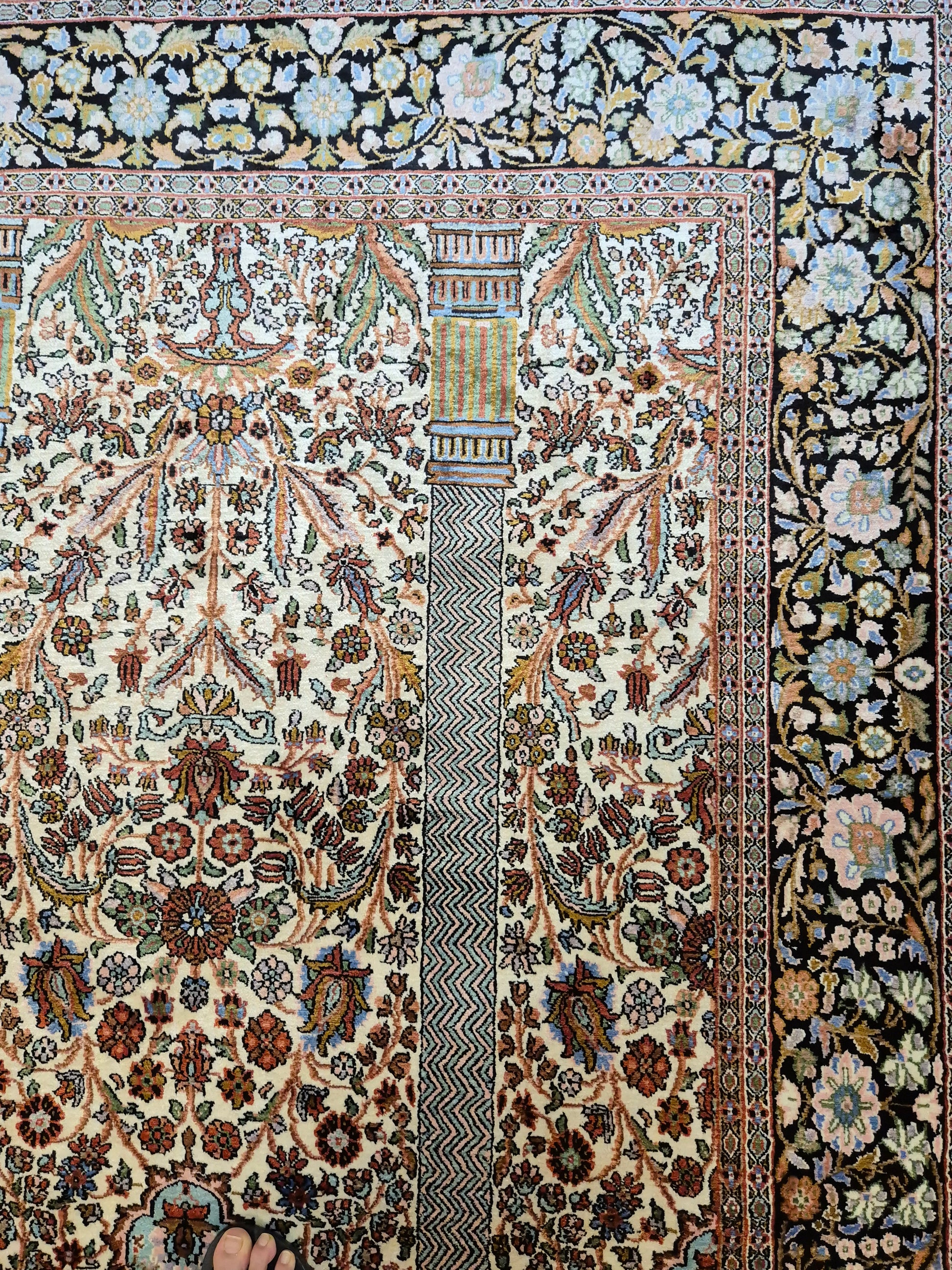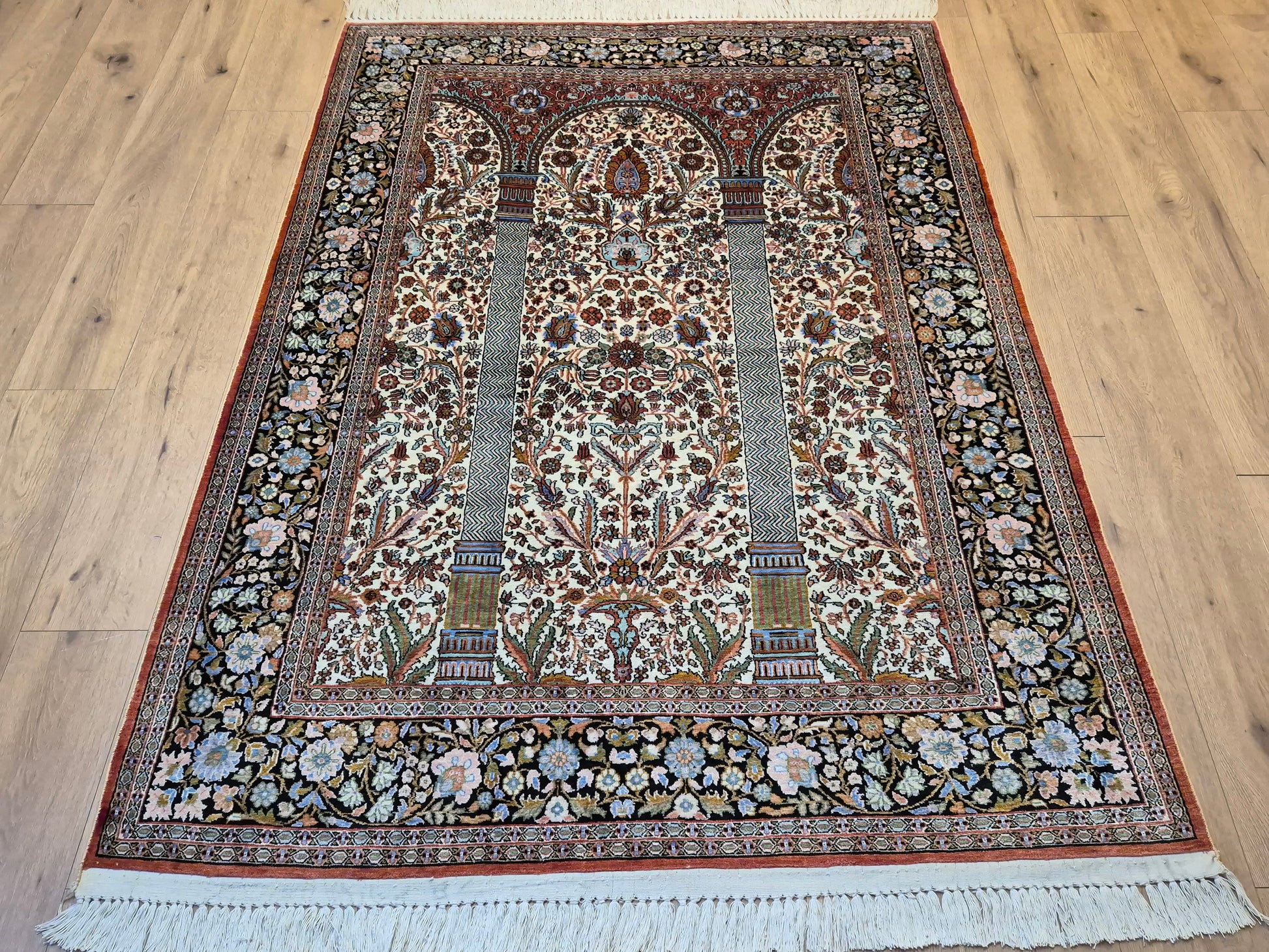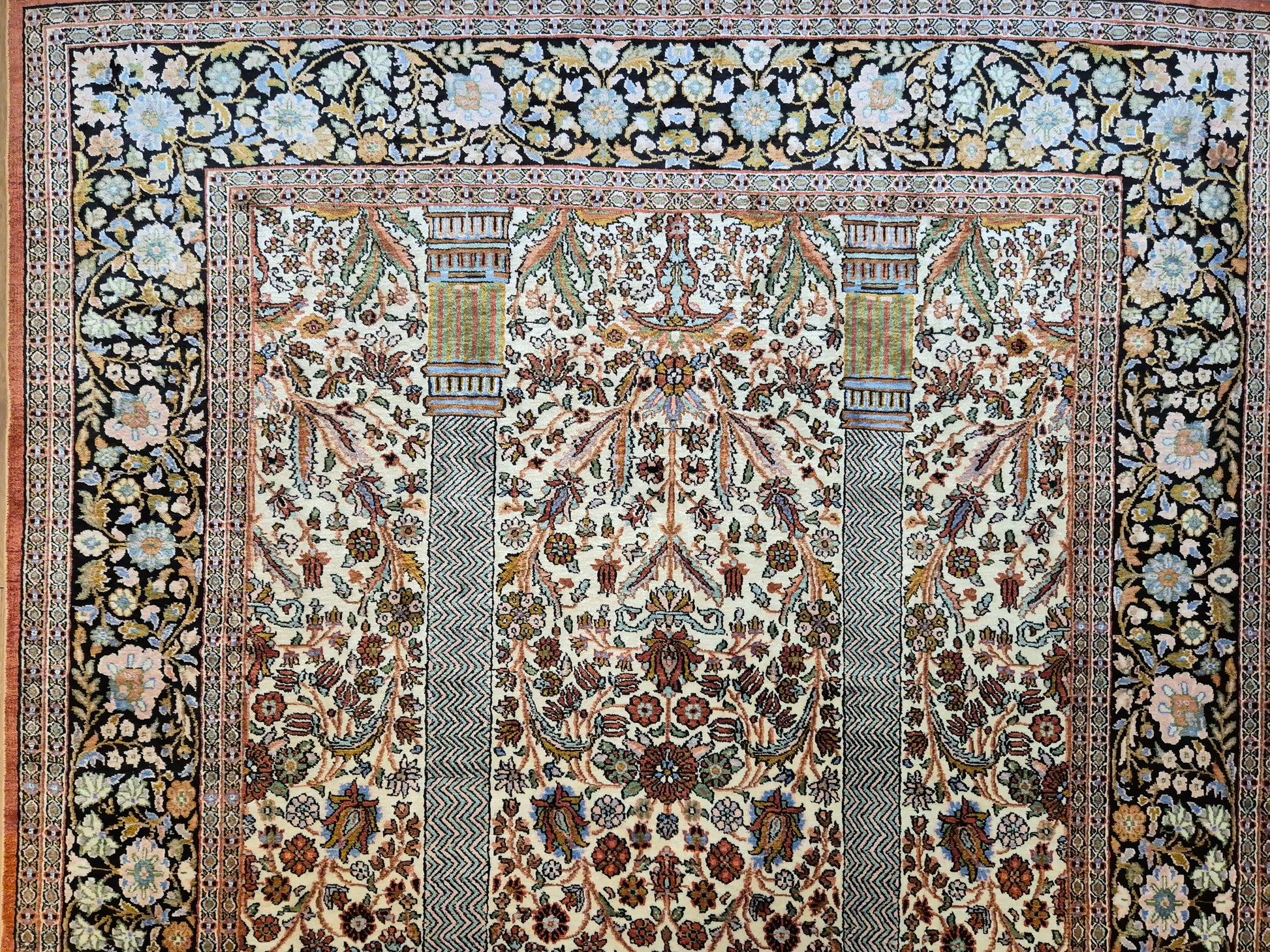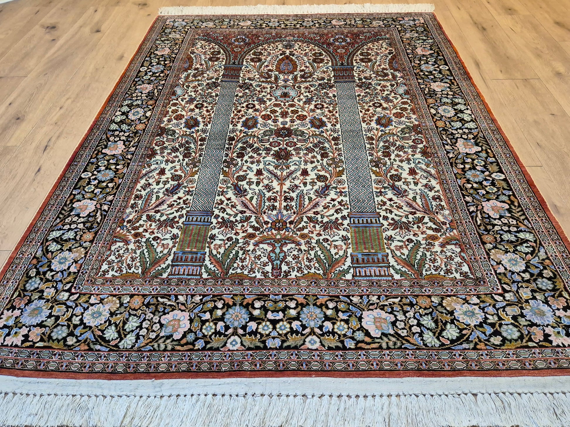 angeboten wird ein edler Kashmir Teppich aus reiner Naturseide, handgeknüpft in aufwendiger und feiner Ausführung. Das beeindruckende Arkadenmotiv mit drei stilisierten Bögen wird von detailreichen floralen Mustern durchzogen, die in harmonischer Symmetrie angeordnet sind. Die Kombination aus eleganten Blumendekoren, feinen Ranken und architektonischen Säulen verleiht dem Teppich eine prachtvolle, fast palastartige Ausstrahlung.