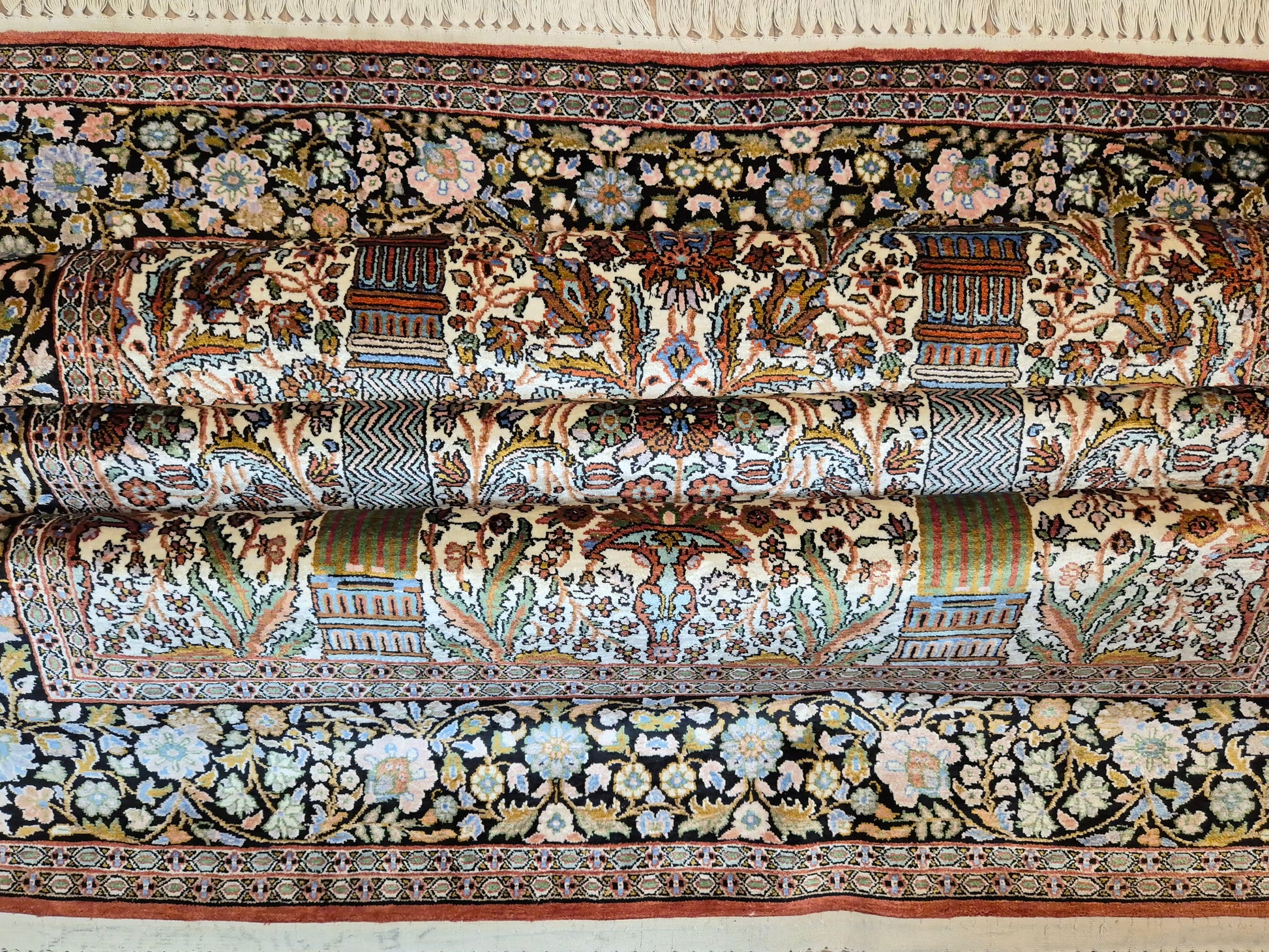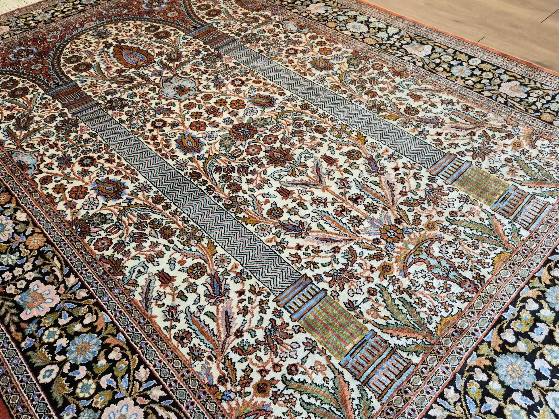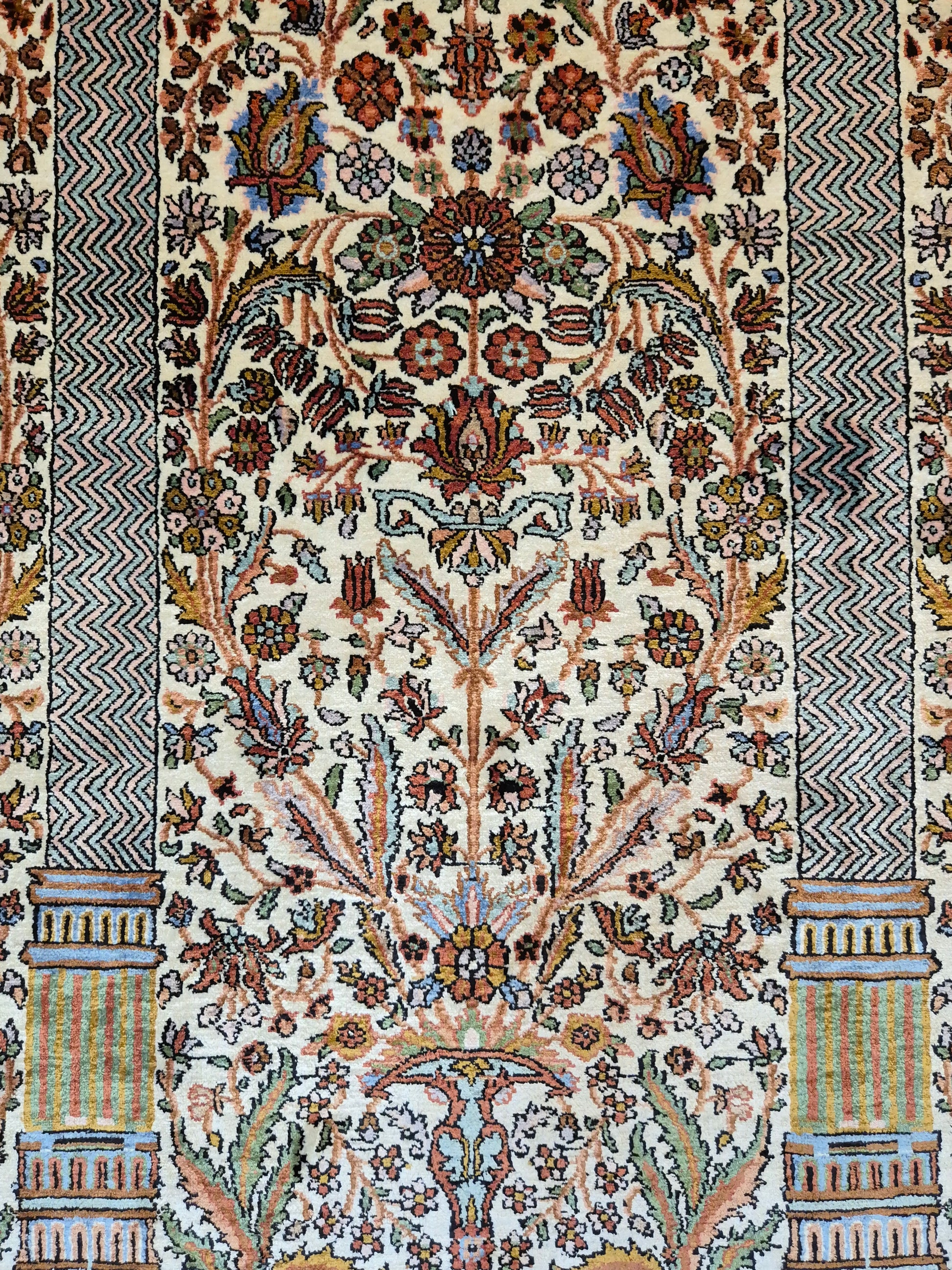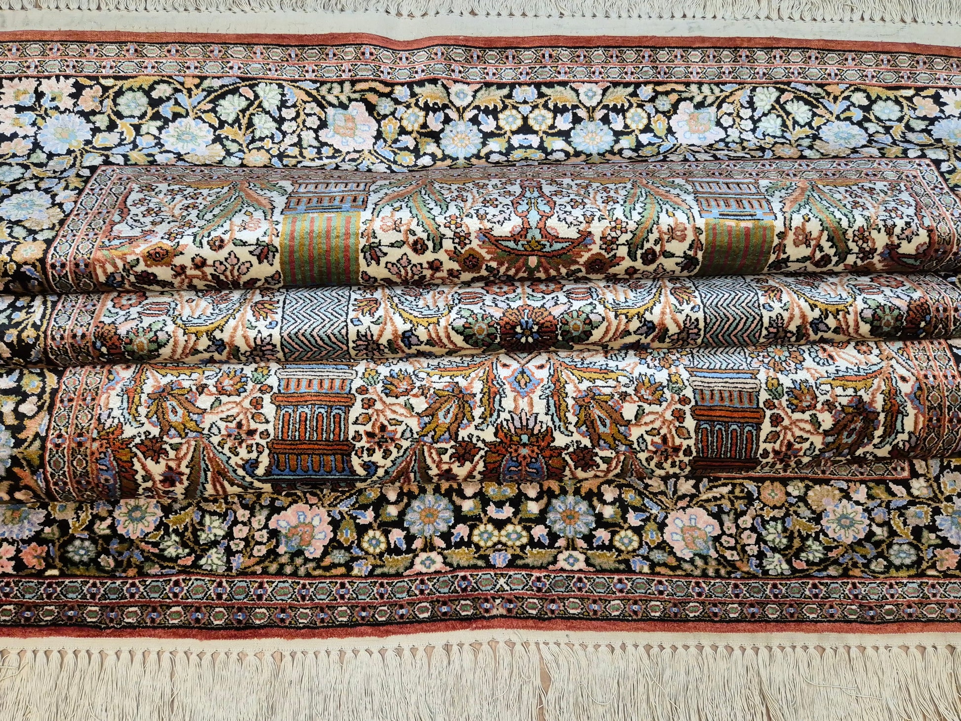 angeboten wird ein edler Kashmir Teppich aus reiner Naturseide, handgeknüpft in aufwendiger und feiner Ausführung. Das beeindruckende Arkadenmotiv mit drei stilisierten Bögen wird von detailreichen floralen Mustern durchzogen, die in harmonischer Symmetrie angeordnet sind. Die Kombination aus eleganten Blumendekoren, feinen Ranken und architektonischen Säulen verleiht dem Teppich eine prachtvolle, fast palastartige Ausstrahlung.
