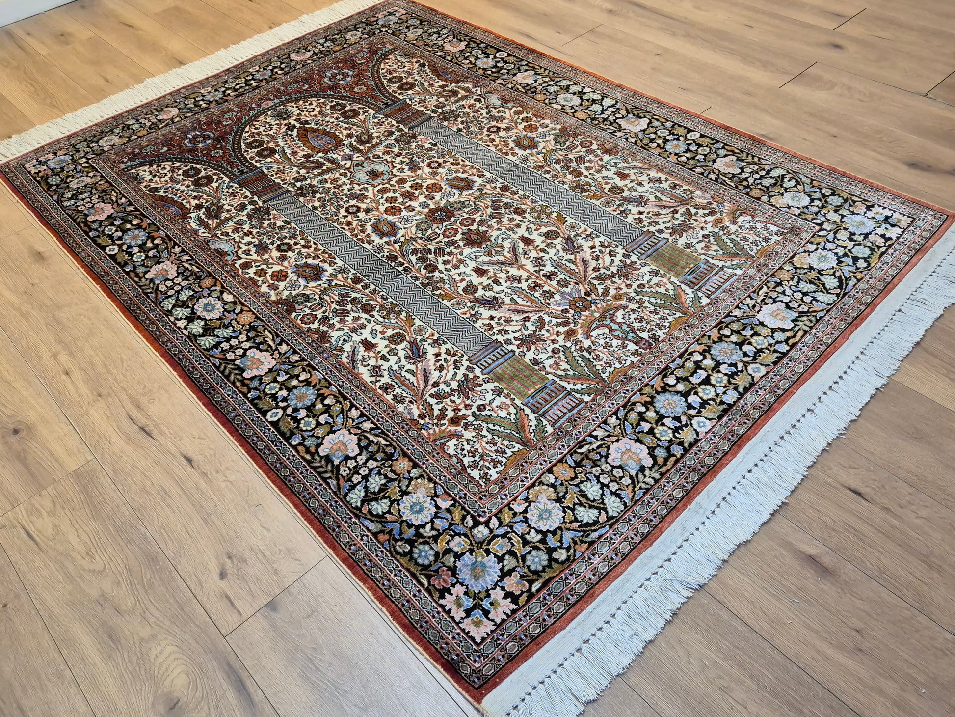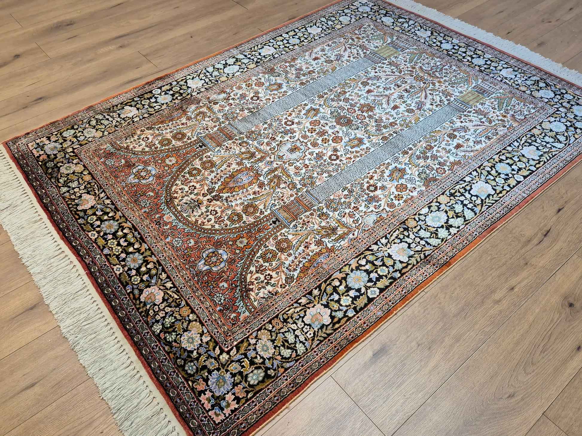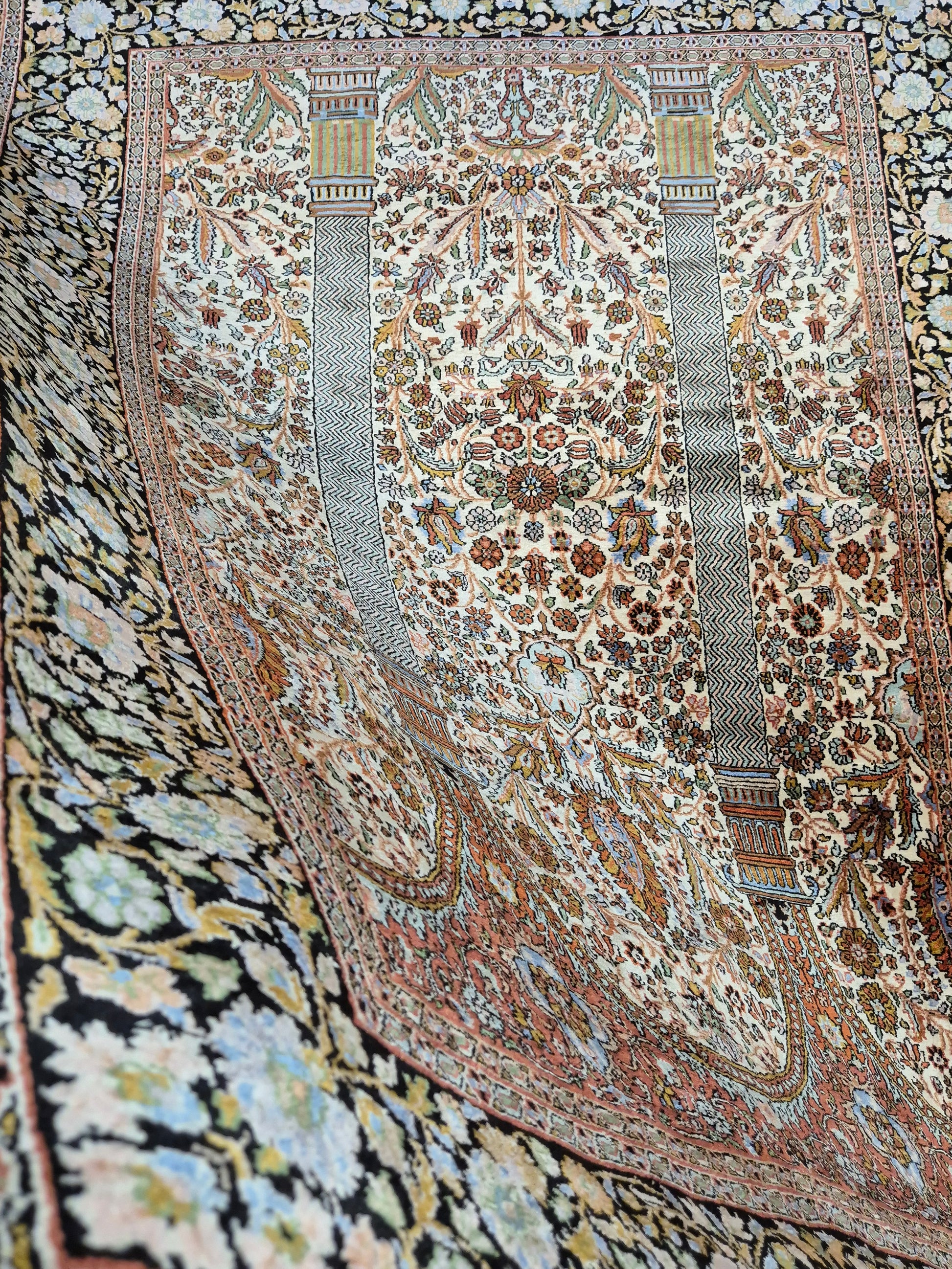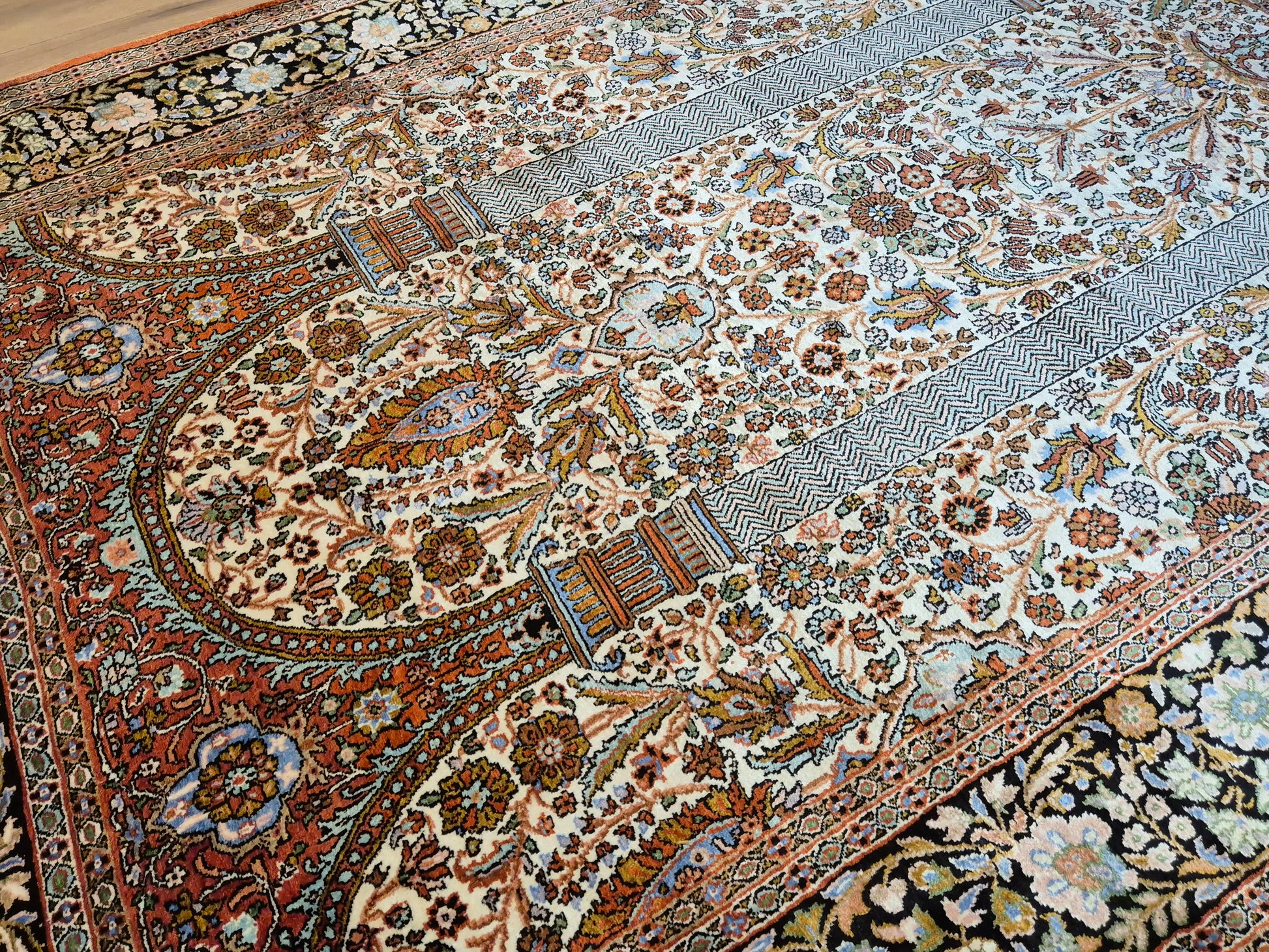 angeboten wird ein edler Kashmir Teppich aus reiner Naturseide, handgeknüpft in aufwendiger und feiner Ausführung. Das beeindruckende Arkadenmotiv mit drei stilisierten Bögen wird von detailreichen floralen Mustern durchzogen, die in harmonischer Symmetrie angeordnet sind. Die Kombination aus eleganten Blumendekoren, feinen Ranken und architektonischen Säulen verleiht dem Teppich eine prachtvolle, fast palastartige Ausstrahlung.