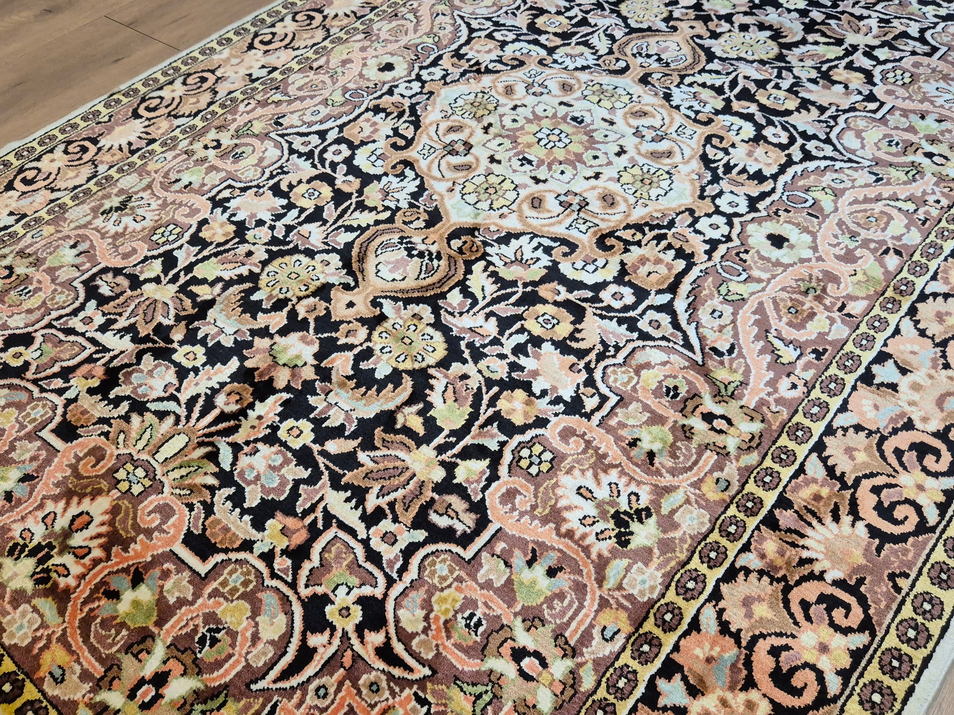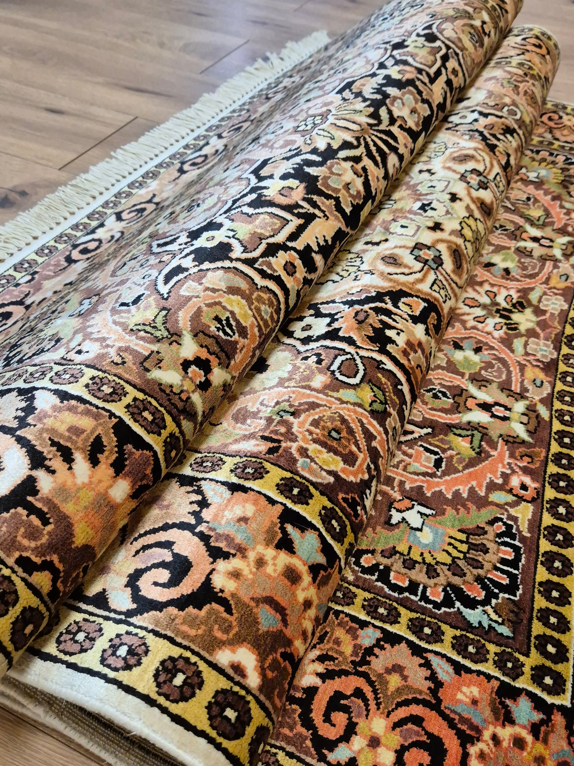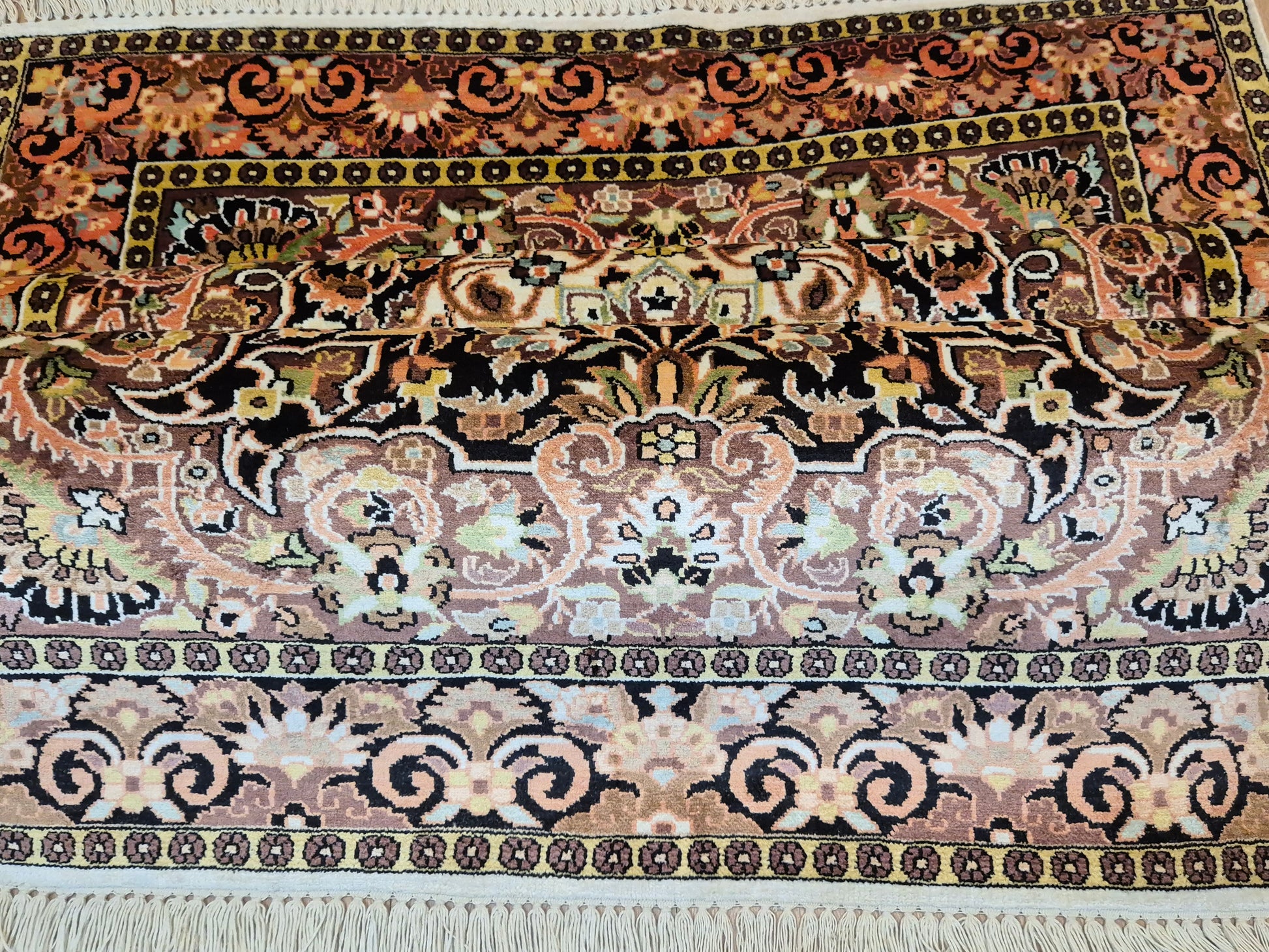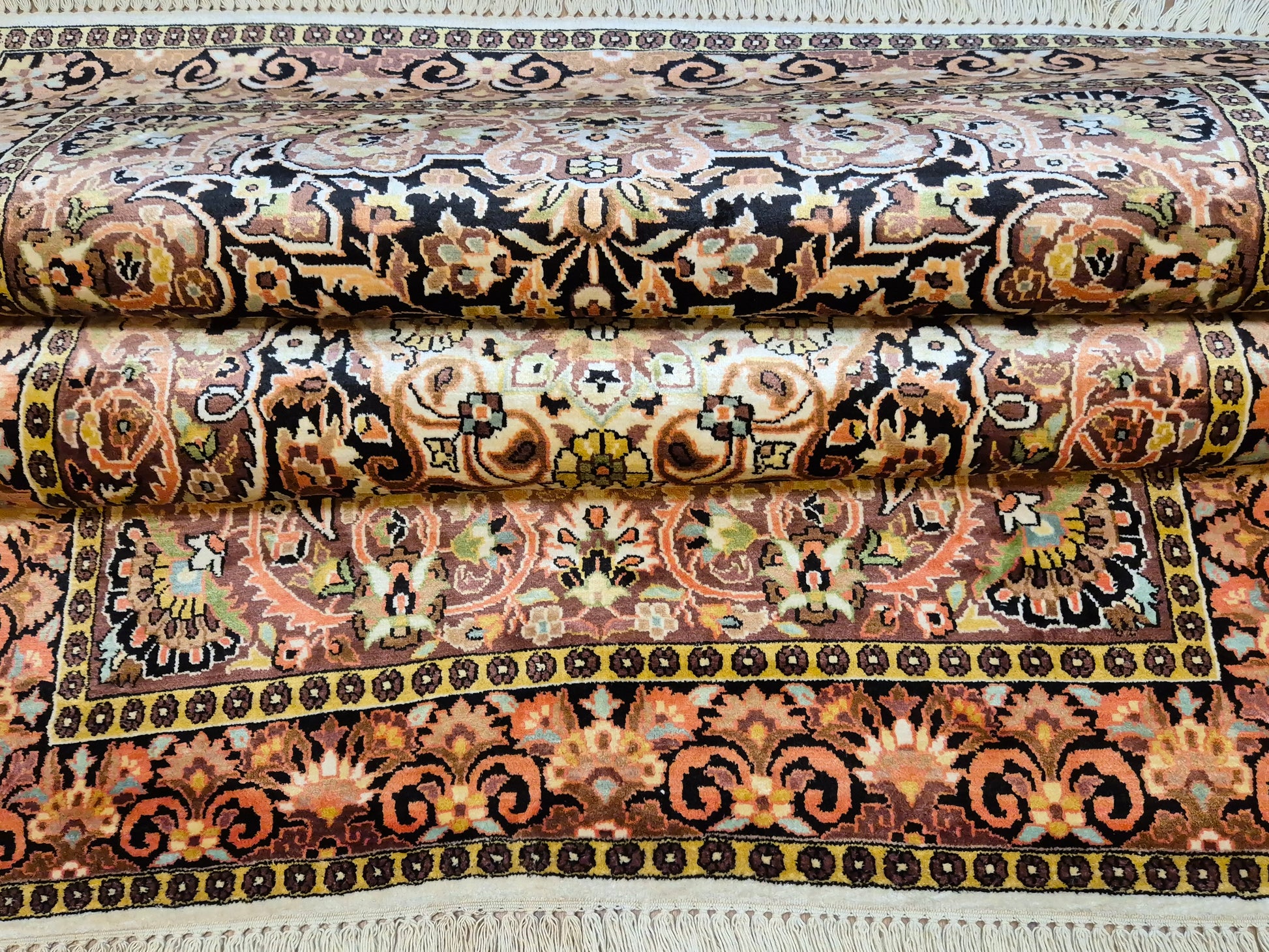 angeboten wird ein edler Kashmir Teppich aus reiner Seide, handgeknüpft in feinster Qualität. Im Zentrum befindet sich ein kunstvoll gestaltetes Medaillon auf dunkelbraunem Fond, umgeben von üppigen Blütenranken und floralen Arabesken. Die feinen Seidenfäden verleihen dem Teppich je nach Lichteinfall einen edlen Glanz und eine lebendige Farbwirkung. Die harmonische Bordüre mit floralen Ornamenten rundet das Gesamtbild elegant ab.