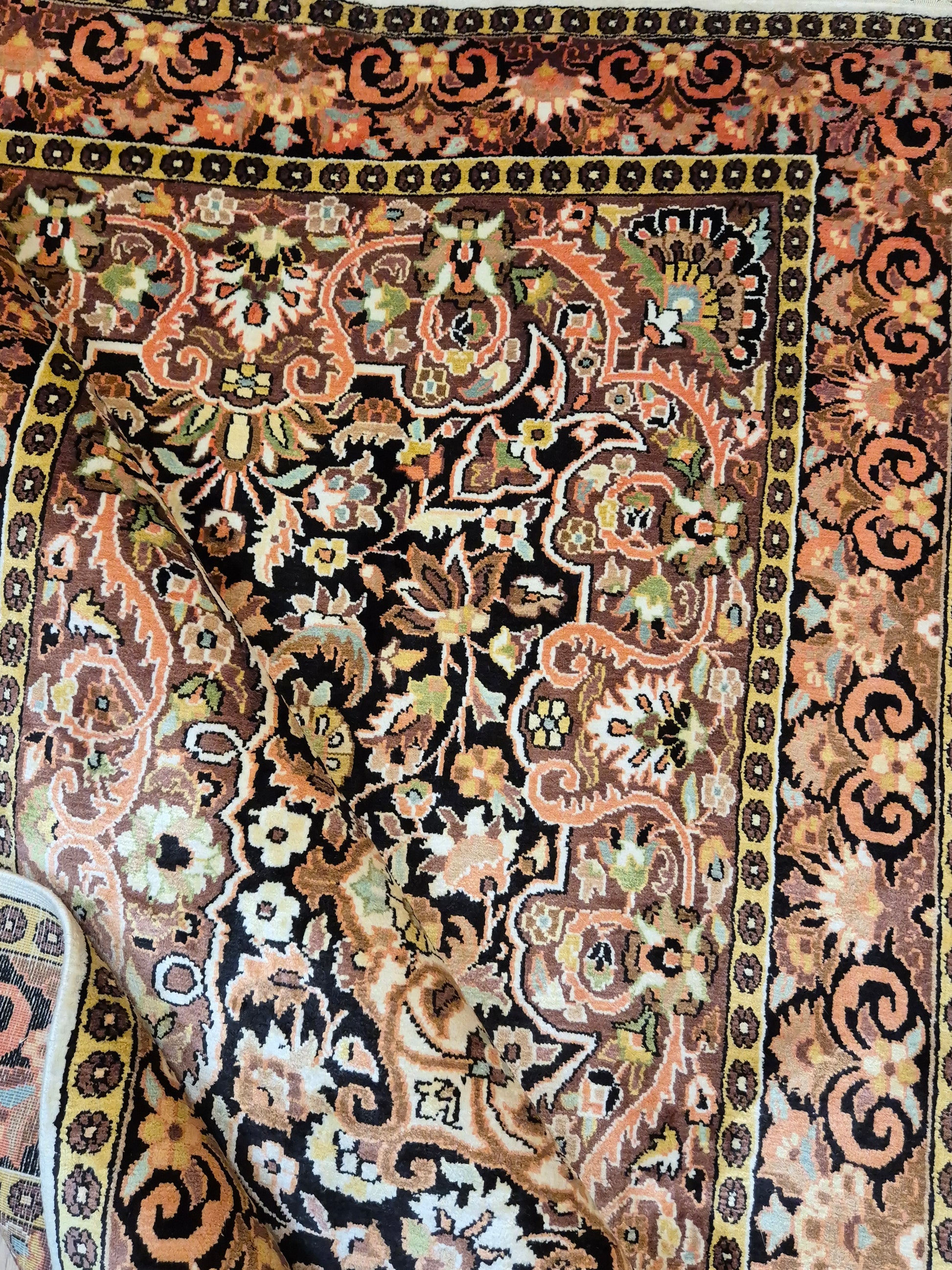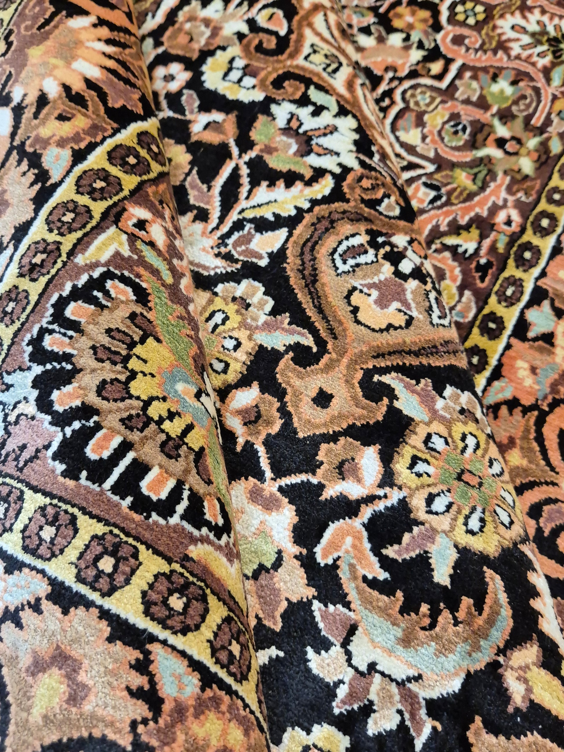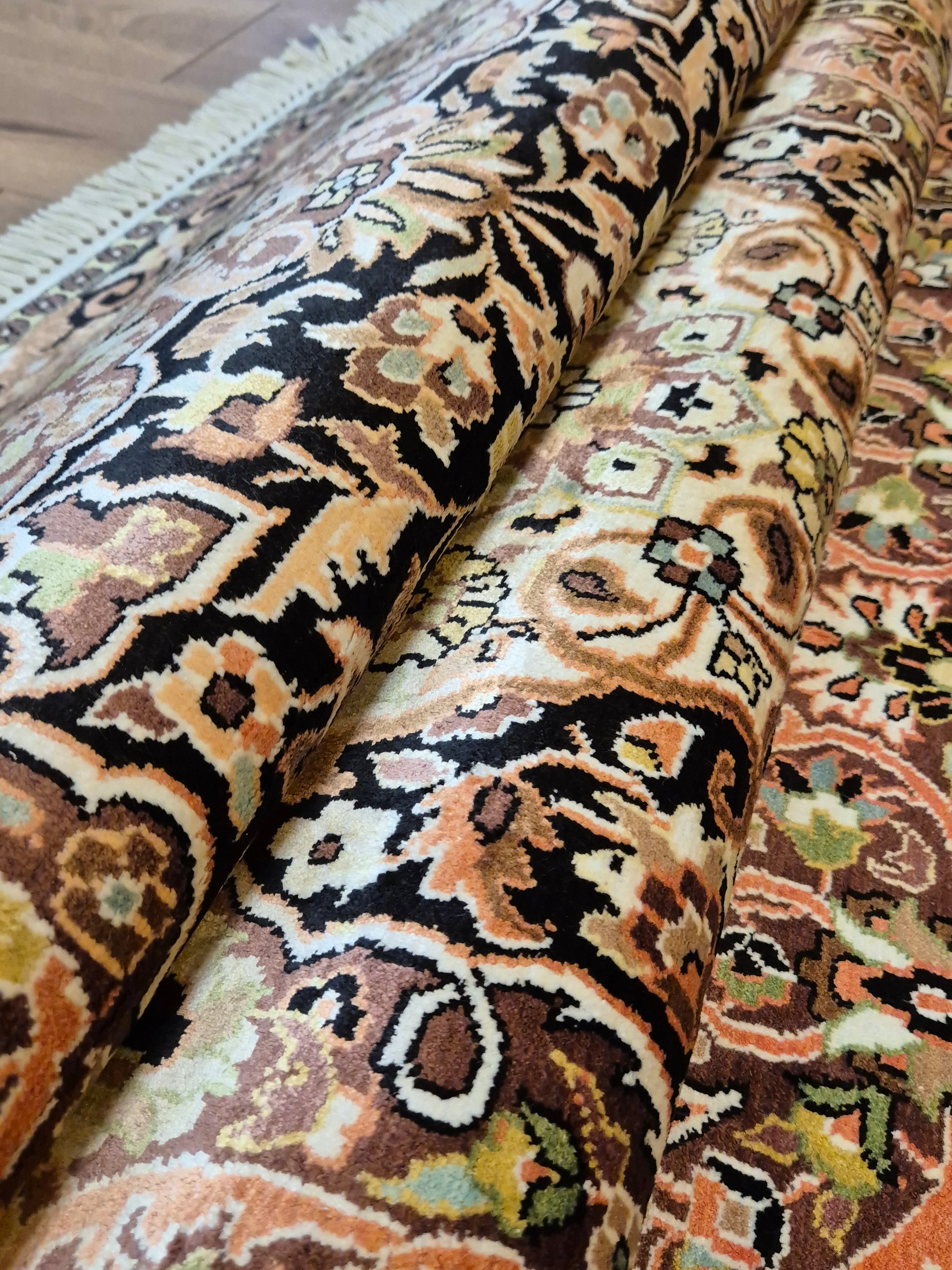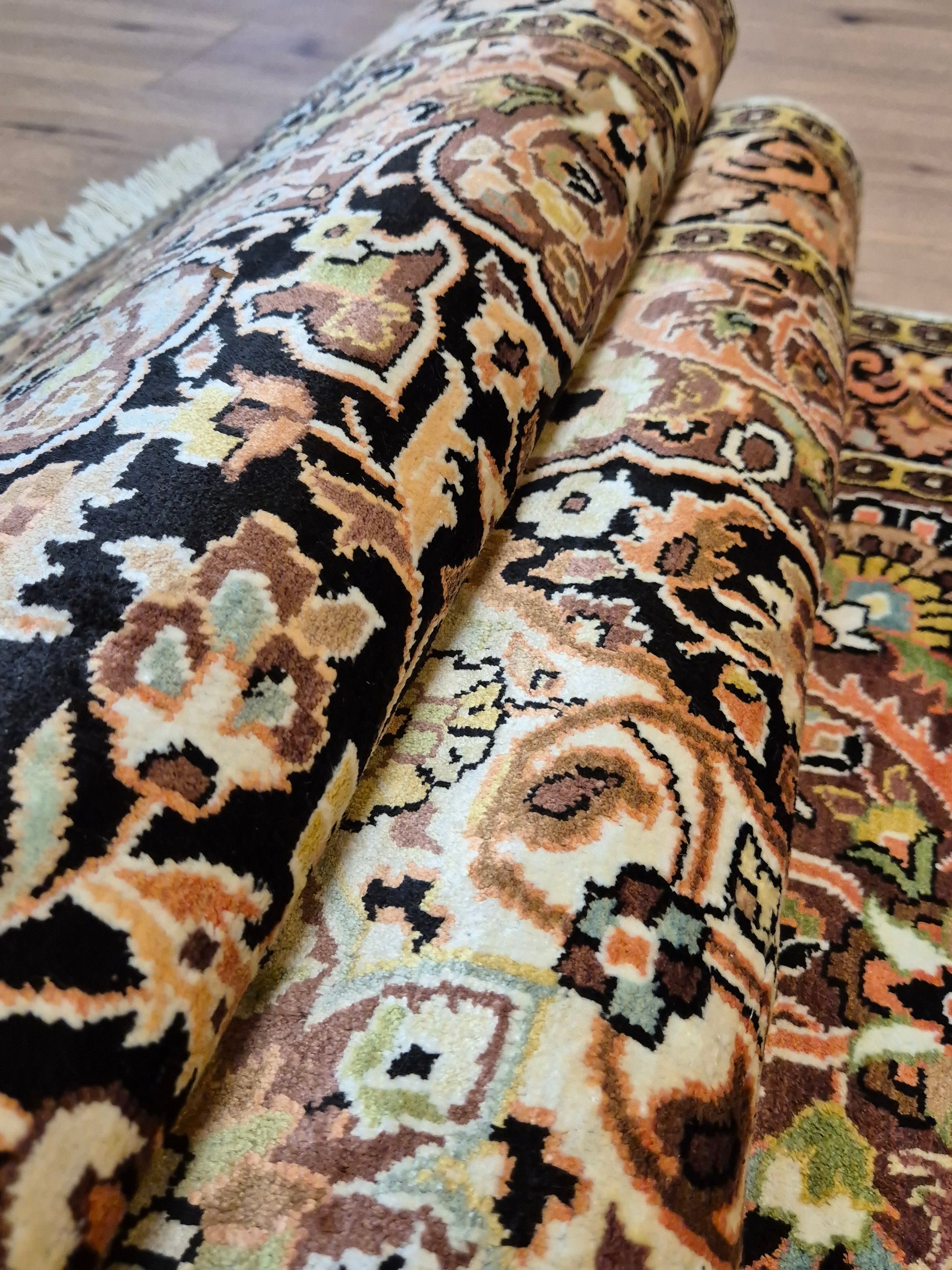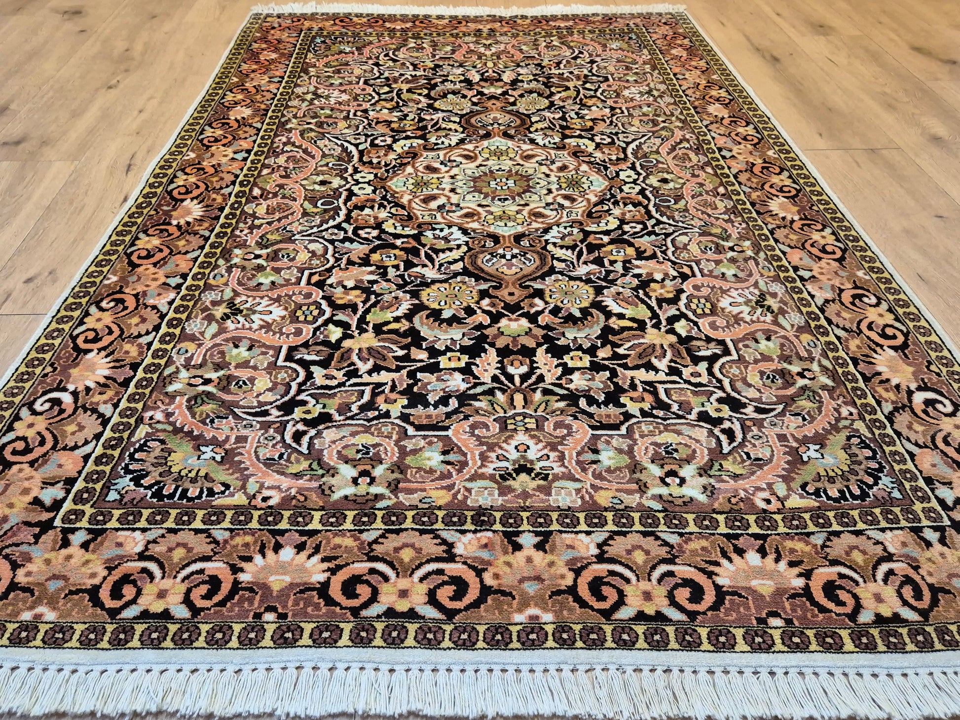 angeboten wird ein edler Kashmir Teppich aus reiner Seide, handgeknüpft in feinster Qualität. Im Zentrum befindet sich ein kunstvoll gestaltetes Medaillon auf dunkelbraunem Fond, umgeben von üppigen Blütenranken und floralen Arabesken. Die feinen Seidenfäden verleihen dem Teppich je nach Lichteinfall einen edlen Glanz und eine lebendige Farbwirkung. Die harmonische Bordüre mit floralen Ornamenten rundet das Gesamtbild elegant ab.