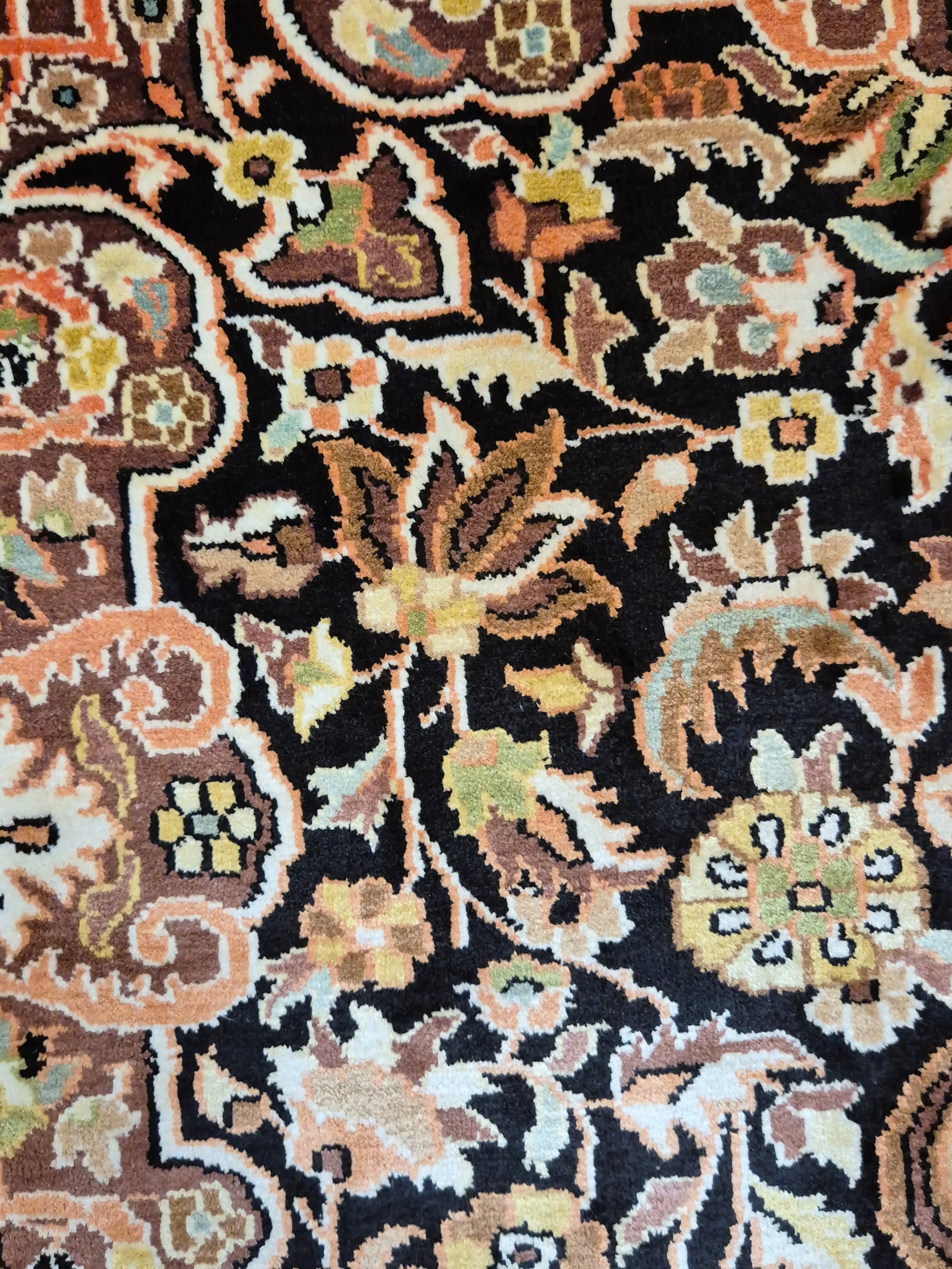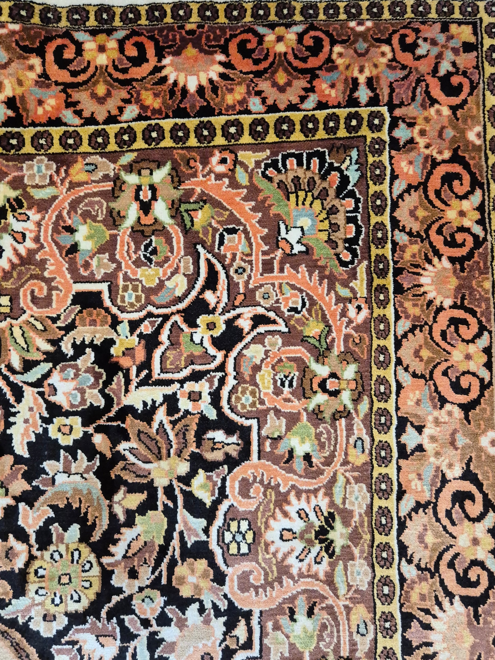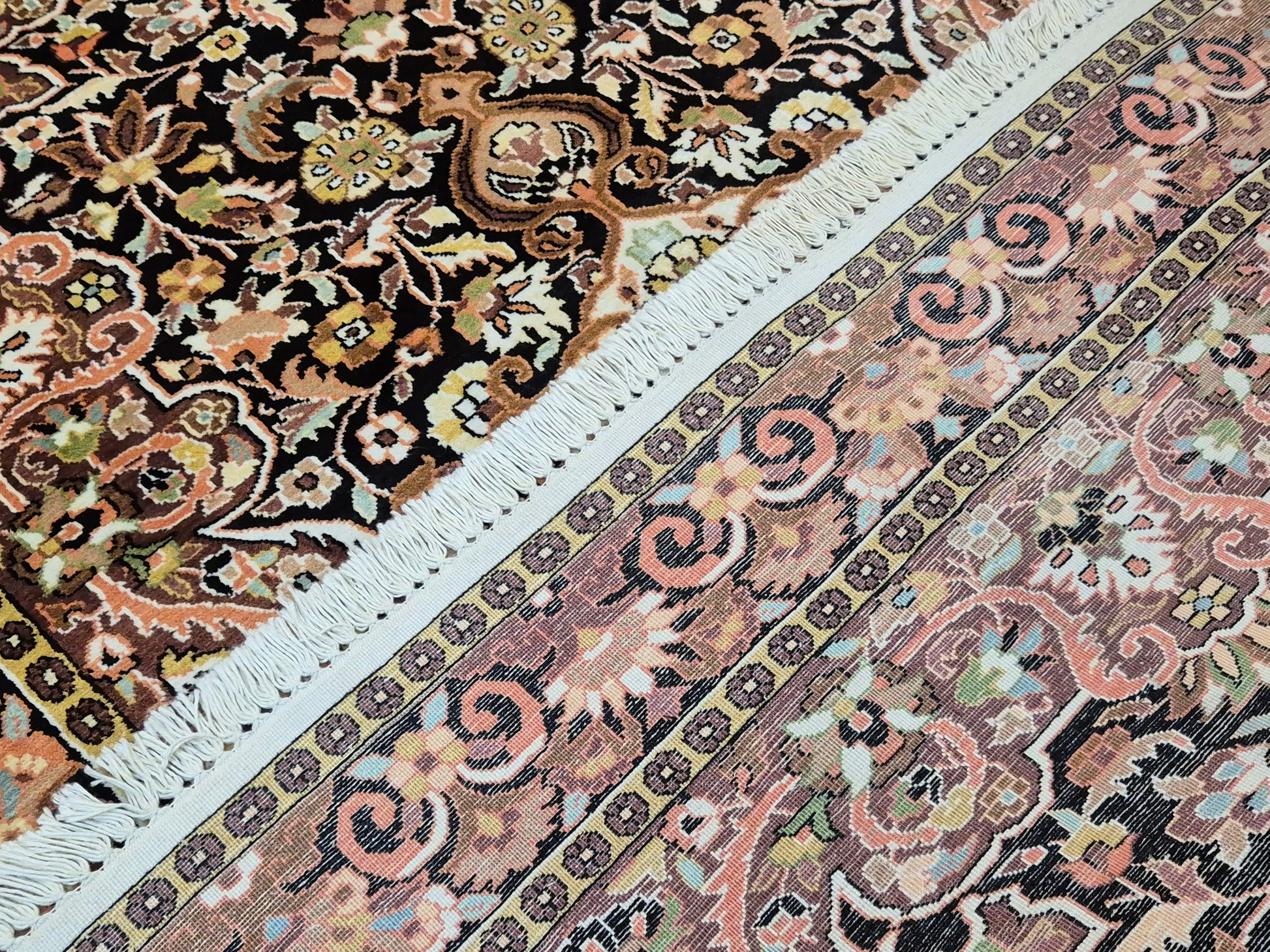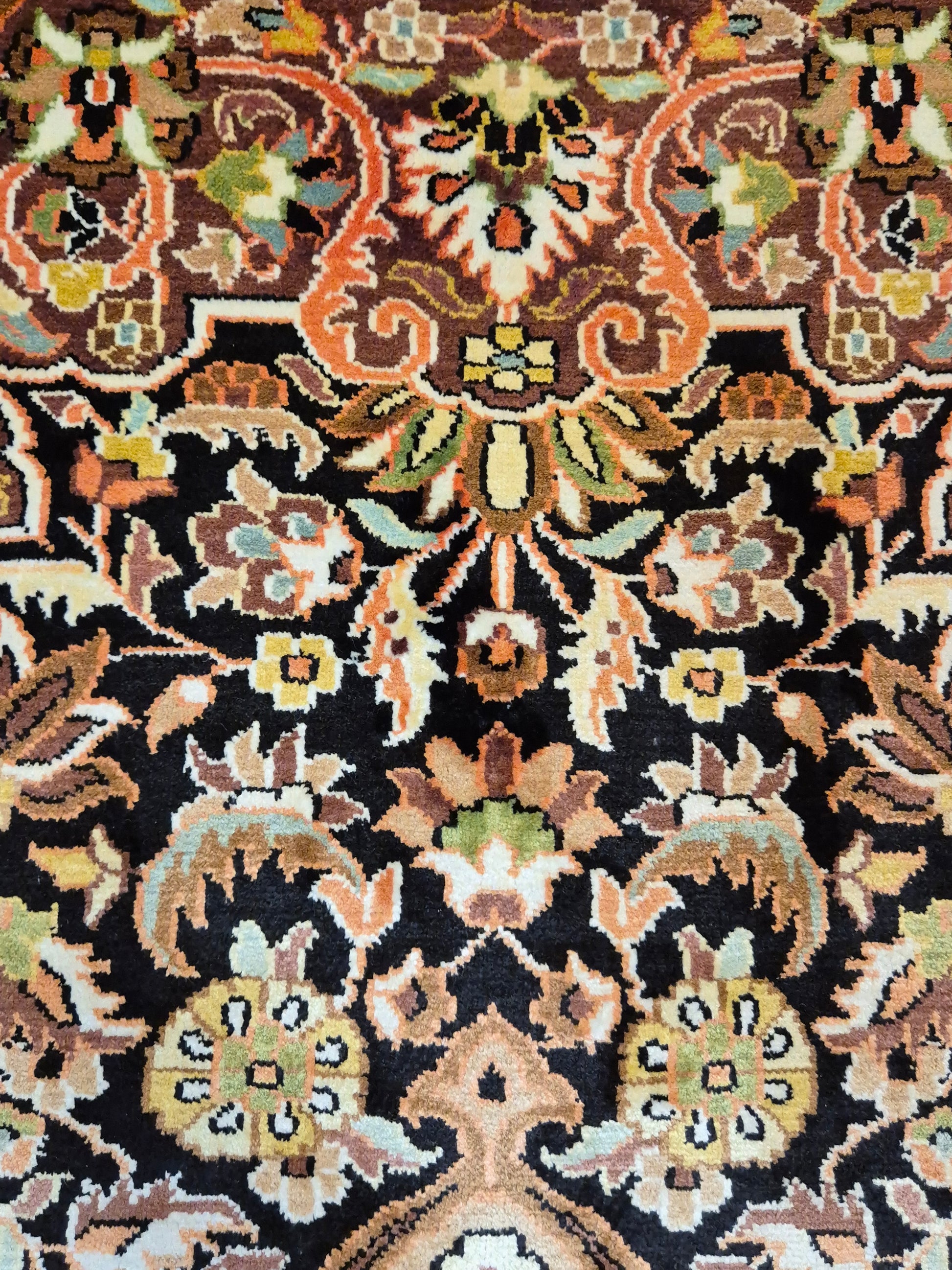 angeboten wird ein edler Kashmir Teppich aus reiner Seide, handgeknüpft in feinster Qualität. Im Zentrum befindet sich ein kunstvoll gestaltetes Medaillon auf dunkelbraunem Fond, umgeben von üppigen Blütenranken und floralen Arabesken. Die feinen Seidenfäden verleihen dem Teppich je nach Lichteinfall einen edlen Glanz und eine lebendige Farbwirkung. Die harmonische Bordüre mit floralen Ornamenten rundet das Gesamtbild elegant ab.
