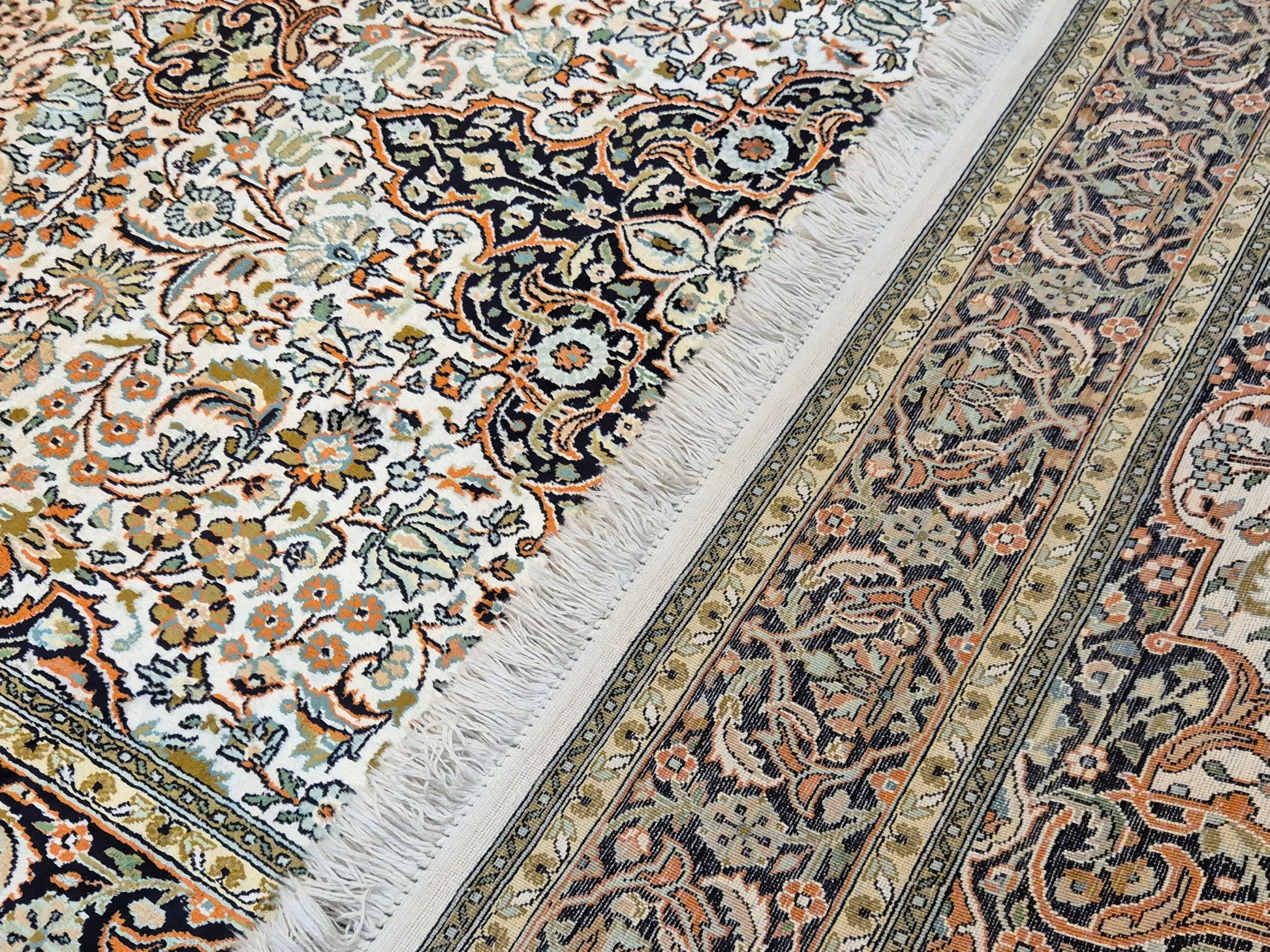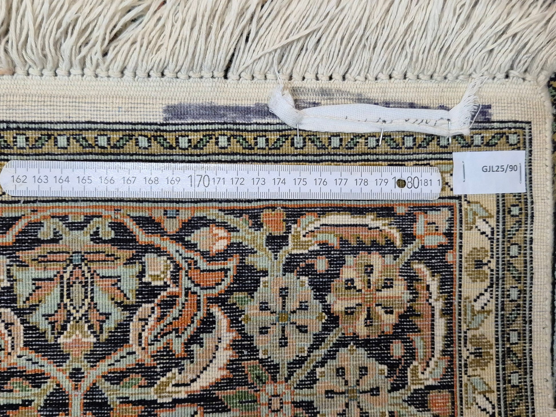 angeboten wird ein edler Kashmir Teppich aus reiner Seide, handgeknüpft in feiner Ausführung. Das Design zeigt ein prächtiges Mittelmedaillon auf hellem Fond, eingerahmt von filigranen Blütenranken und geschwungenen Arabesken. Die harmonische Farbgebung mit Pastelltönen, Beige und Akzenten in Dunkelblau und Rost verleiht diesem Teppich eine besonders elegante und luxuriöse Ausstrahlung.