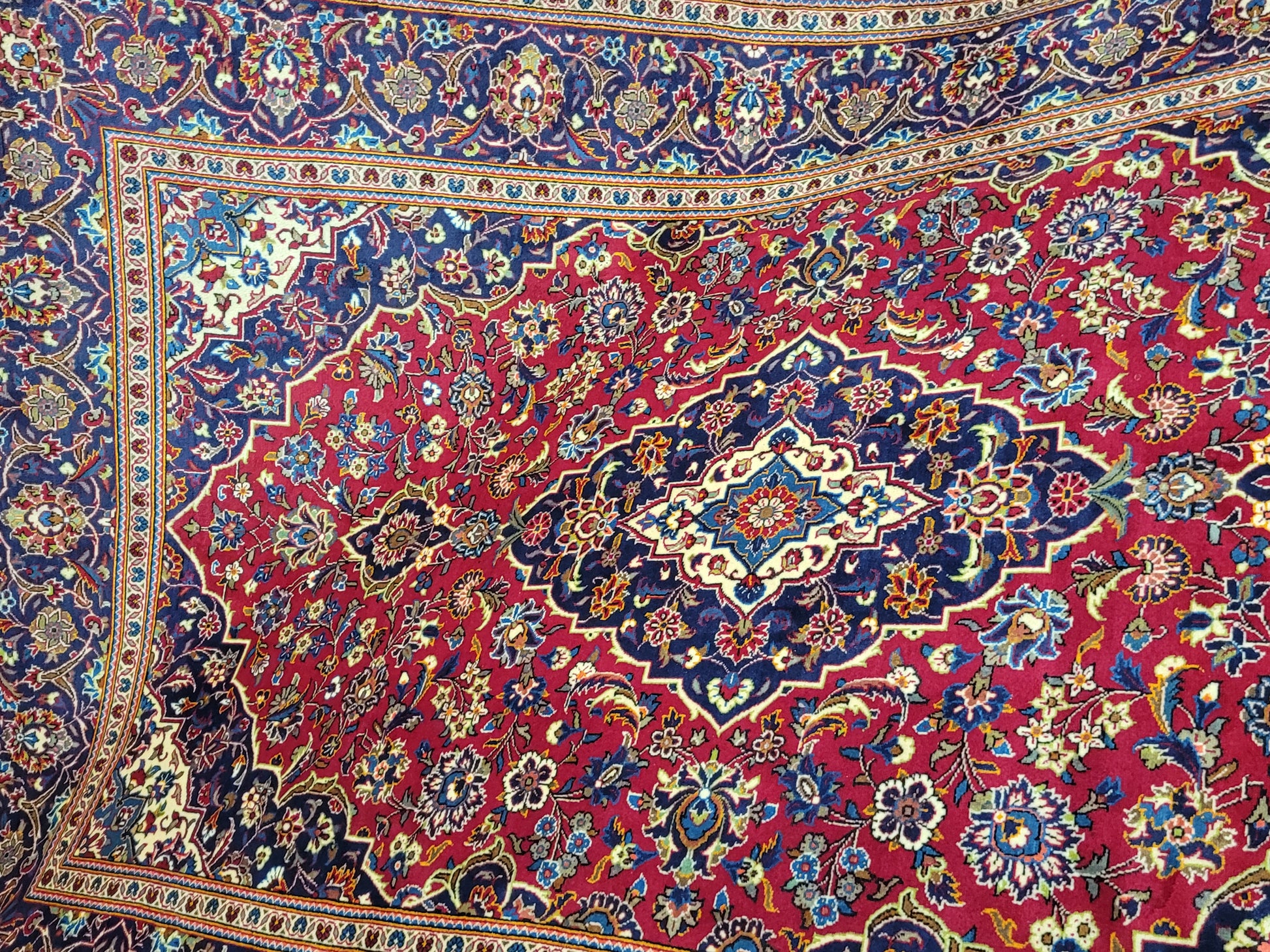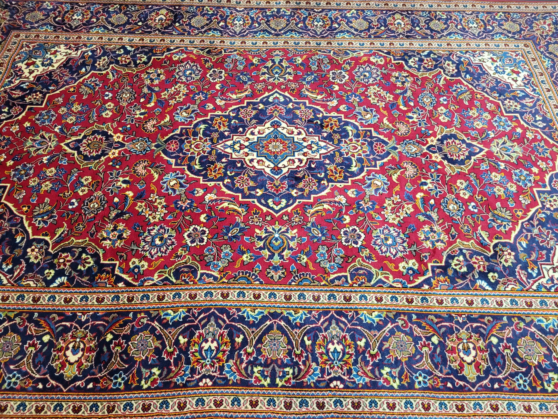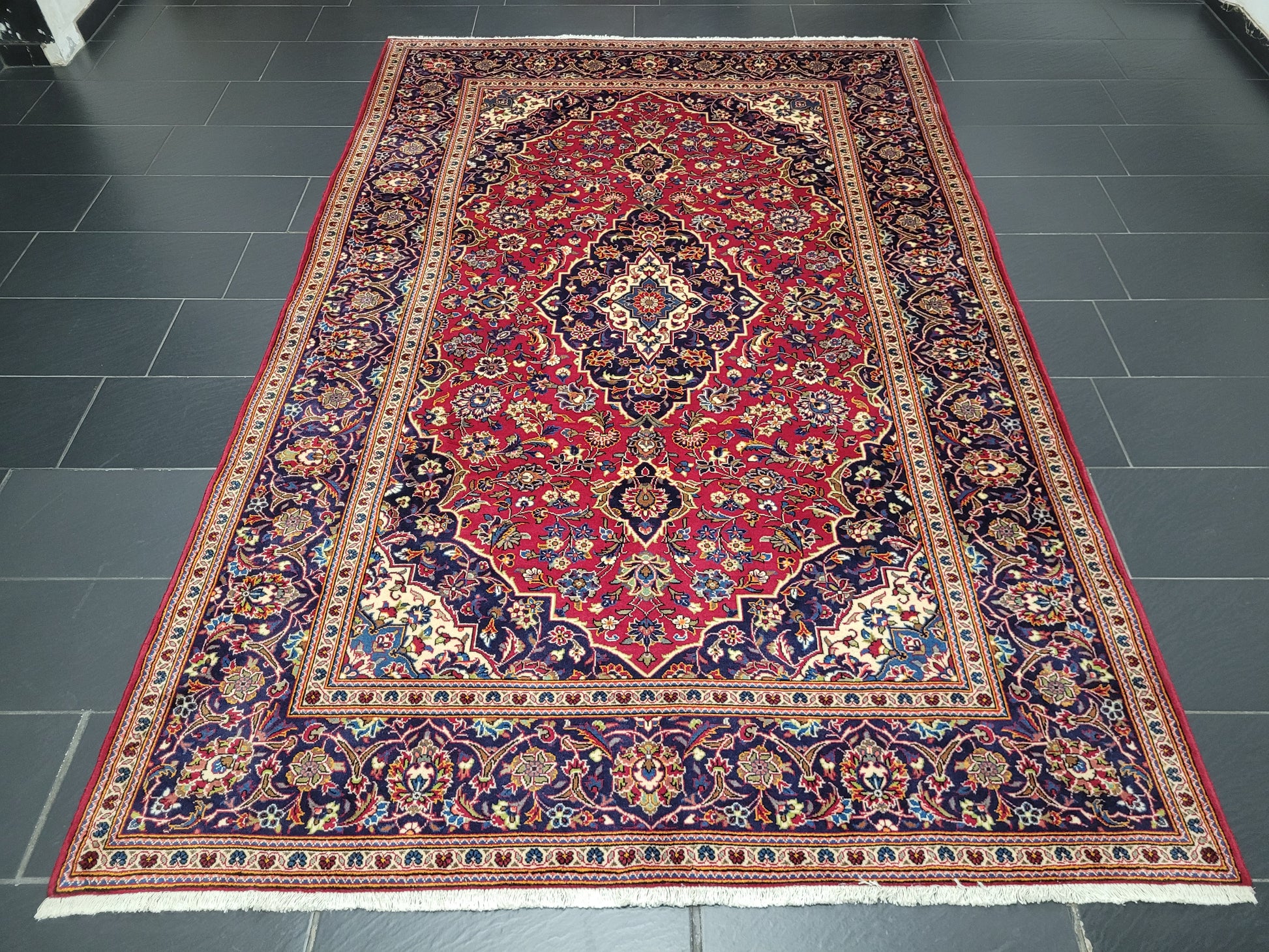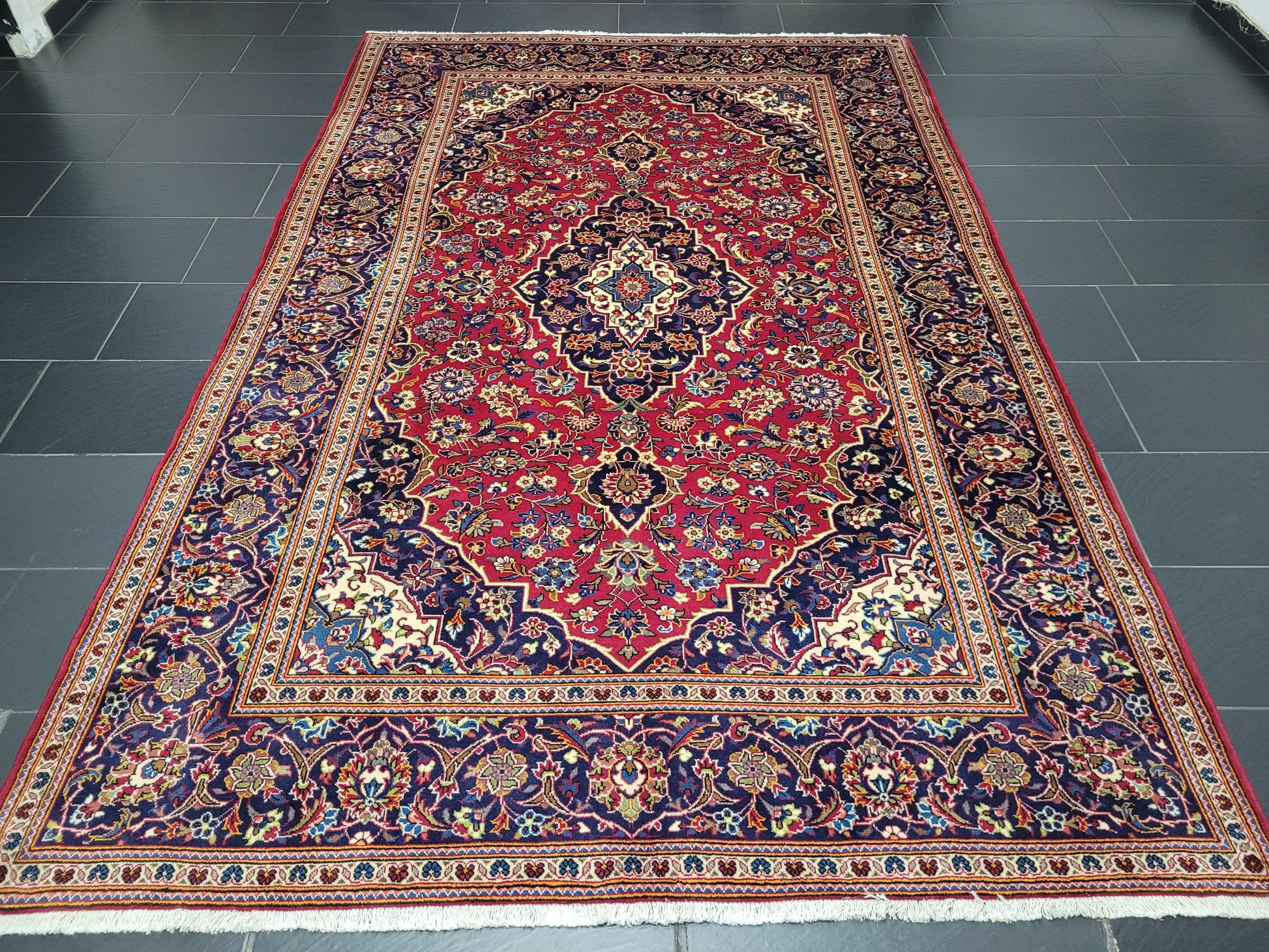 angeboten wird ein klassischer handgeknüpfter Keschan Teppich aus hochwertiger Wolle mit fein ausgearbeiteter Knüpfung. Das zentrale Medaillon ruht auf leuchtend rotem Fond, umgeben von detailreichen Blütenranken und harmonisch abgestimmten Ornamenten in tiefem Blau, Hellblau, Beige, Grün und Rot.