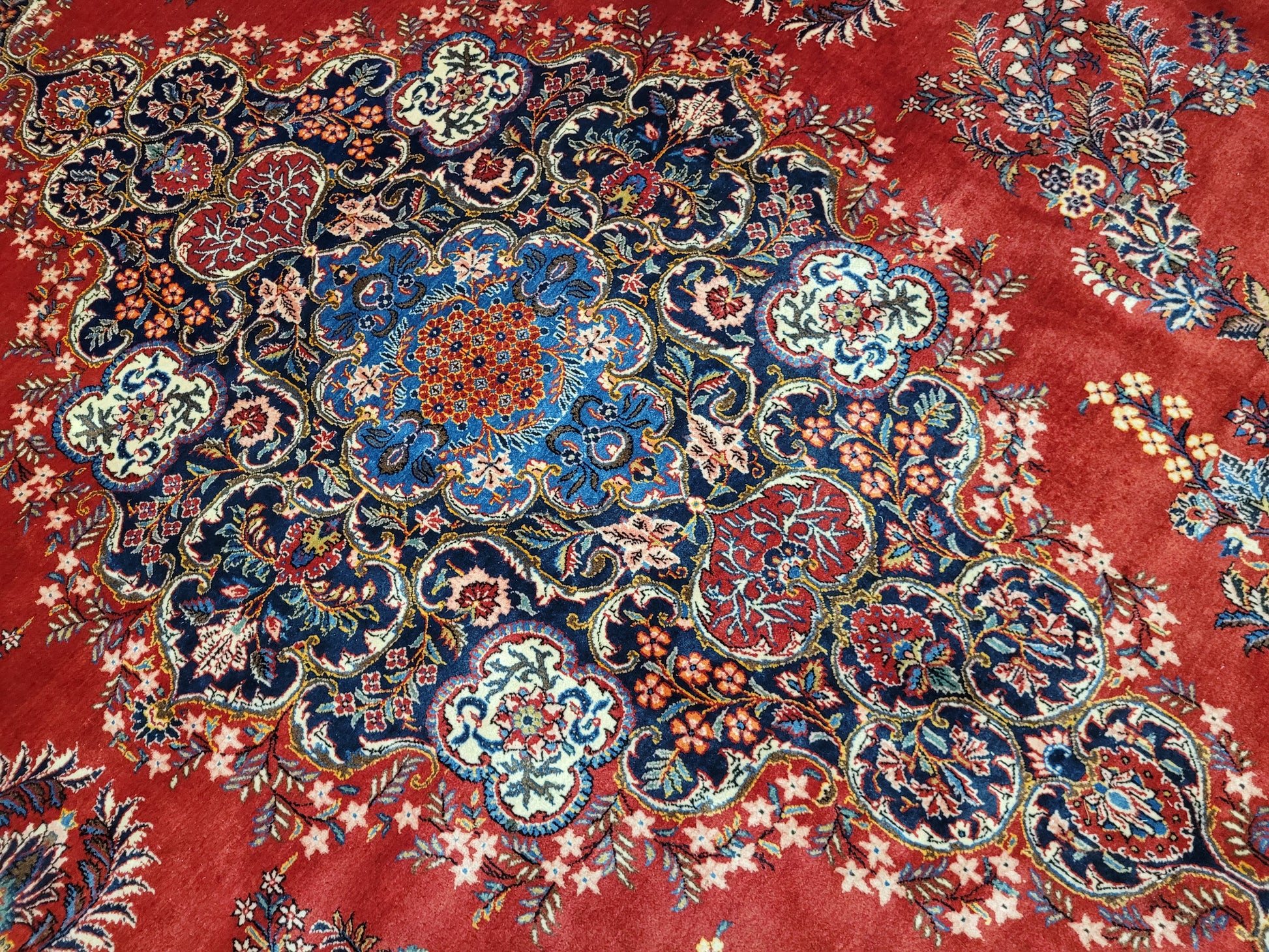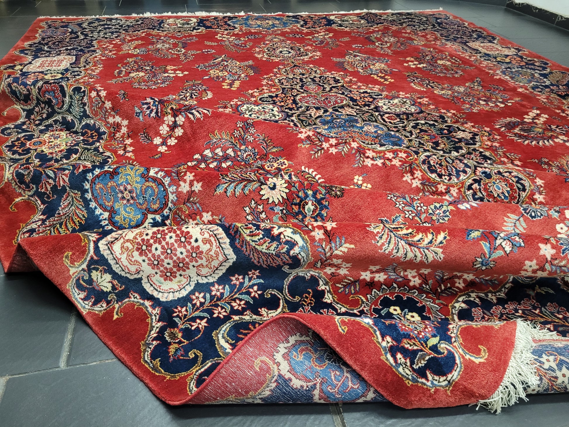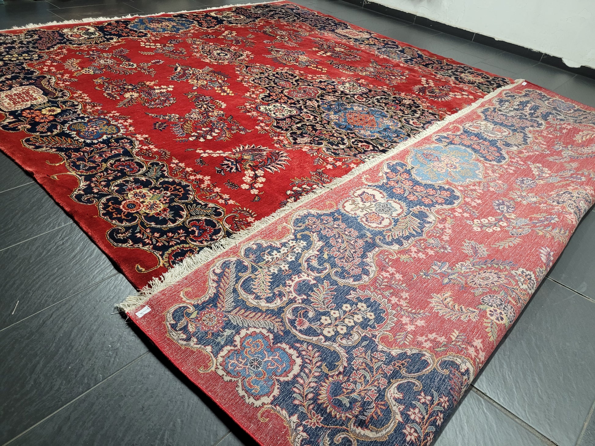 angeboten wird ein prachtvoller Keschan Teppich aus feinster Korkwolle, handgeknüpft in meisterlicher Qualität. Das leuchtend rote Mittelfeld ist mit einem zentralen, reich ornamentierten Medaillon geschmückt, umrahmt von geschwungenen Blütenranken, Palmetten und kunstvoll gestalteten Arabesken. Eine tiefblaue Hauptbordüre mit floralem Wechselmotiv fasst das Gesamtbild elegant ein – ein Klassiker der persischen Knüpfkunst in eindrucksvoller Größe.