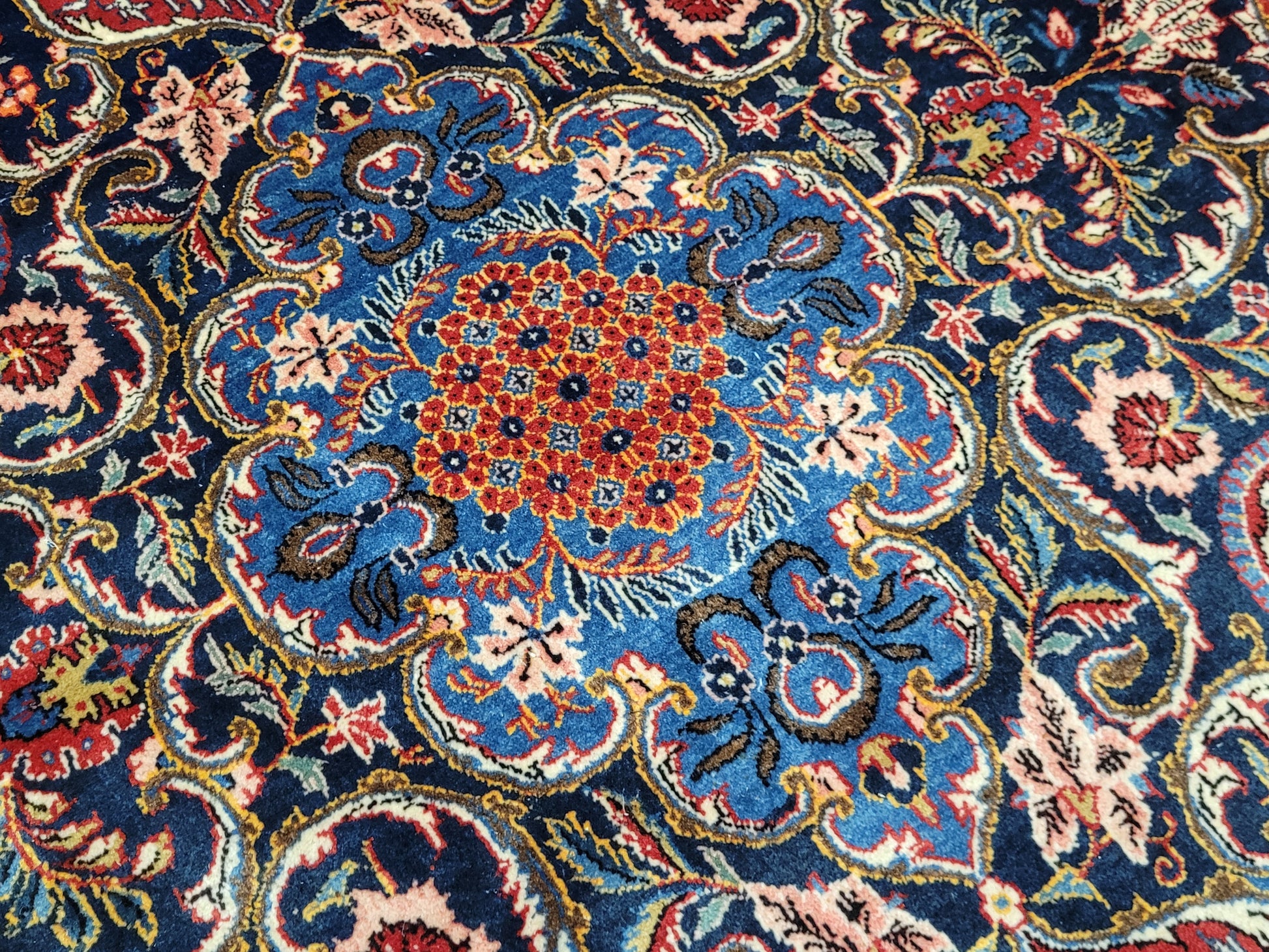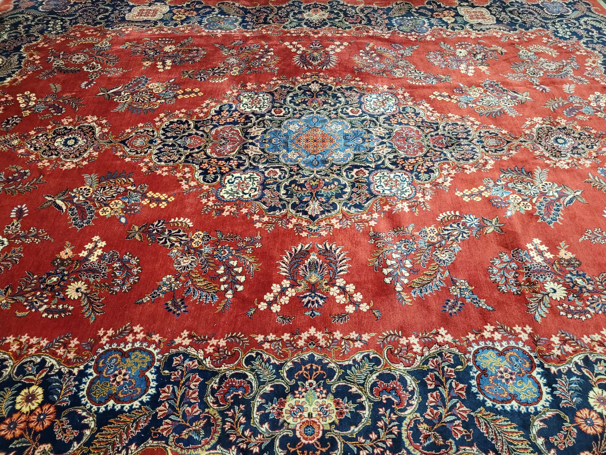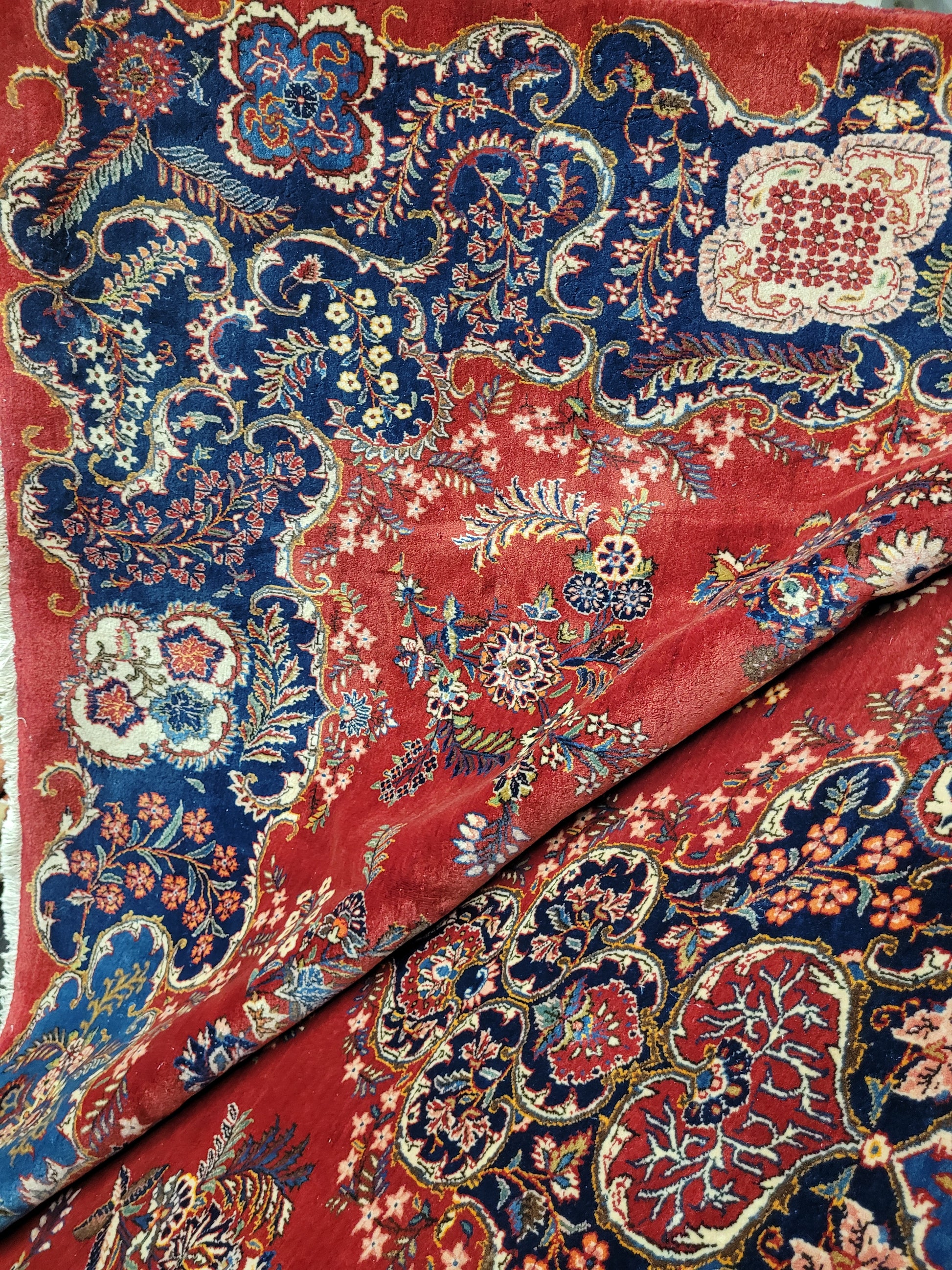angeboten wird ein prachtvoller Keschan Teppich aus feinster Korkwolle, handgeknüpft in meisterlicher Qualität. Das leuchtend rote Mittelfeld ist mit einem zentralen, reich ornamentierten Medaillon geschmückt, umrahmt von geschwungenen Blütenranken, Palmetten und kunstvoll gestalteten Arabesken. Eine tiefblaue Hauptbordüre mit floralem Wechselmotiv fasst das Gesamtbild elegant ein – ein Klassiker der persischen Knüpfkunst in eindrucksvoller Größe.