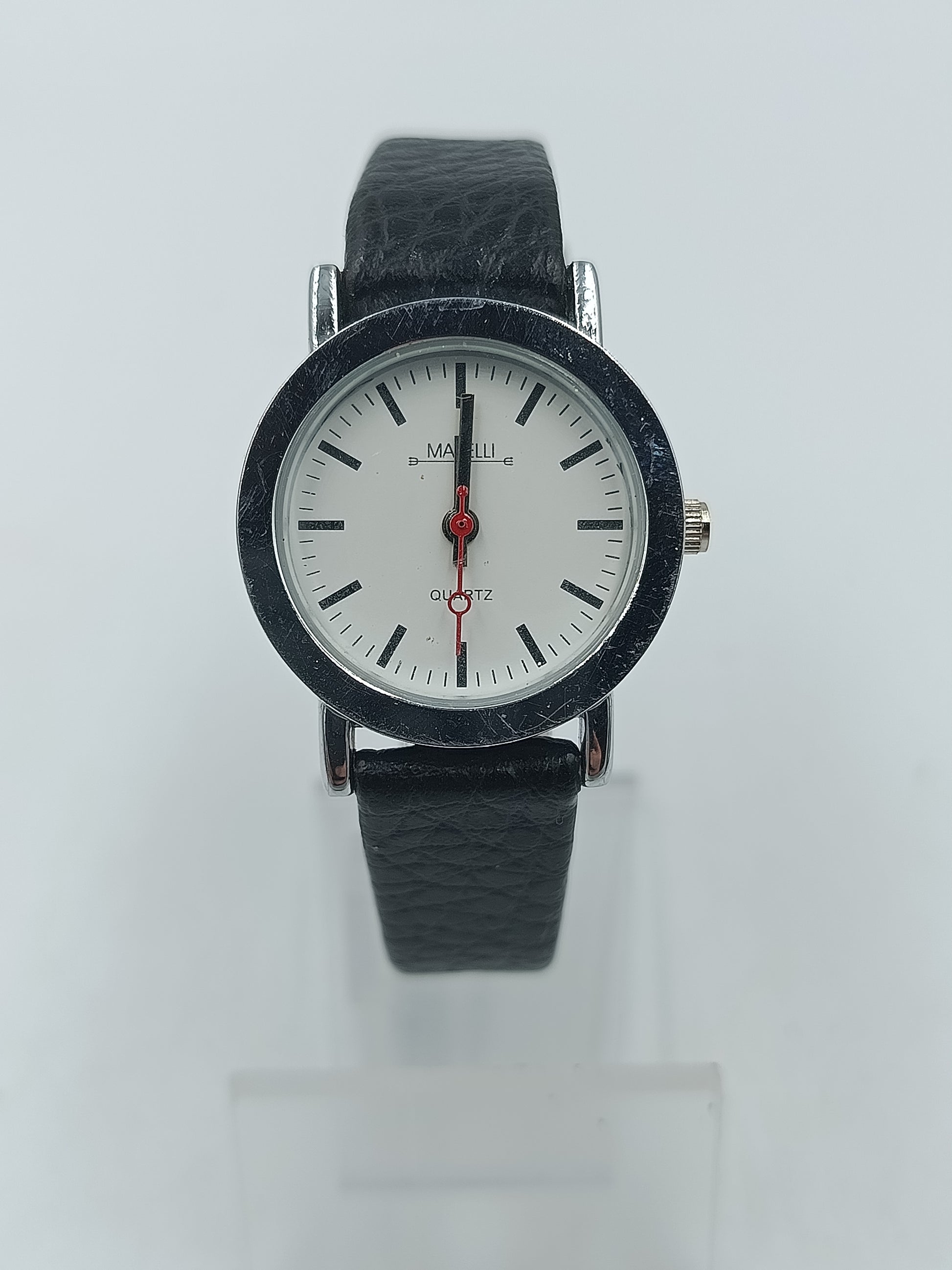 Diese elegante Armbanduhr überzeugt durch ihr klares zeitloses Design und ihre vielseitige Tragbarkeit. Das helle Zifferblatt mit gut lesbaren Indizes und einem dezenten roten Sekundenzeiger verleiht der Uhr eine moderne Note. Das schwarze Lederarmband sorgt für angenehmen Tragekomfort und macht die Uhr zu einem passenden Begleiter für Alltag Büro oder besondere Anlässe.