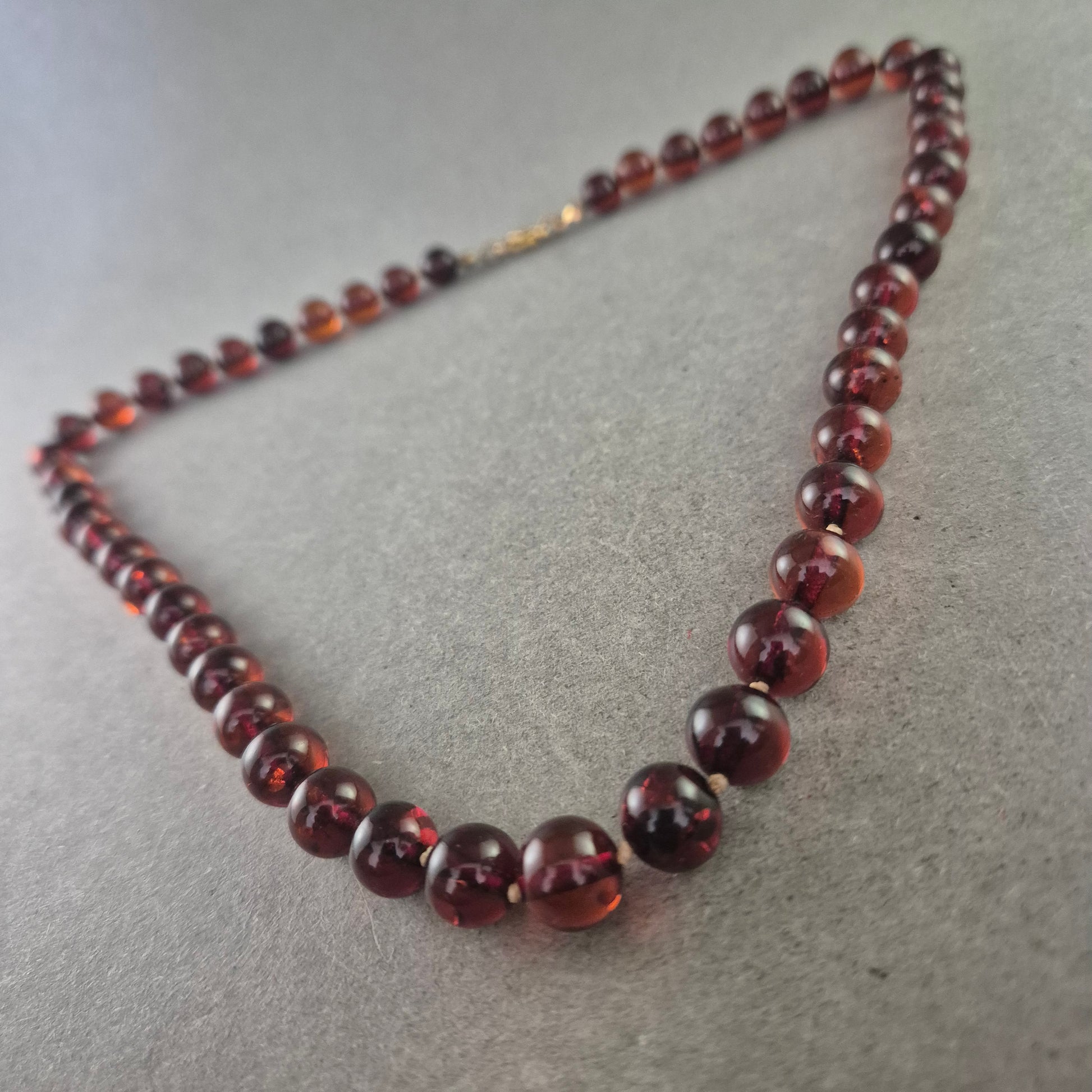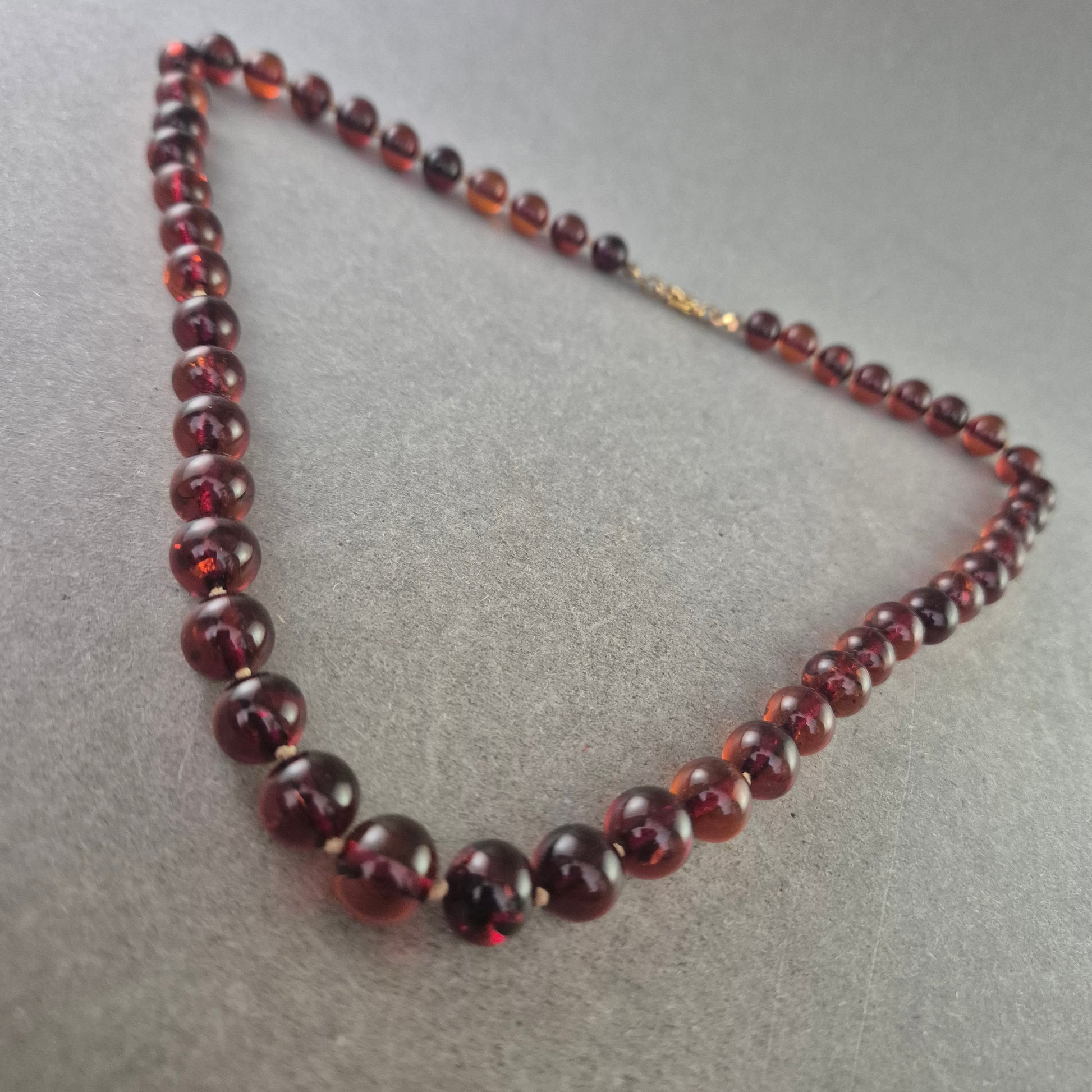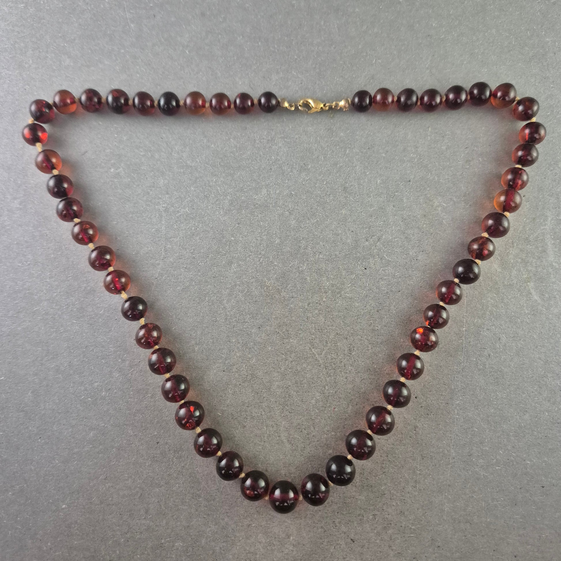 Diese elegante Halskette aus polierten Bernsteinperlen begeistert durch ihre warme, tiefrot-braune Farbe mit leichtem Glanz. Die gleichmäßigen Kugeln verleihen der Kette ein harmonisches Erscheinungsbild. Der goldfarbene Karabinerverschluss sorgt für sicheren Halt. Ideal für Natursteinliebhaber oder als stilvolles Vintage-Accessoire.