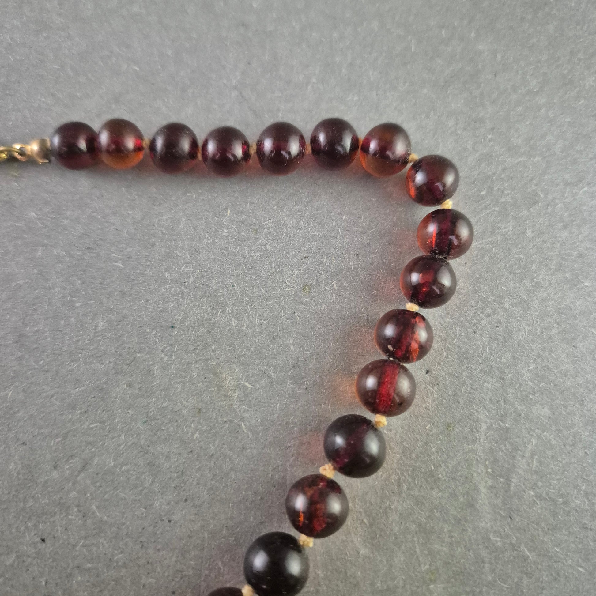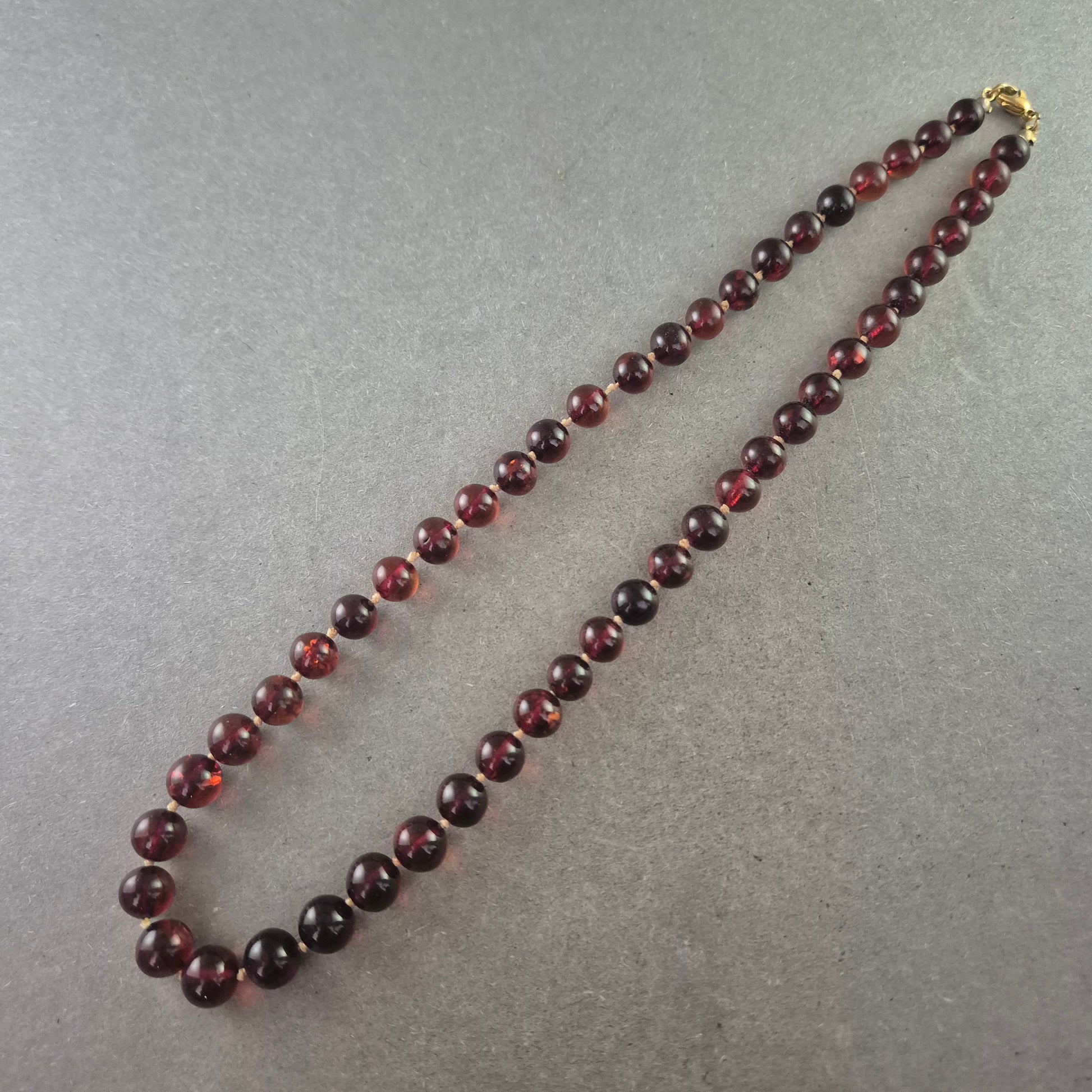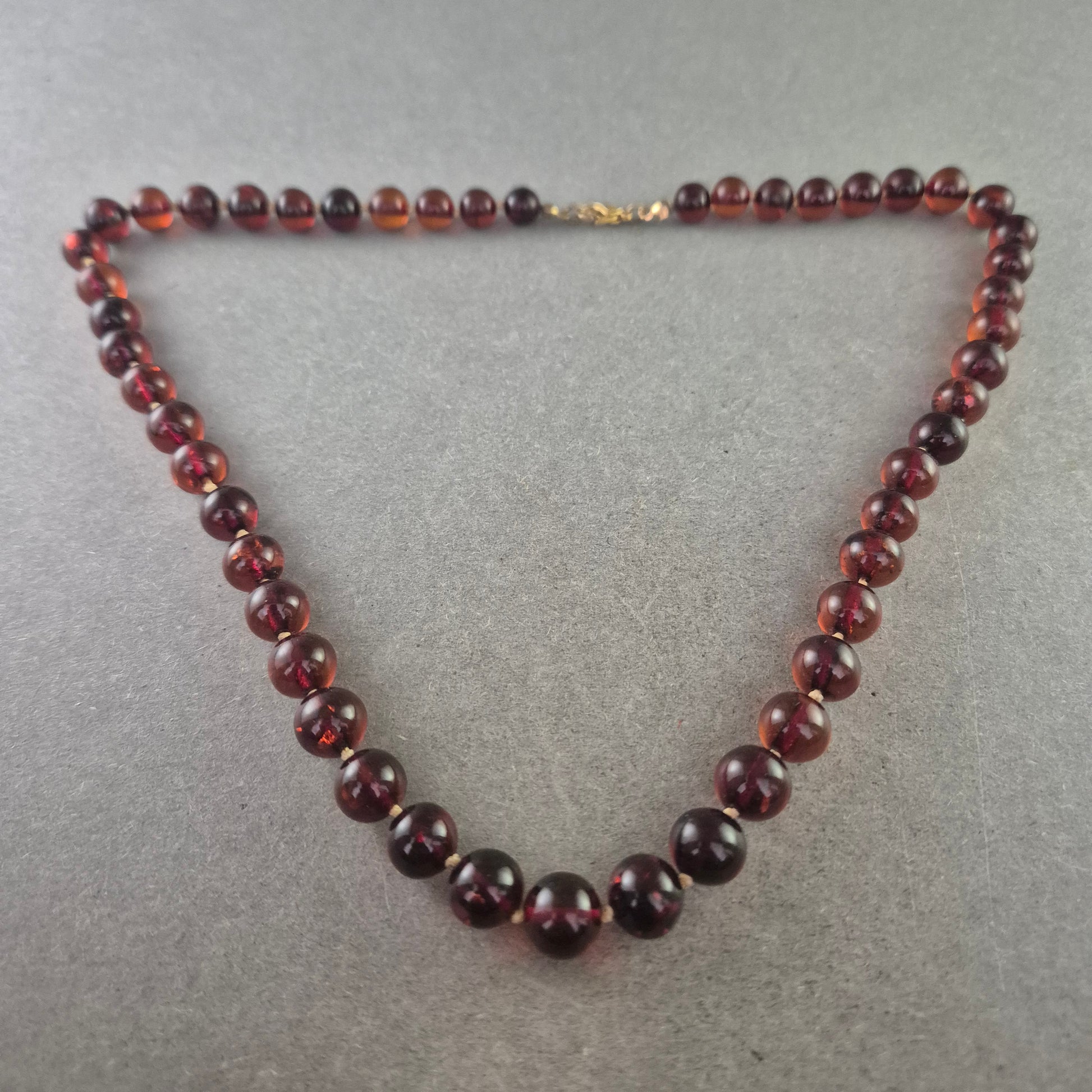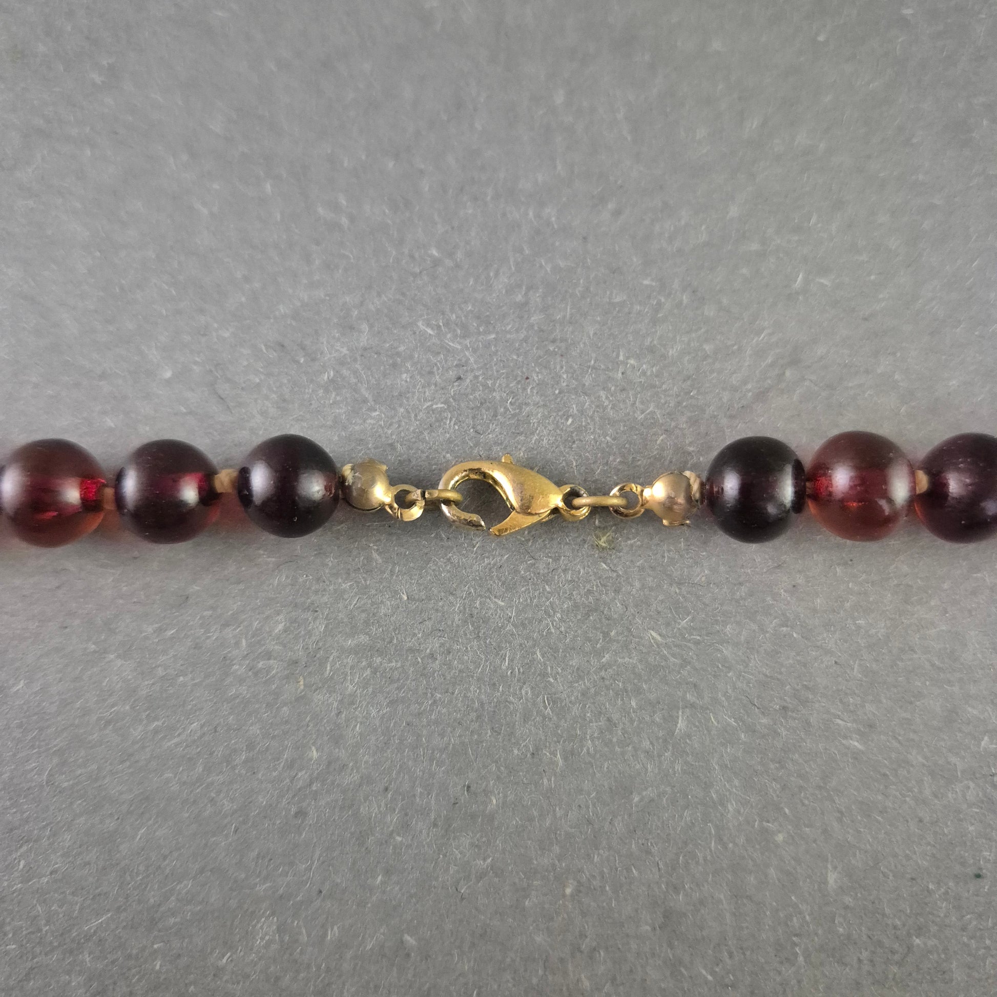 Diese elegante Halskette aus polierten Bernsteinperlen begeistert durch ihre warme, tiefrot-braune Farbe mit leichtem Glanz. Die gleichmäßigen Kugeln verleihen der Kette ein harmonisches Erscheinungsbild. Der goldfarbene Karabinerverschluss sorgt für sicheren Halt. Ideal für Natursteinliebhaber oder als stilvolles Vintage-Accessoire.