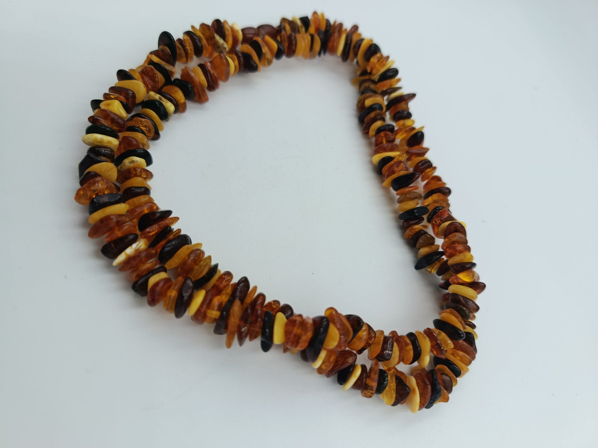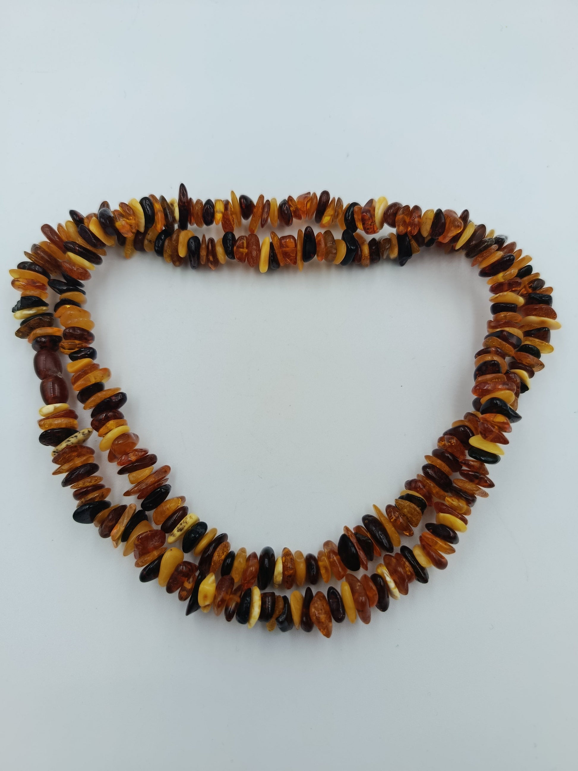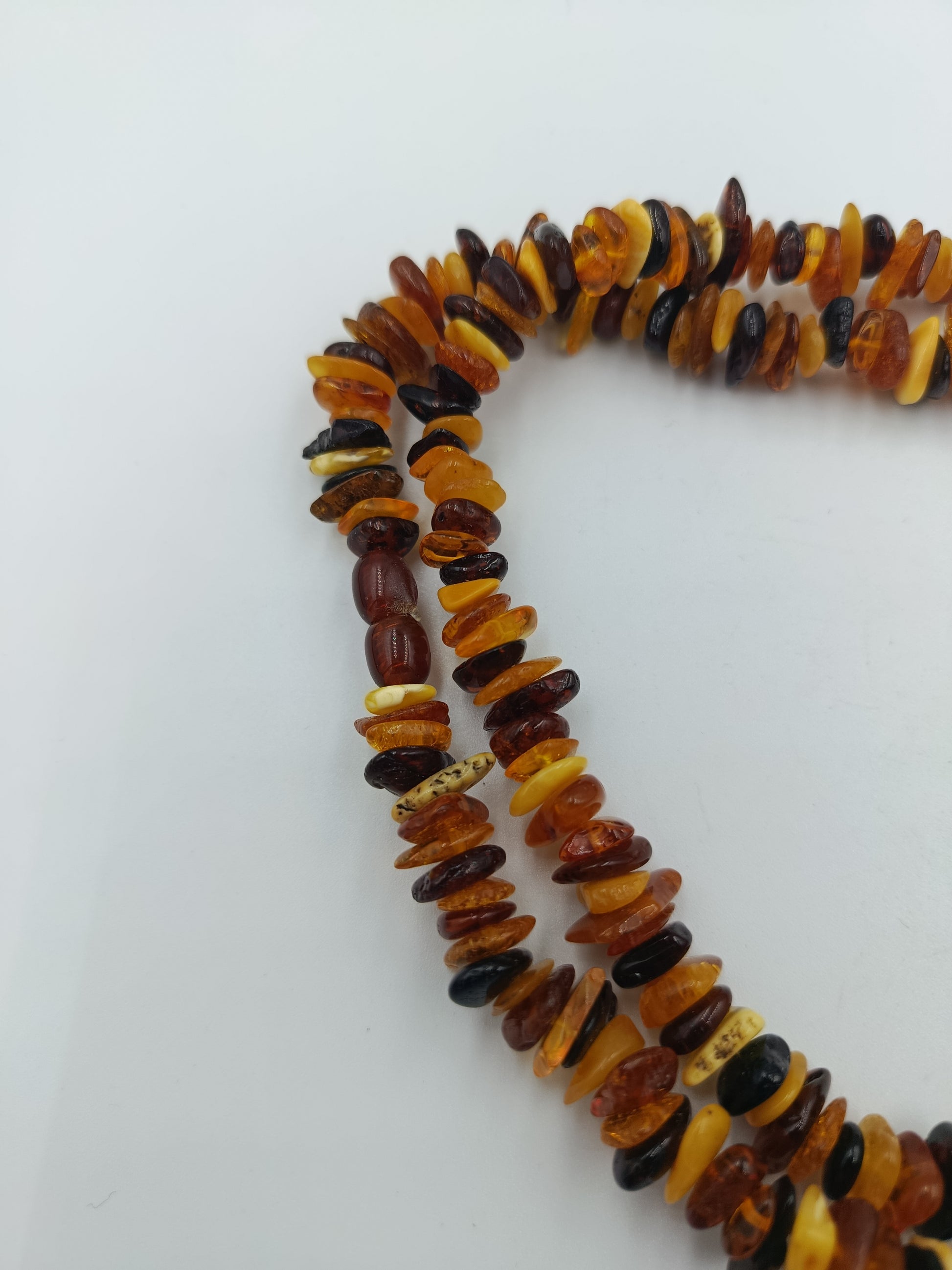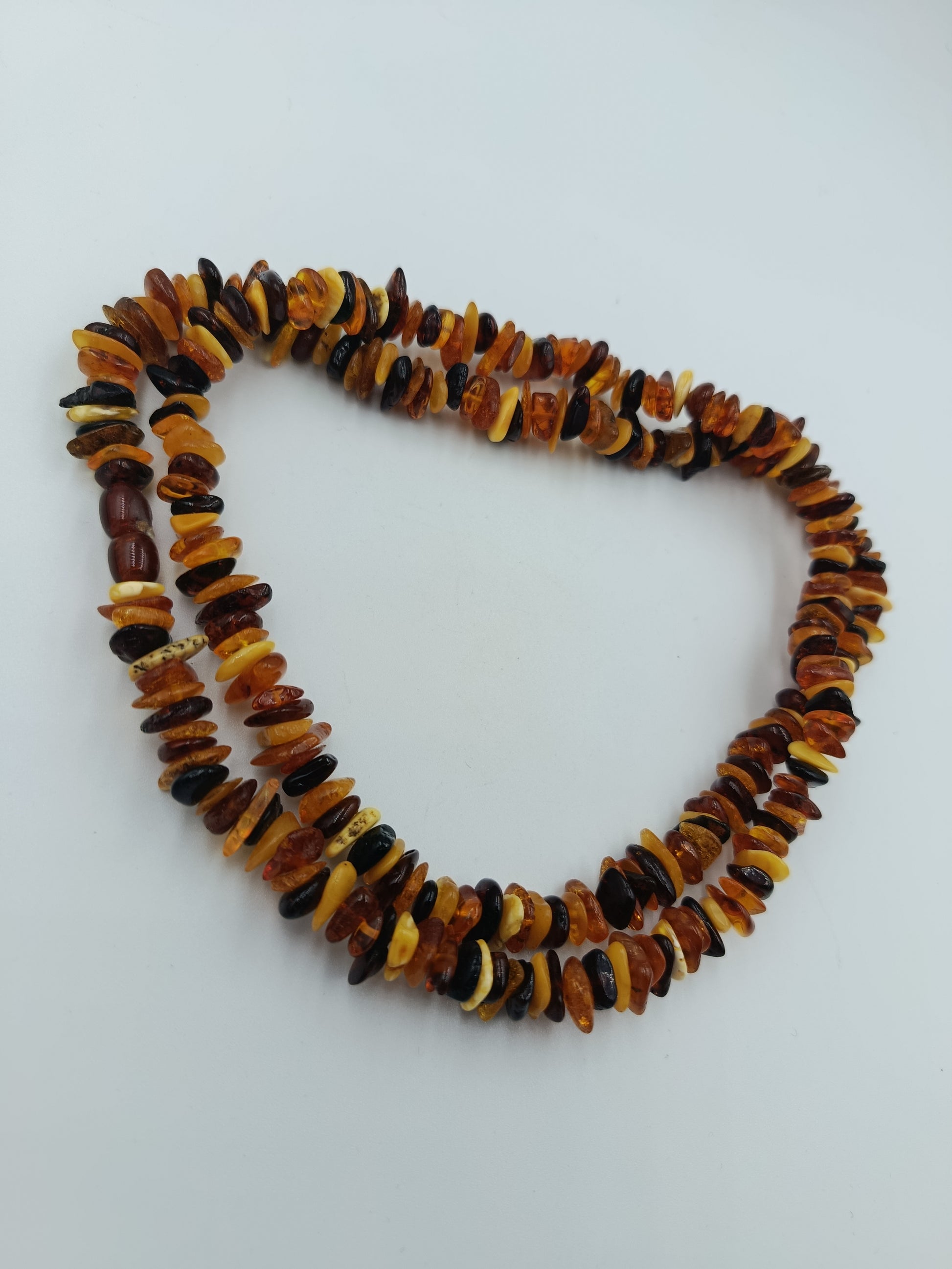 Diese wunderschöne Kette besteht aus echten, polierten Bernstein-Splittern in verschiedenen warmen Farbtönen – von Honiggelb über Karamell bis hin zu dunklem Cognac. Die natürliche Maserung der einzelnen Steine macht jedes Stück zu einem Unikat. Mit ihrer Länge von 73 cm lässt sich die Kette einfach über den Kopf ziehen, ganz ohne Verschluss.
