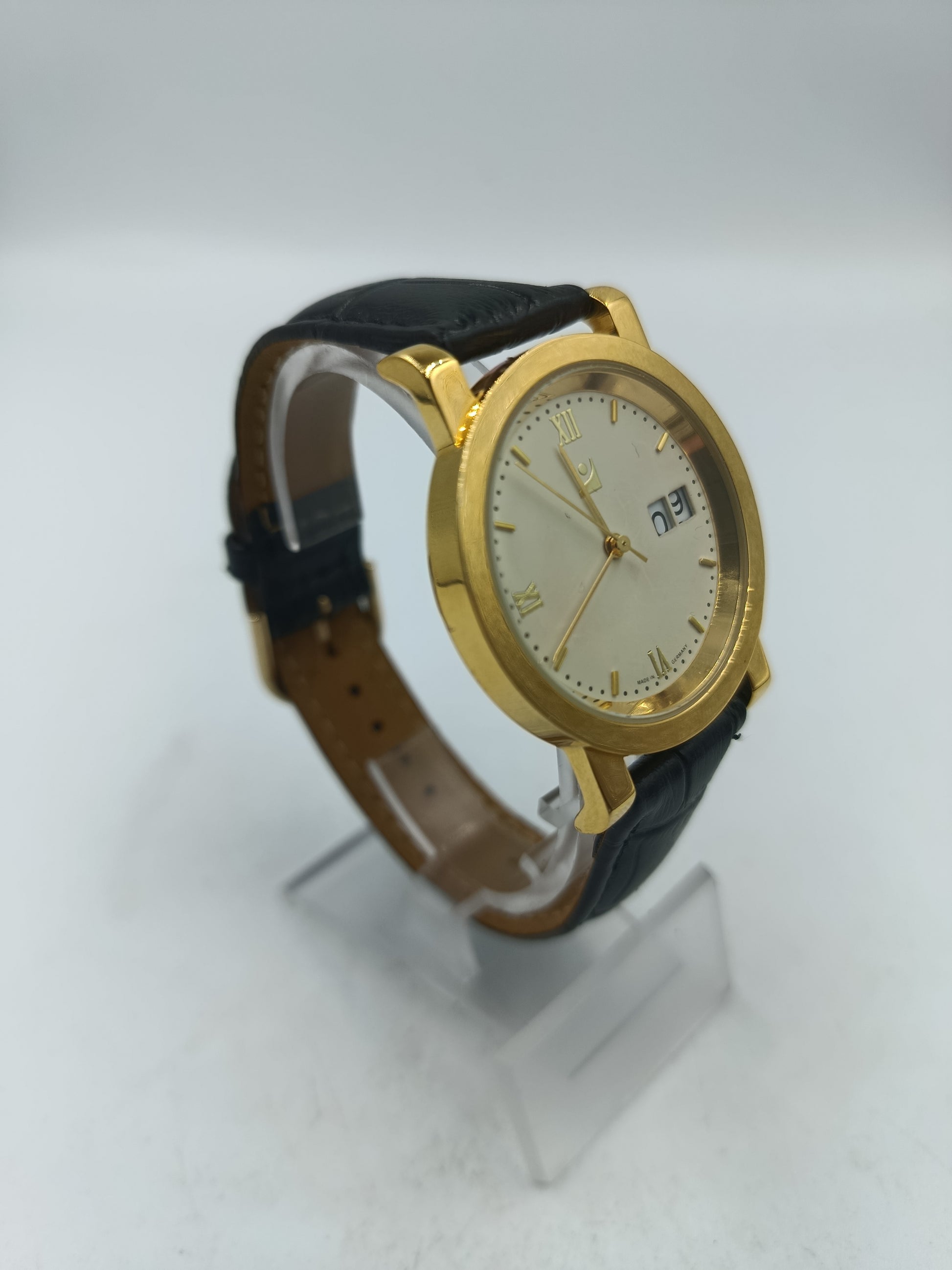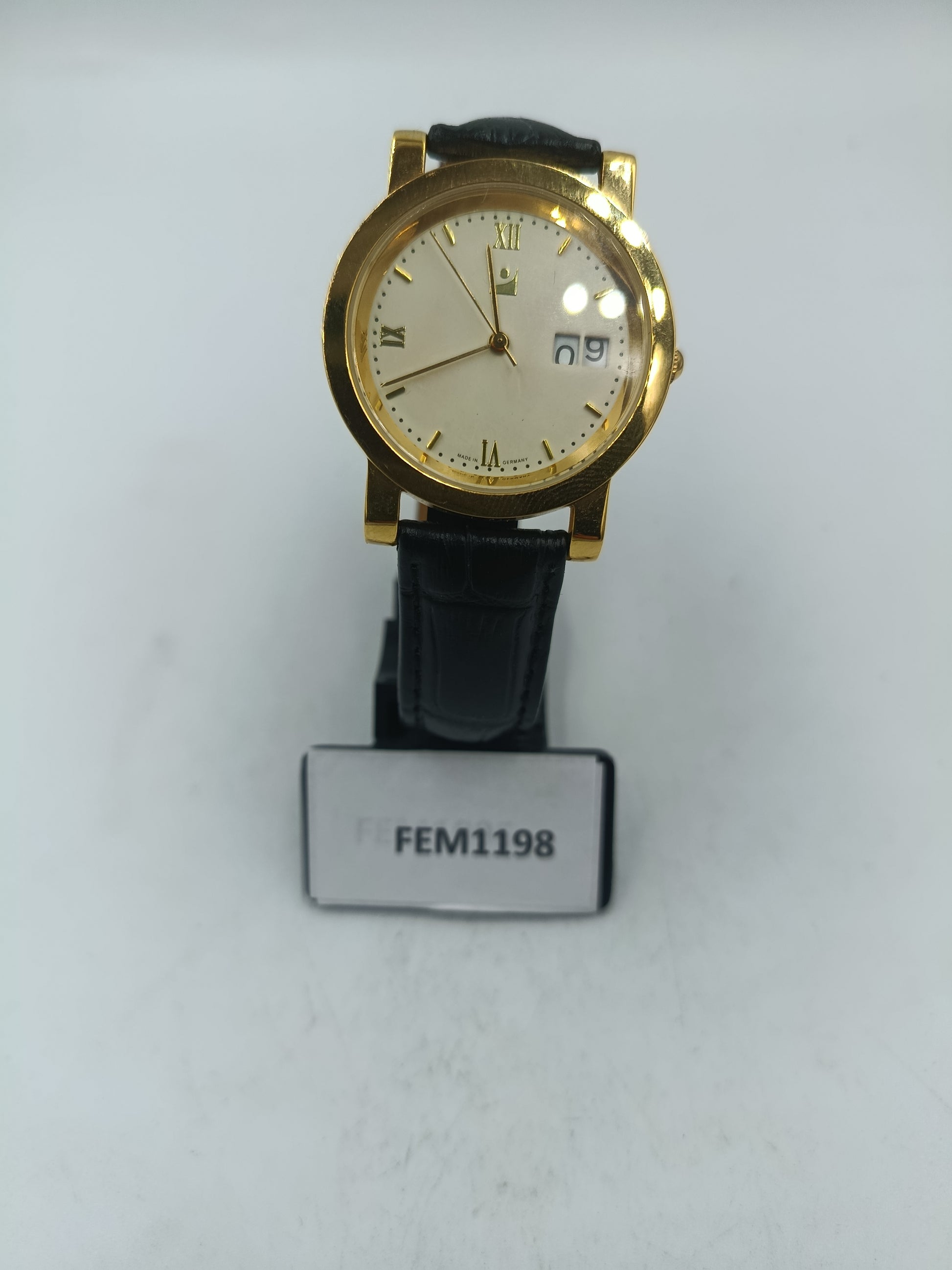 Diese klassische Boliwa Quarzuhr für Herren besticht durch ihr zeitloses Design mit einem eleganten, goldfarbenen Gehäuse und einem traditionellen schwarzen Lederarmband. Das helle Zifferblatt ist mit römischen Ziffern und einer praktischen Datumsanzeige ausgestattet. Diese Uhr ist ein stilvolles Accessoire, das durch sein klassisches Erscheinungsbild und die Artikelnummer FEM1198 identifiziert wird.
