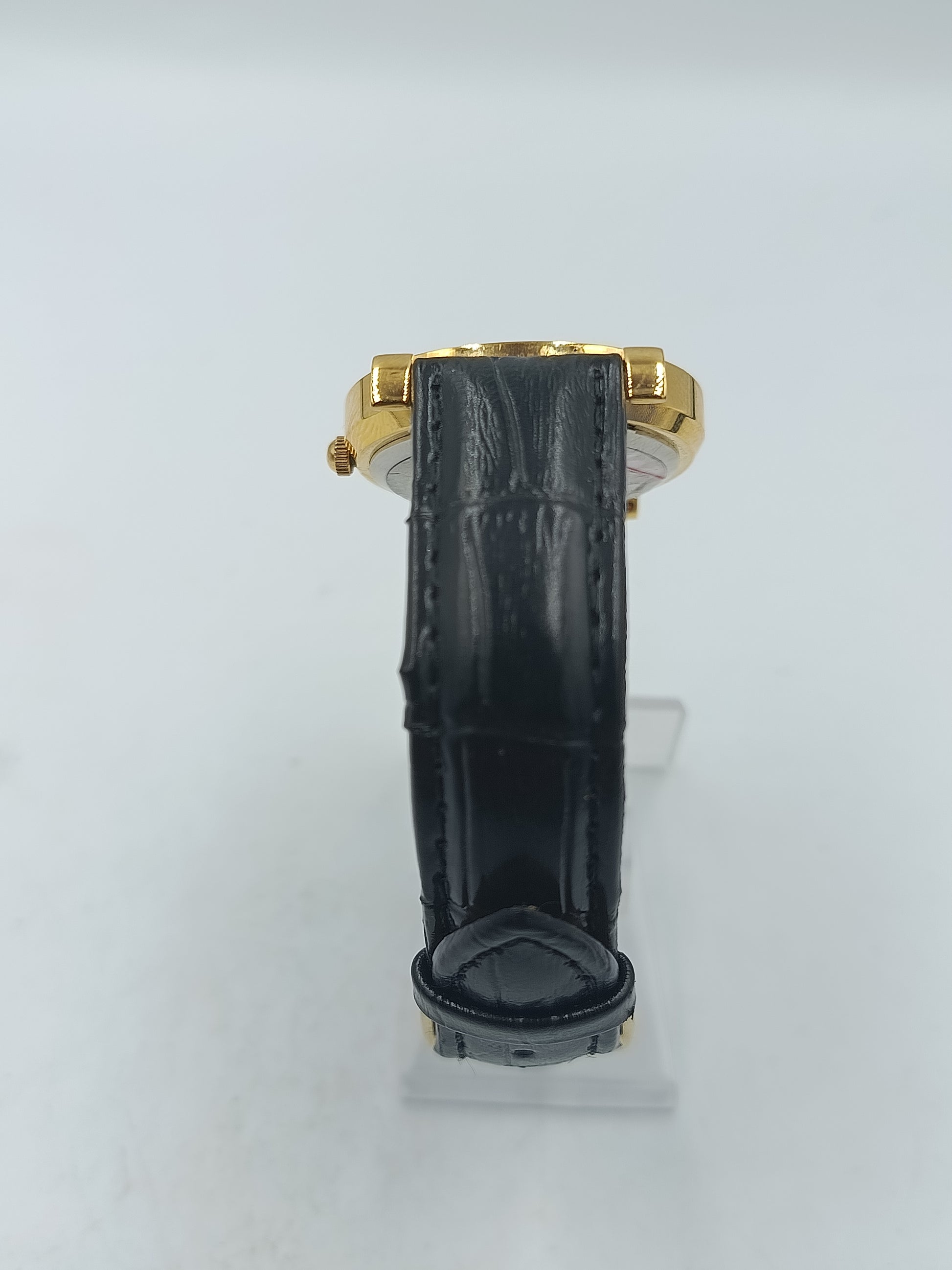 • Material: Metallgehäuse (goldfarben), Lederarmband (schwarz)