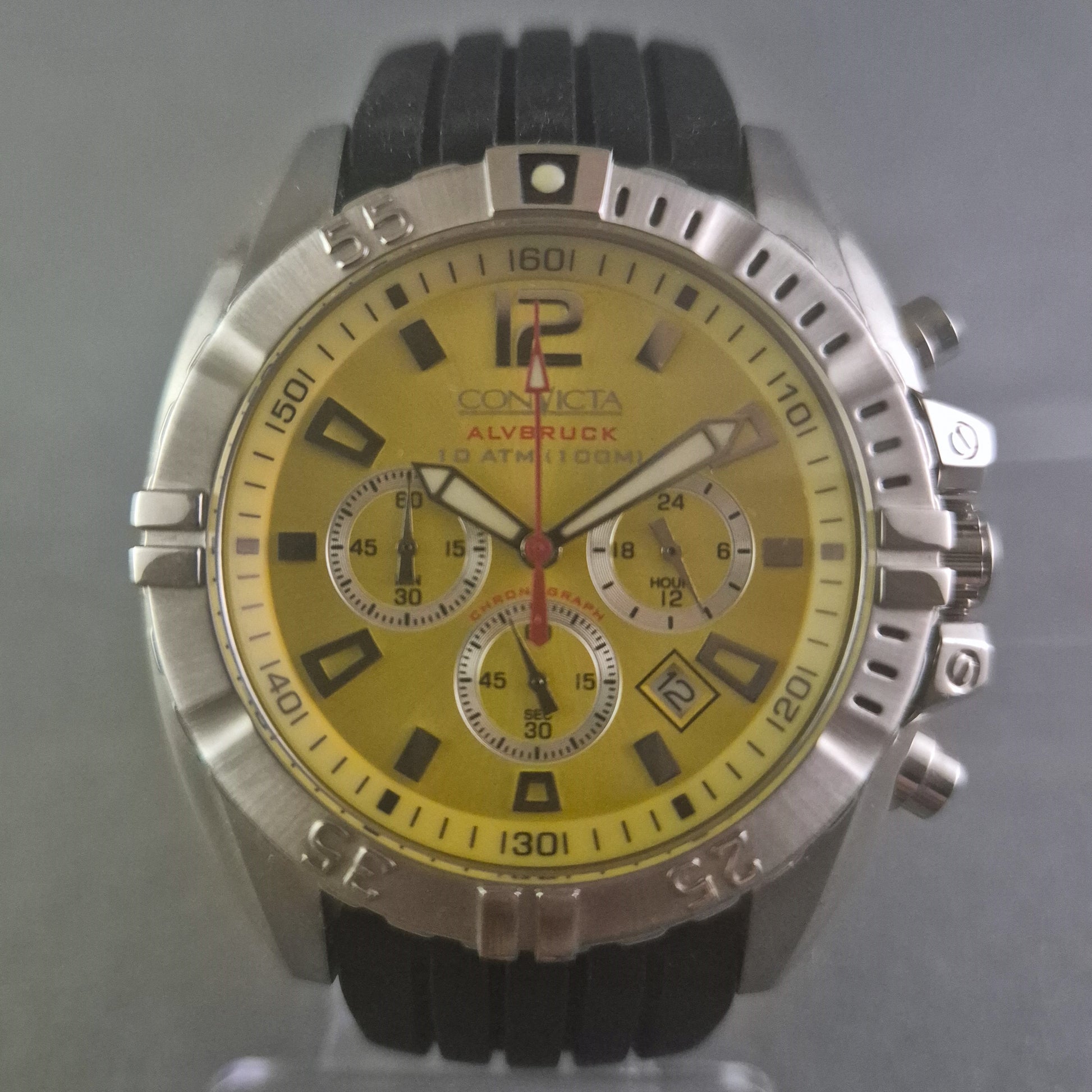 Diese markante Armbanduhr von Convicta Alvbruck ist ein sportlicher Chronograph mit auffälligem gelbem Zifferblatt und robuster Edelstahl-Lünette. Die Uhr verfügt über eine Datumsanzeige, 24-Stunden-Anzeige sowie Stoppfunktionen – perfekt für aktive Träger mit Sinn für Stil. Das schwarze Silikonarmband bietet optimalen Tragekomfort auch bei Bewegung, während das Gehäuse bis zu 10 ATM wasserdicht ist – ideal für Freizeit, Sport und Alltag.