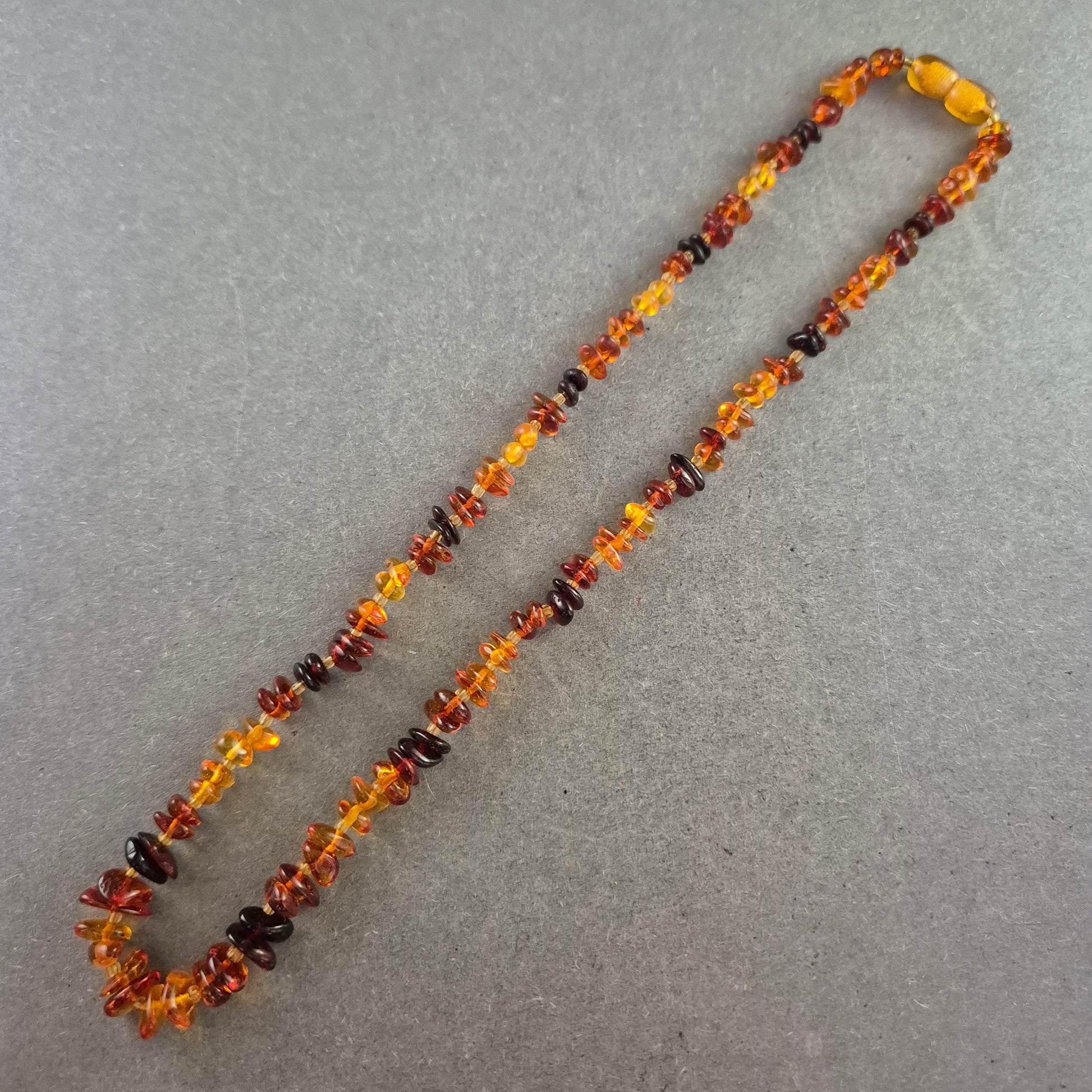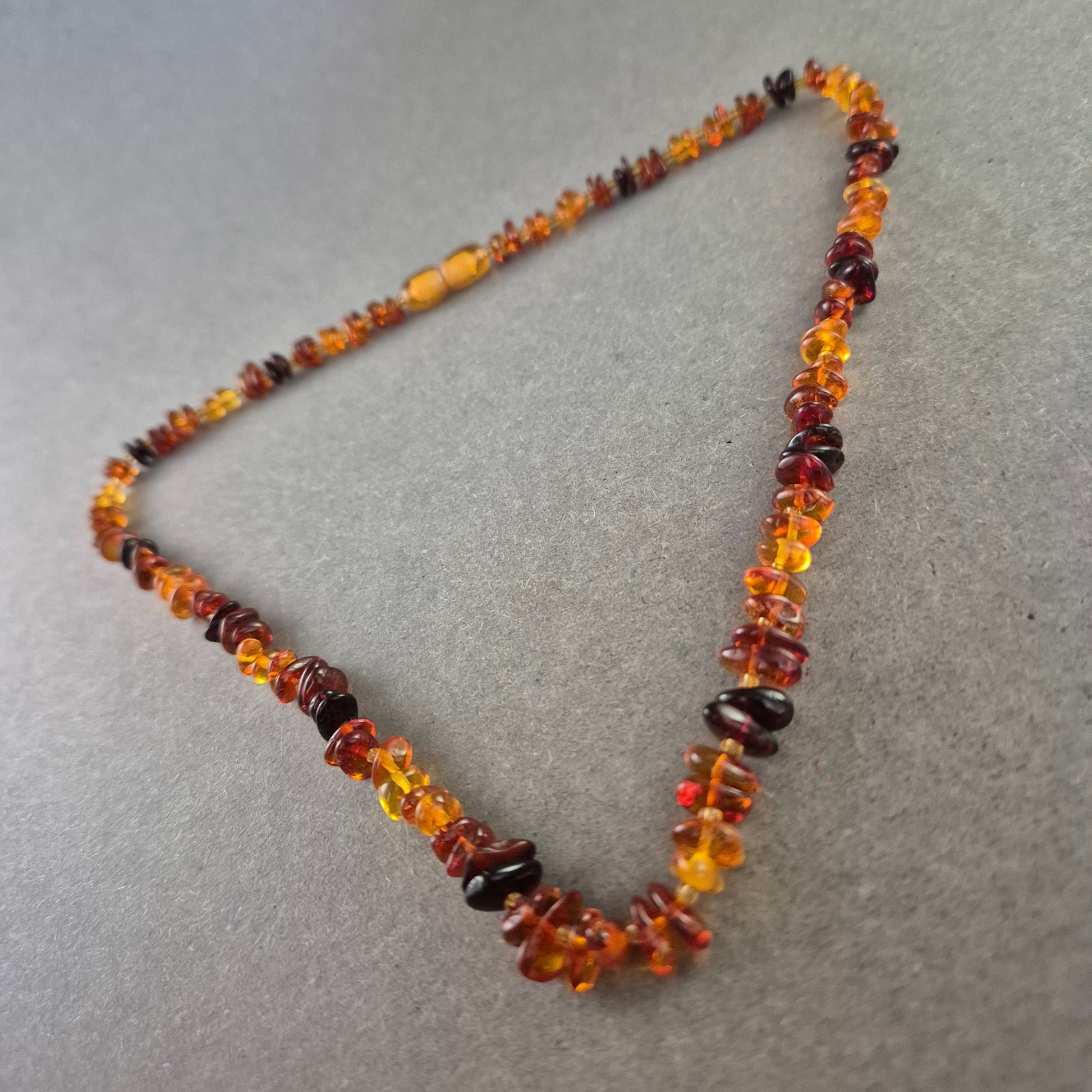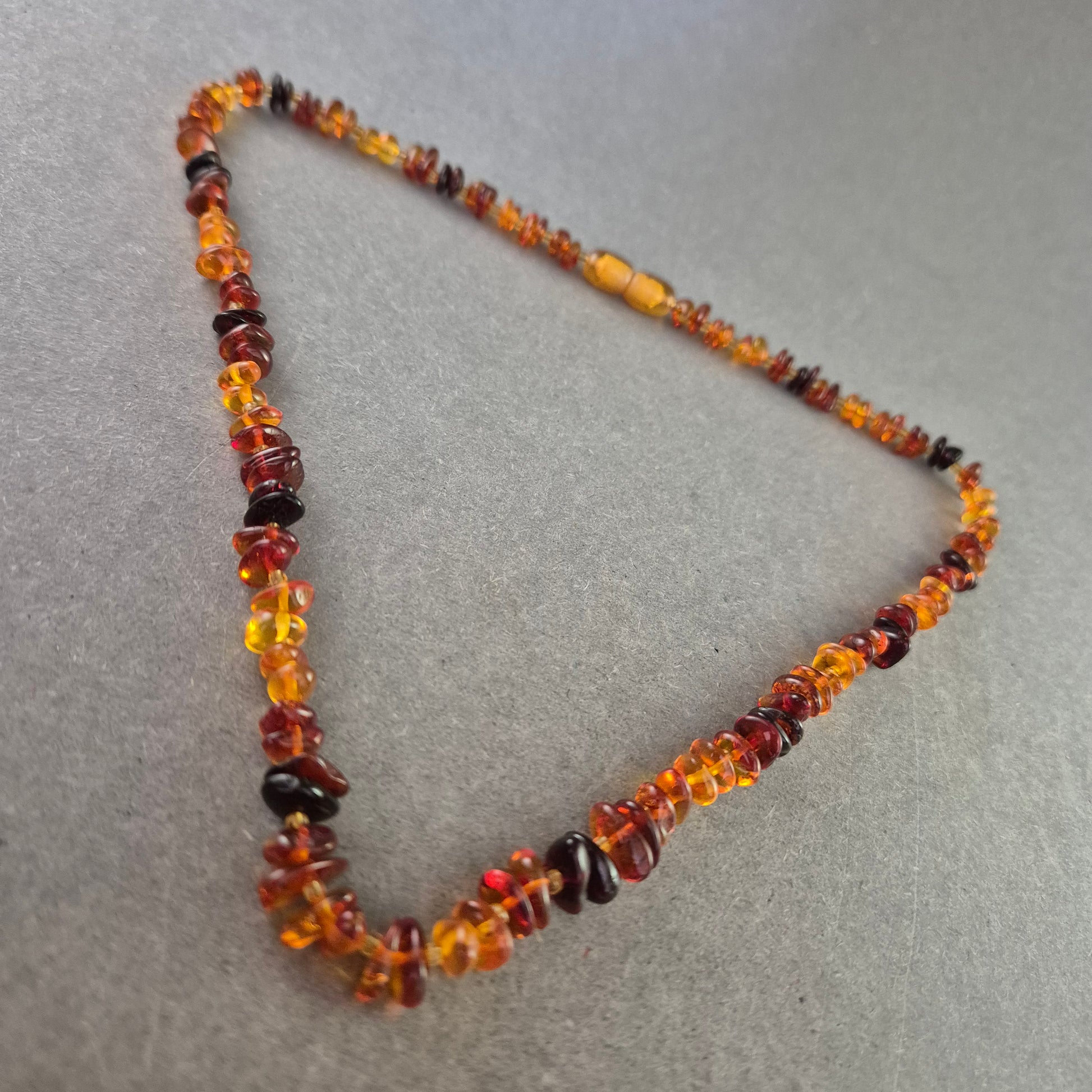 Diese stilvolle Halskette überzeugt mit kunstvoll gefertigten Perlen in Bernsteinoptik. Die unregelmäßig geformten Elemente in warmen Braun-, Cognac- und Honigfarben verleihen ihr eine natürliche Ausstrahlung. Durch ihren leichten Kunststoffverschluss ist sie bequem zu tragen und ideal als Accessoire für Alltag und Freizeit geeignet.