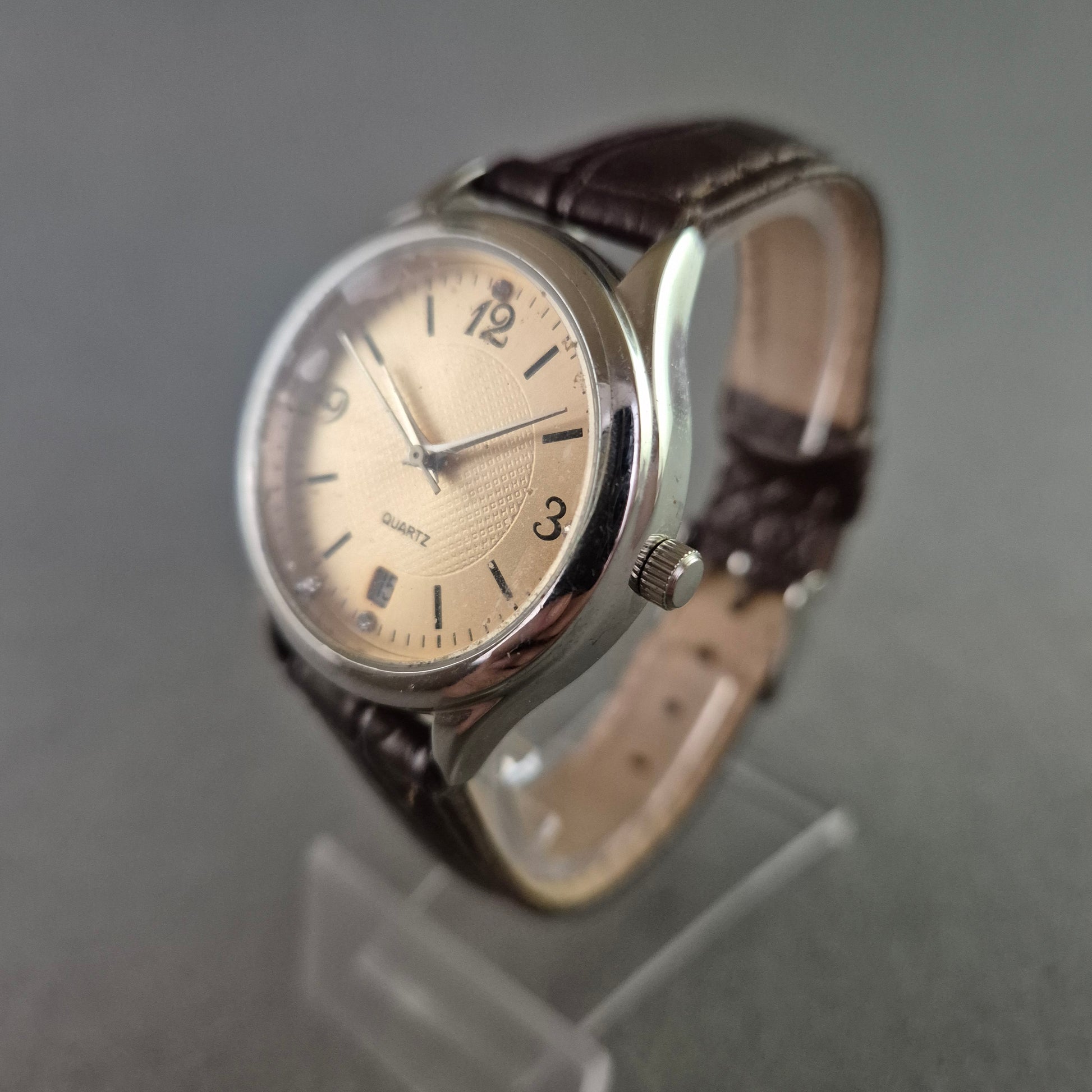 Diese klassische Herrenarmbanduhr kombiniert ein schlichtes Zifferblatt in Champagnergold mit einem eleganten braunen Armband in Lederoptik. Dezente Glitzersteine an den Hauptpositionen und eine praktische Datumsanzeige machen diese Uhr zu einem funktionalen Alltagsbegleiter. Der Gehäuseboden trägt eine dekorative Gravur („JK“), die jedoch keine Markenangabe darstellt.