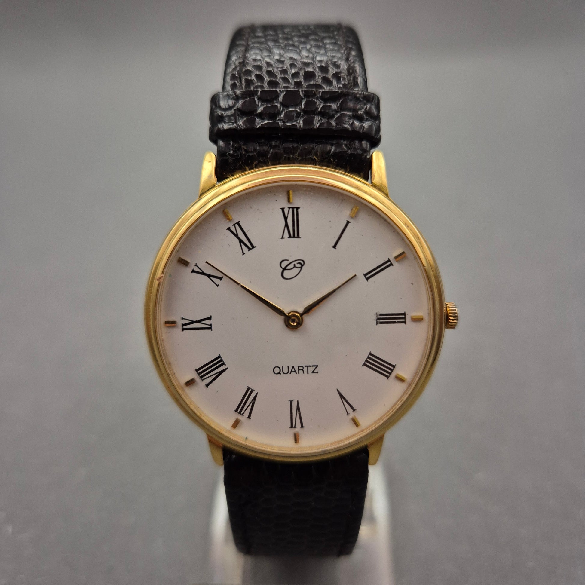 Diese klassische Herren Uhr überzeugt durch ihr edles, zeitloses Design mit einem schlanken goldfarbenen Gehäuse und einem weißen Zifferblatt mit römischen Ziffern. Das schwarze Armband in Lederoptik mit Reptilstruktur unterstreicht den eleganten Vintage-Charakter der Uhr. Ein idealer Begleiter für Herren mit einem Sinn für Stil und Understatement.