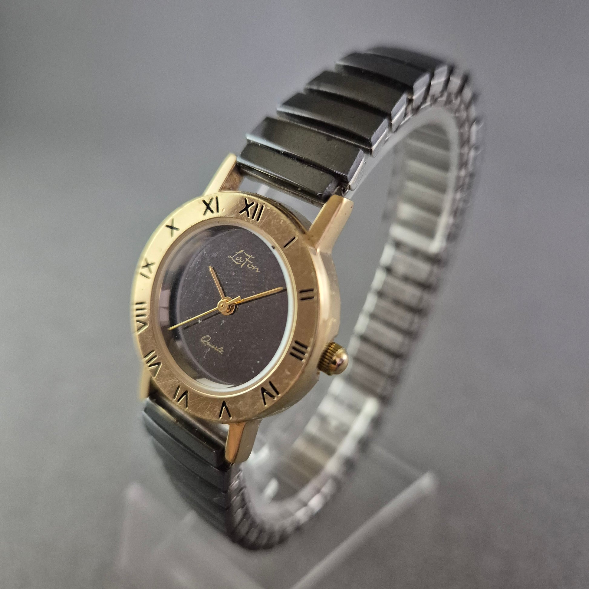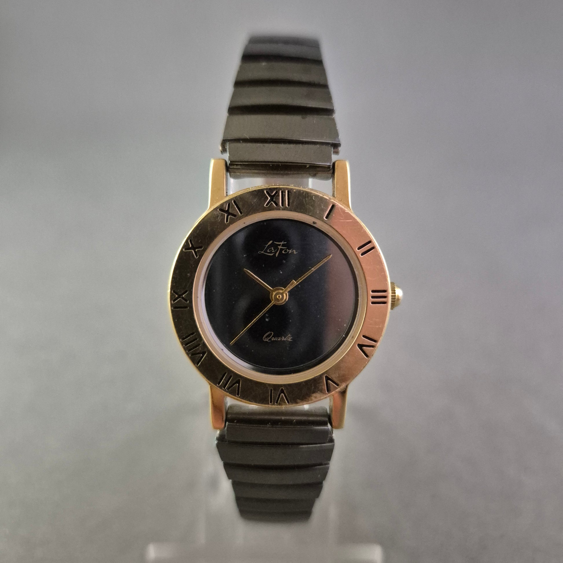 Diese stilvolle Damen Uhr der Marke LeTon überzeugt durch ihr harmonisches Design aus Schwarz und Gold. Das runde Gehäuse mit goldfarbener Lünette und römischen Ziffern verleiht der Uhr eine klassische Note, während das schwarze Stretcharmband für hohen Tragekomfort sorgt. Das minimalistische schwarze Zifferblatt mit goldenen Zeigern rundet den eleganten Look ab – perfekt für den Alltag oder besondere Anlässe.