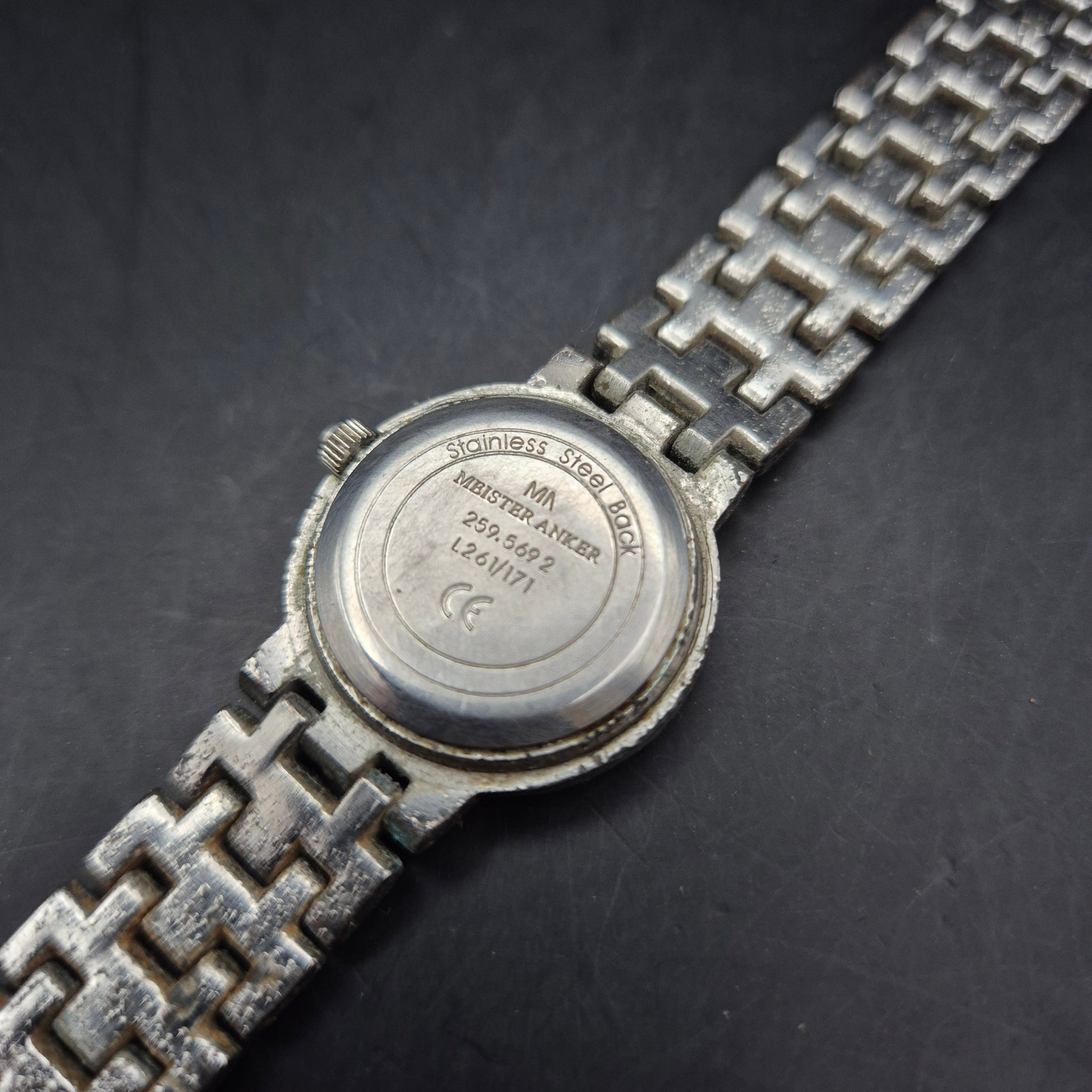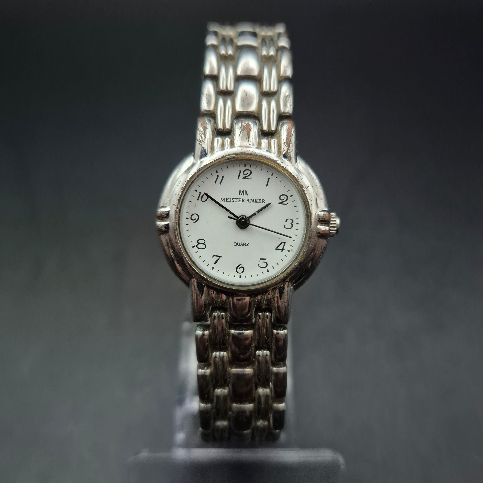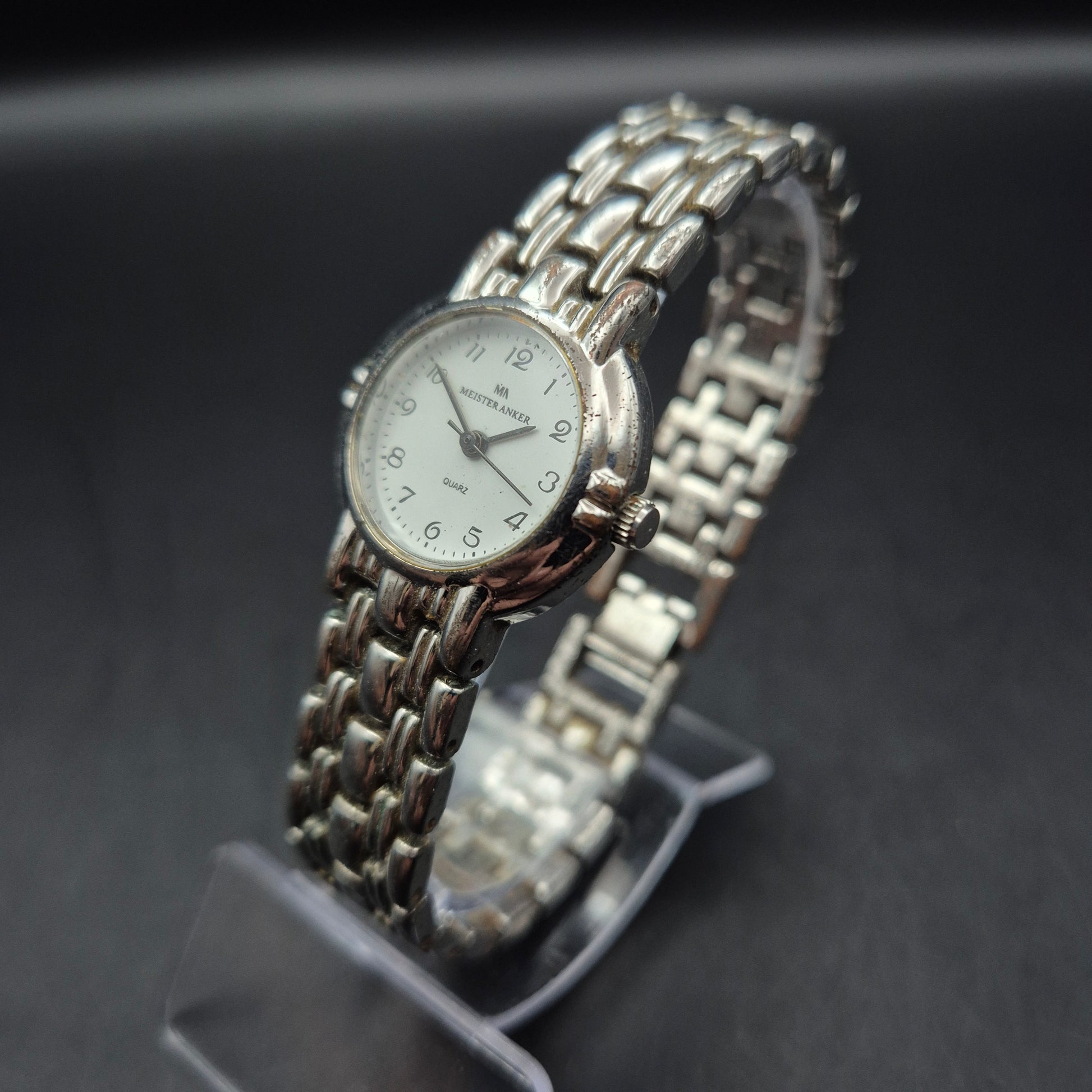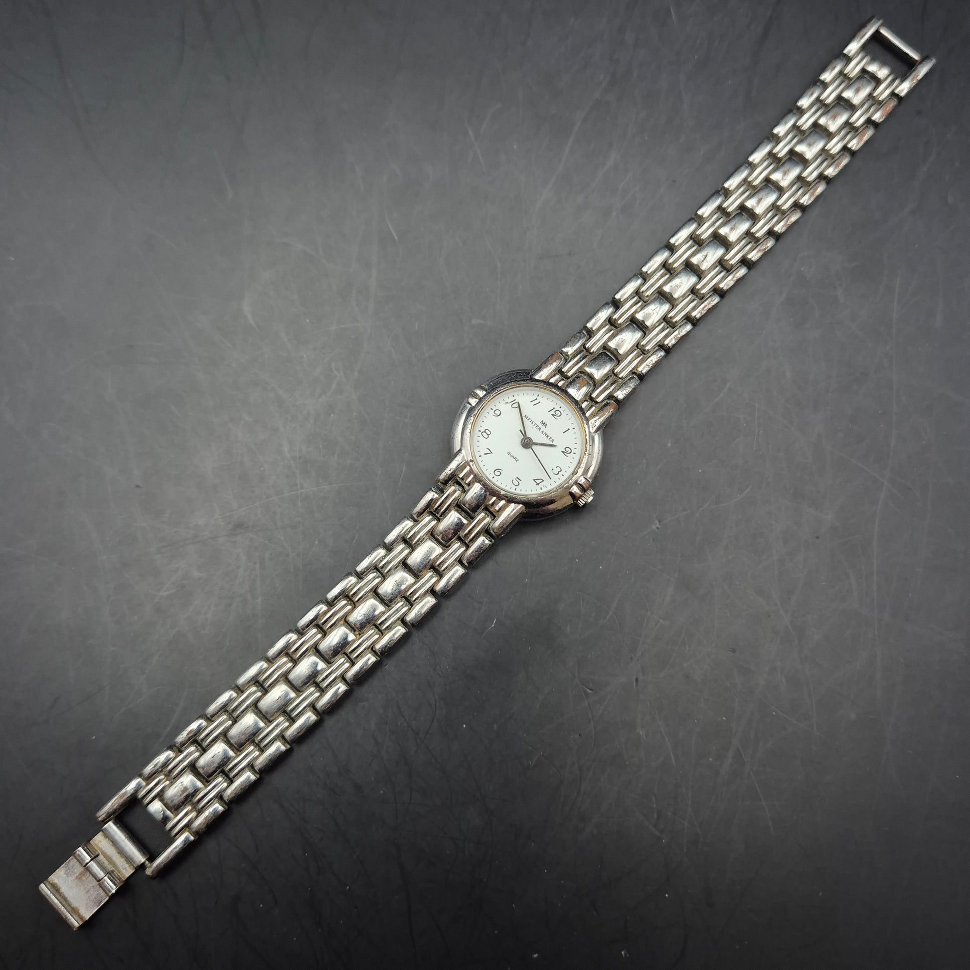 Diese elegante Damen Uhr der Marke Meister Anker überzeugt durch ihr klassisches Design mit einem schlichten weißen Zifferblatt und feinen schwarzen Ziffern. Das silberfarbene Edelstahlarmband im Gliederstil sorgt für eine stilvolle Optik und sicheren Sitz. Die Uhr eignet sich perfekt für den Alltag, aber auch als dezentes Accessoire zu formellen Outfits. Gebrauchsspuren am Armband verleihen ihr einen authentischen Vintage-Charakter.