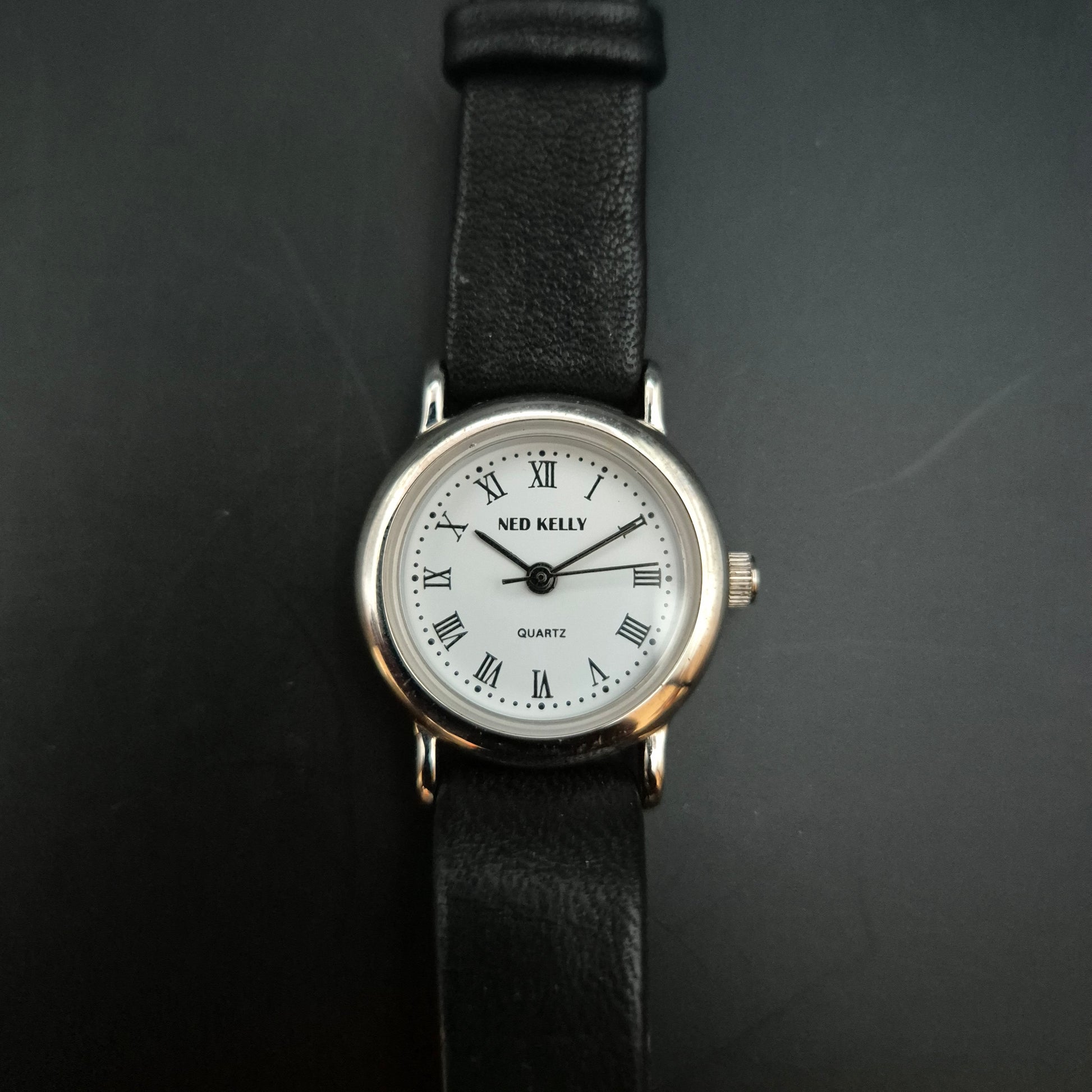 Diese Ned Kelly Damen Uhr besticht durch ihr klassisches Design mit einem weißen Zifferblatt und römischen Ziffern. Das runde Gehäuse in silberfarbener Ausführung wird durch ein schwarzes Lederarmband ergänzt, das für schlichte Eleganz und angenehmen Tragekomfort sorgt. Eine zeitlose Quarzuhr für Liebhaberinnen traditioneller Armbanduhren.
