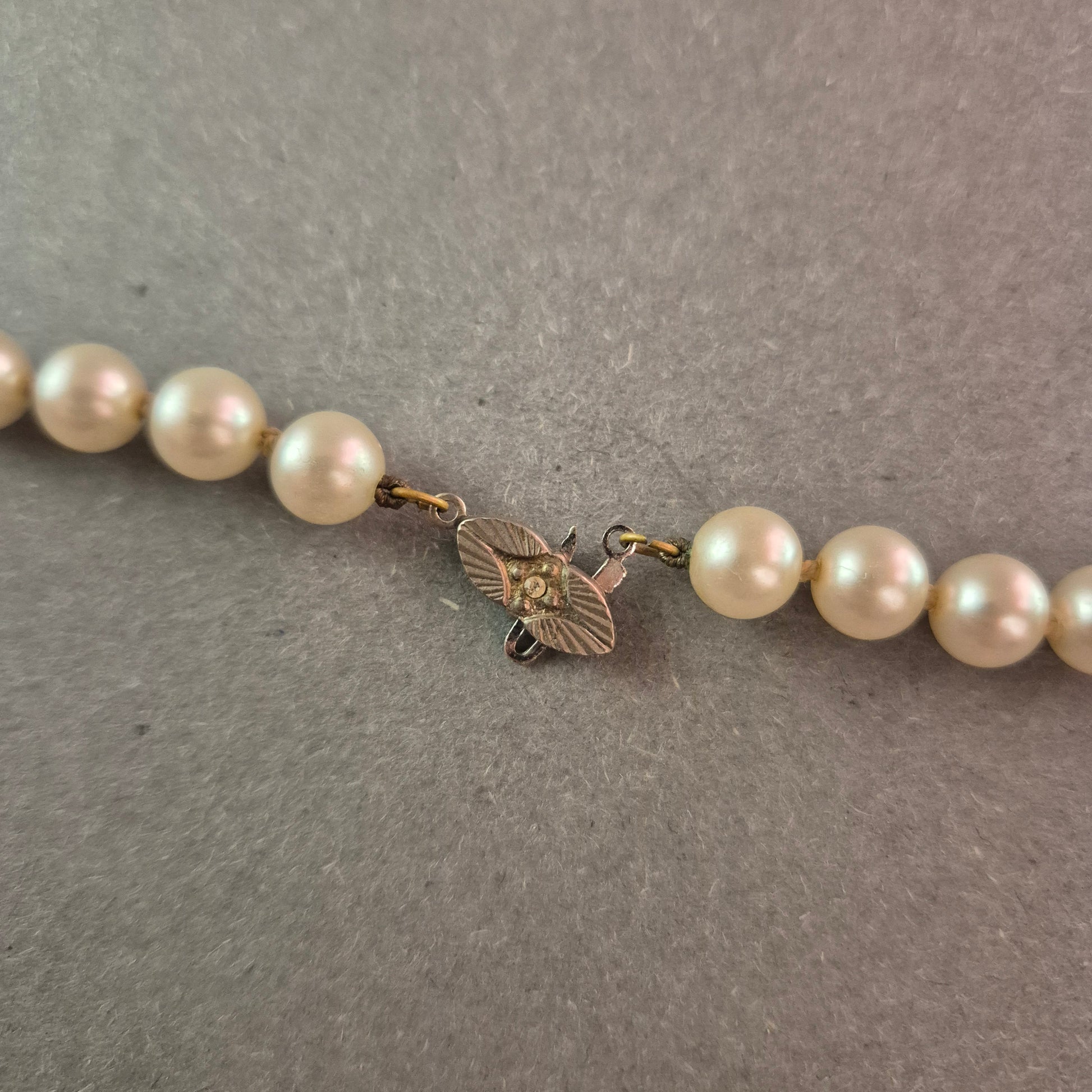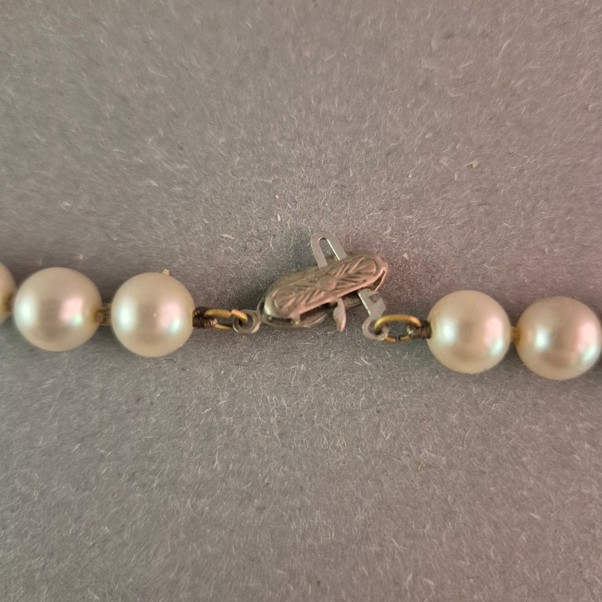 Diese stilvolle Perlenkette verleiht jedem Outfit eine edle Note. Die gleichmäßig runden, cremeweißen Perlen strahlen eine dezente Eleganz aus, während der verzierte Metallverschluss den Vintage-Charakter dieses Schmuckstücks unterstreicht. Perfekt für besondere Anlässe oder als stilvolles Accessoire für den Alltag.