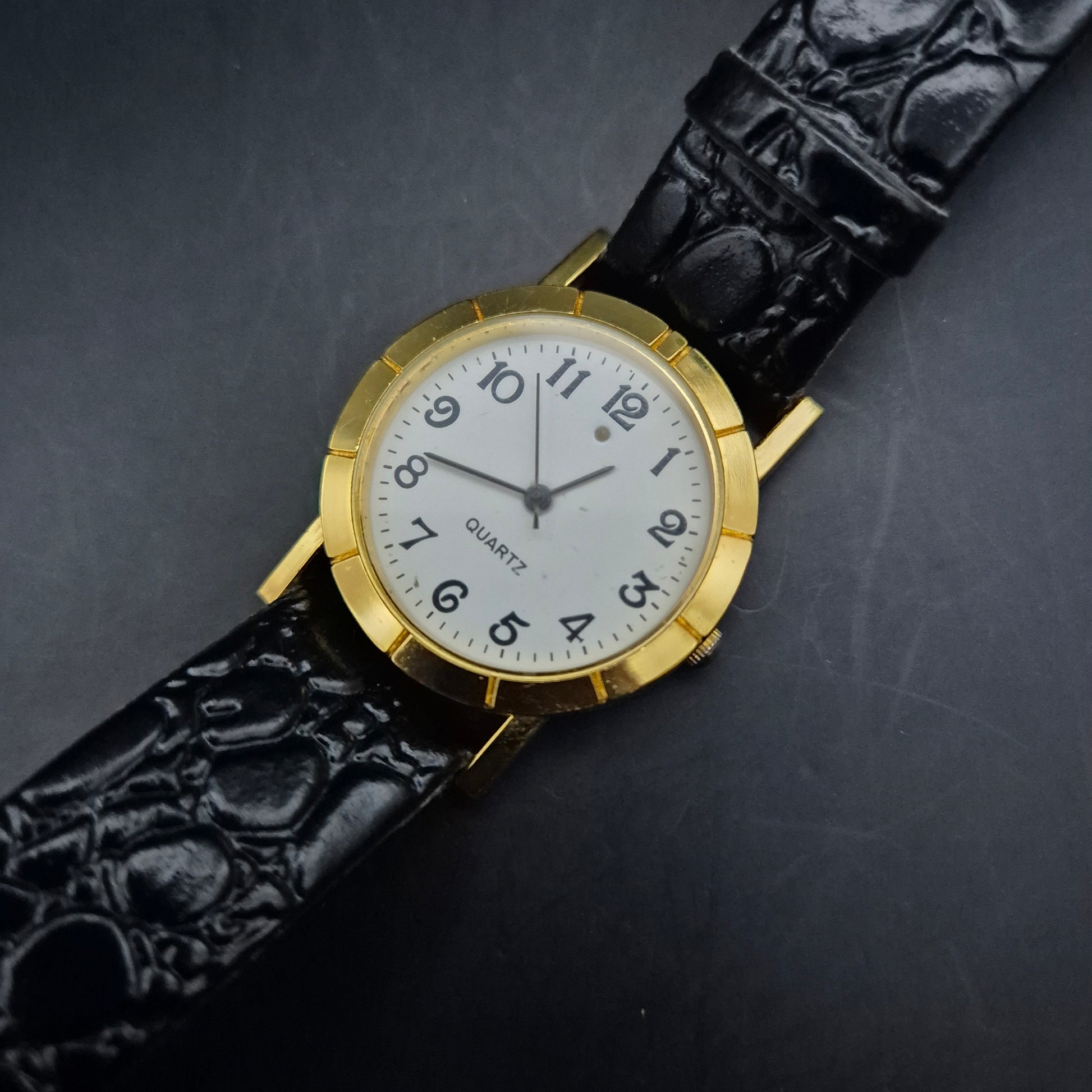 Klassische Quarz Damen Uhr – Goldfarbenes Gehäuse mit schwarzem Lederarmband