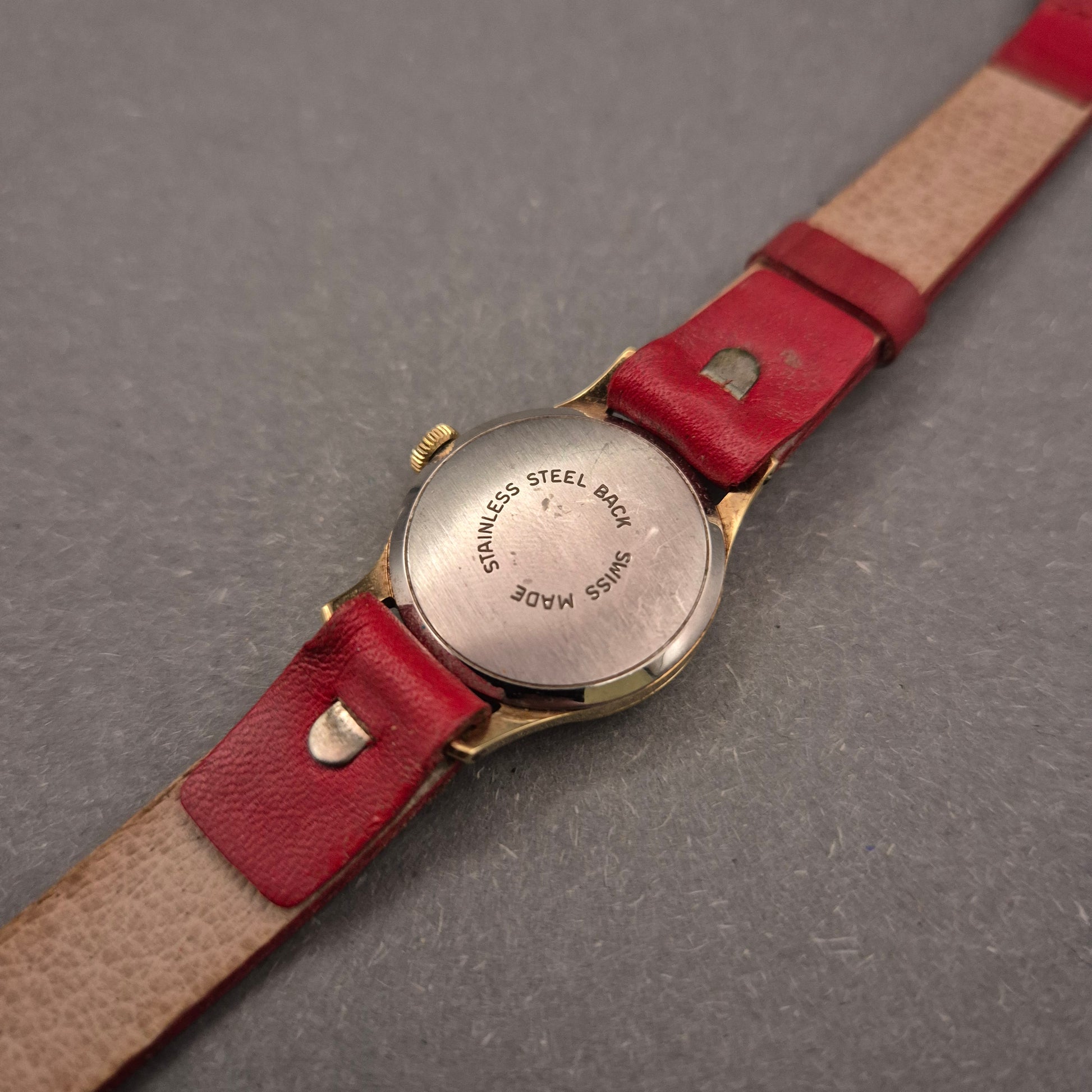 Diese klassische Roamer Damen Uhr verkörpert zeitlose Eleganz und Schweizer Uhrmacherkunst. Das vergoldete Gehäuse harmoniert perfekt mit dem silberfarbenen Zifferblatt und dem markanten roten Lederarmband. Die Uhr besitzt ein mechanisches Werk mit kleiner Sekunde bei 6 Uhr und ist ideal für Liebhaberinnen traditioneller Armbanduhren mit Vintage-Charme.
