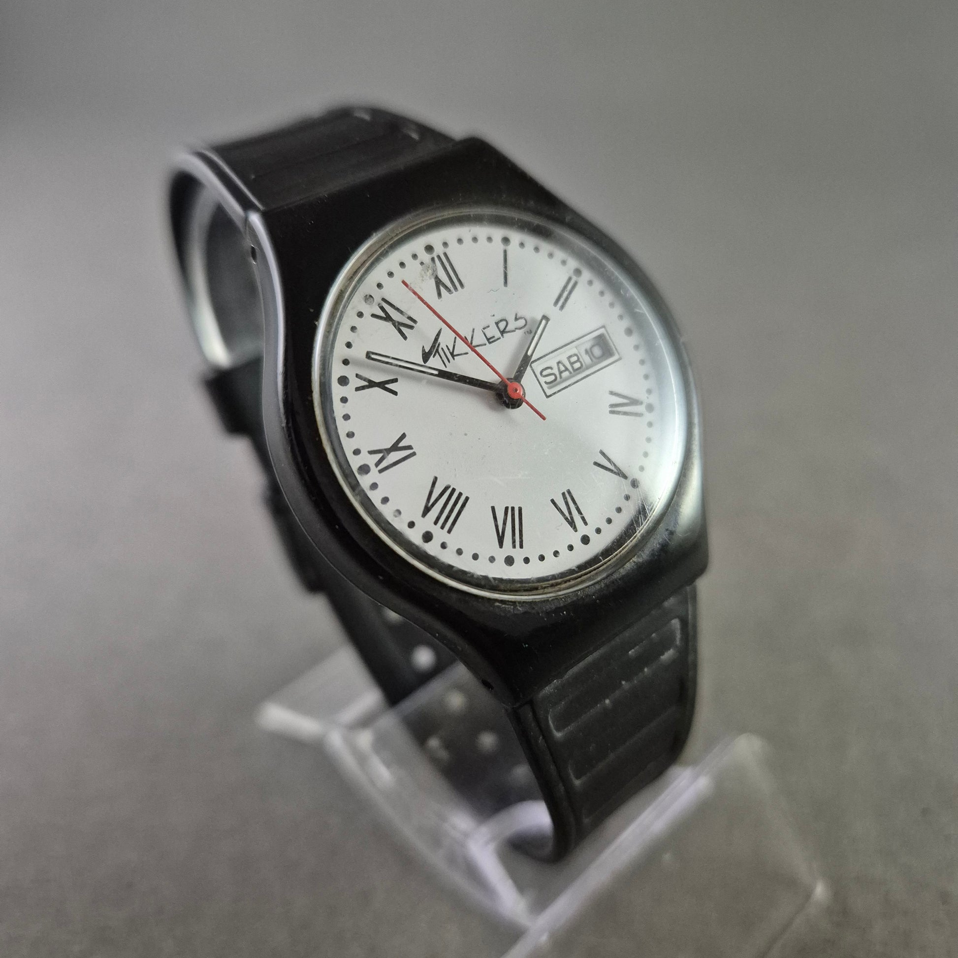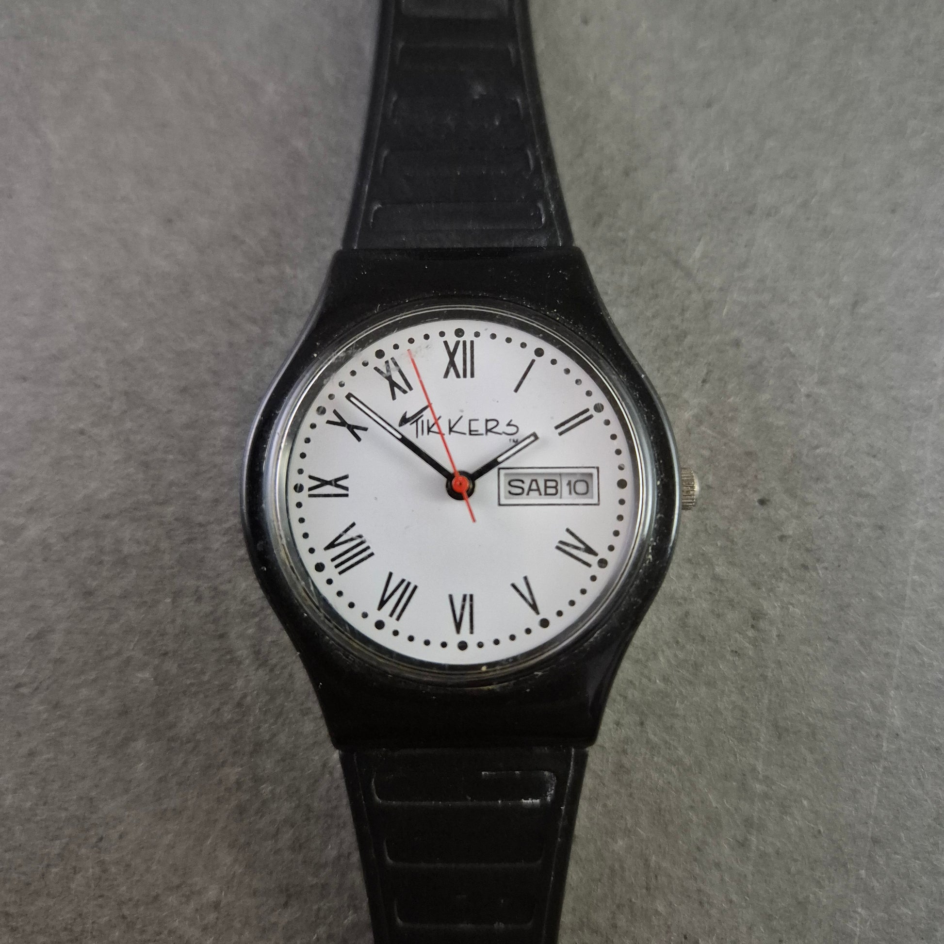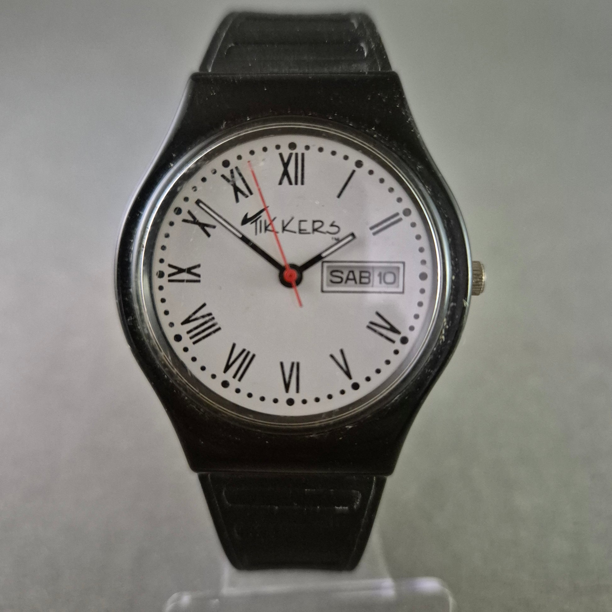 Diese Tikkers Herrenarmbanduhr kombiniert klassische Eleganz mit funktionalem Design. Das weiße Zifferblatt mit römischen Ziffern sorgt für eine traditionelle Optik, während das schwarze Kunststoffgehäuse und -armband für einen sportlichen Touch sorgen. Die Uhr verfügt über eine praktische Tages- und Datumsanzeige auf Spanisch ("SAB" = Samstag), was sie zu einem interessanten Begleiter für den Alltag macht.
