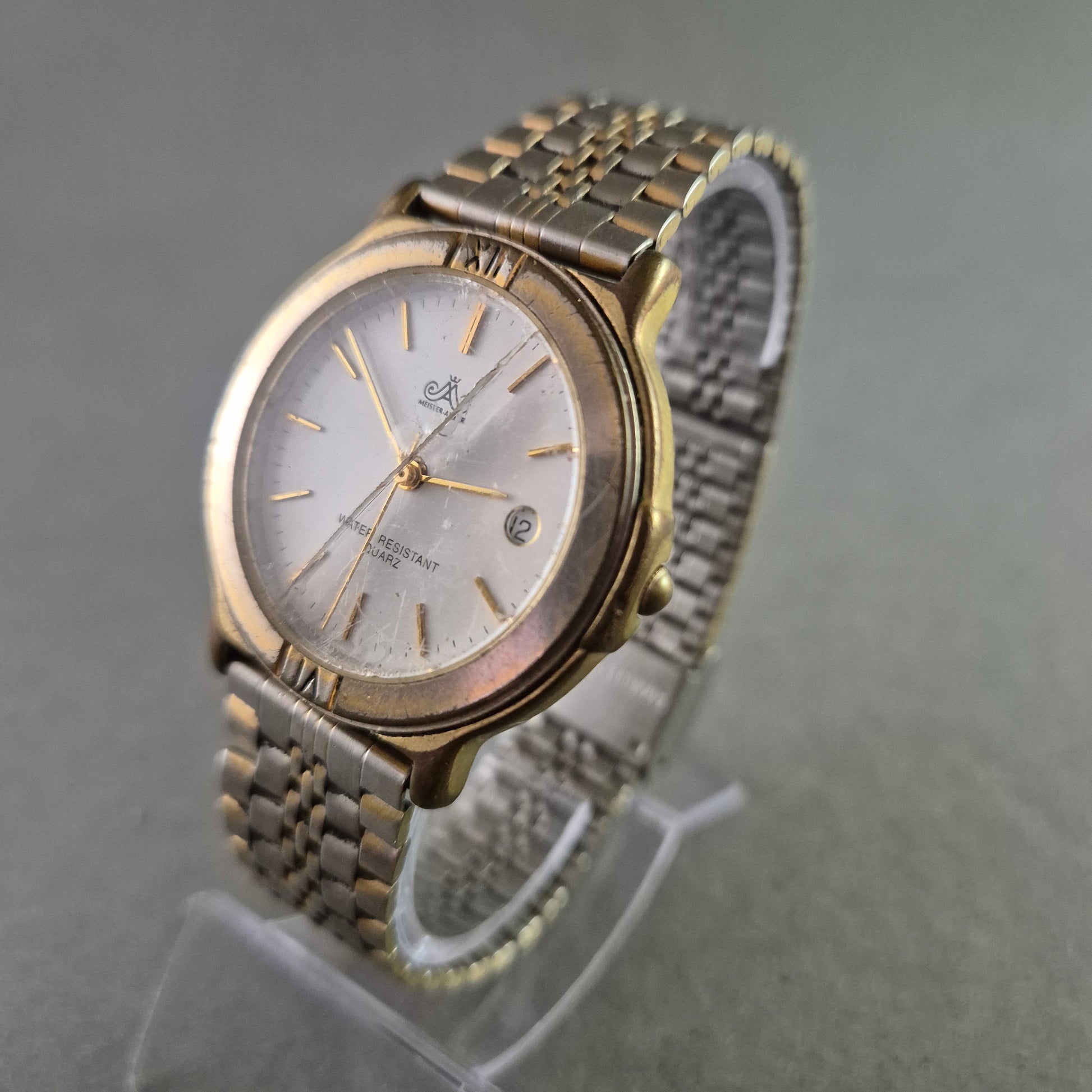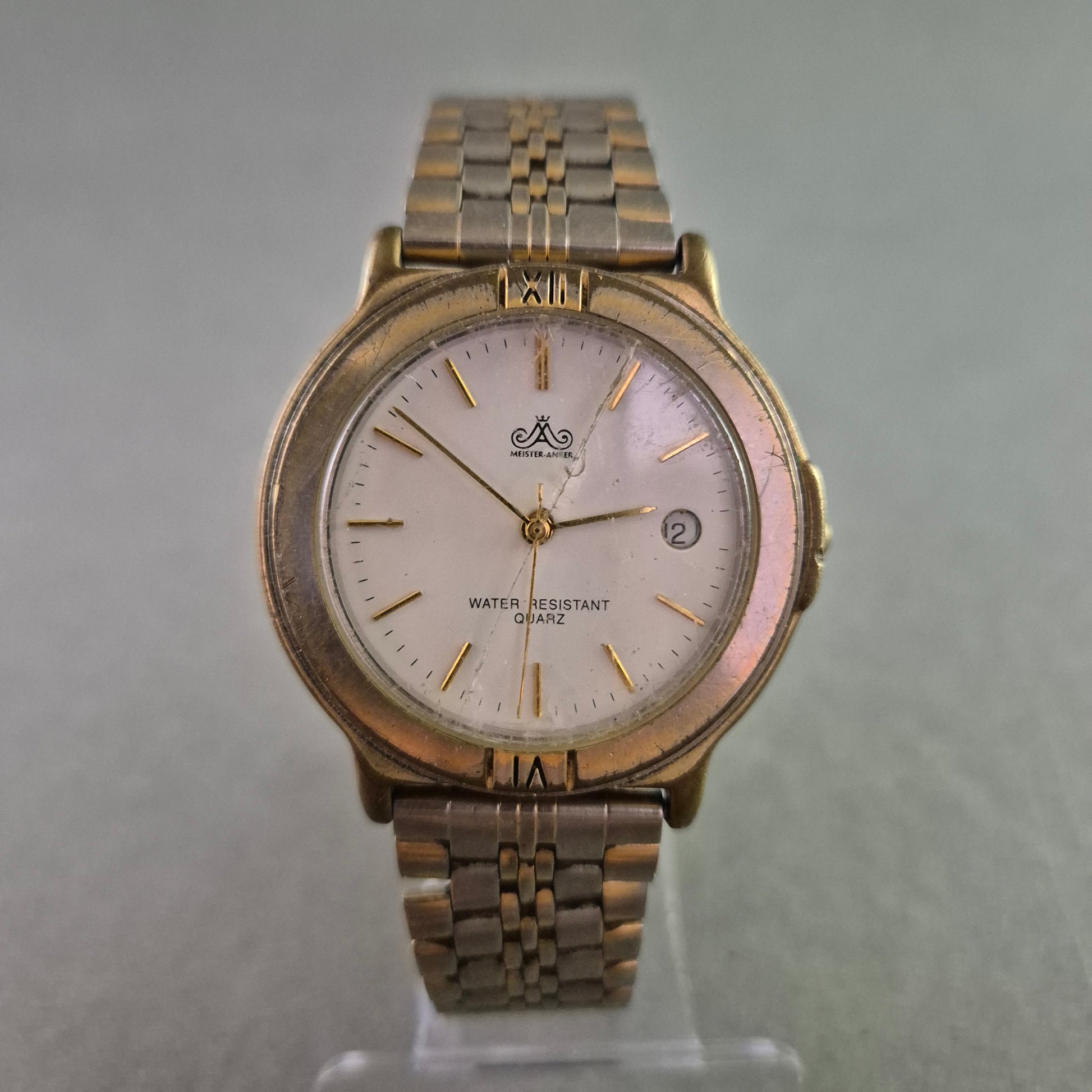 Diese vielseitige Unisex Uhr der Marke Meister Anker verbindet klassisches Design mit praktischen Funktionen. Das goldfarbene Gehäuse und das elegante Bicolor-Metallgliederarmband schaffen einen ansprechenden Kontrast. Das klare weiße Zifferblatt mit goldenen Indizes und Zeigern sowie einem praktischen Datumsfenster bei 3 Uhr sorgt für eine optimale Ablesbarkeit und eine zeitlose Ästhetik. Eine zuverlässige und wasserresistente Uhr für den täglichen Gebrauch.