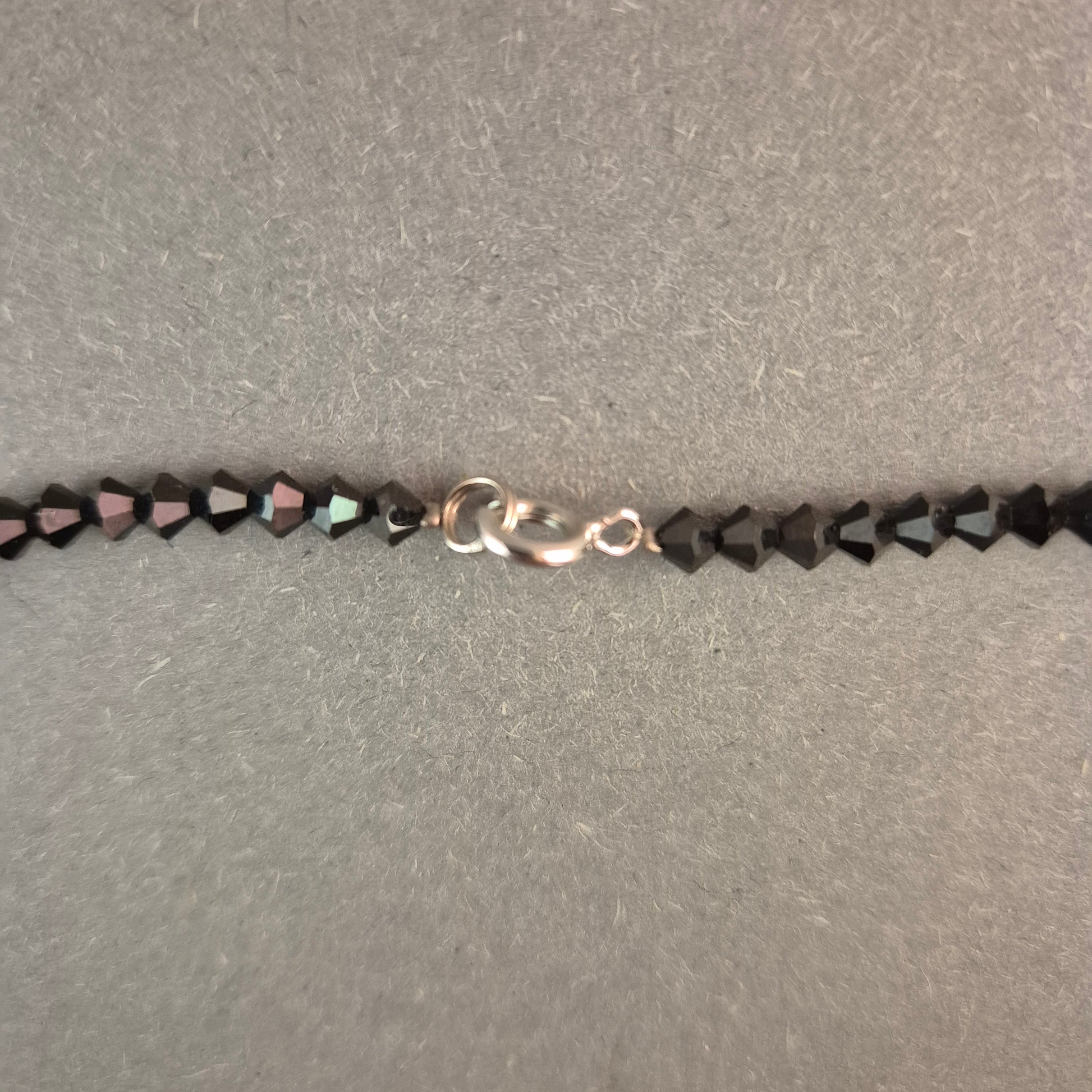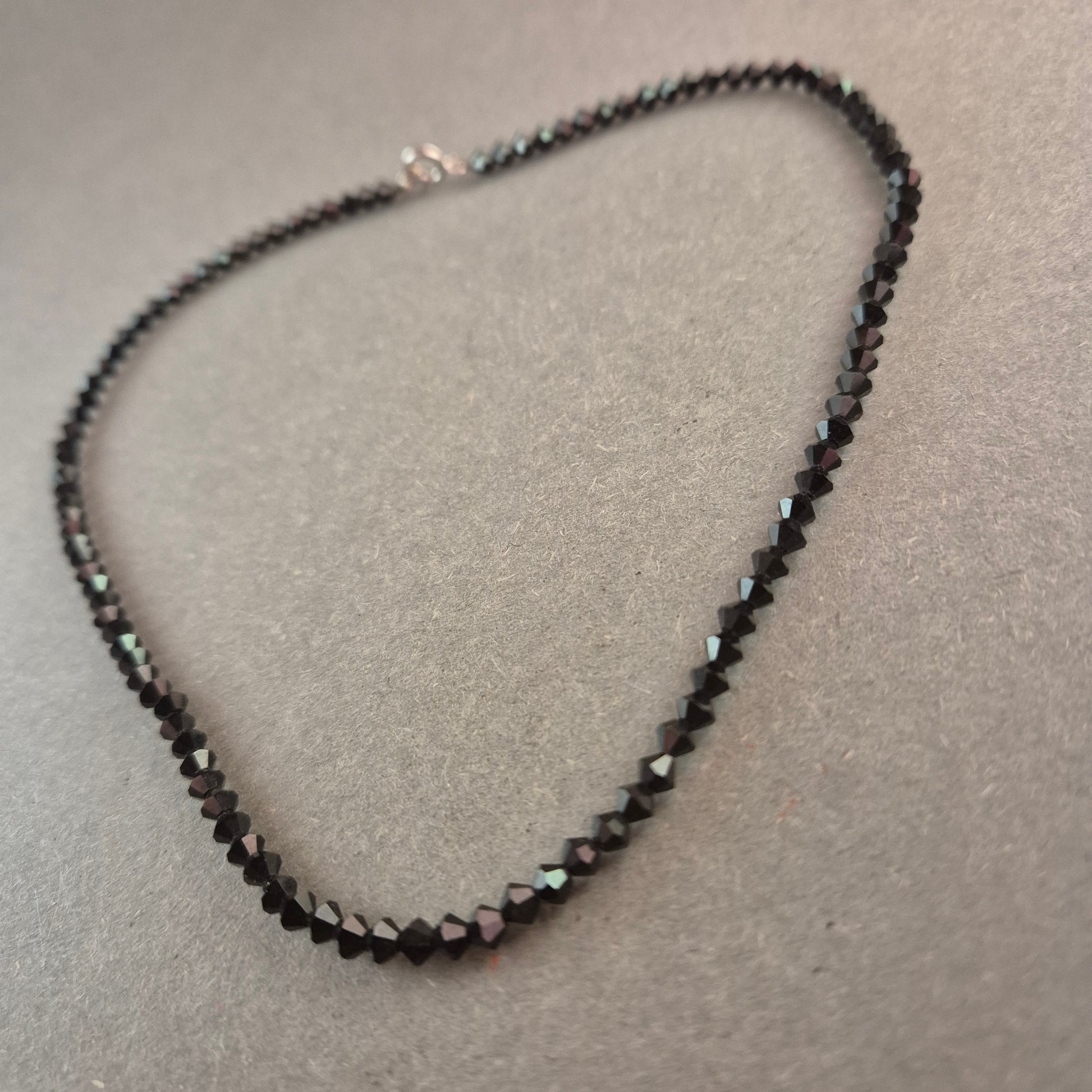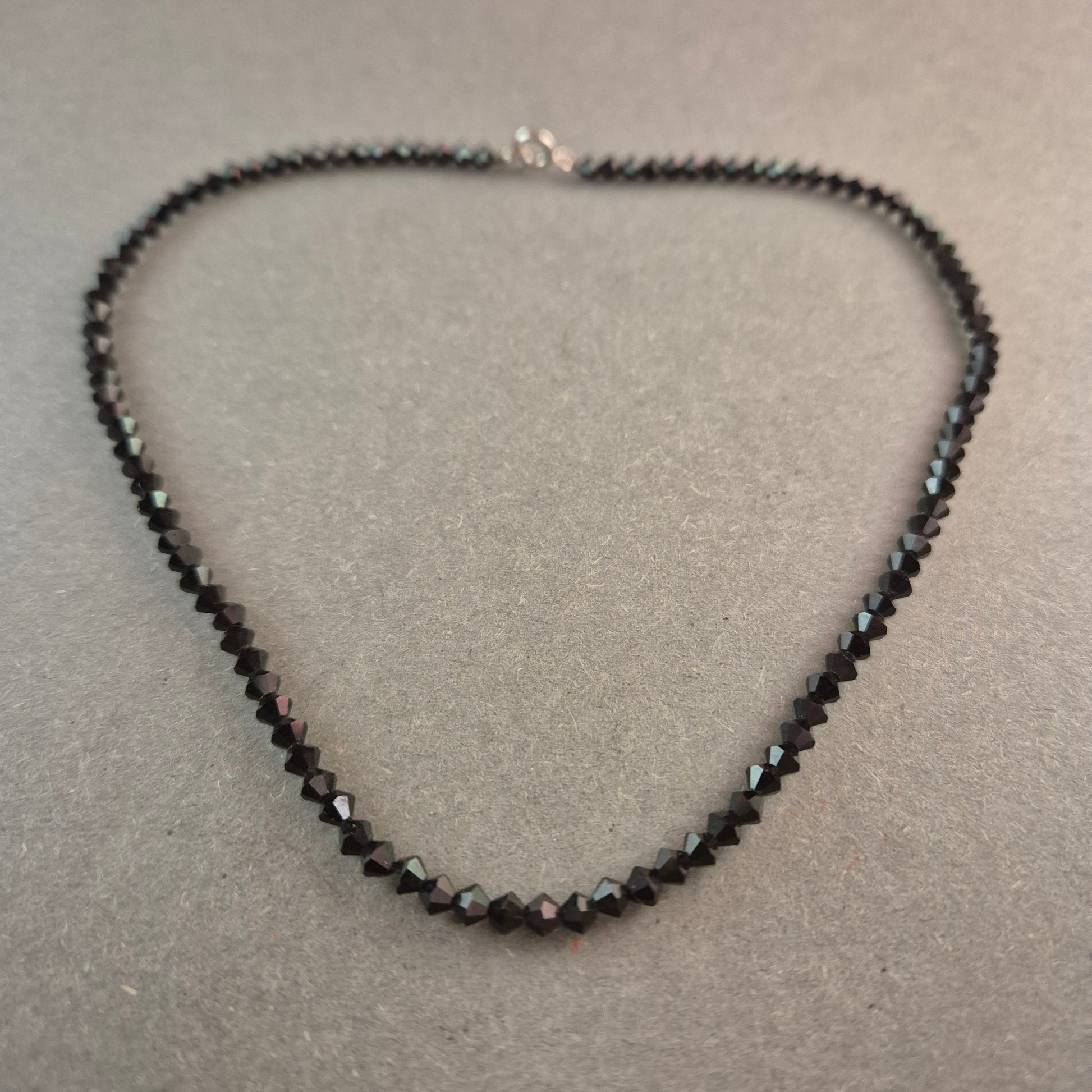 Diese feine Vintage-Kette aus facettierten schwarzen Glasperlen besticht durch ihre schlichte Eleganz und funkelnde Lichtreflexe. Die geschliffenen Perlen verleihen dem Schmuckstück eine edle Ausstrahlung und machen es zu einem vielseitigen Begleiter – sowohl für festliche Anlässe als auch für stilvolle Alltagslooks. Ein silberfarbener Federringverschluss sorgt für sicheren Halt.