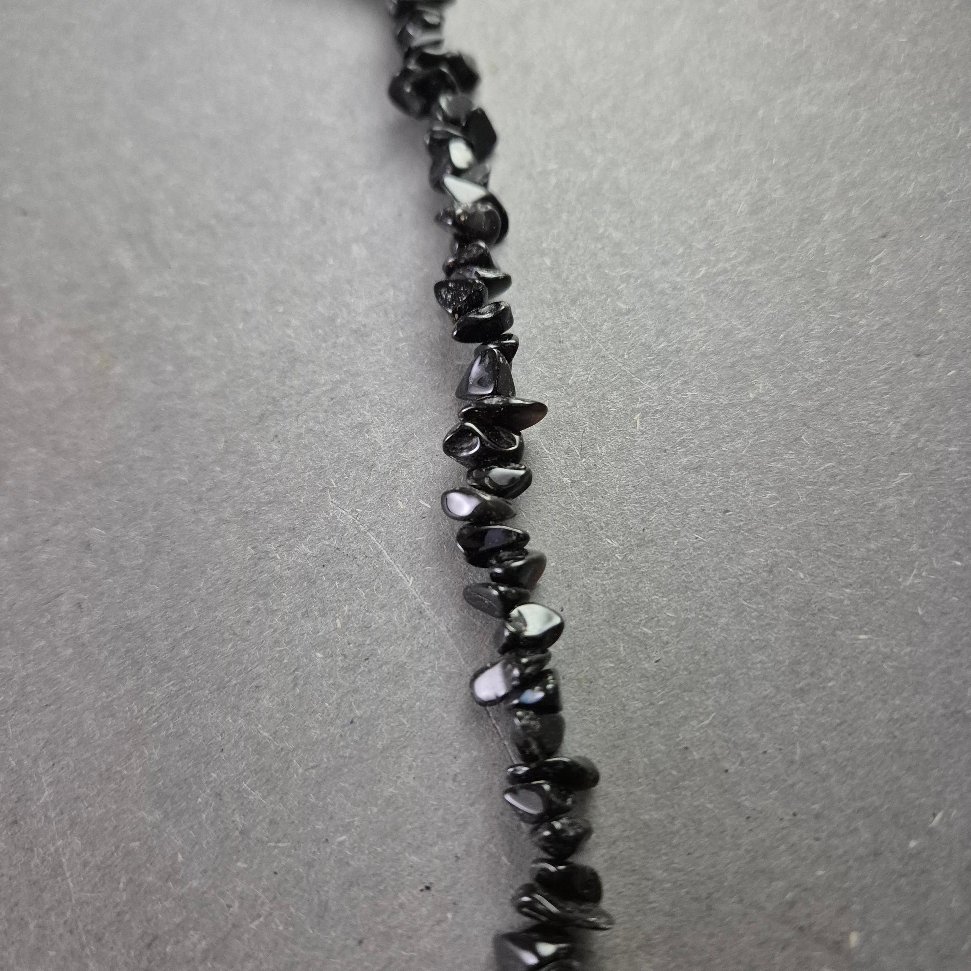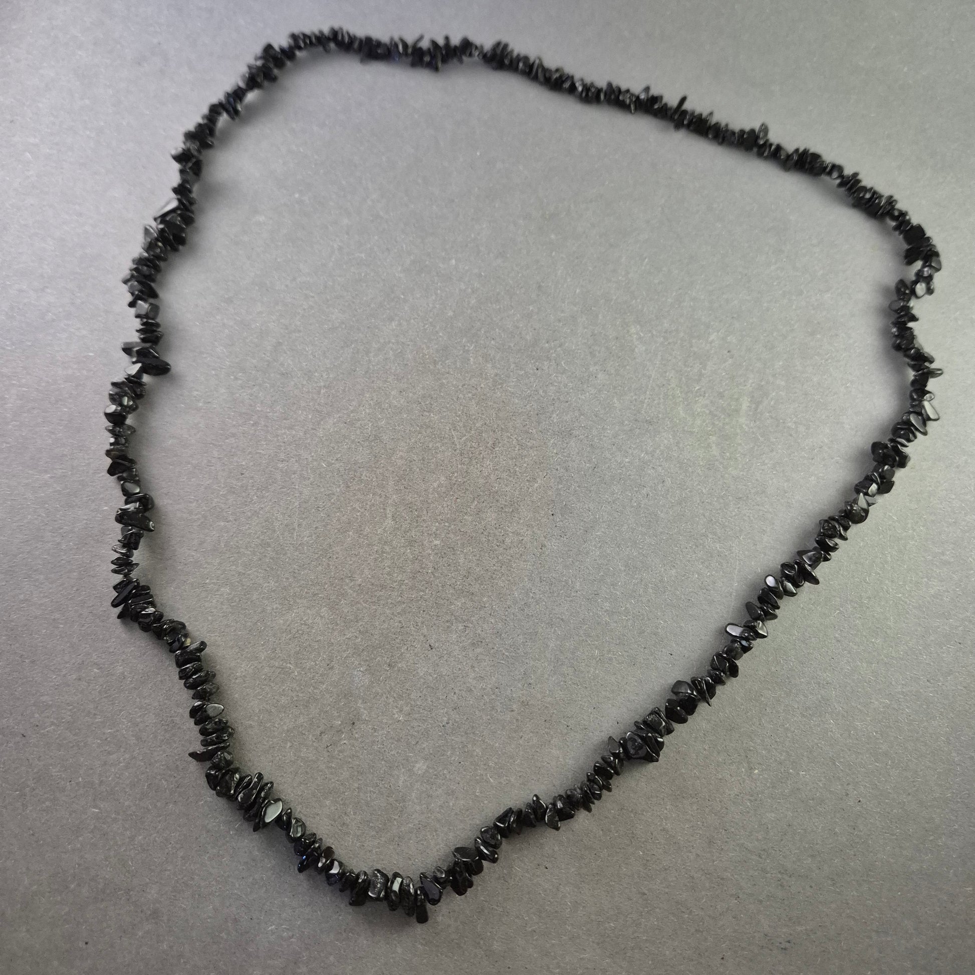 Eine feine und doch auffällige Halskette, besetzt mit zahlreichen kleinen, unregelmäßig geformten schwarzen Kristall-Splittern. Das rohe und natürliche Aussehen verleiht diesem Stück einen besonderen, bodenständigen Charme.