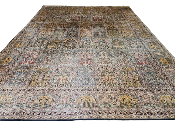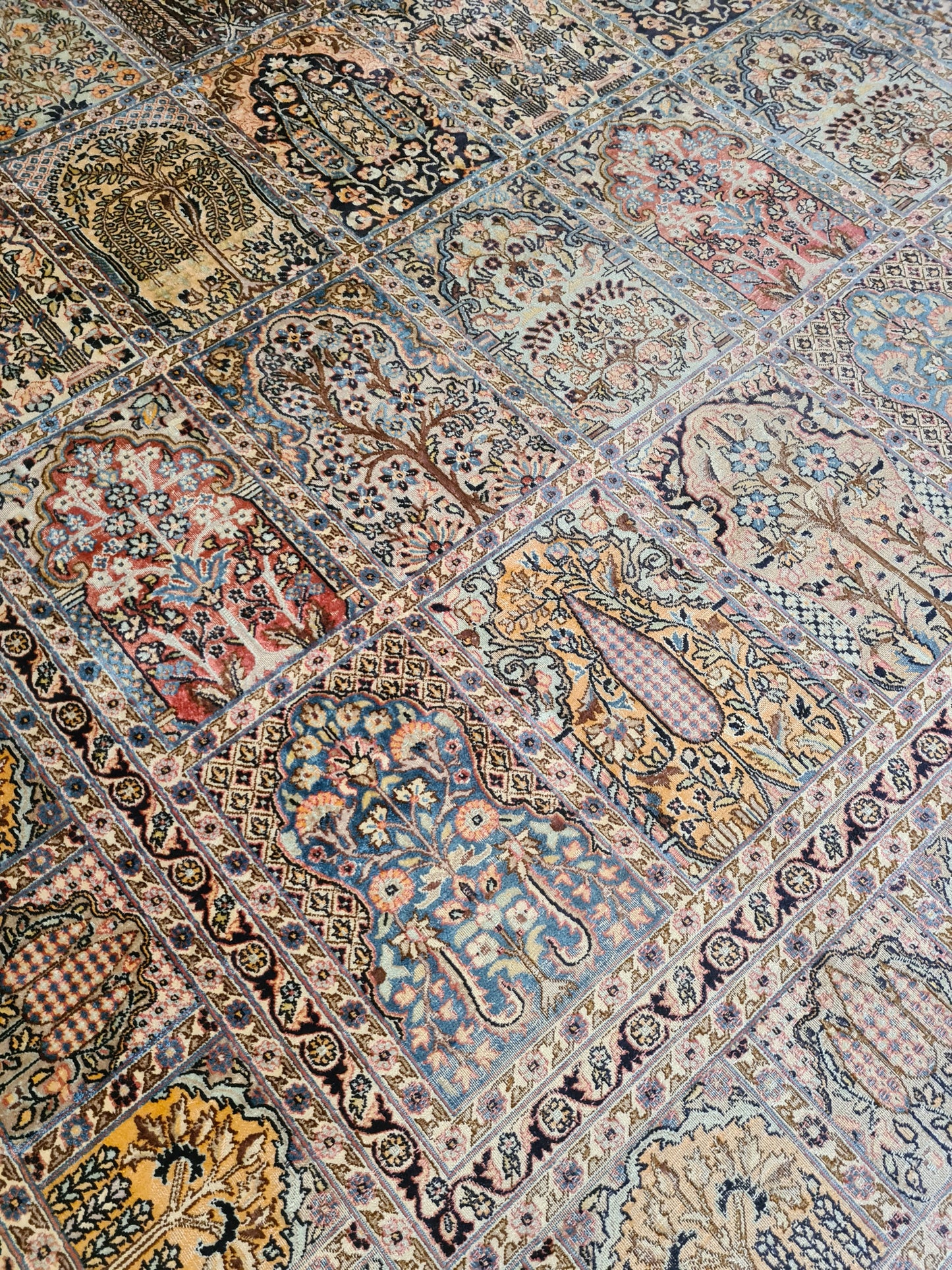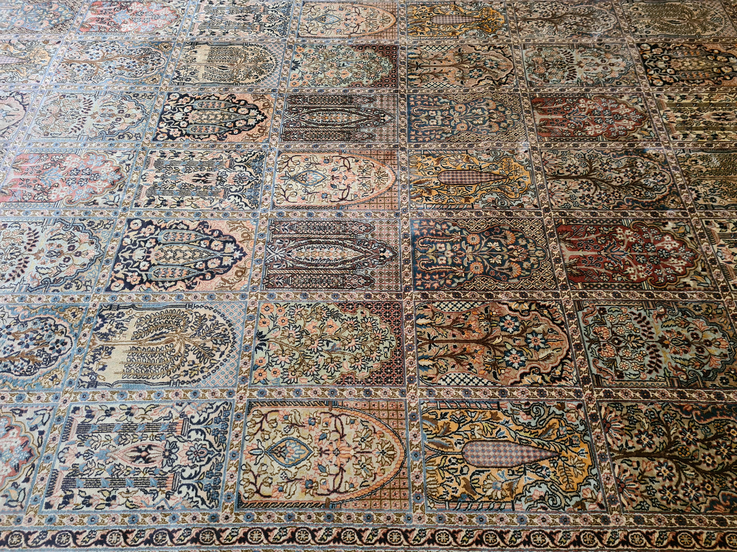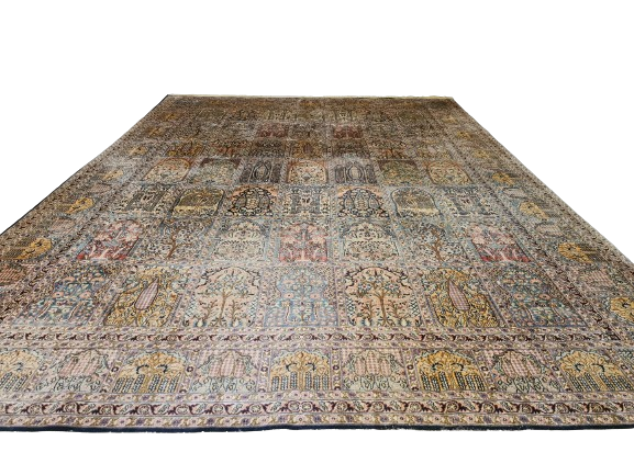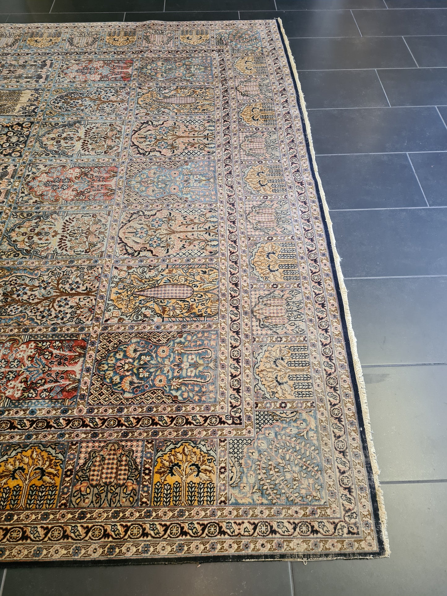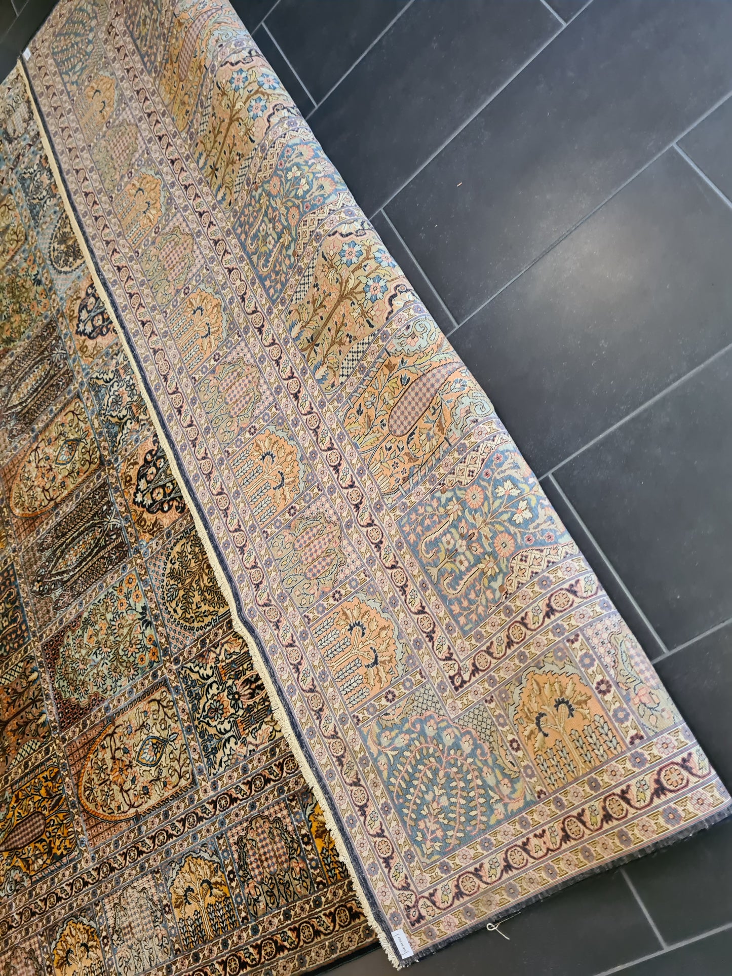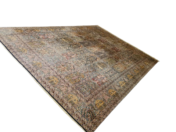 Beschreibung: Dieser königliche Palastteppich ist nicht nur ein Dekorationsstück, sondern ein wertvolles Erbstück, das die reiche Tradition und das Erbe von Kashmir verkörpert. Die kunstvolle Gestaltung und die verwendeten Materialien machen ihn zu einem begehrten Sammlerstück für Kenner und Liebhaber exquisiter Teppiche. Trotz seines Alters strahlt der Teppich noch immer majestätische Eleganz aus und wird jedem Raum eine einzigartige Aura verleihen.